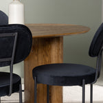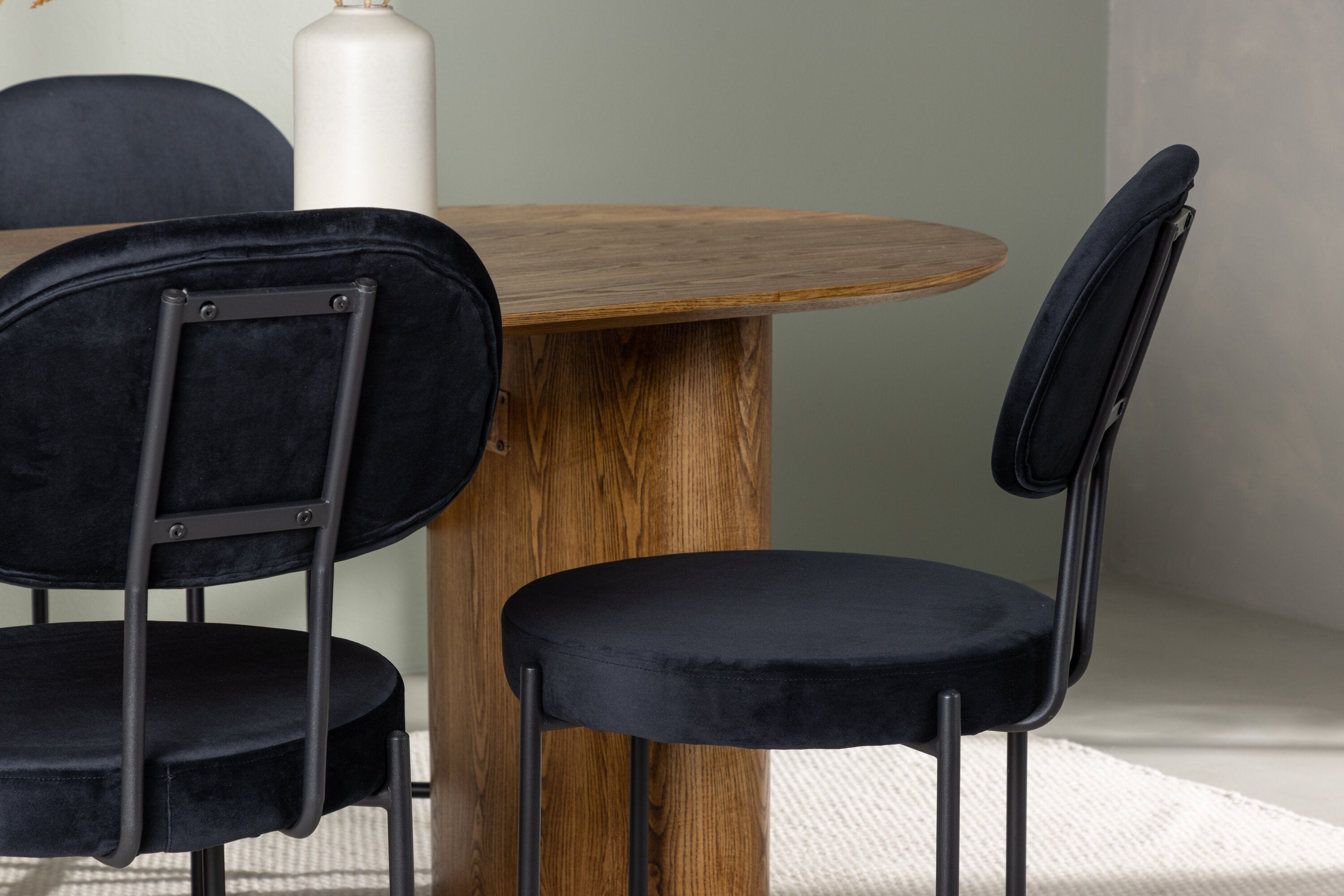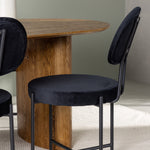 Společně s našimi černými jídelními židlemi Stella tvoří tato jídelní souprava dokonalou harmonii. Křeslo fantastickým způsobem spojuje pohodlí a styl. Trendy skandinávský design kombinuje kulatý sedák a opěradlo z luxusní černé sametové látky s minimalistickými nohami židle z elegantní černé oceli. Tato kombinace materiálů a tvaru poskytuje výjimečné pohodlí a sofistikovaný nádech vašeho jídla.