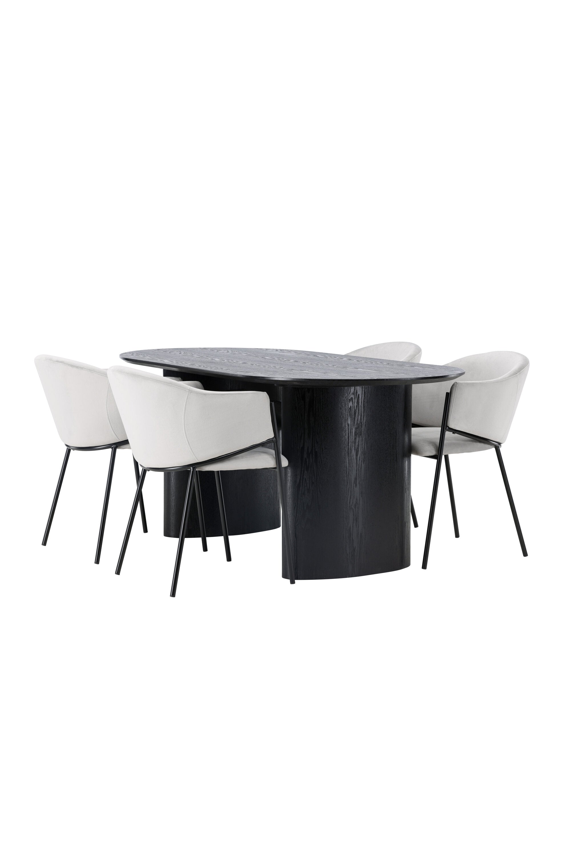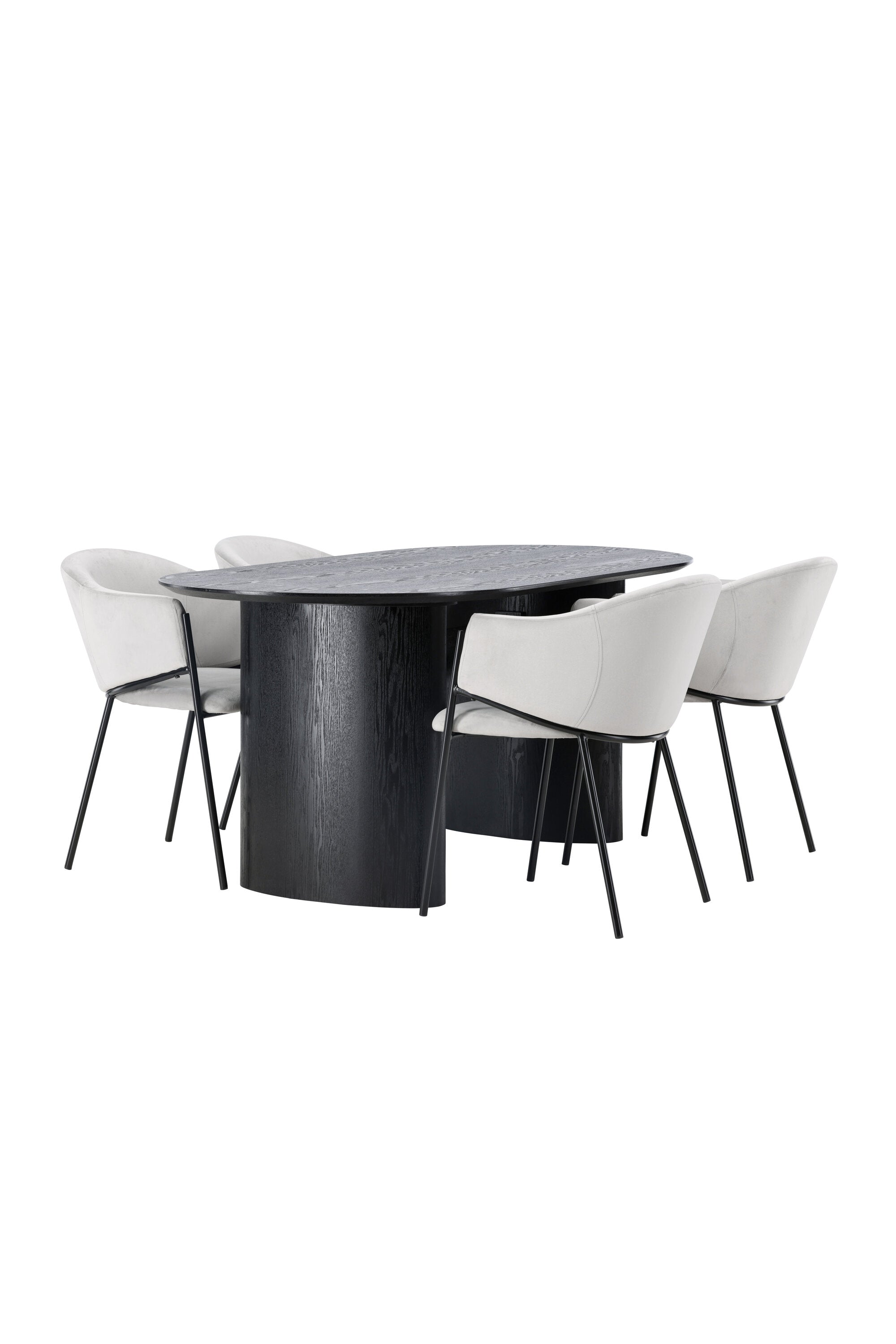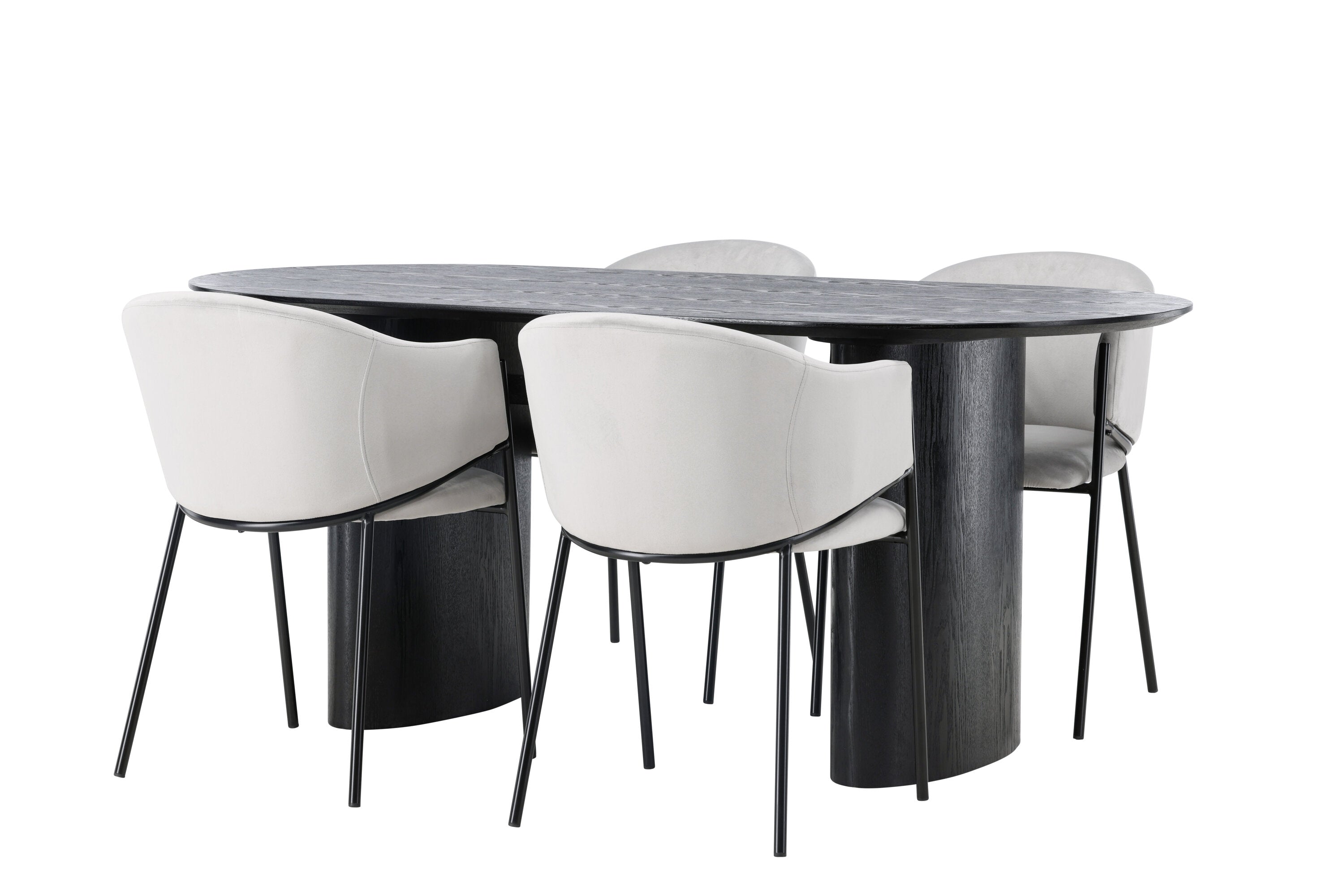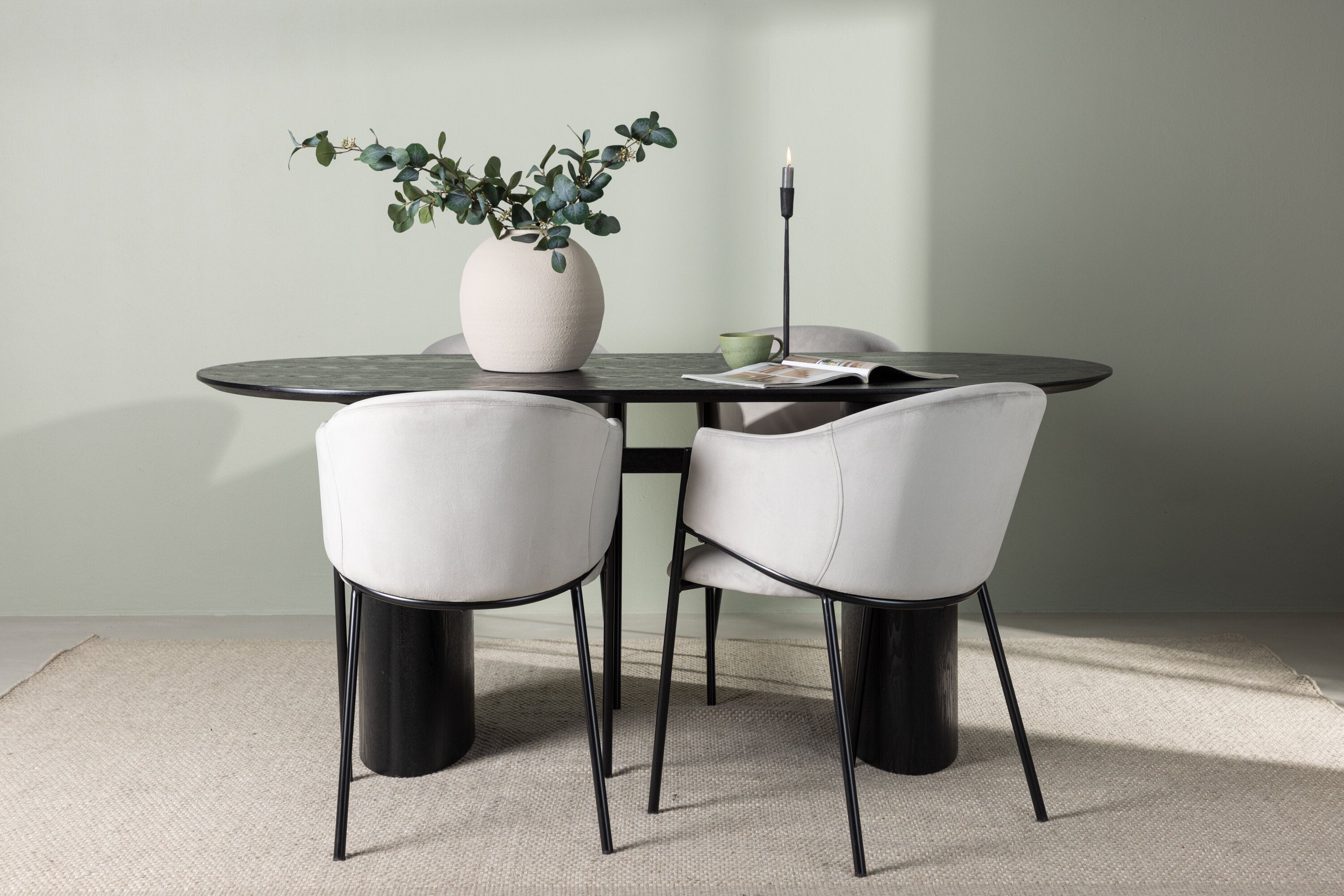 Moderní tvary a měkké materiály! Oválný jídelní stůl Isolde v černé barvě má ​​moderní design s oválnou deskou stolu z MDF a robustním rámem, který působí stabilním dojmem. Živý materiál dává poutače krásný pohyb. Zde společně s moderními, šedými jídelními židlemi ze série Evelina. Židle má celočalouněný sedák se zaobleným opěradlem ze světle šedé sametové látky a dekorativní minimalistickou kostěnou strukturou z černé oceli. Dokonalá kombinace do moderní domácnosti! Rozměry stolu: 180x75cm.