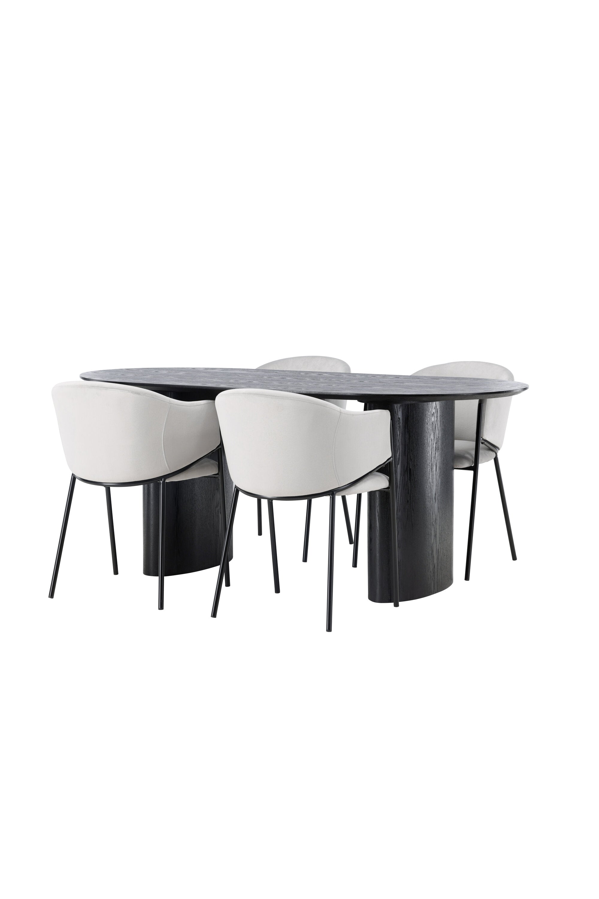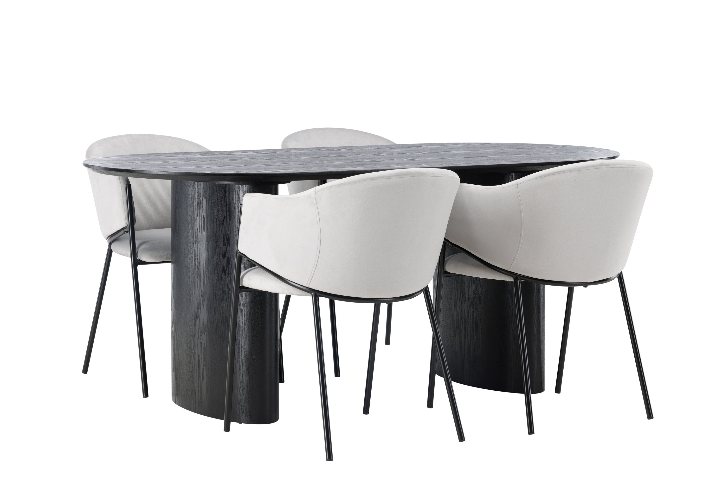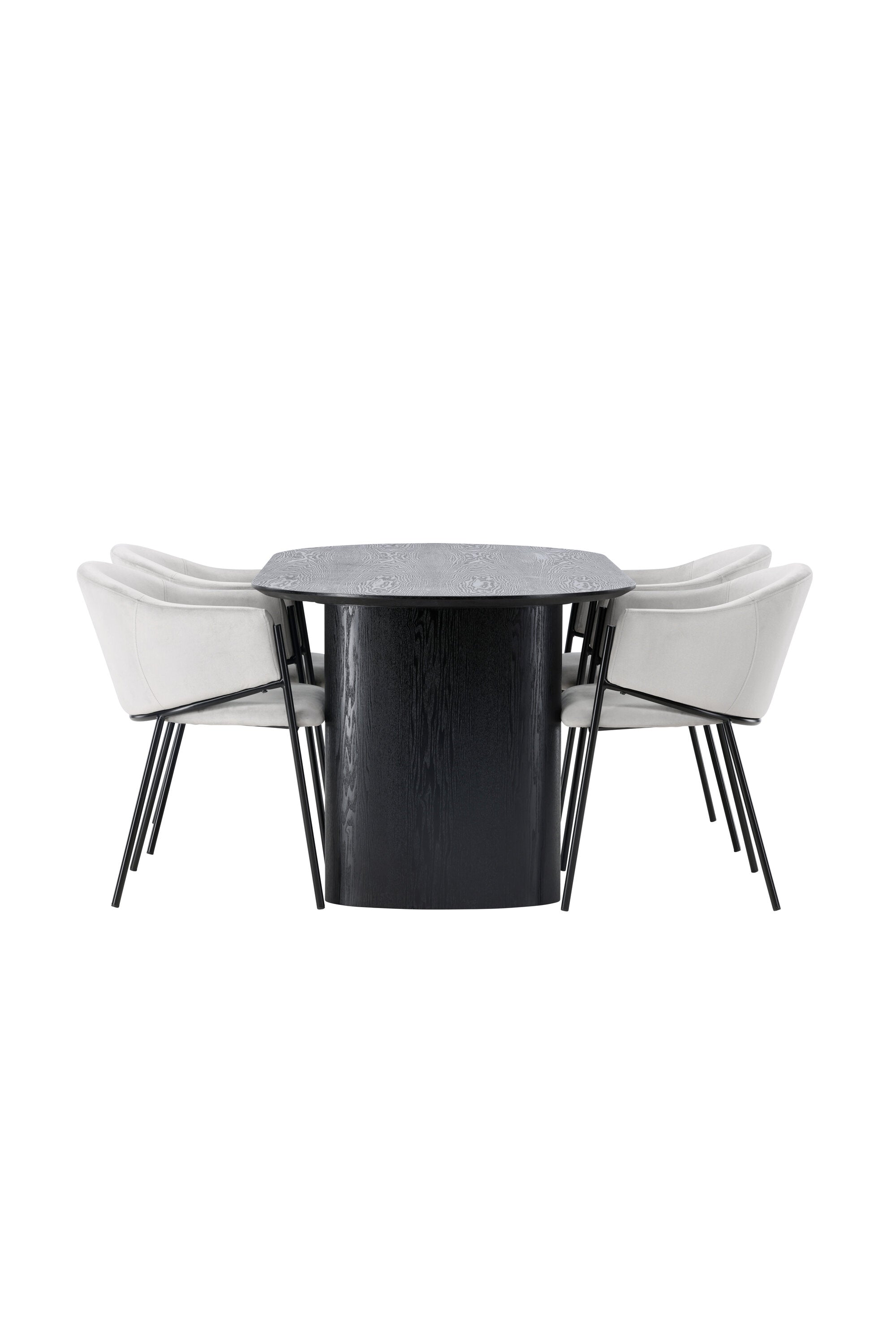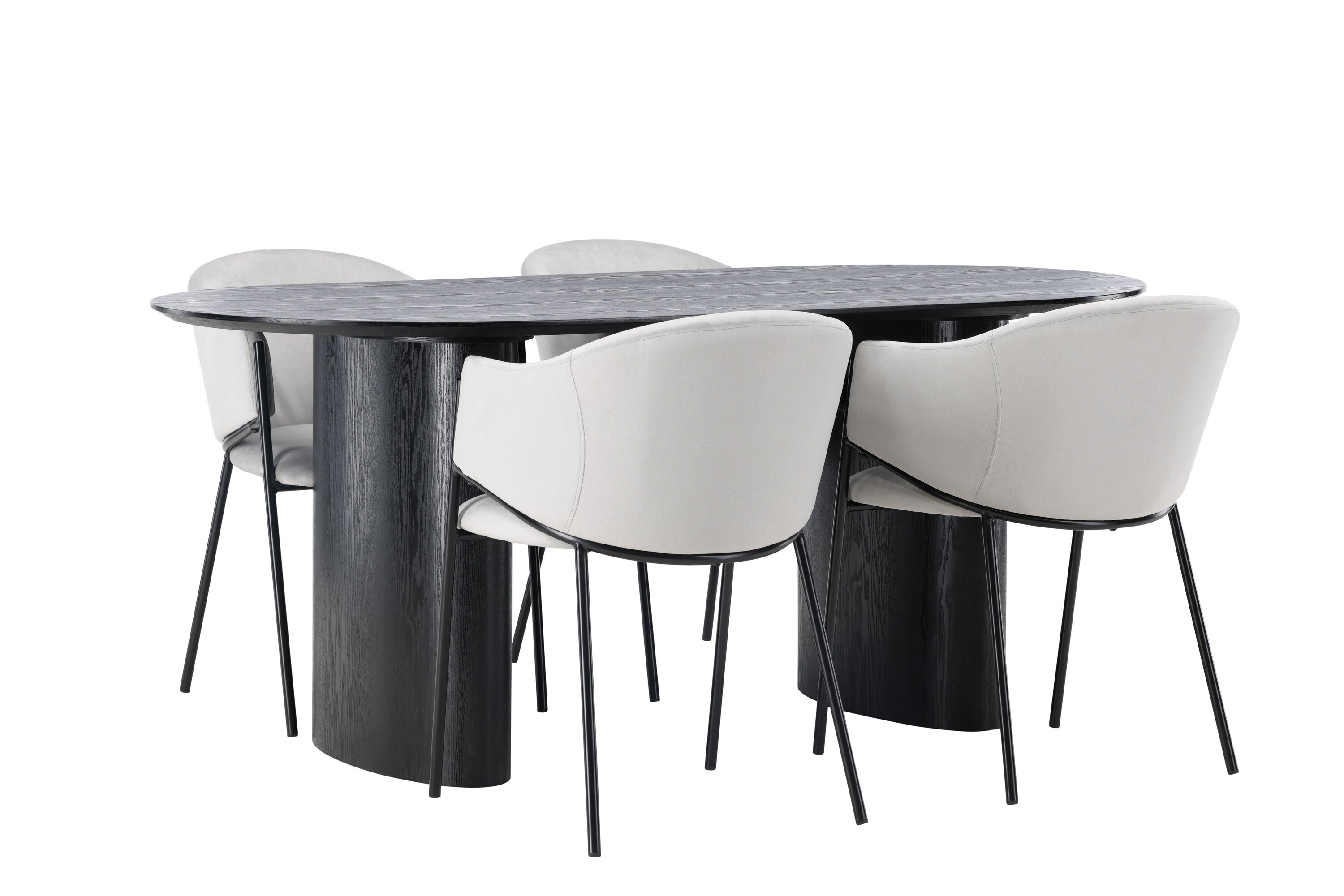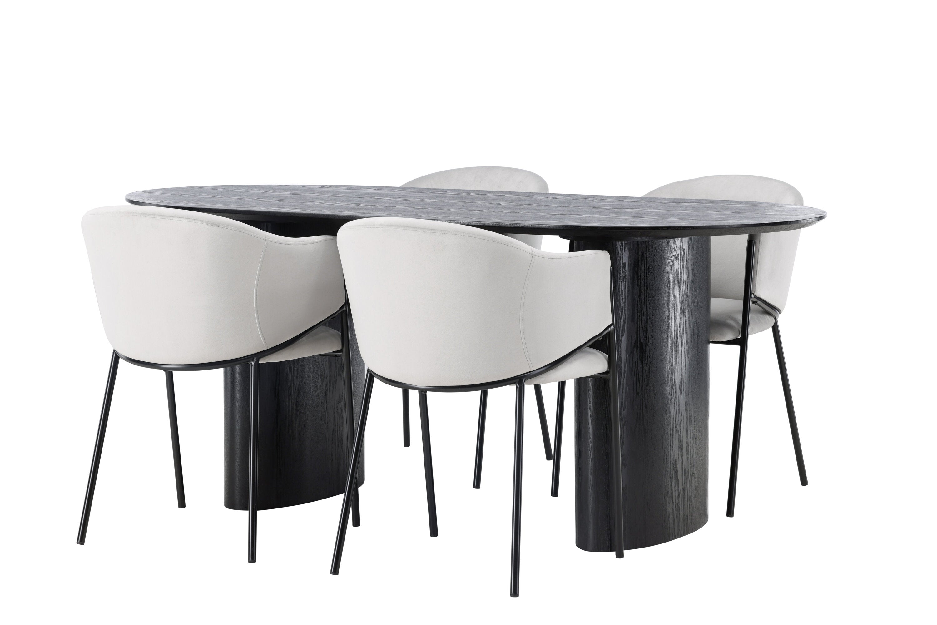 Moderní tvary a měkké materiály! Oválný jídelní stůl Isolde v černé barvě má ​​moderní design s oválnou deskou stolu z MDF a robustním rámem, který působí stabilním dojmem. Živý materiál dává poutače krásný pohyb. Zde společně s moderními, šedými jídelními židlemi ze série Evelina. Židle má celočalouněný sedák se zaobleným opěradlem ze světle šedé sametové látky a dekorativní minimalistickou kostěnou strukturou z černé oceli. Dokonalá kombinace do moderní domácnosti! Rozměry stolu: 180x75cm.