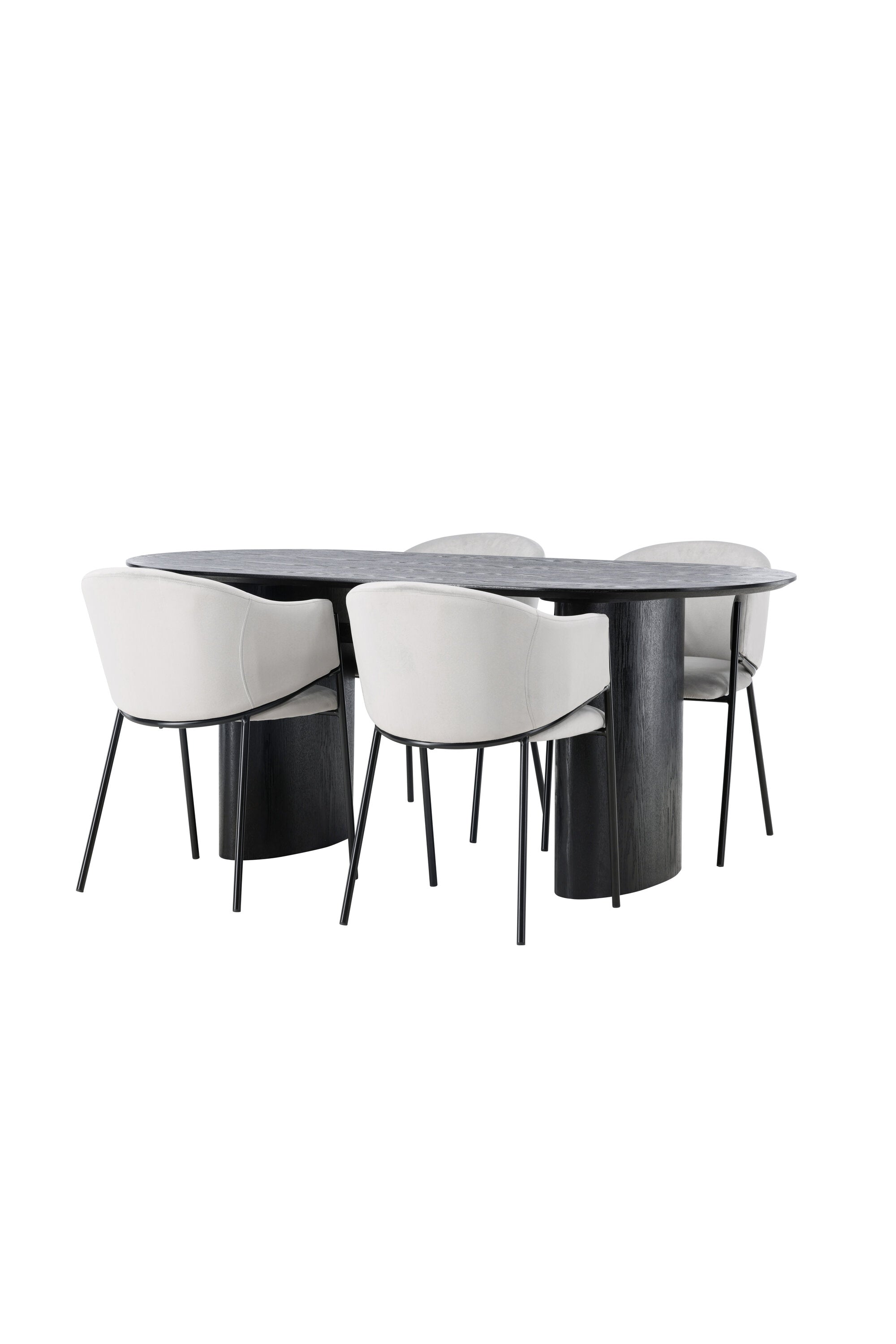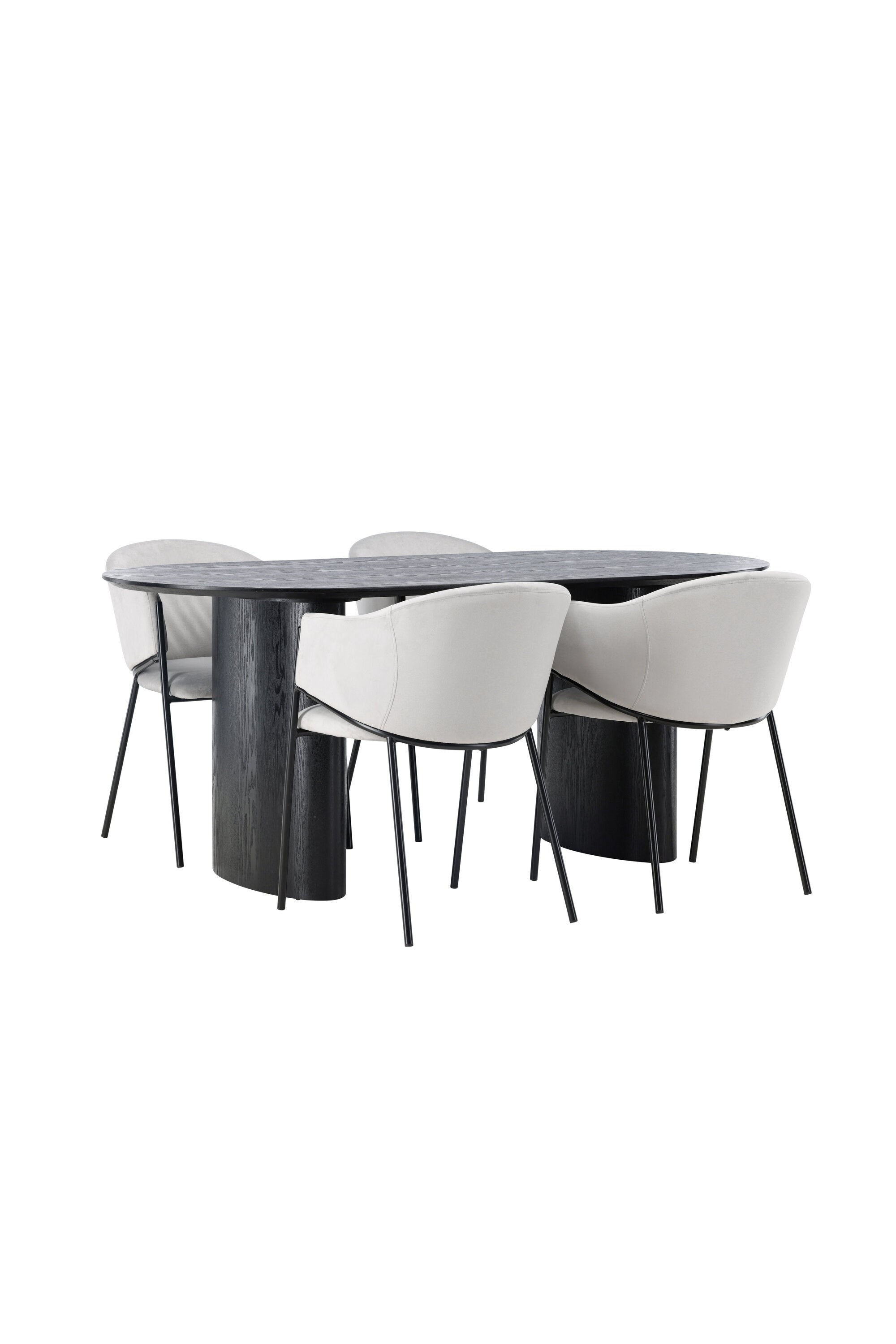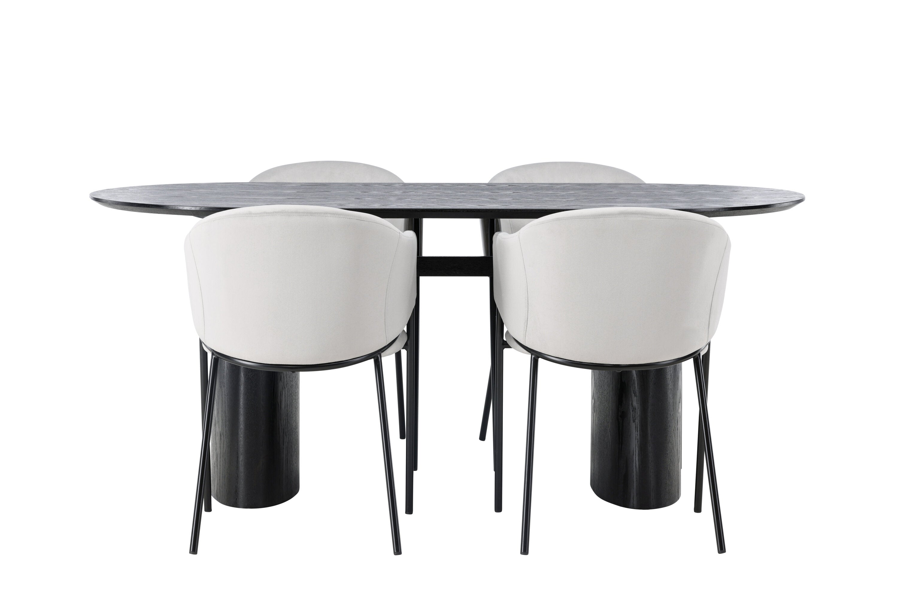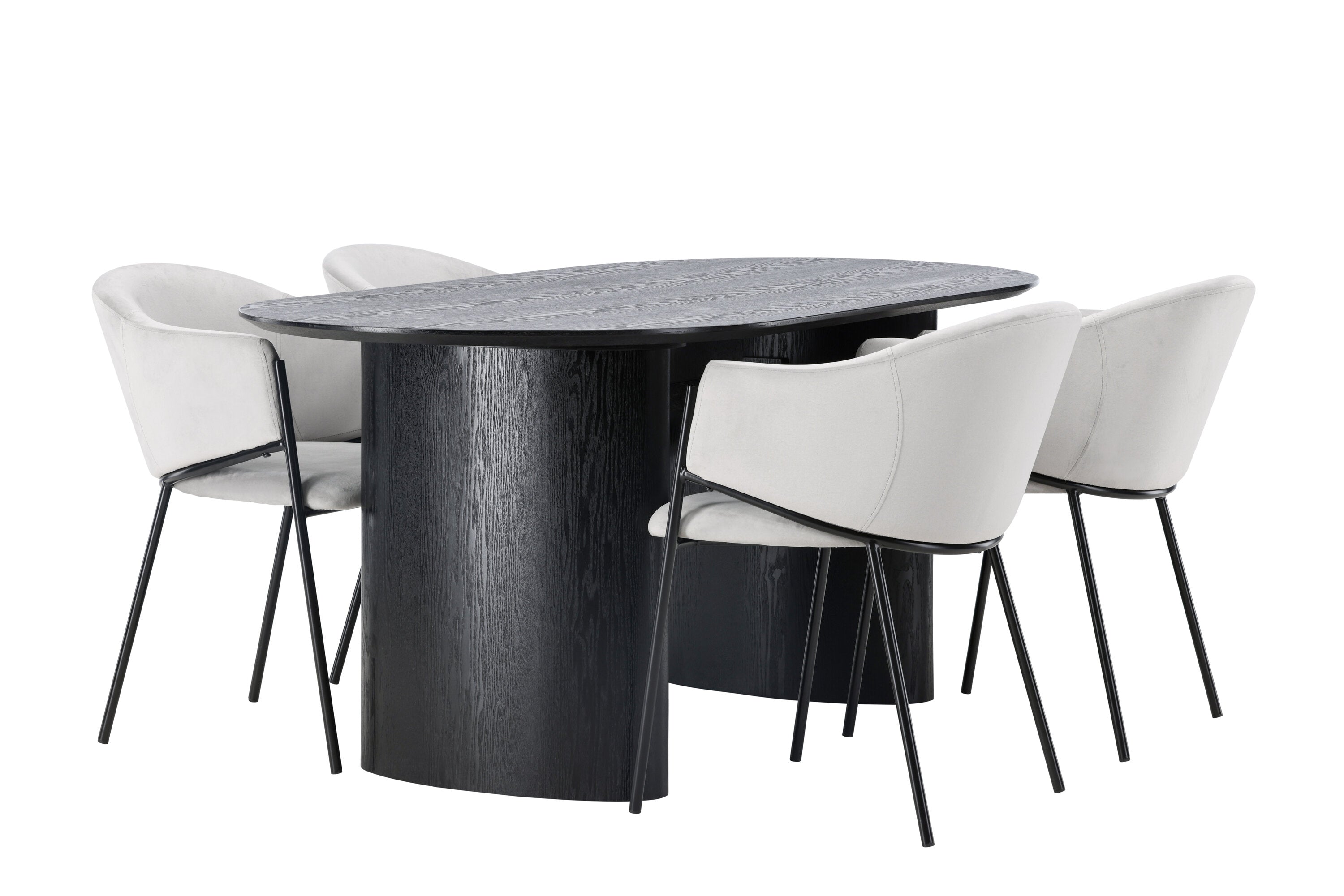 Moderní tvary a měkké materiály! Oválný jídelní stůl Isolde v černé barvě má ​​moderní design s oválnou deskou stolu z MDF a robustním rámem, který působí stabilním dojmem. Živý materiál dává poutače krásný pohyb. Zde společně s moderními, šedými jídelními židlemi ze série Evelina. Židle má celočalouněný sedák se zaobleným opěradlem ze světle šedé sametové látky a dekorativní minimalistickou kostěnou strukturou z černé oceli. Dokonalá kombinace do moderní domácnosti! Rozměry stolu: 180x75cm.