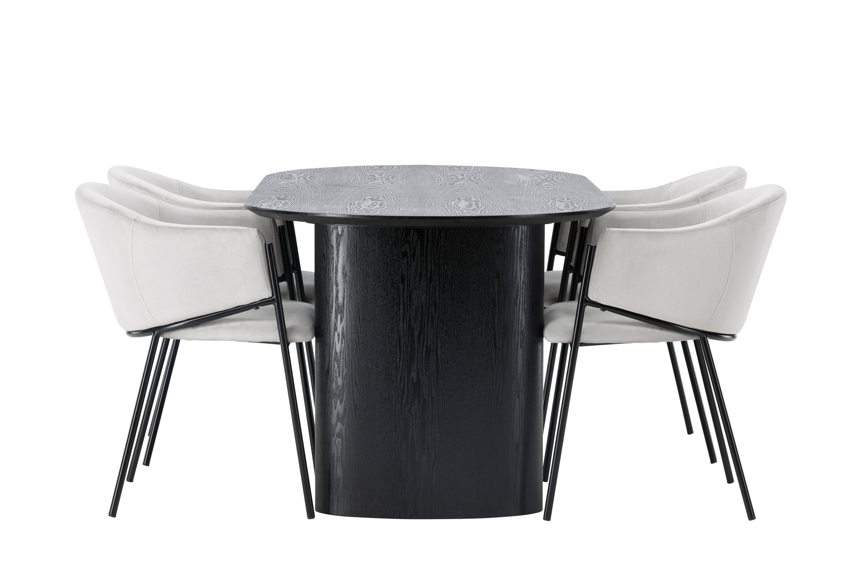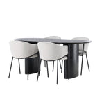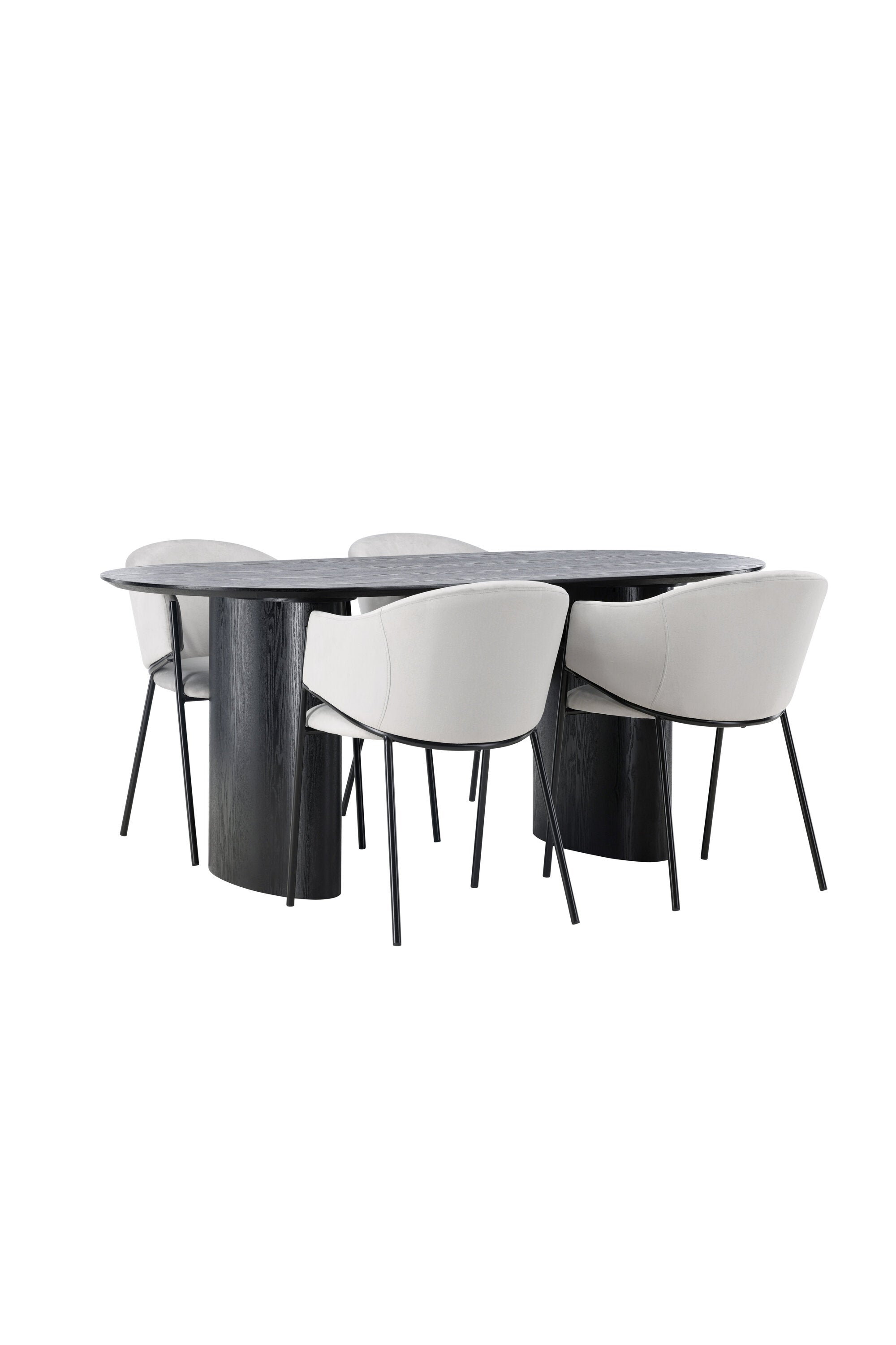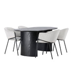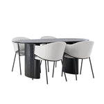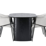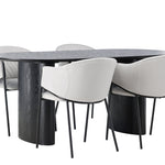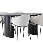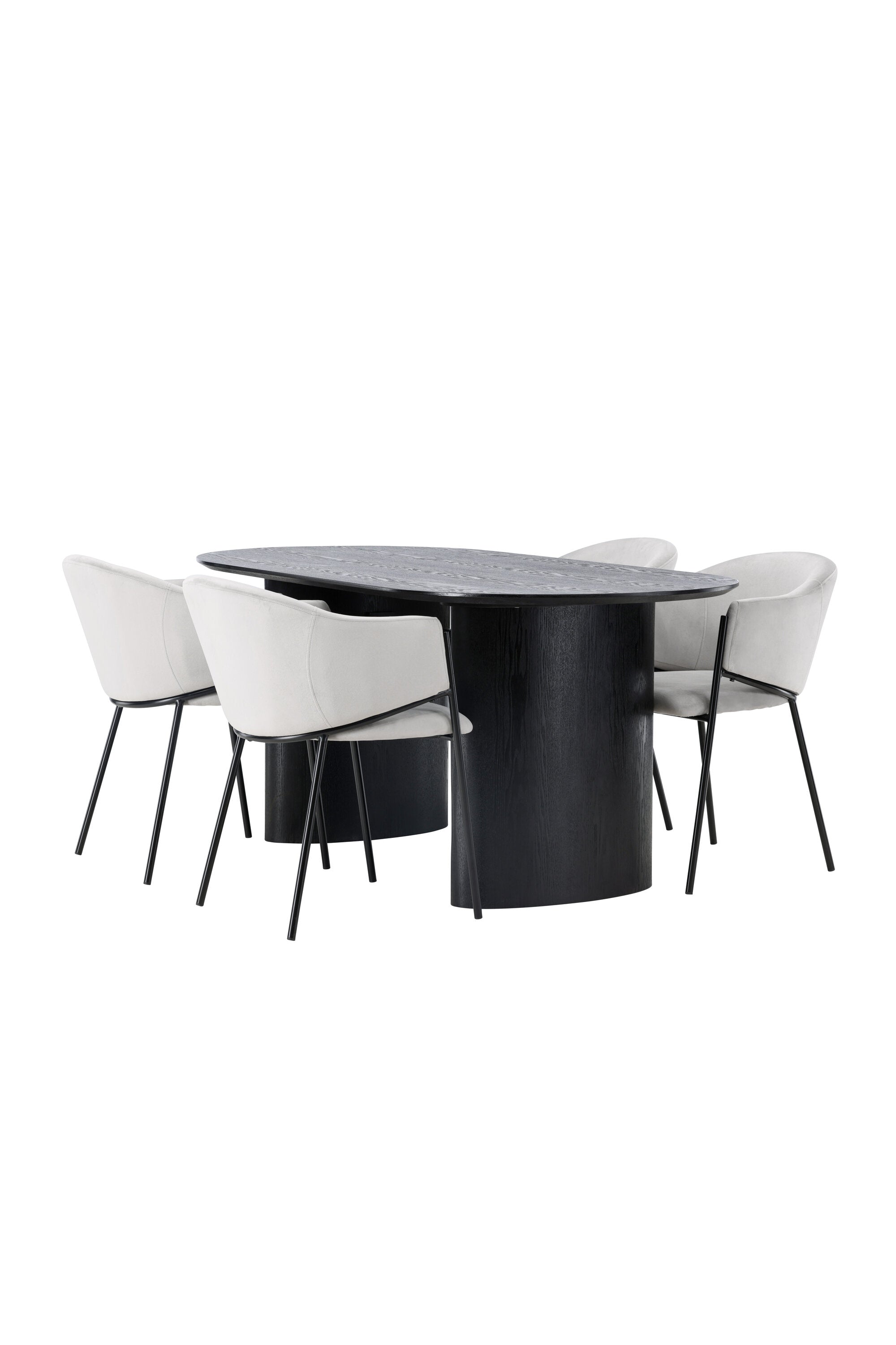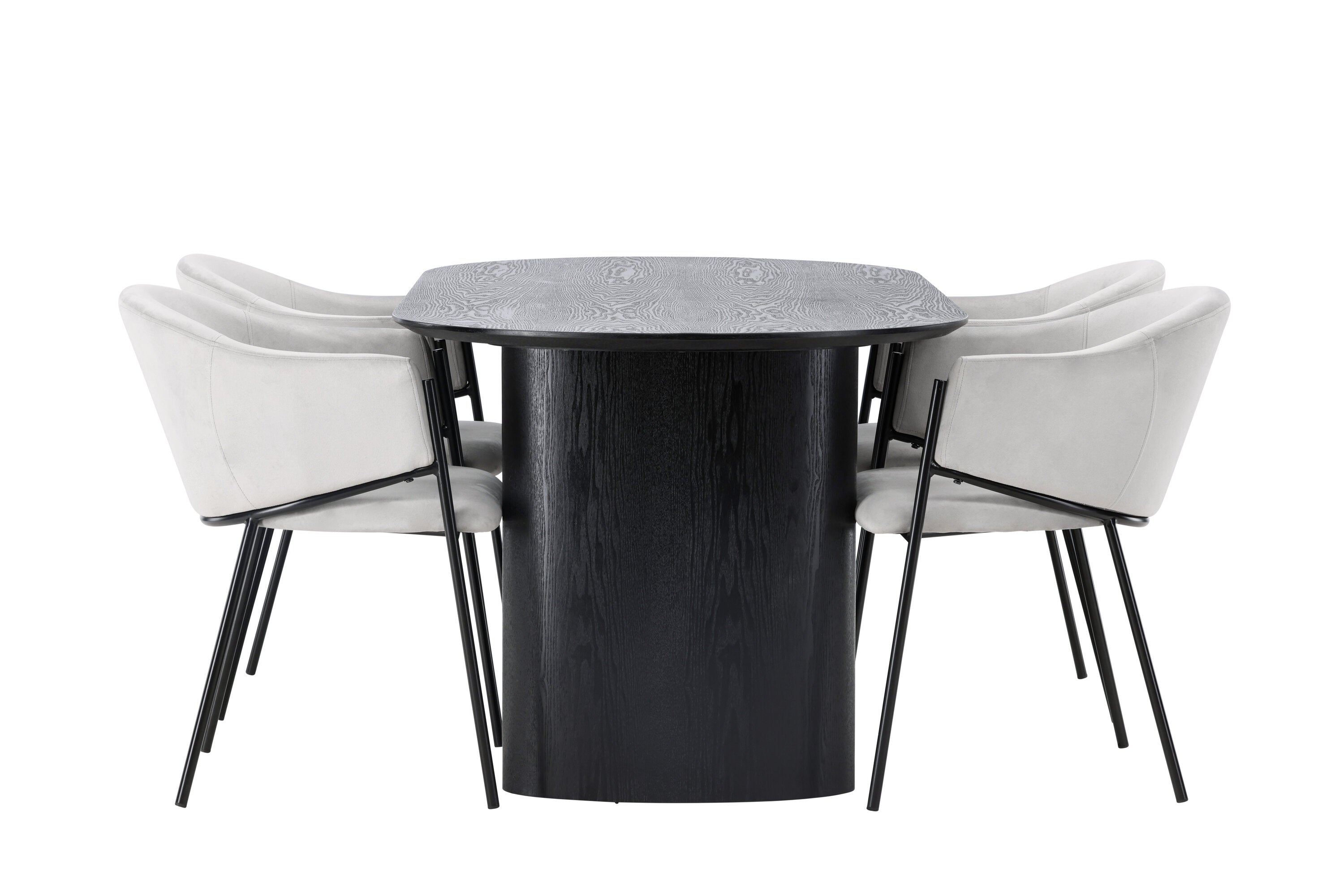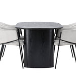 Moderní tvary a měkké materiály! Oválný jídelní stůl Isolde v černé barvě má ​​moderní design s oválnou deskou stolu z MDF a robustním rámem, který působí stabilním dojmem. Živý materiál dává poutače krásný pohyb. Zde společně s moderními, šedými jídelními židlemi ze série Evelina. Židle má celočalouněný sedák se zaobleným opěradlem ze světle šedé sametové látky a dekorativní minimalistickou kostěnou strukturou z černé oceli. Dokonalá kombinace do moderní domácnosti! Rozměry stolu: 180x75cm.