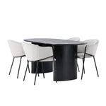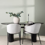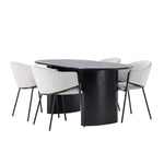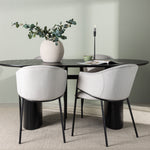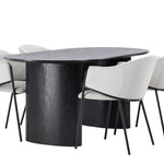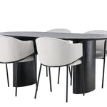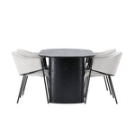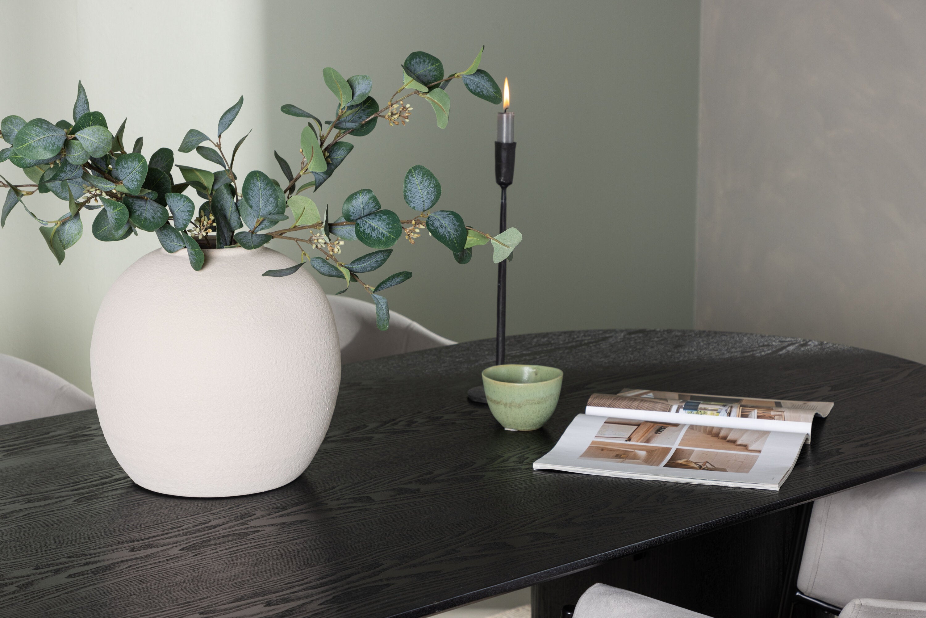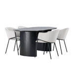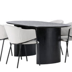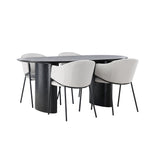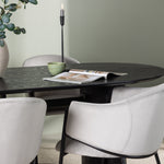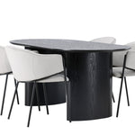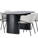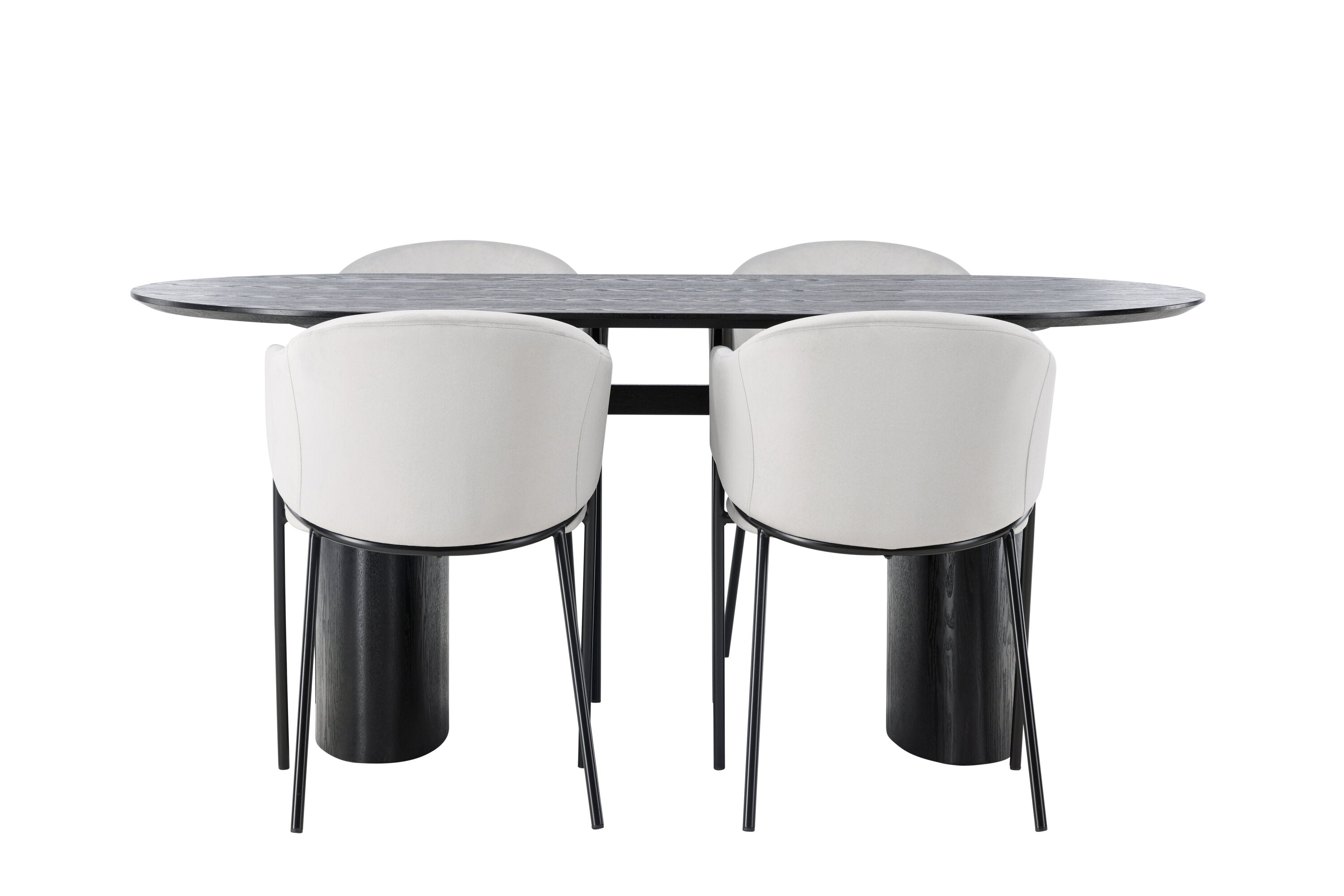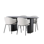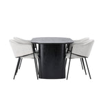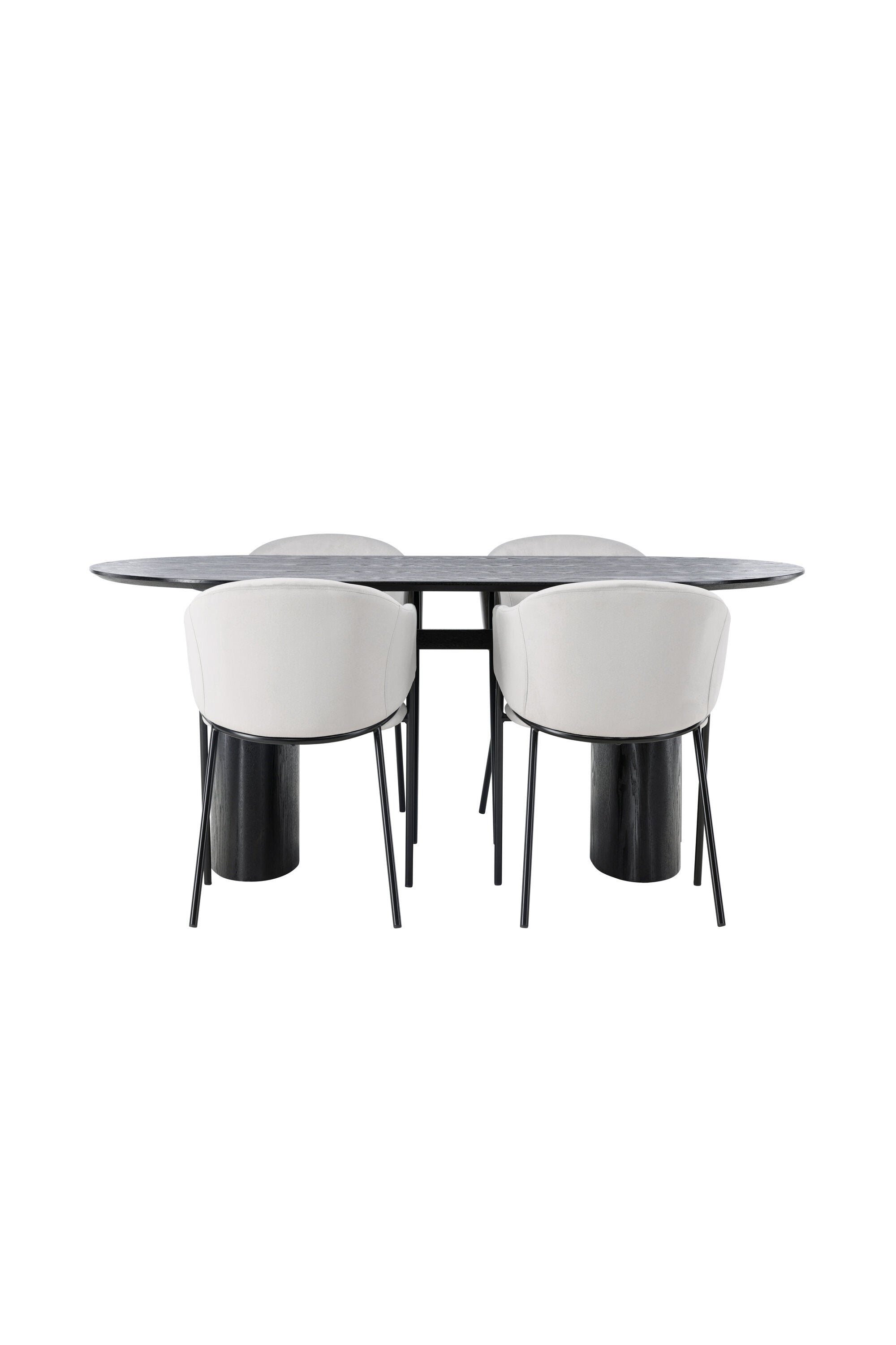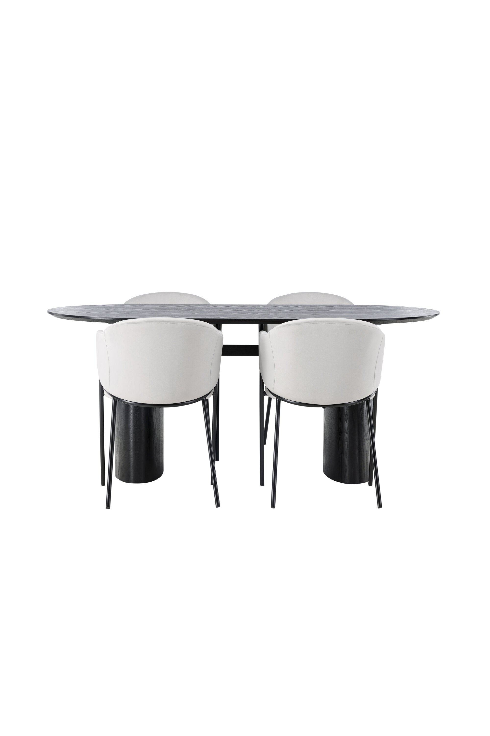 Moderní tvary a měkké materiály! Oválný jídelní stůl Isolde v černé barvě má ​​moderní design s oválnou deskou stolu z MDF a robustním rámem, který působí stabilním dojmem. Živý materiál dává poutače krásný pohyb. Zde společně s moderními, šedými jídelními židlemi ze série Evelina. Židle má celočalouněný sedák se zaobleným opěradlem ze světle šedé sametové látky a dekorativní minimalistickou kostěnou strukturou z černé oceli. Dokonalá kombinace do moderní domácnosti! Rozměry stolu: 180x75cm.