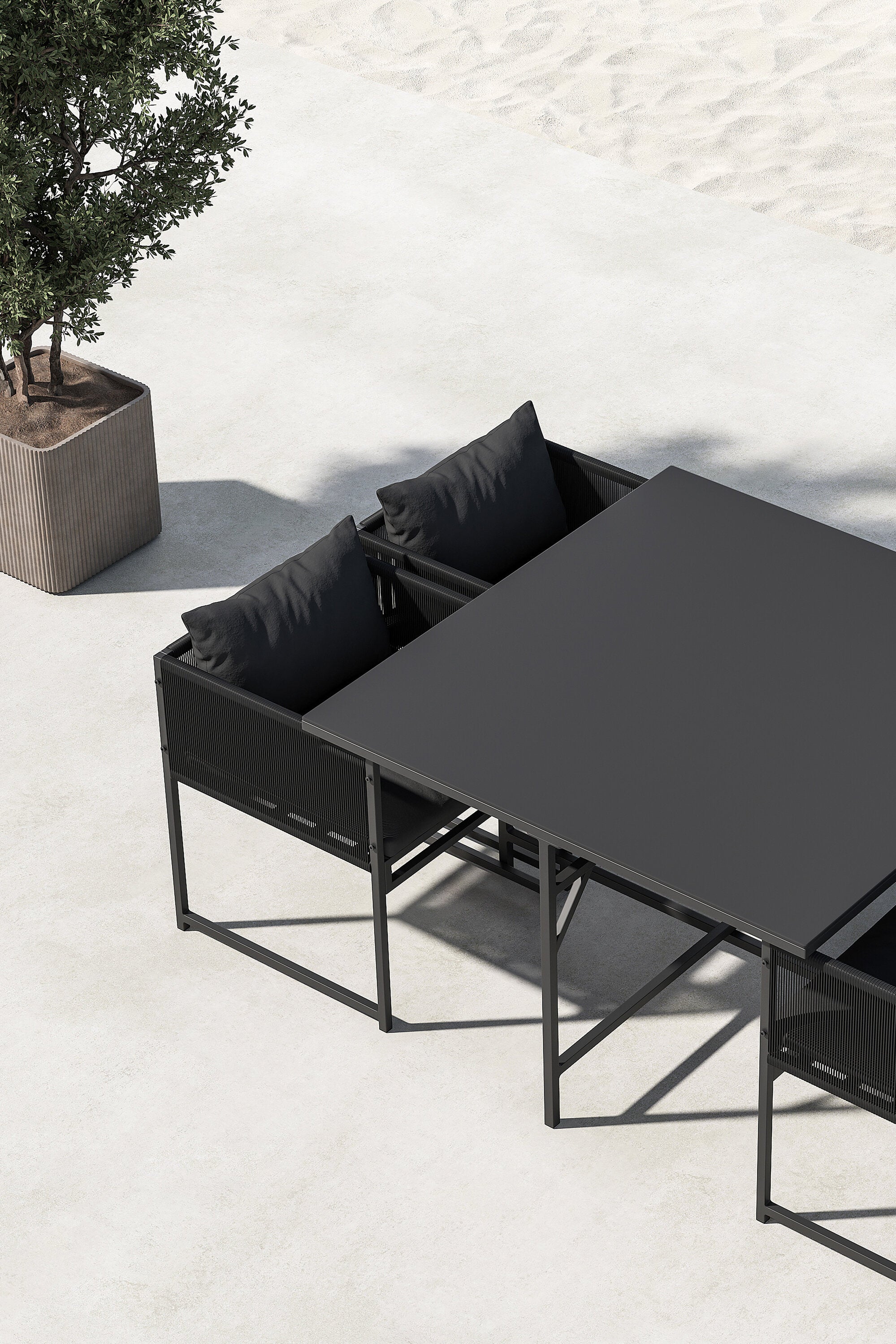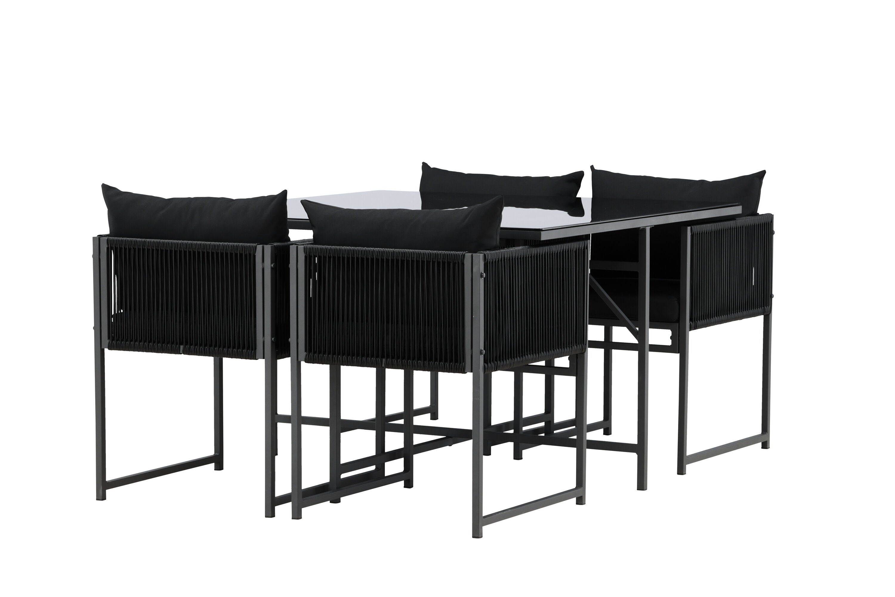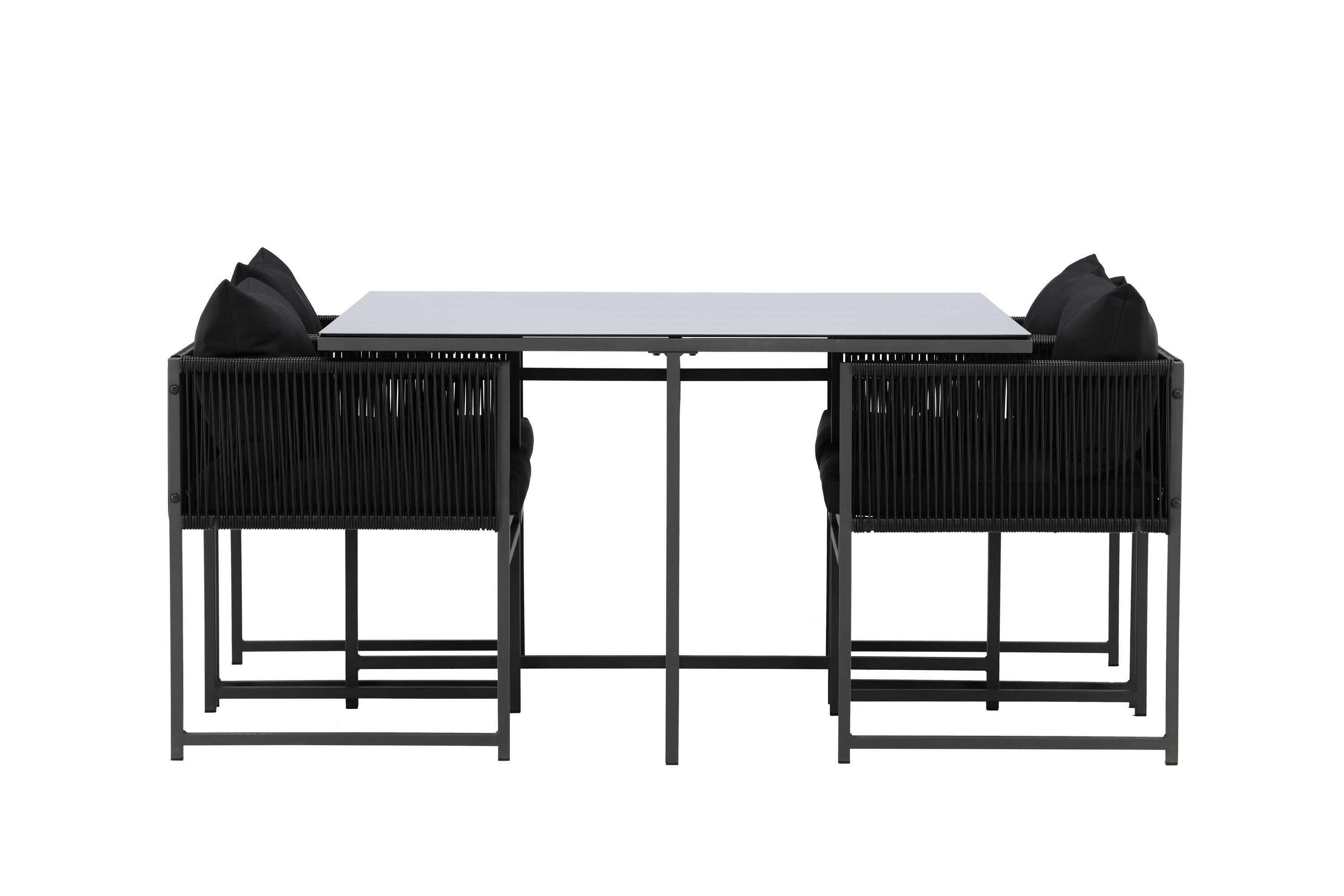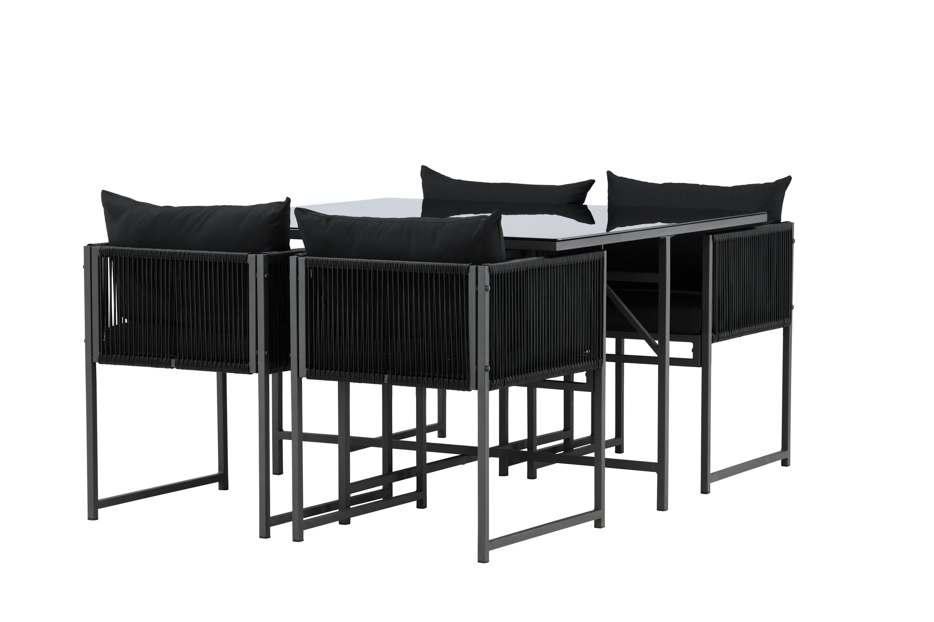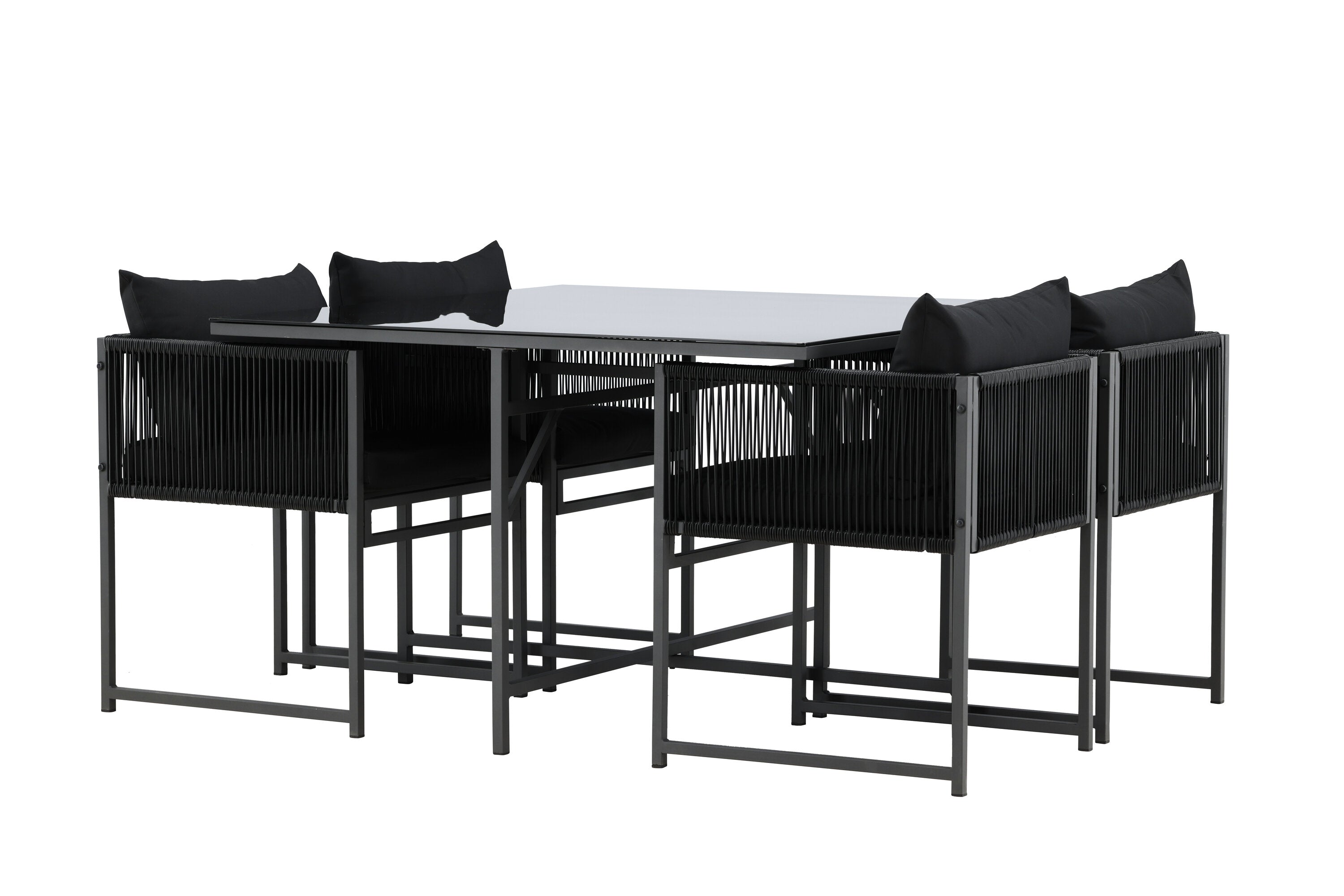 Noto je jídelní set, který dodá vaší terase elegantní nádech a vytvoří ideální místo pro příjemné večeře. Tato elegantní černá sada se skládá z velkého skleněného stolu a čtyř pohodlných jídelních židlí, které jsou navrženy tak, aby spojovaly estetiku a funkčnost. Židle mají robustní ocelový rám a jsou zdobeny stylovými lanovými detaily po stranách područek, které dodávají jedinečný a moderní charakter.