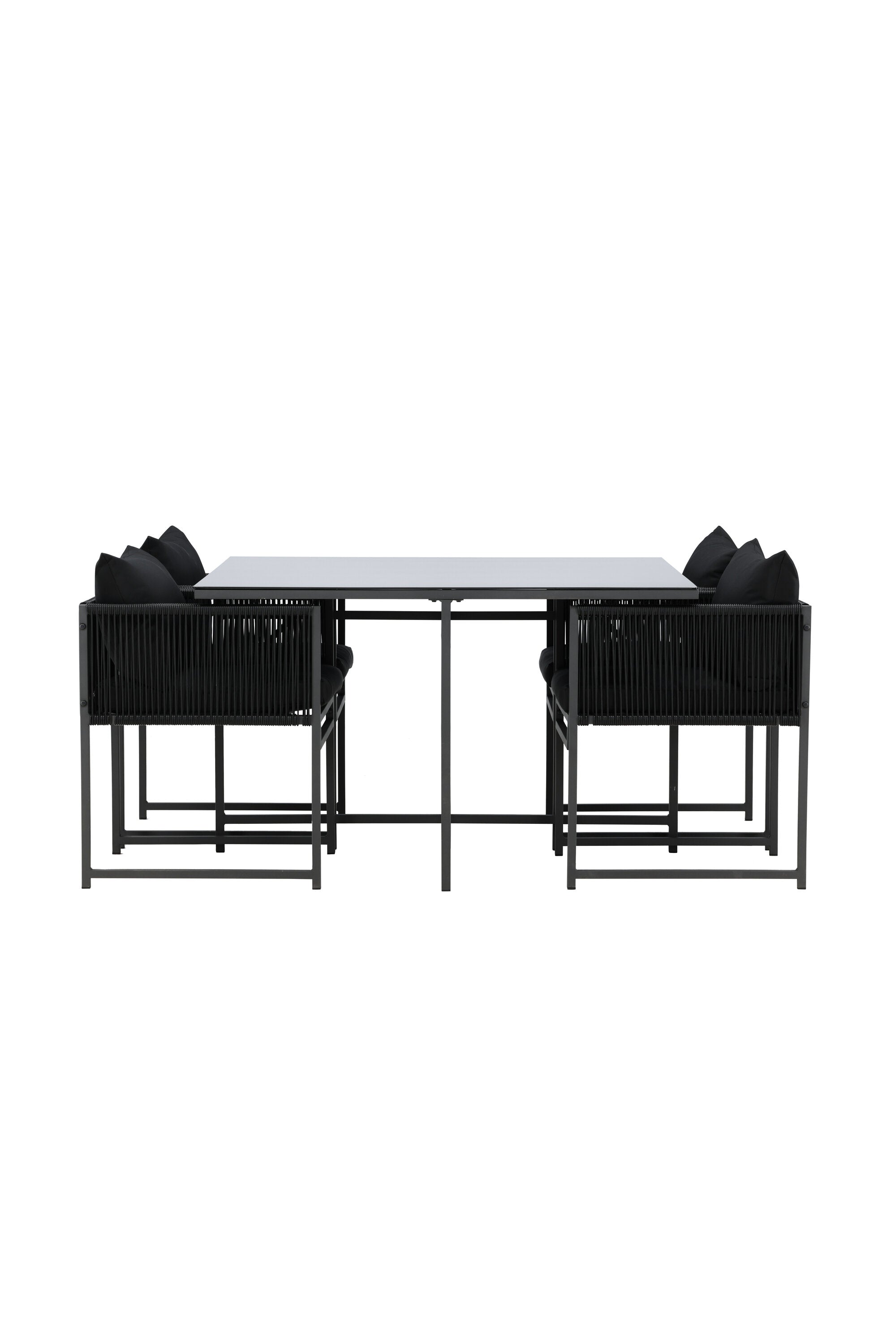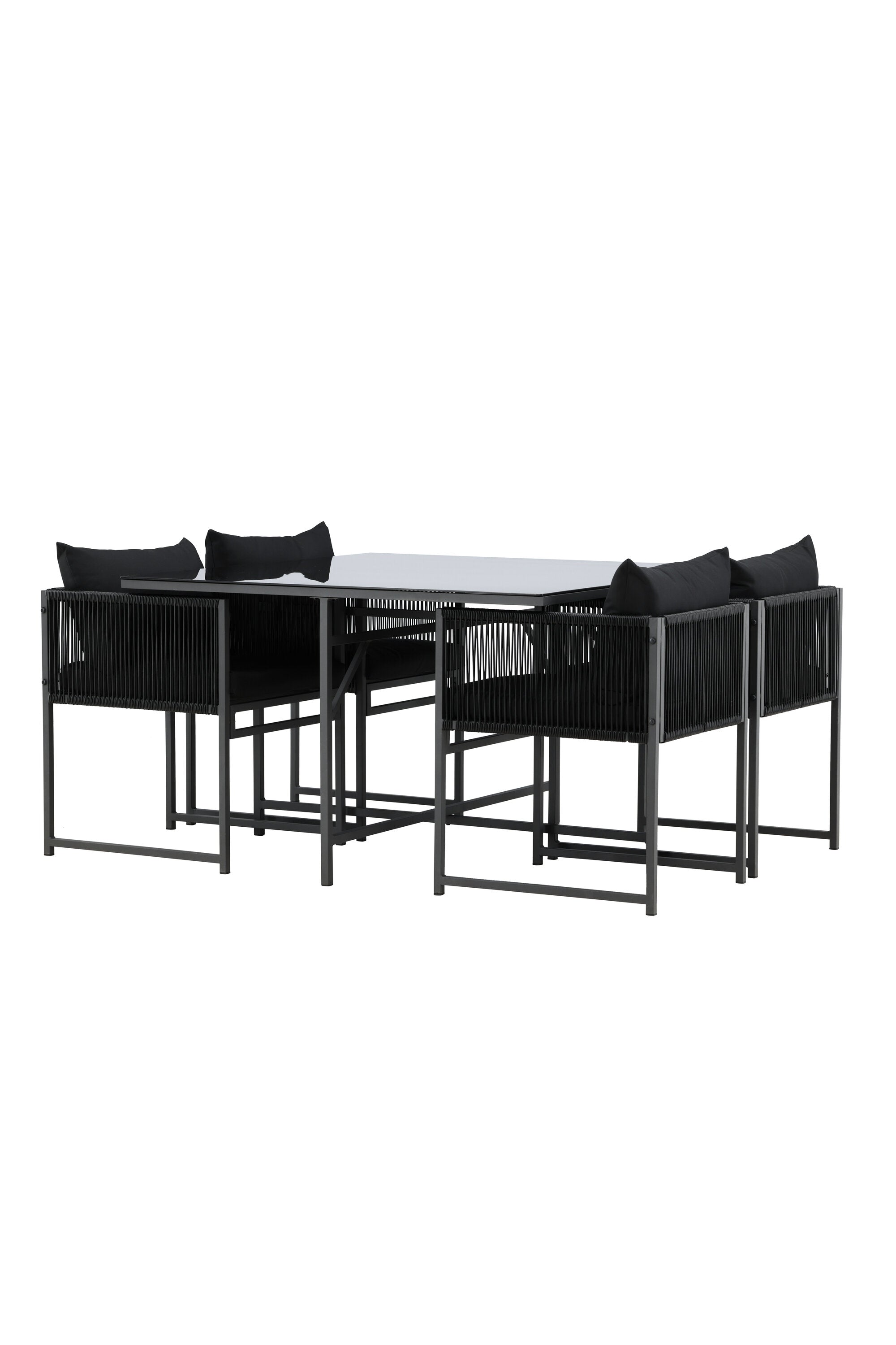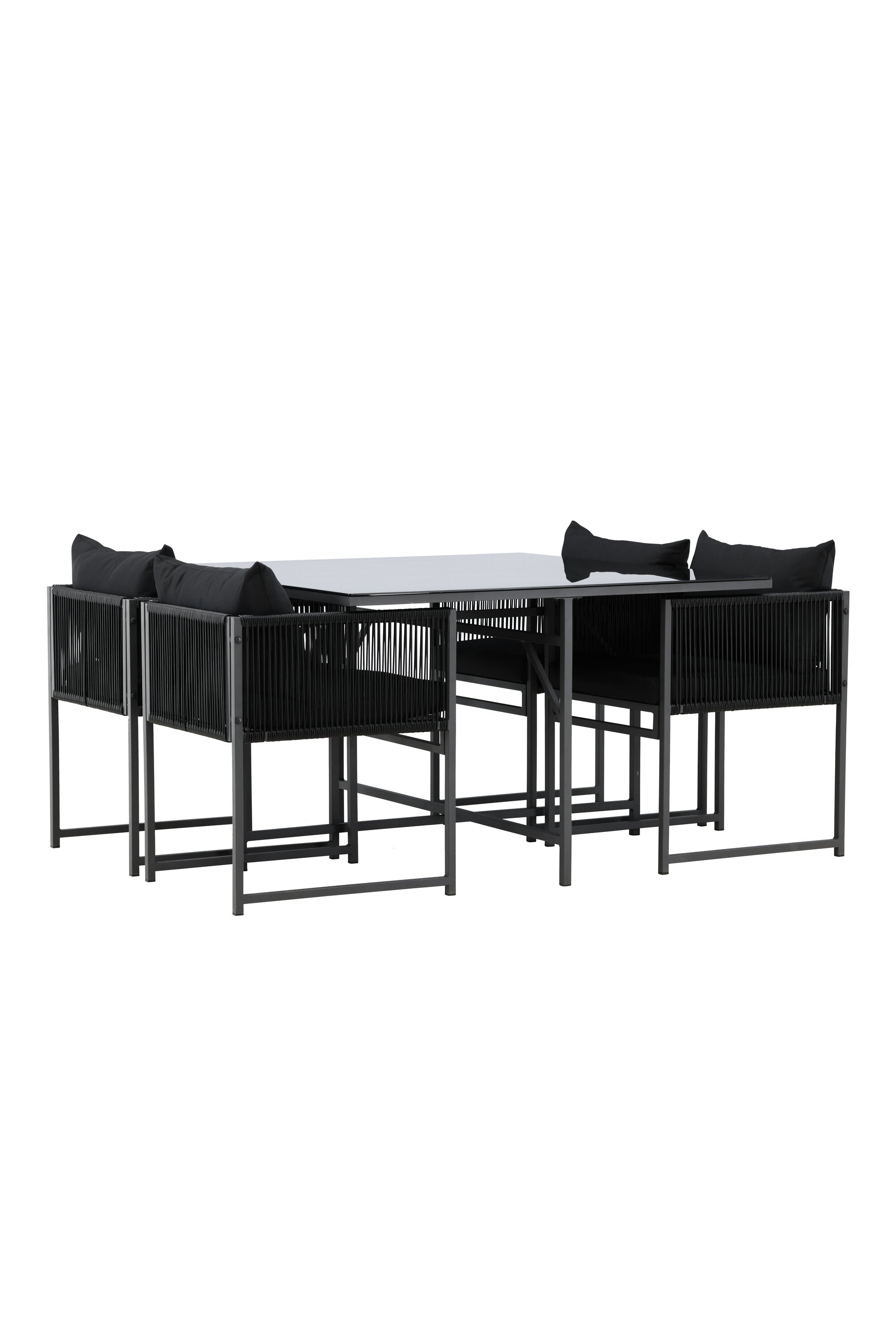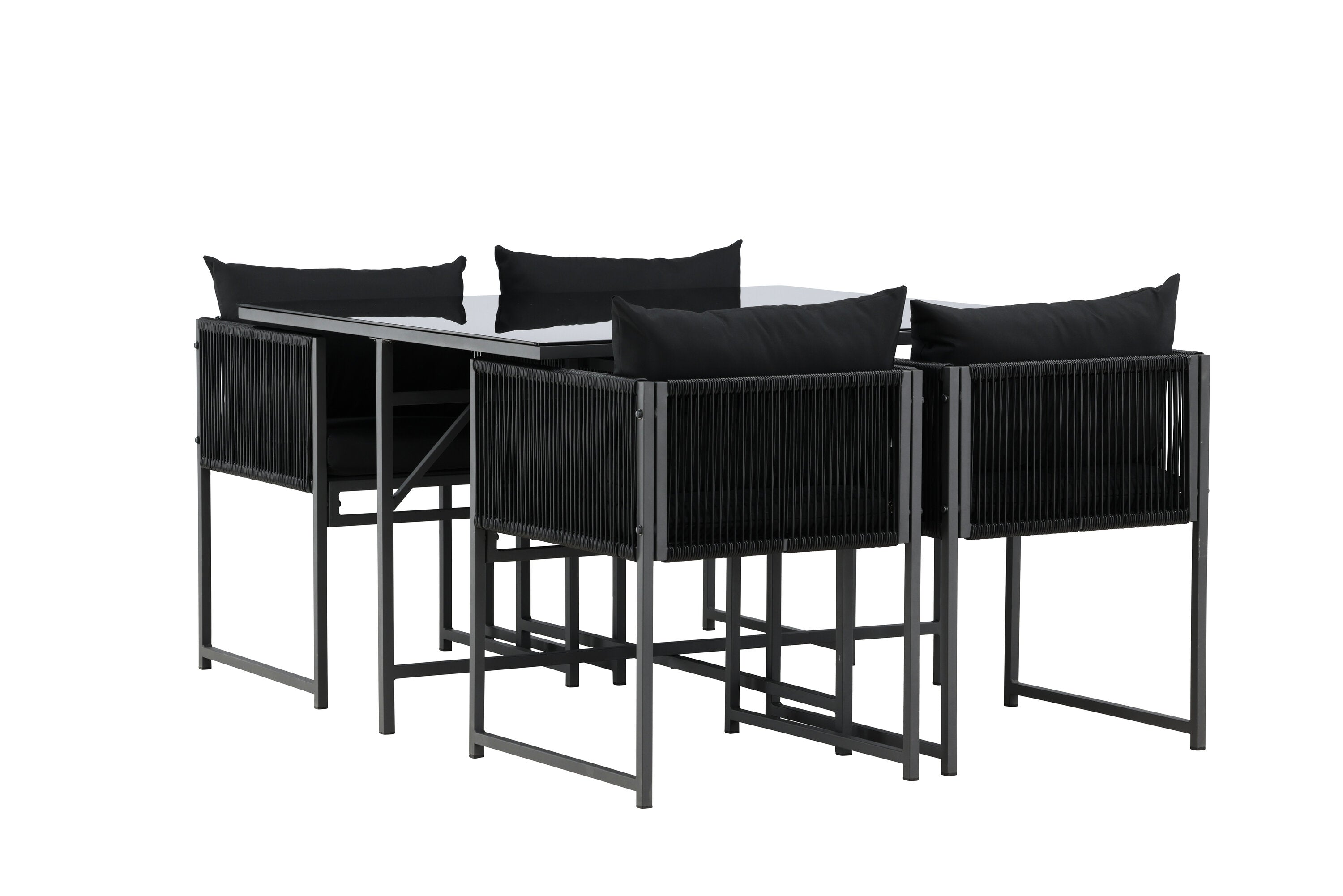 Noto je jídelní set, který dodá vaší terase elegantní nádech a vytvoří ideální místo pro příjemné večeře. Tato elegantní černá sada se skládá z velkého skleněného stolu a čtyř pohodlných jídelních židlí, které jsou navrženy tak, aby spojovaly estetiku a funkčnost. Židle mají robustní ocelový rám a jsou zdobeny stylovými lanovými detaily po stranách područek, které dodávají jedinečný a moderní charakter.