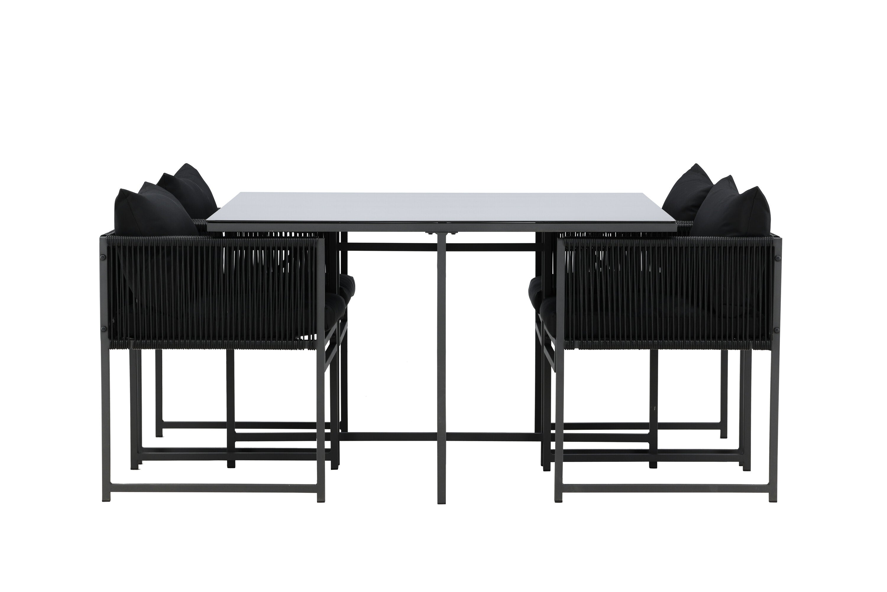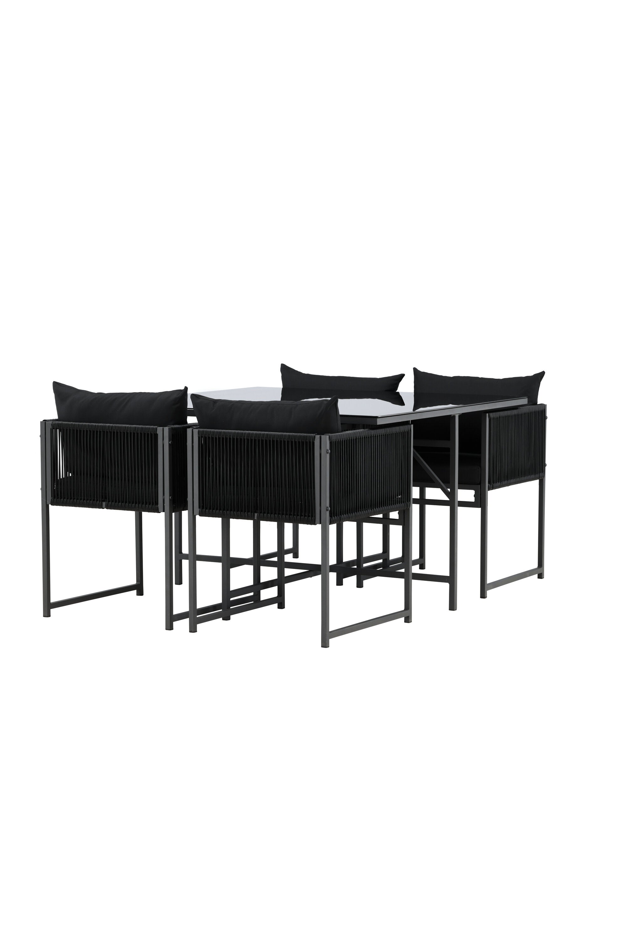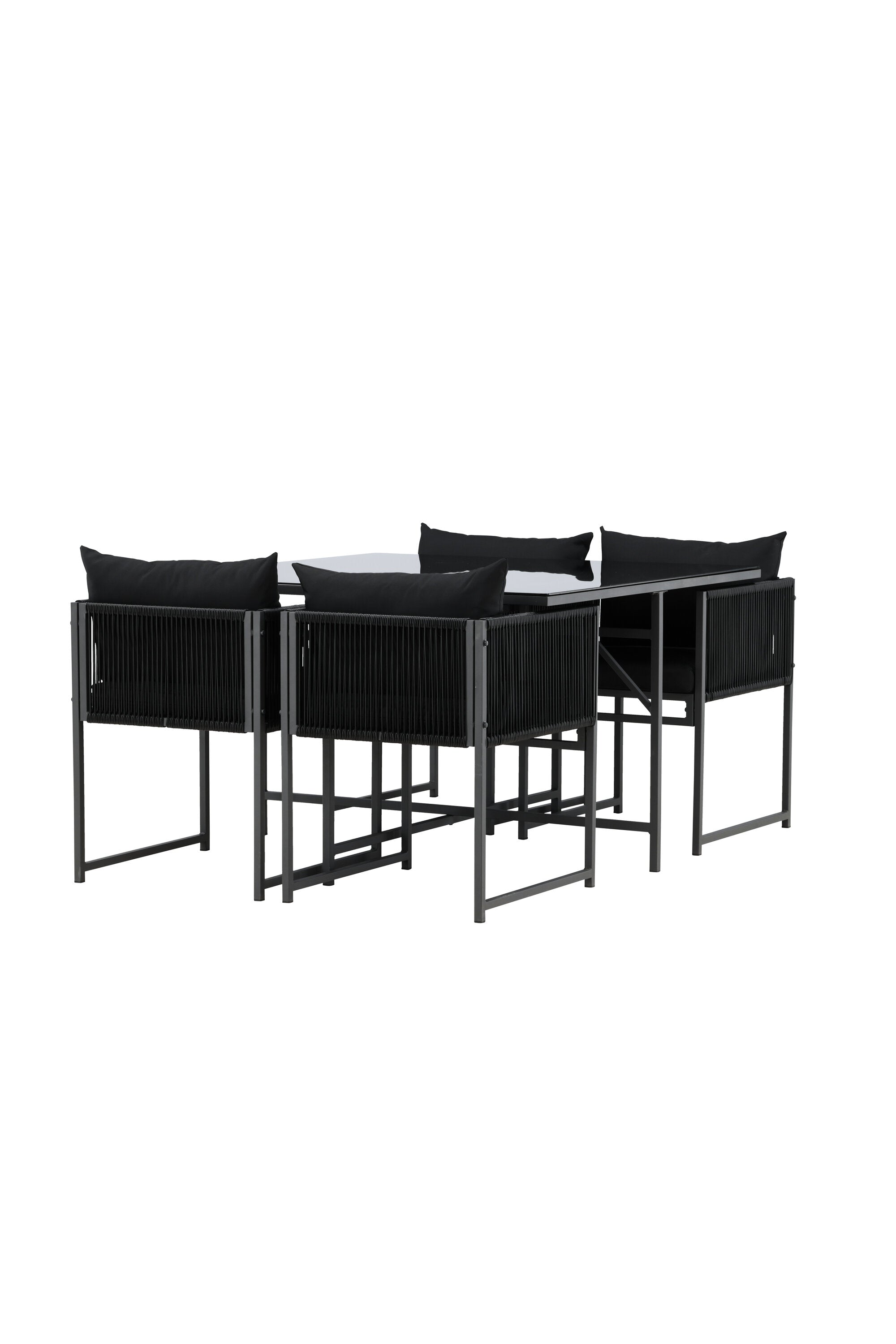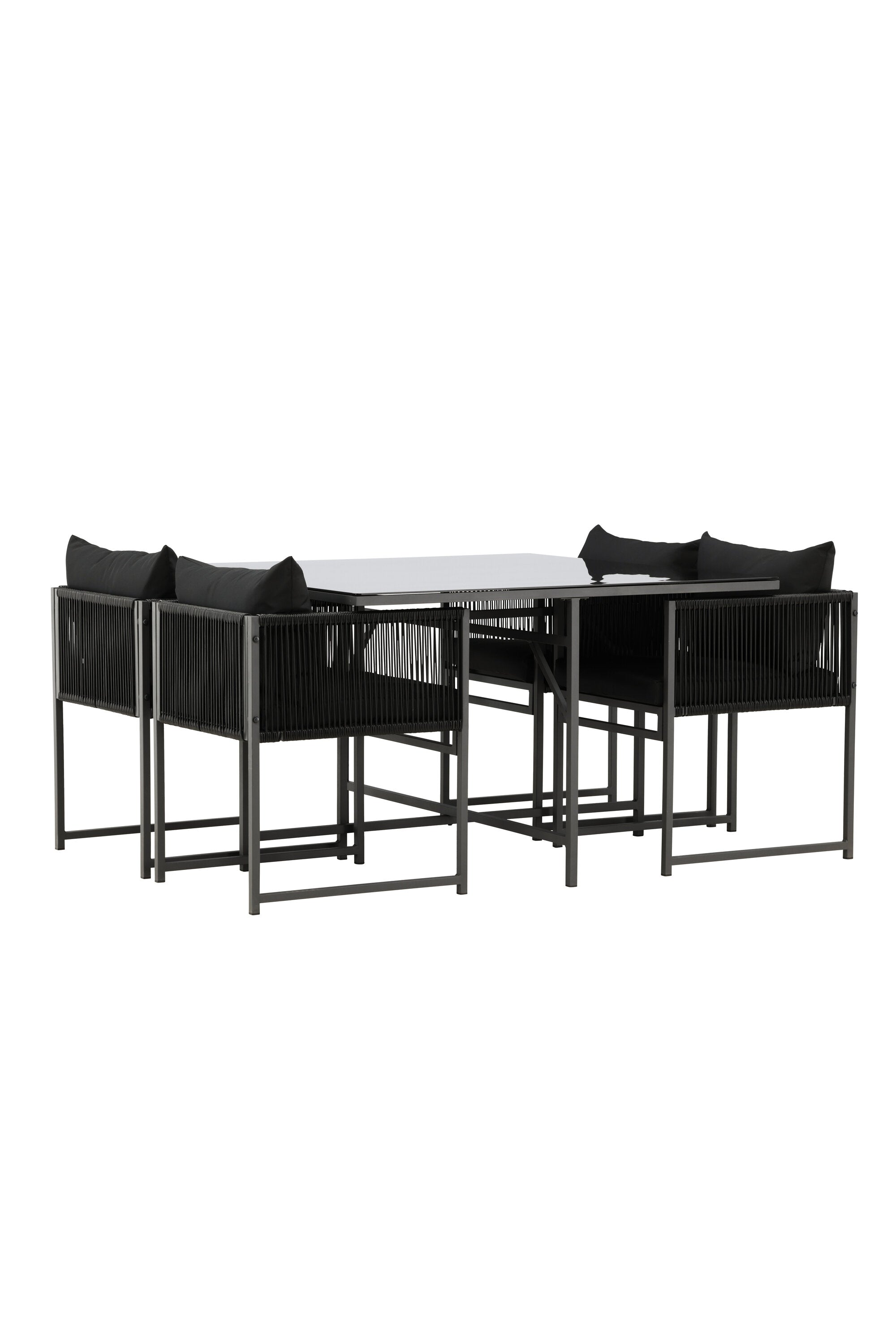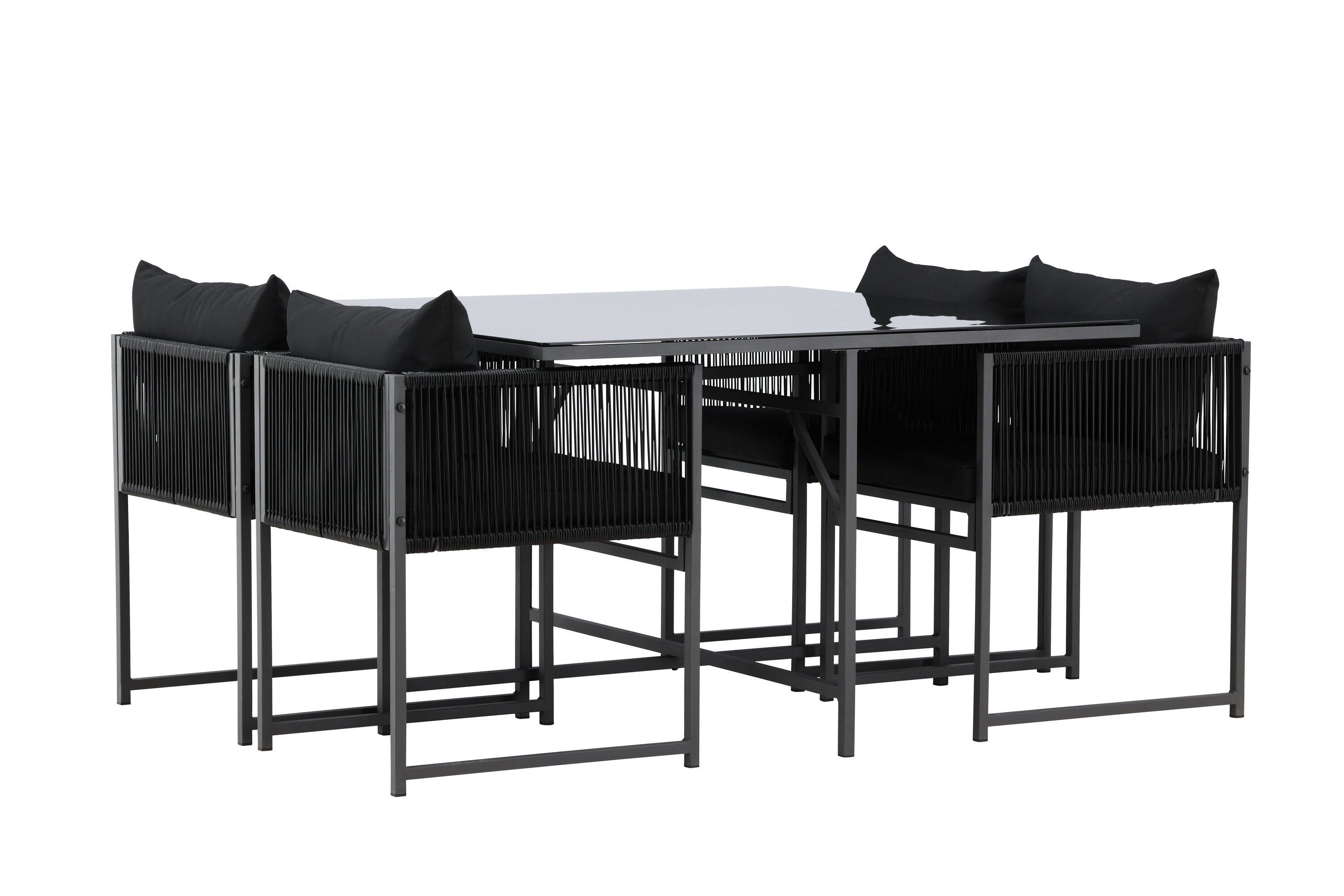 Noto je jídelní set, který dodá vaší terase elegantní nádech a vytvoří ideální místo pro příjemné večeře. Tato elegantní černá sada se skládá z velkého skleněného stolu a čtyř pohodlných jídelních židlí, které jsou navrženy tak, aby spojovaly estetiku a funkčnost. Židle mají robustní ocelový rám a jsou zdobeny stylovými lanovými detaily po stranách područek, které dodávají jedinečný a moderní charakter.