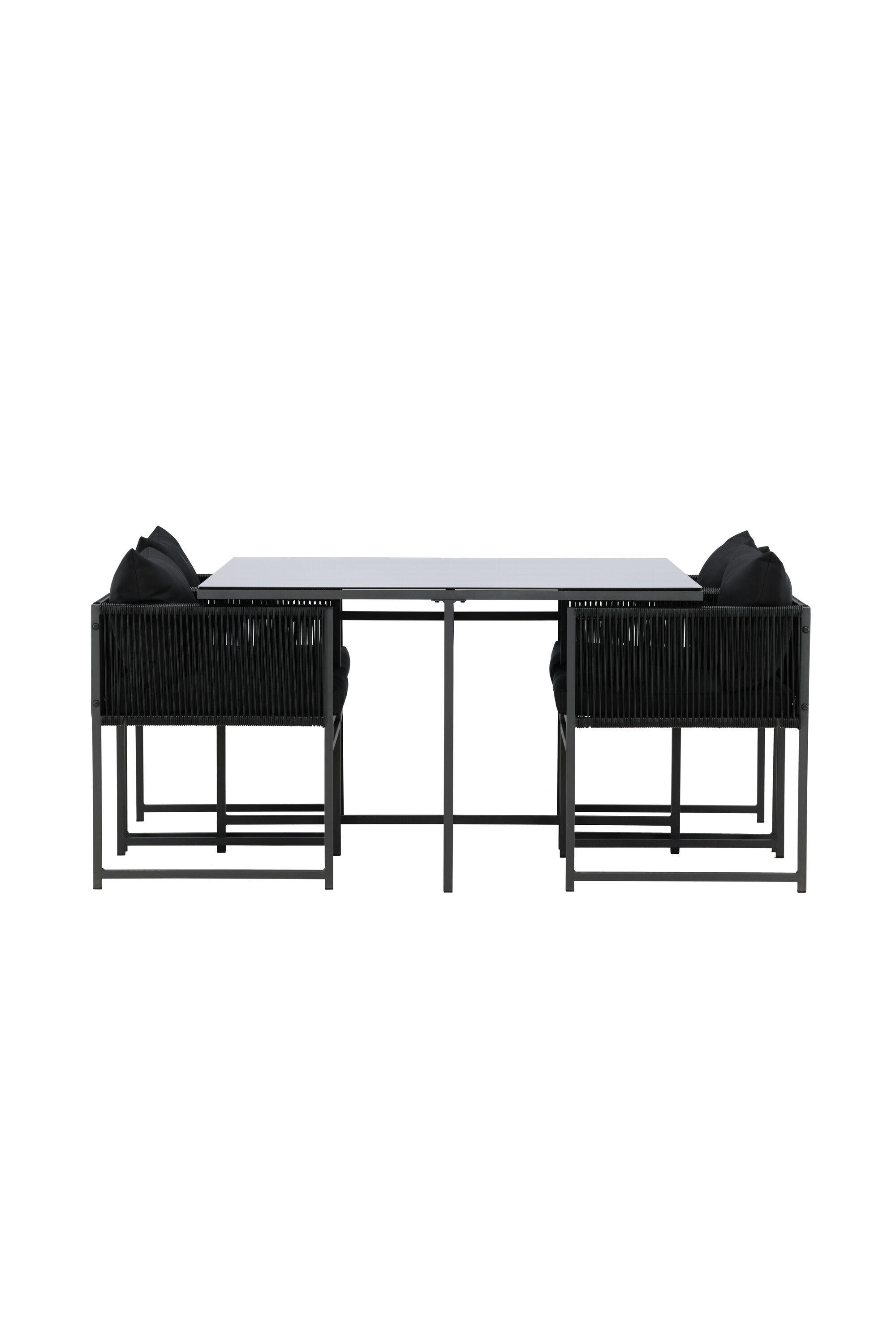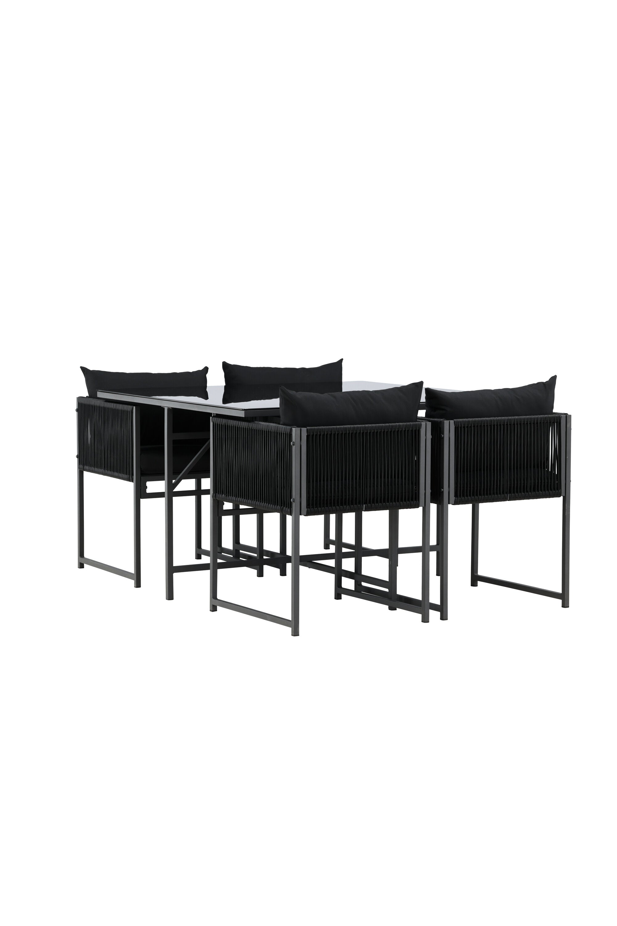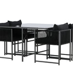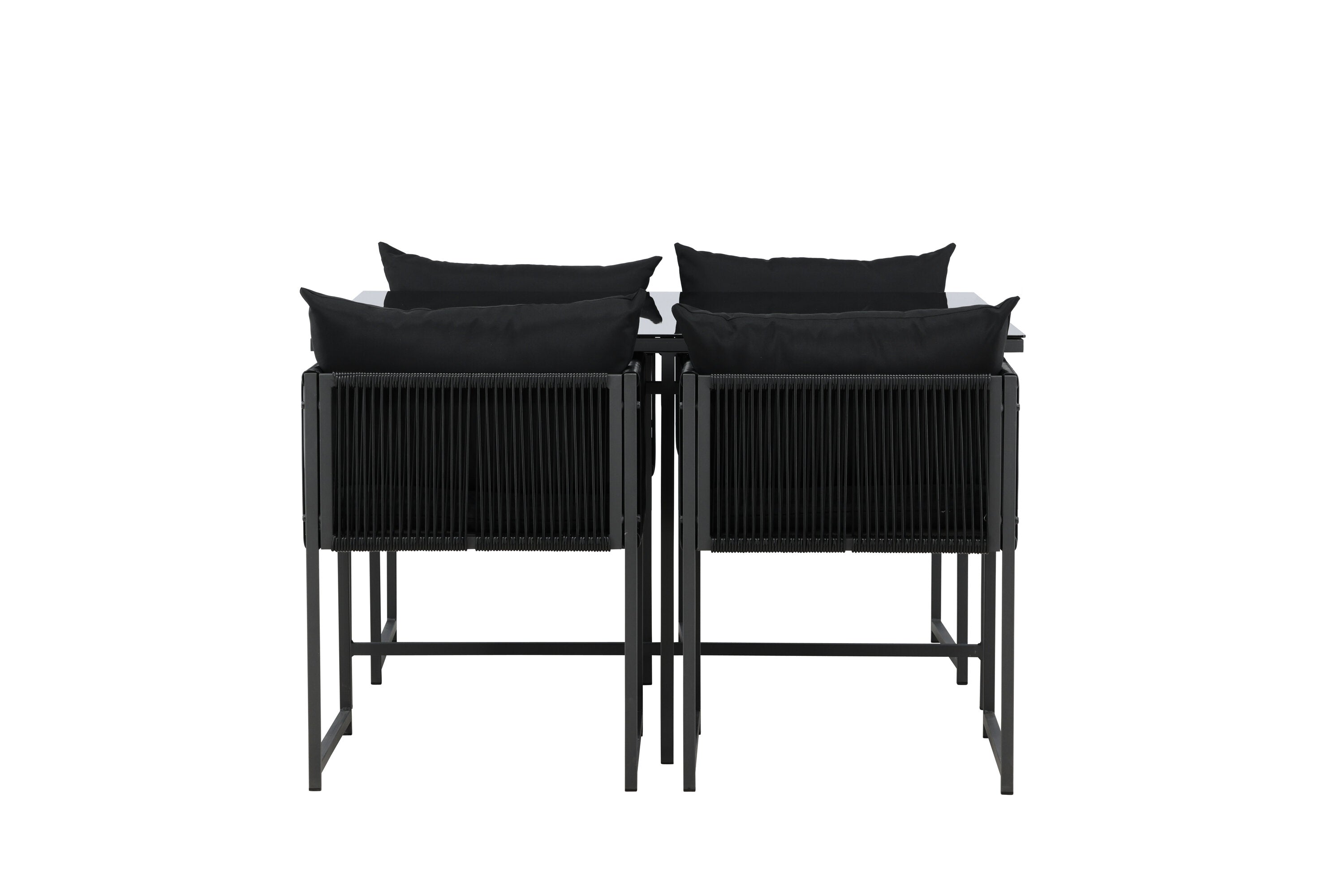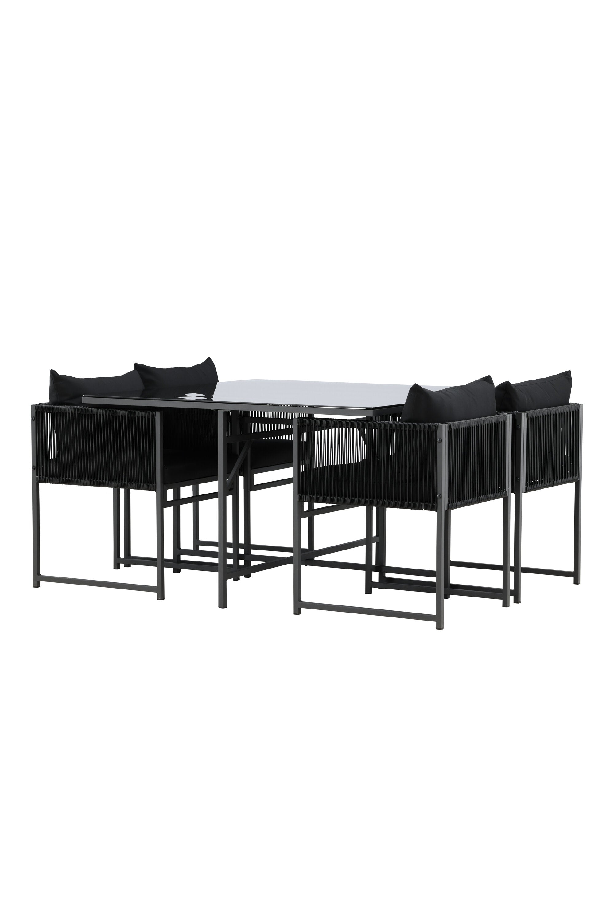 Noto je jídelní set, který dodá vaší terase elegantní nádech a vytvoří ideální místo pro příjemné večeře. Tato elegantní černá sada se skládá z velkého skleněného stolu a čtyř pohodlných jídelních židlí, které jsou navrženy tak, aby spojovaly estetiku a funkčnost. Židle mají robustní ocelový rám a jsou zdobeny stylovými lanovými detaily po stranách područek, které dodávají jedinečný a moderní charakter.
