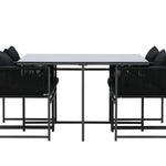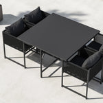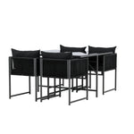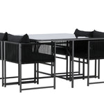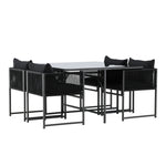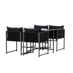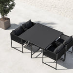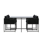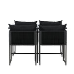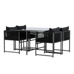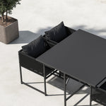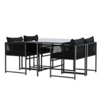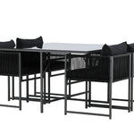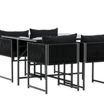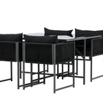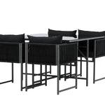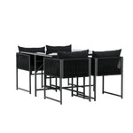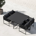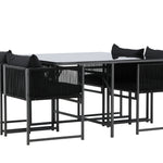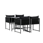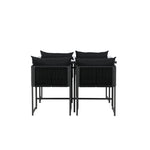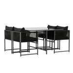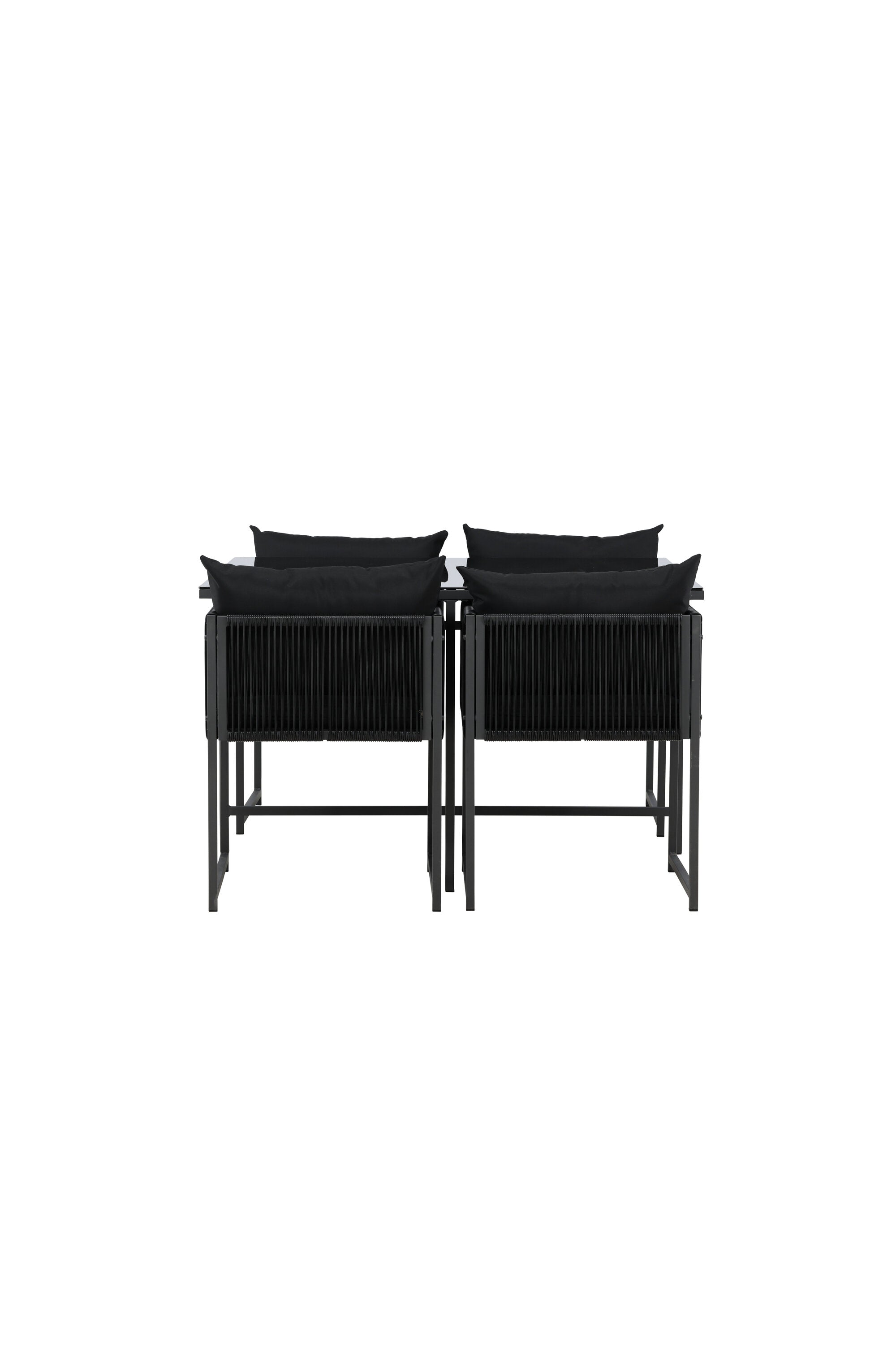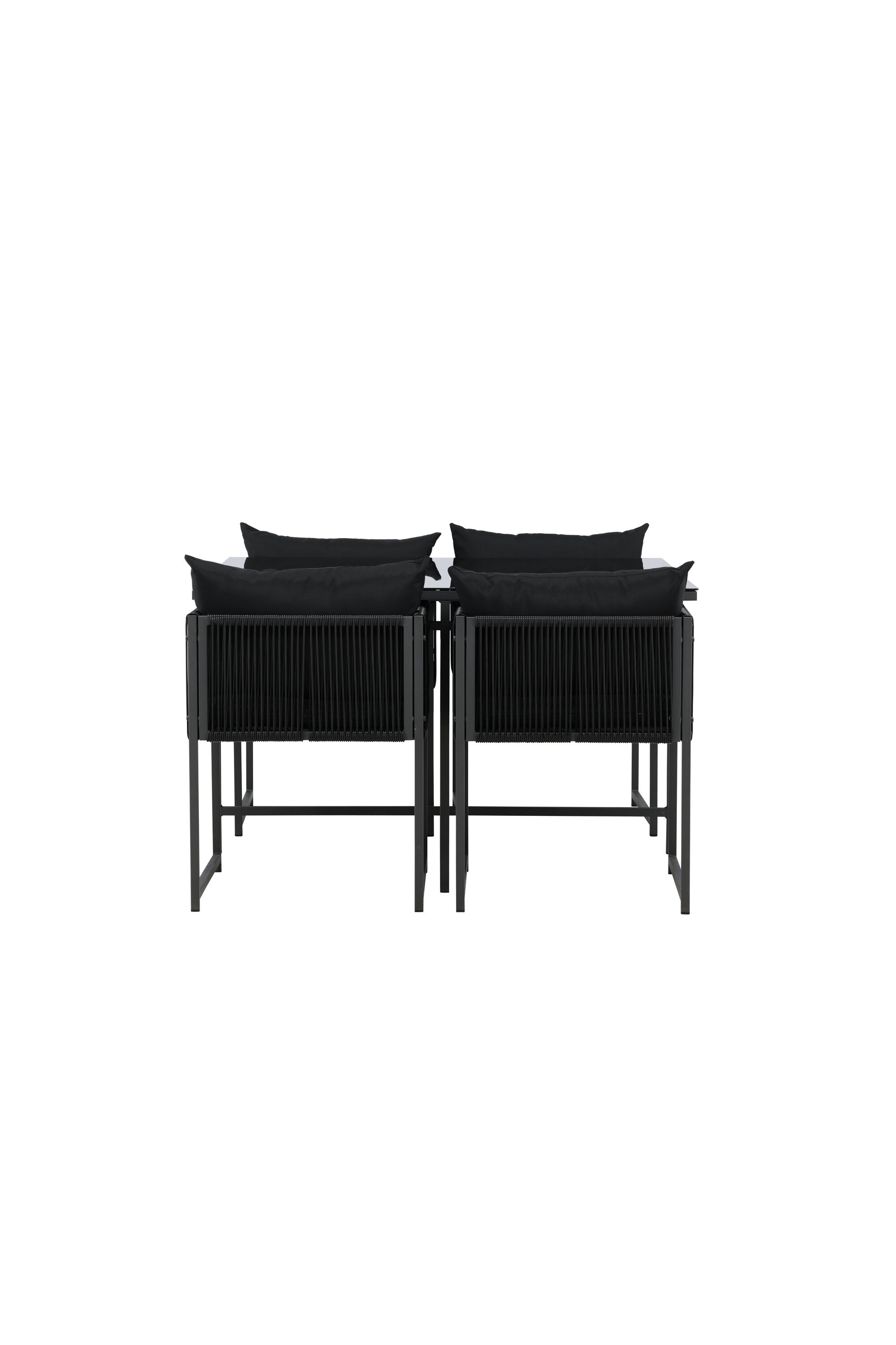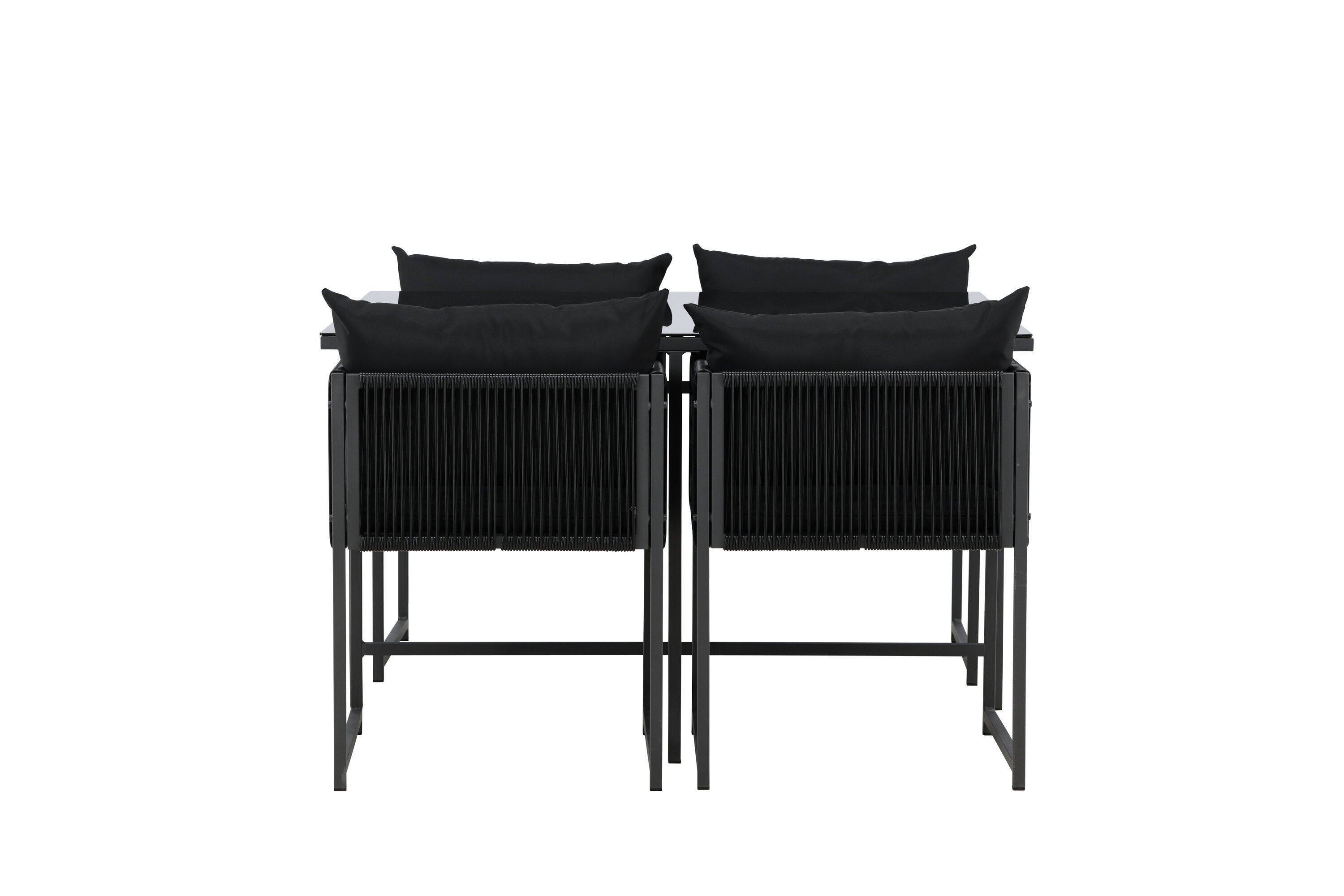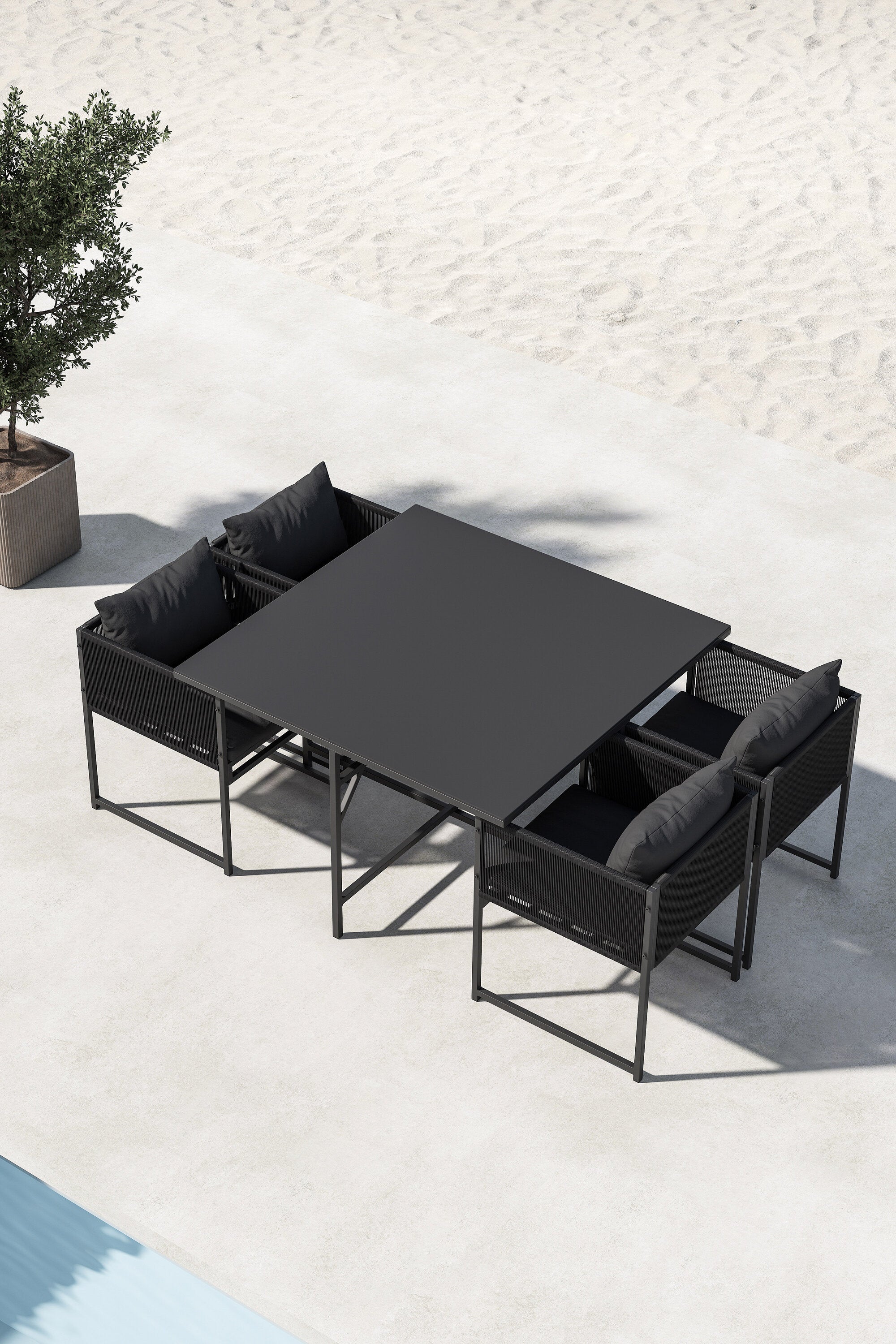 Noto je jídelní set, který dodá vaší terase elegantní nádech a vytvoří ideální místo pro příjemné večeře. Tato elegantní černá sada se skládá z velkého skleněného stolu a čtyř pohodlných jídelních židlí, které jsou navrženy tak, aby spojovaly estetiku a funkčnost. Židle mají robustní ocelový rám a jsou zdobeny stylovými lanovými detaily po stranách područek, které dodávají jedinečný a moderní charakter.