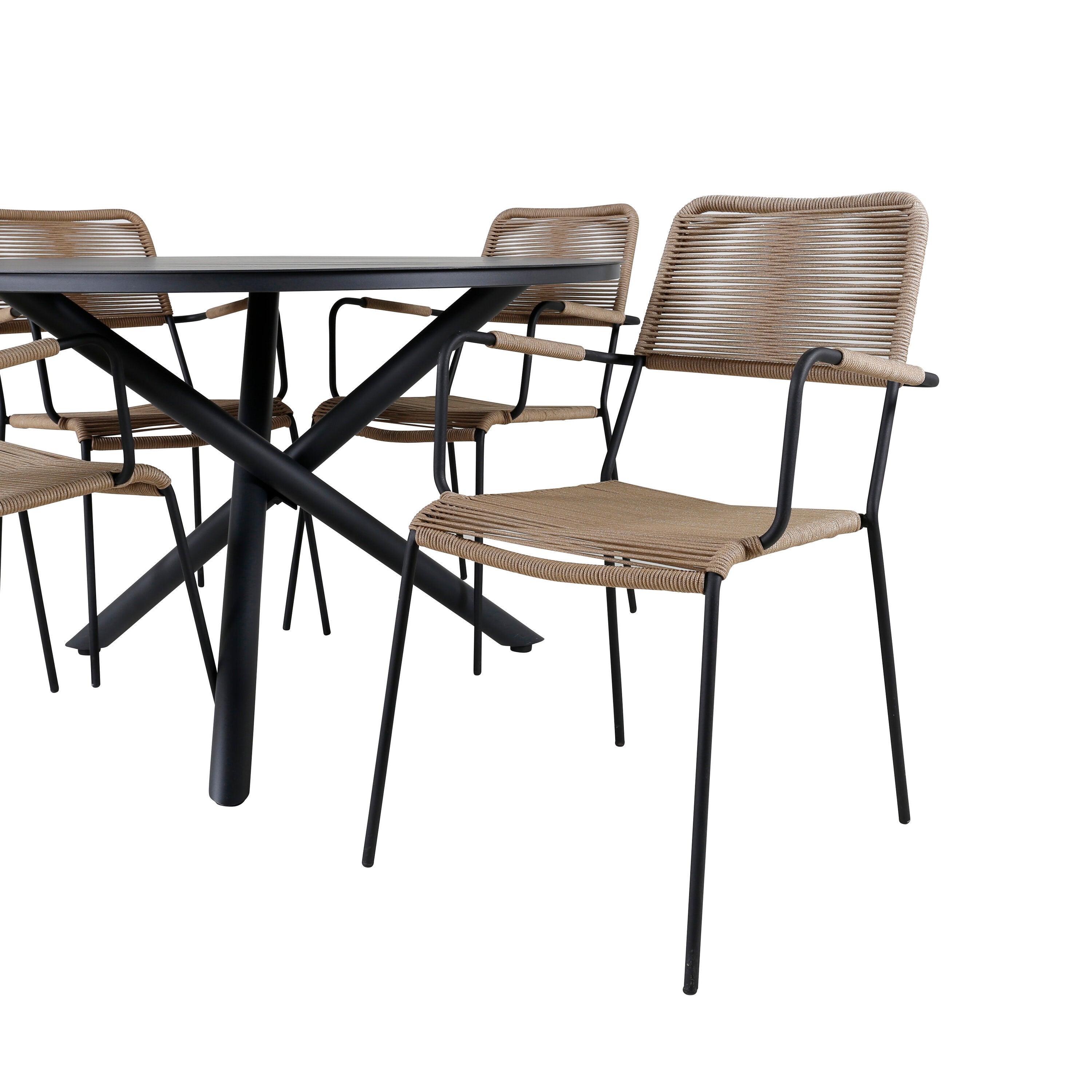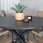 Přirozená a trendová skupina potravin na terasu! Naše oblíbené jídelní židle Lindos v lahodném provazu v barvě latte a stylové úzké nohy a také integrované područky v černé oceli jsou skutečnou designovou ikonou. Zde společně s vkusným jídelním stolem Alma s ozdobnými křížovými nohami v černém hliníku. Kulatá skupina jídla je ideální pro ty, kteří chtějí vytvořit příjemnou a rodinnou atmosféru ve vašem venkovním pokoji nebo na balkoně - pozvěte proto rodinu a přátele a vychutnejte si společně skvělé jídlo!