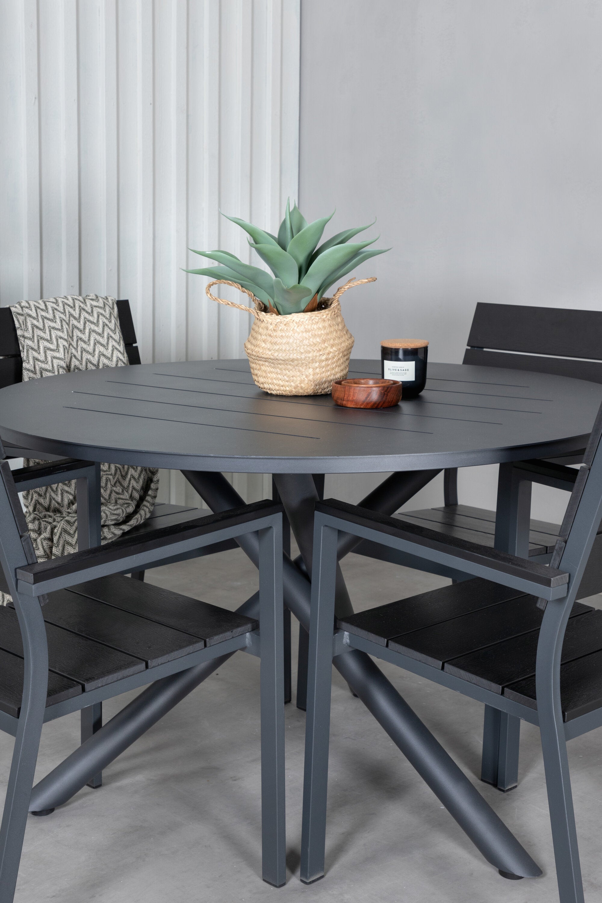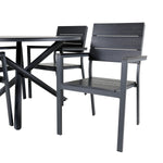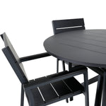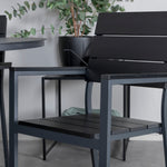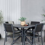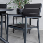 Lahodná sladká skupina potravin pro všechna letní jídla - hodí se stejně dobře do venkovního prostoru jako na balkon! Levels je praktické křeslo v černém hliníku s černým sedákem a opěradlem v barvě Smaster Aintwood. Židle je stohovatelná pro snadné skladování. Zde společně s naším kulatým jídelním stolem Alma v černém hliníku. Vytvořte dokonalou společenskou atmosféru na terase!