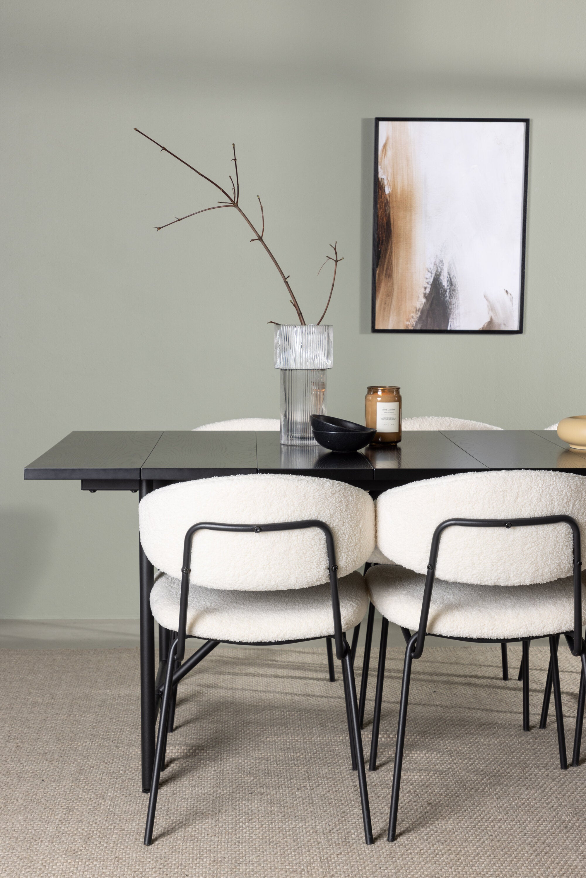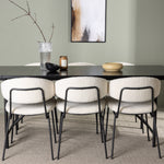 Zde jsme jídelní stůl doplnili o poutavé židle ze série Chico. Tato židle kombinuje minimalistický styl se zaobleným a štíhlým designem. Tkanina bouclé v krásné béžové barvě vyzařuje pocit luxusu a pohodlí. Sedák a opěradlo jsou polstrované pro větší pohodlí během dlouhých večeří a příjemných rozhovorů. Černá ocelová konstrukce je nejen trendy, ale také poskytuje stabilitu a odolnost. Jednoduše řečeno, je to dokonalý design.