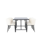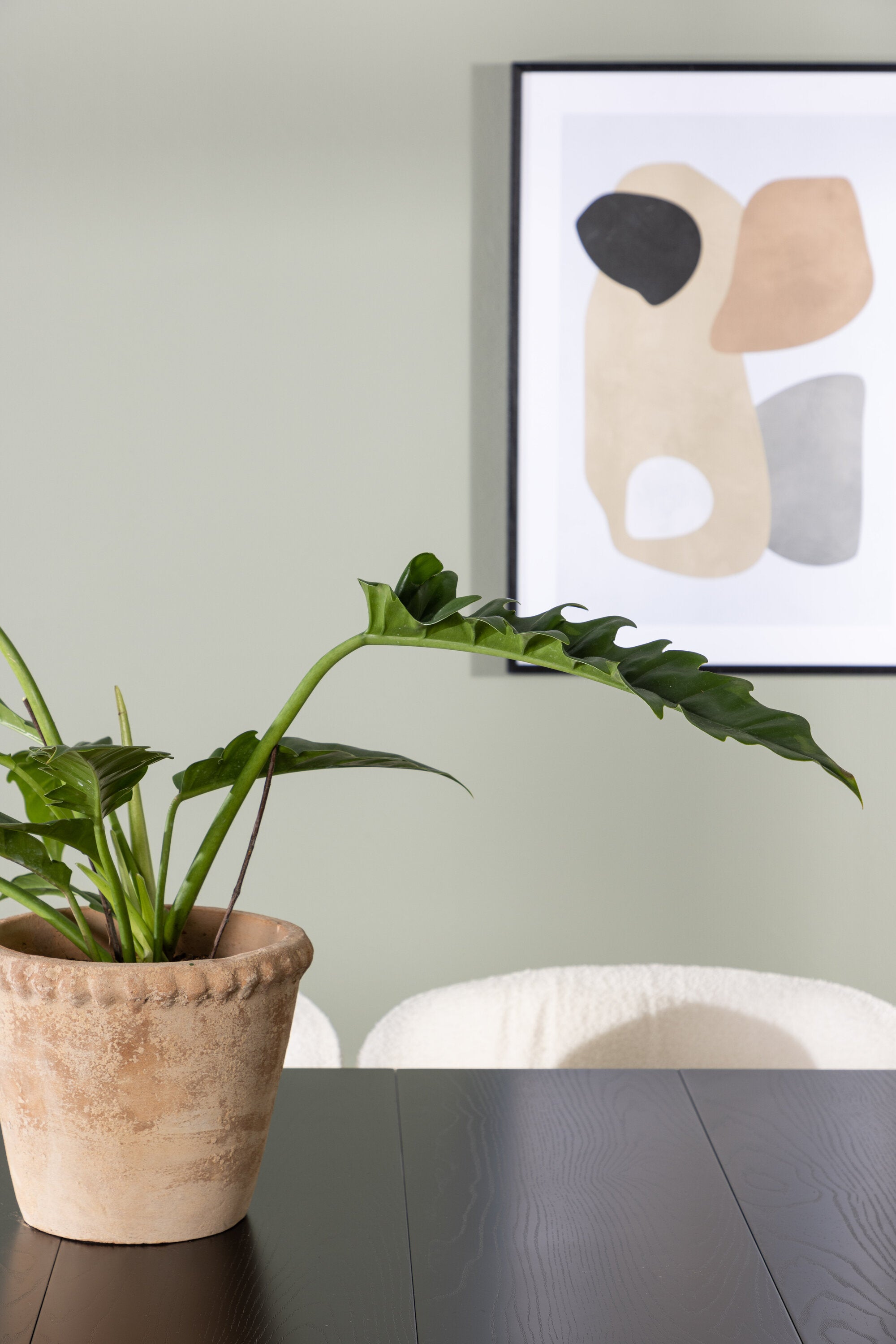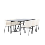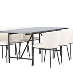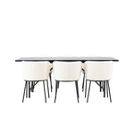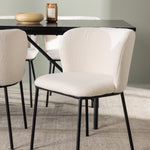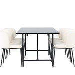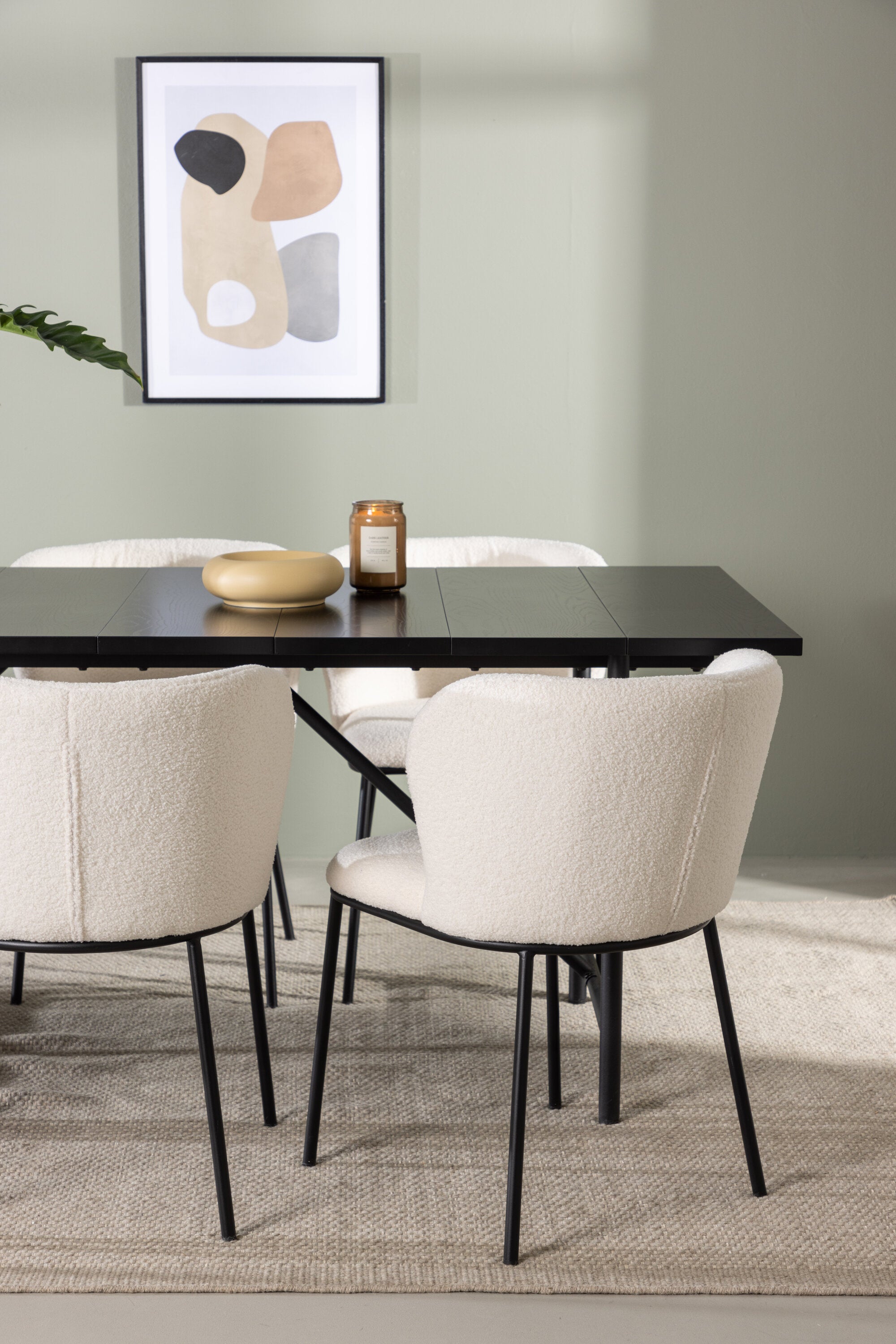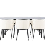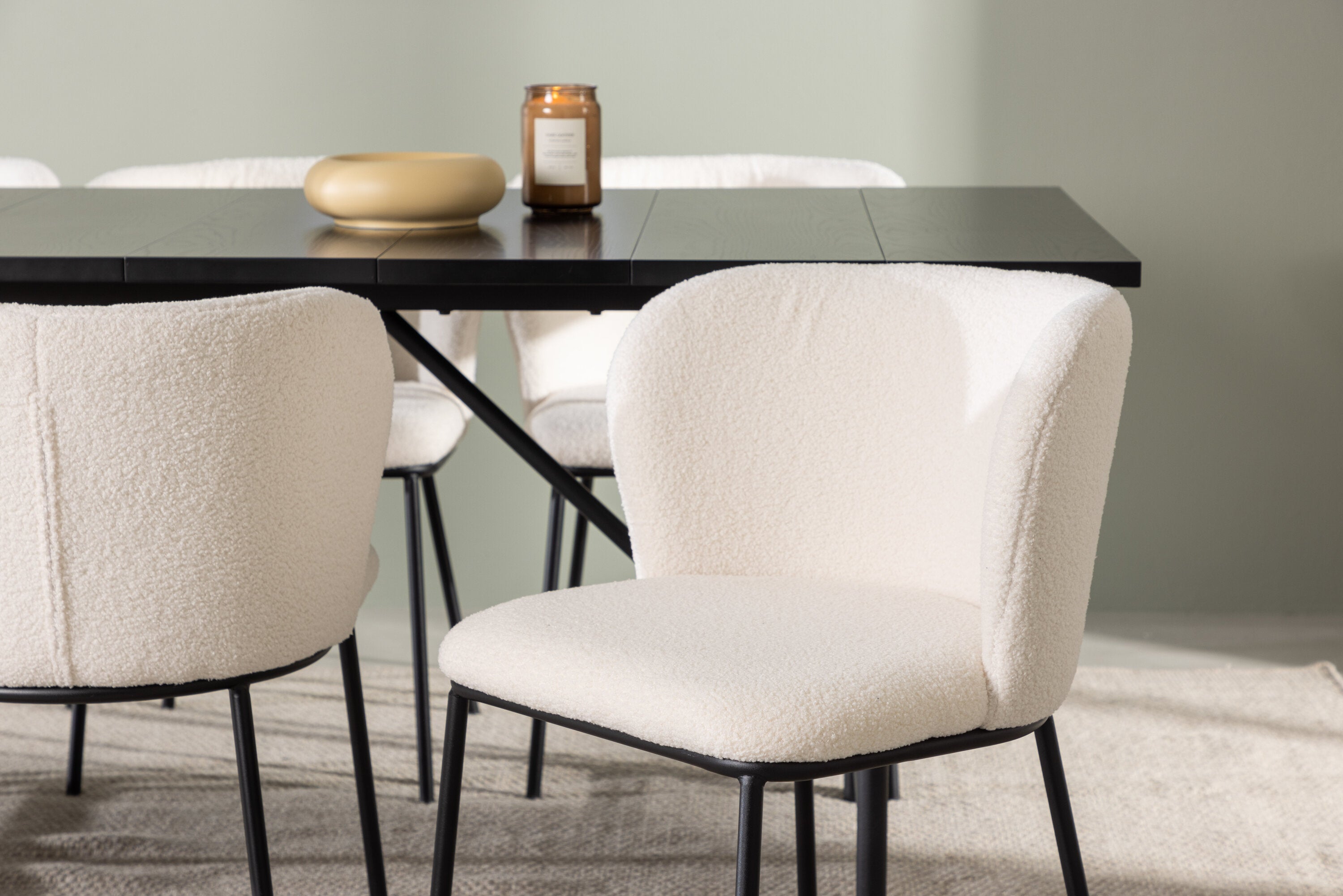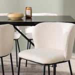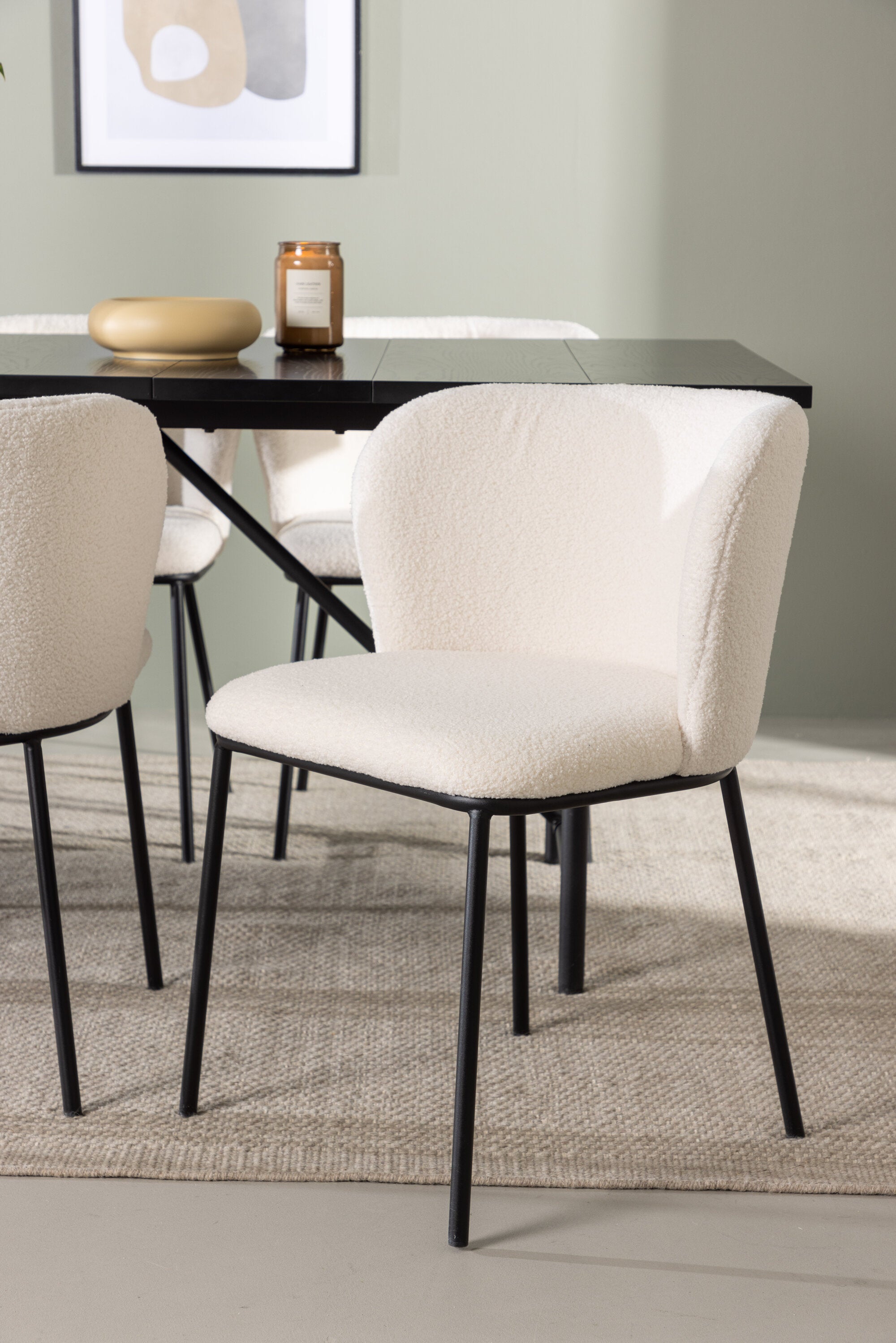 Spolu s tímto černým jídelním stolem máme naše bílé jídelní židle ze série Edina. Edina je křeslo snů pro jedince, kteří mají rádi módu. Díky celočalouněnému sedadlu z měkké a elegantní bílé boucle látky a minimalistickým černým kovovým nohám se každé sezení stane potěšením pro oko i pro tělo.