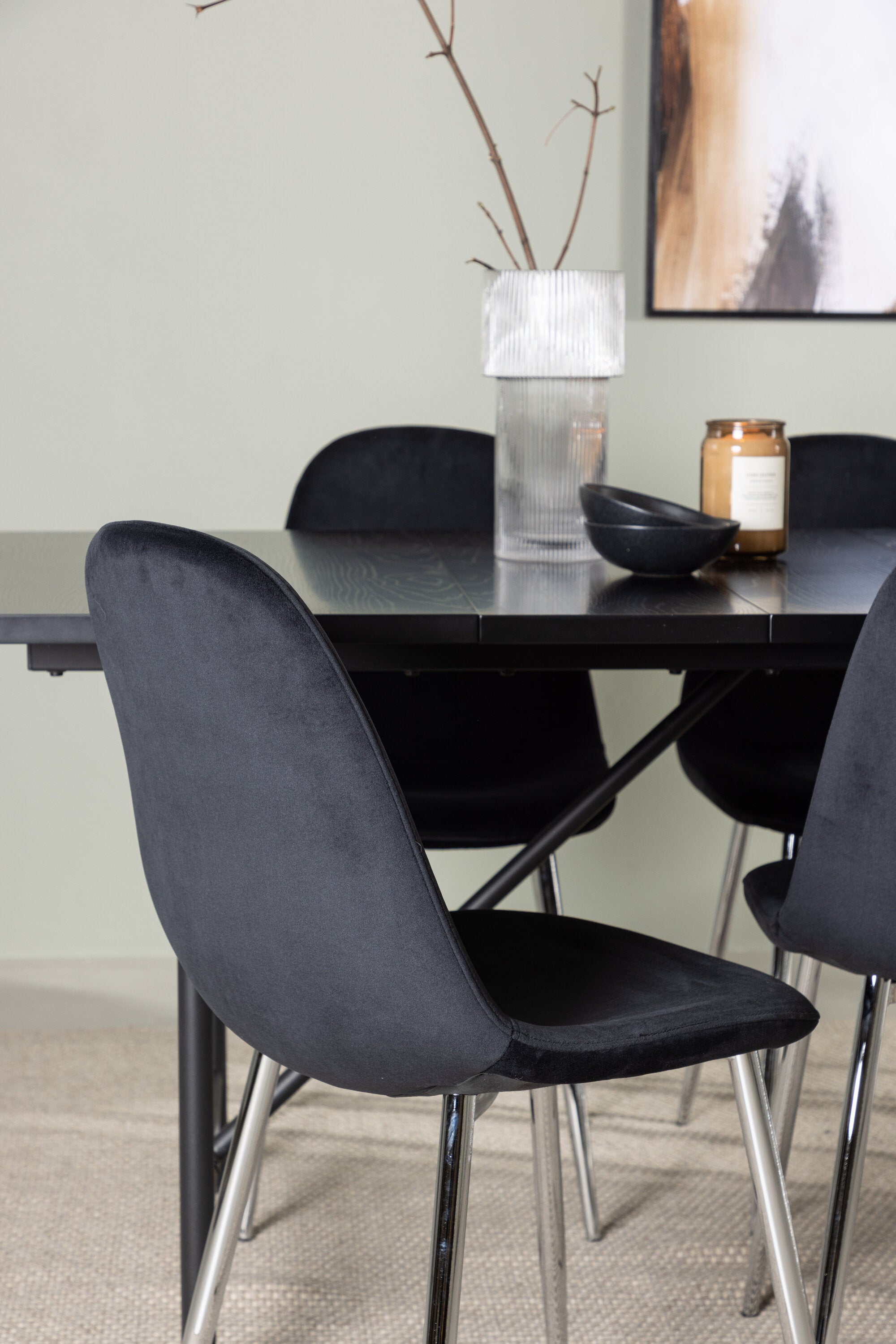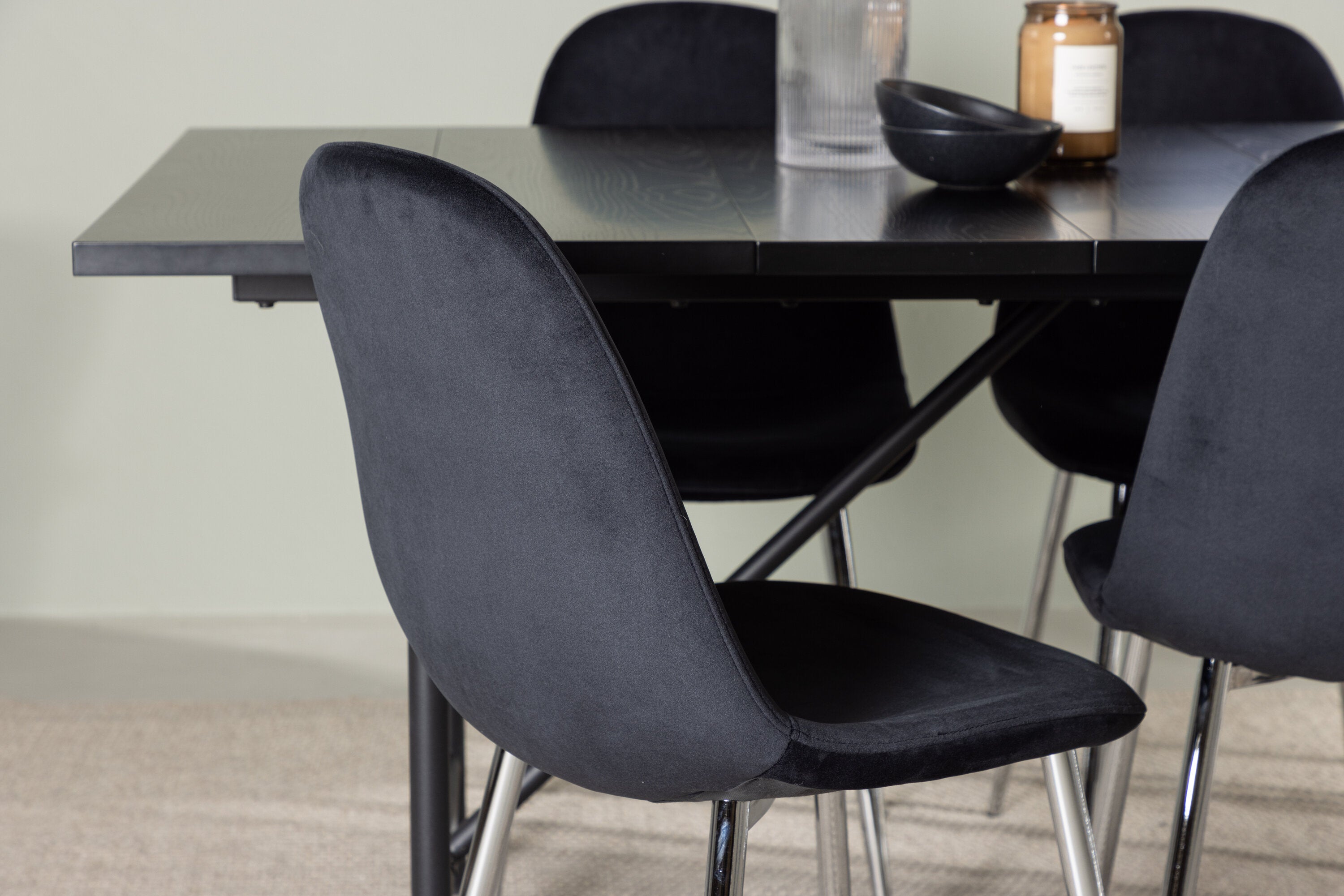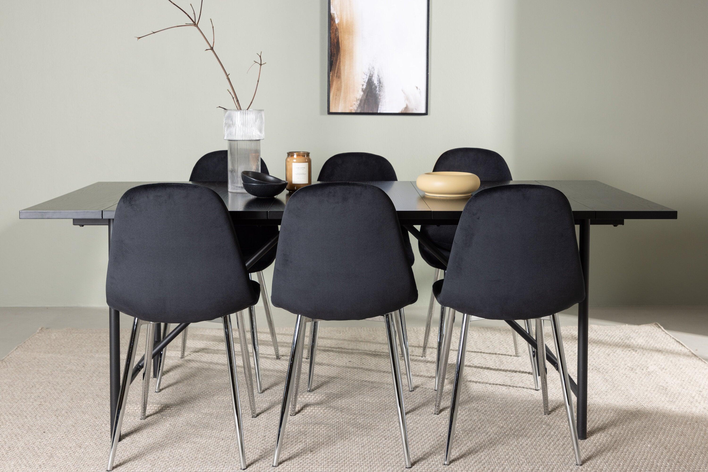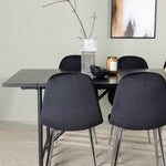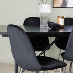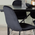 Pro doplnění jídelního stolu Astrid jsme jej sladili s našimi černými židlemi ze série Polar, které okamžitě zvyšují eleganci. Mírně zaoblená záda a štíhlý sedák z měkké černé sametové látky s velkorysým polstrováním poskytují úžasný komfort. Zároveň se chromované kovové nohy stávají stylovým detailem, který vynikne.