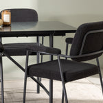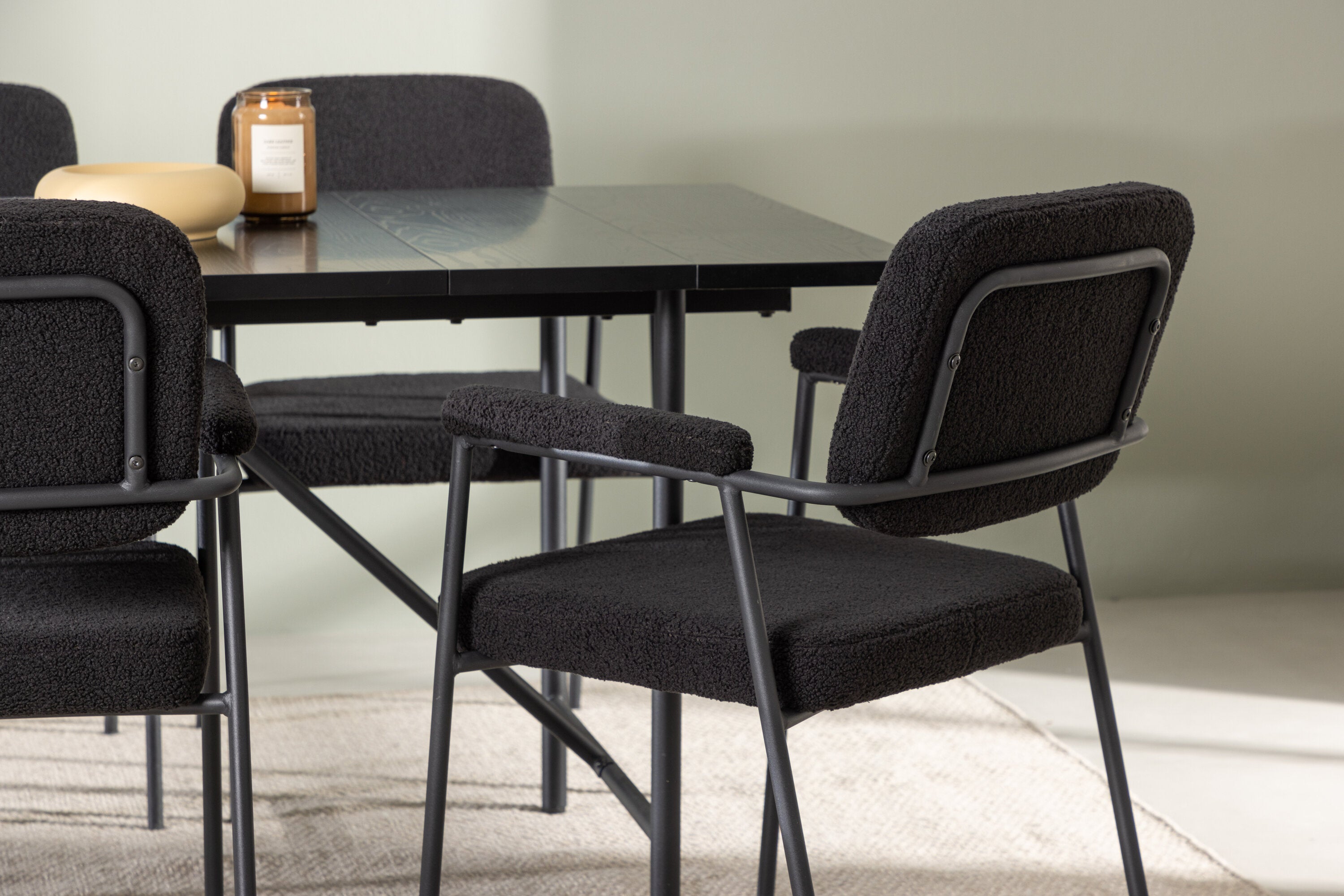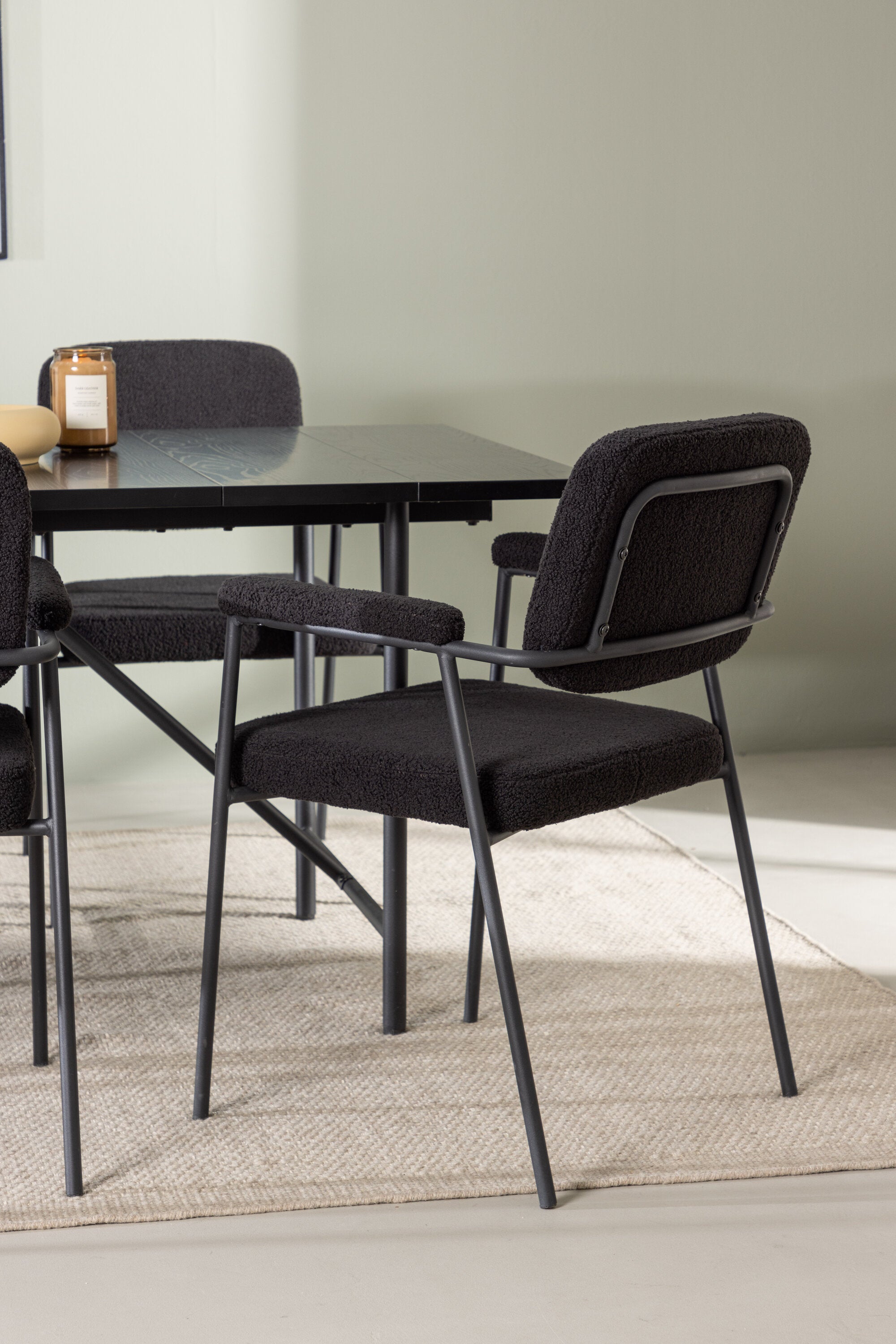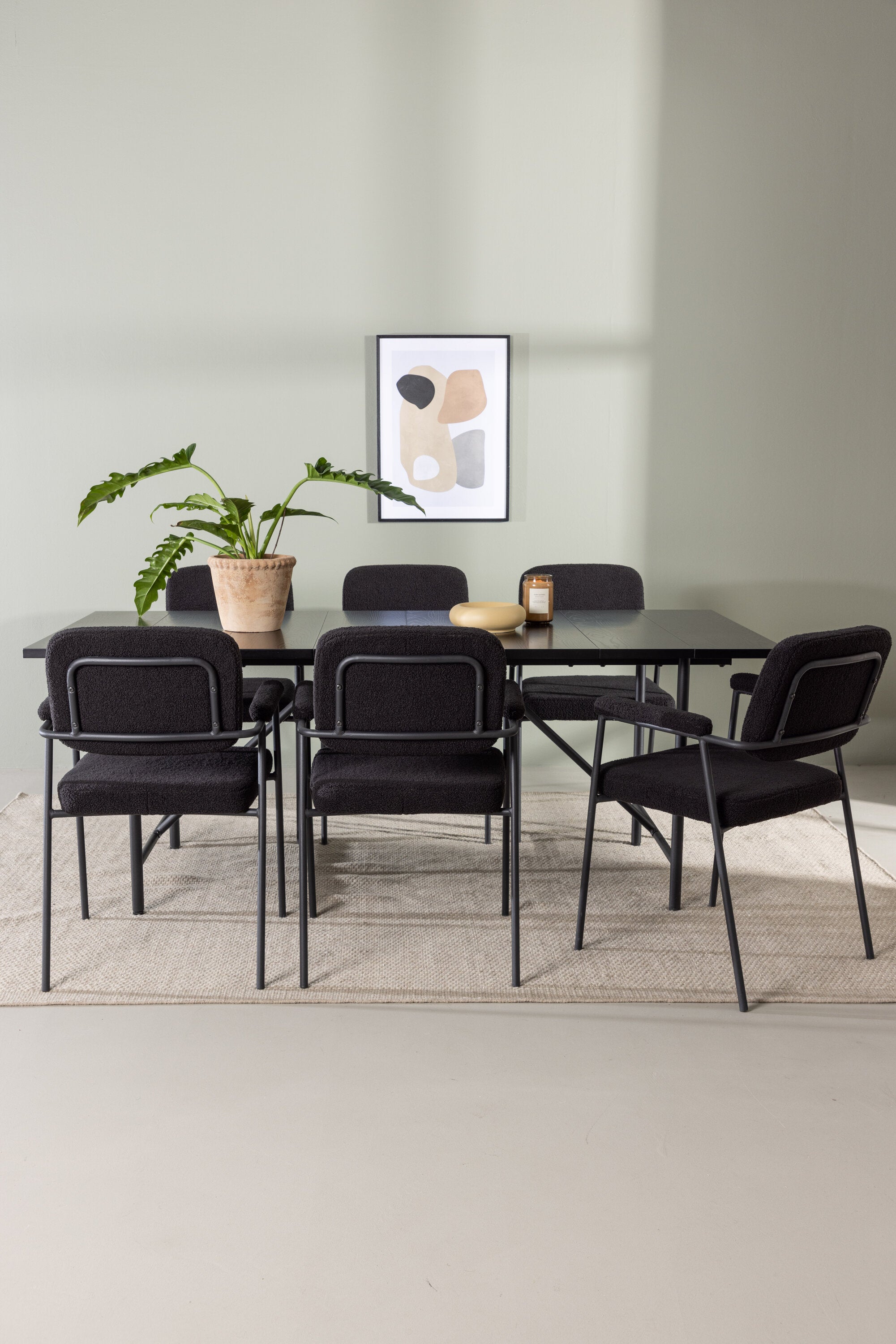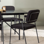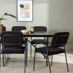 Zde jsme sladili černý jídelní stůl s měkkými jídelními židlemi Yesterady. Tato elegantní židle ve skandinávském designu má celočalouněný sedák z černé látky Bouclé a úzké nohy židle s integrovanými područkami z černého kovu. Měkké sedadlo je čalouněné pro větší pohodlí a zve vás k dlouhým příjemným chvílím večeře.