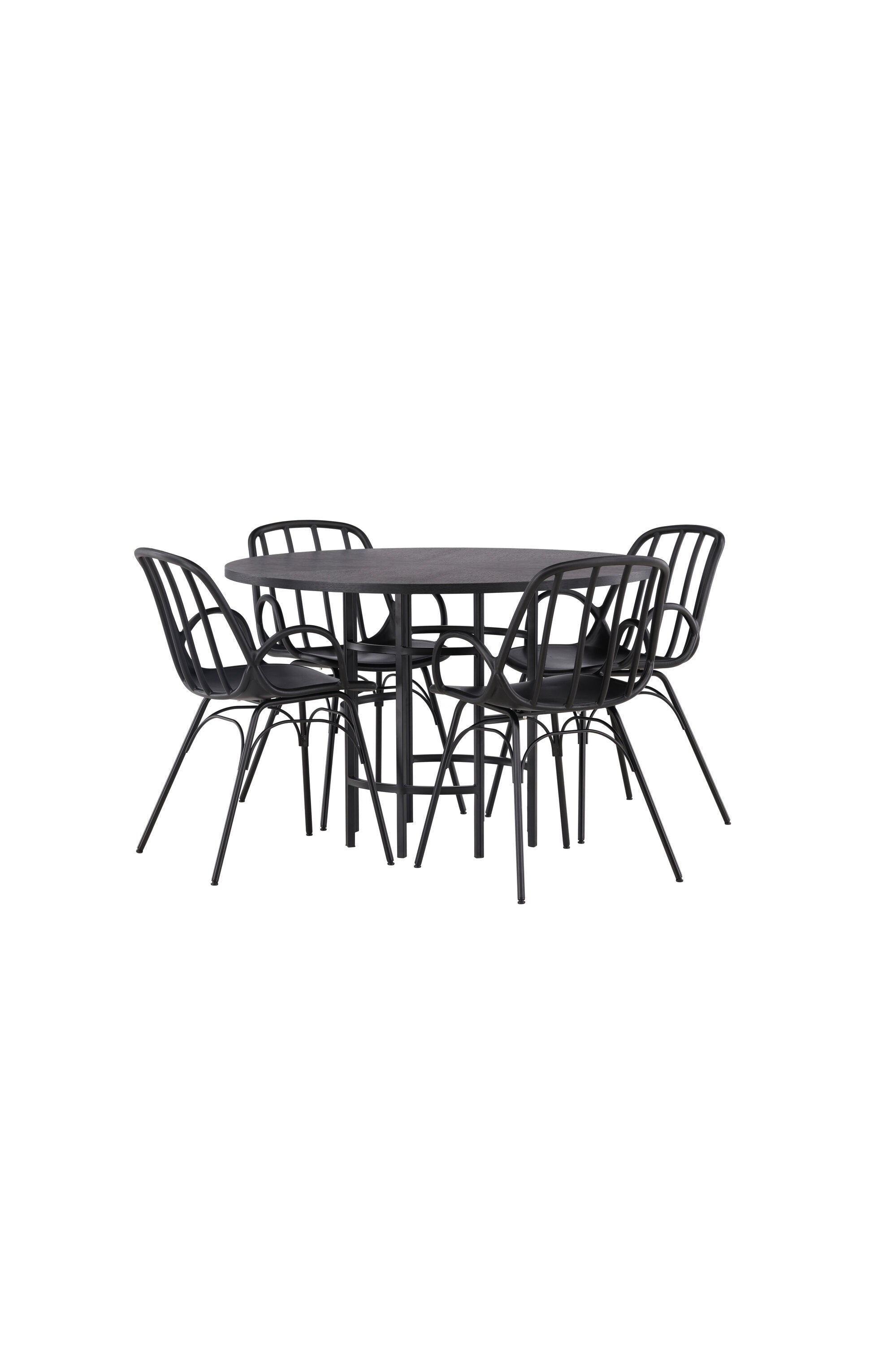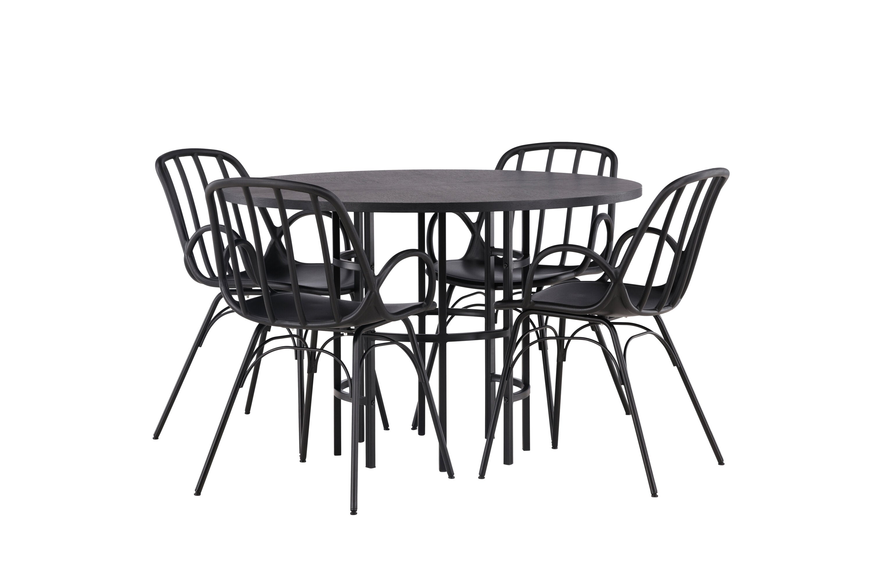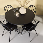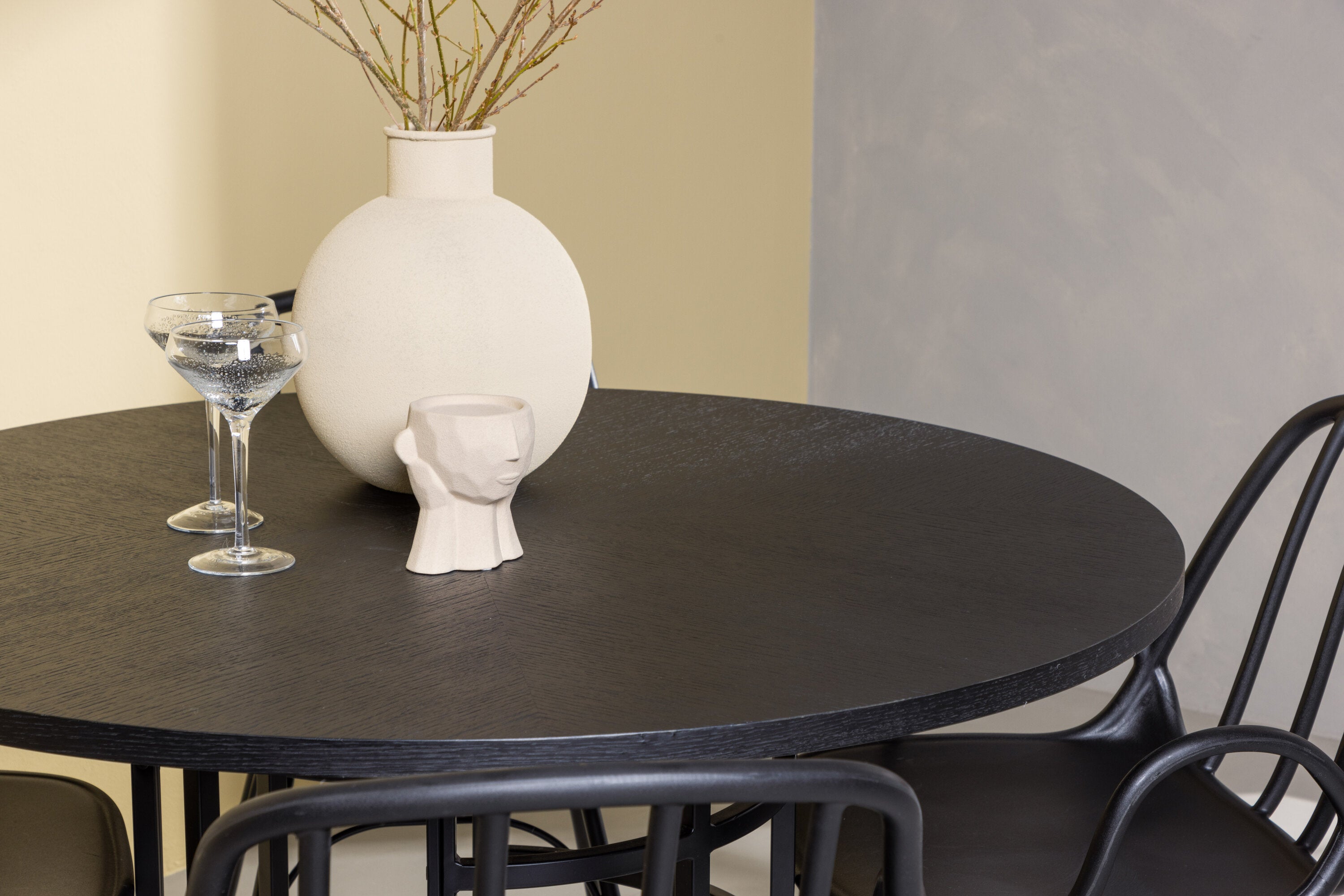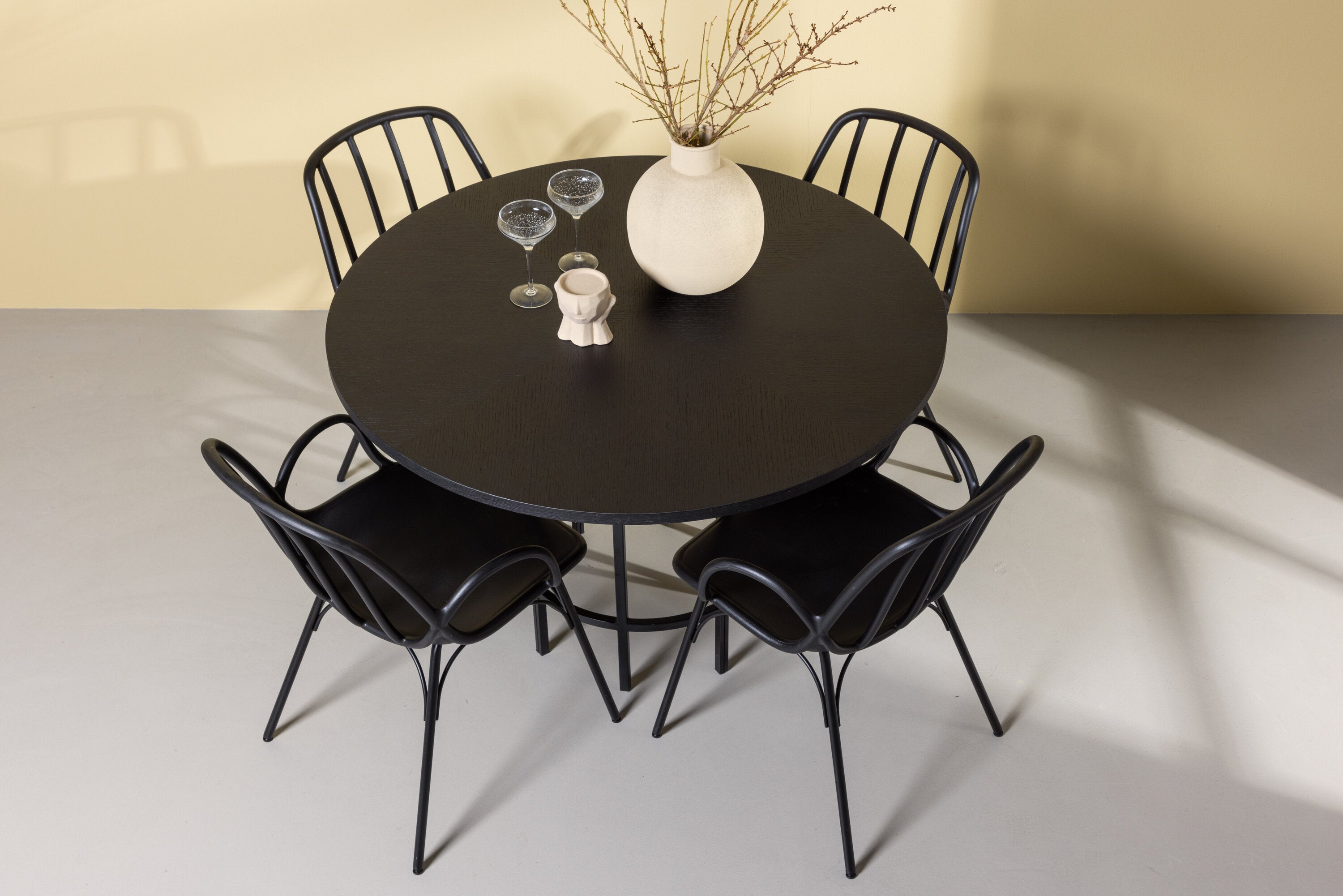 Tato jídelní sestava se hodí stejně dobře do kuchyně jako do slavnostního obývacího pokoje! Náš kulatý jídelní stůl Copenhagen má elegantní černou desku stolu z MDF a ozdobnou válcovou základnu z černého kovu. Zde v kombinaci s promyšlenou jídelní židlí ze série Dyrön. Židle je stylová i praktická, vyrobena z černého plastu a oceli. Sedák má integrované područky a žebrovaný design v mírně zaoblené zadní části. Nohy židle jsou stylově úzké a mírně rozšířené ve skandinávském designu. Posaďte se do budoucnosti! Rozměry stolu: 115 cm.
