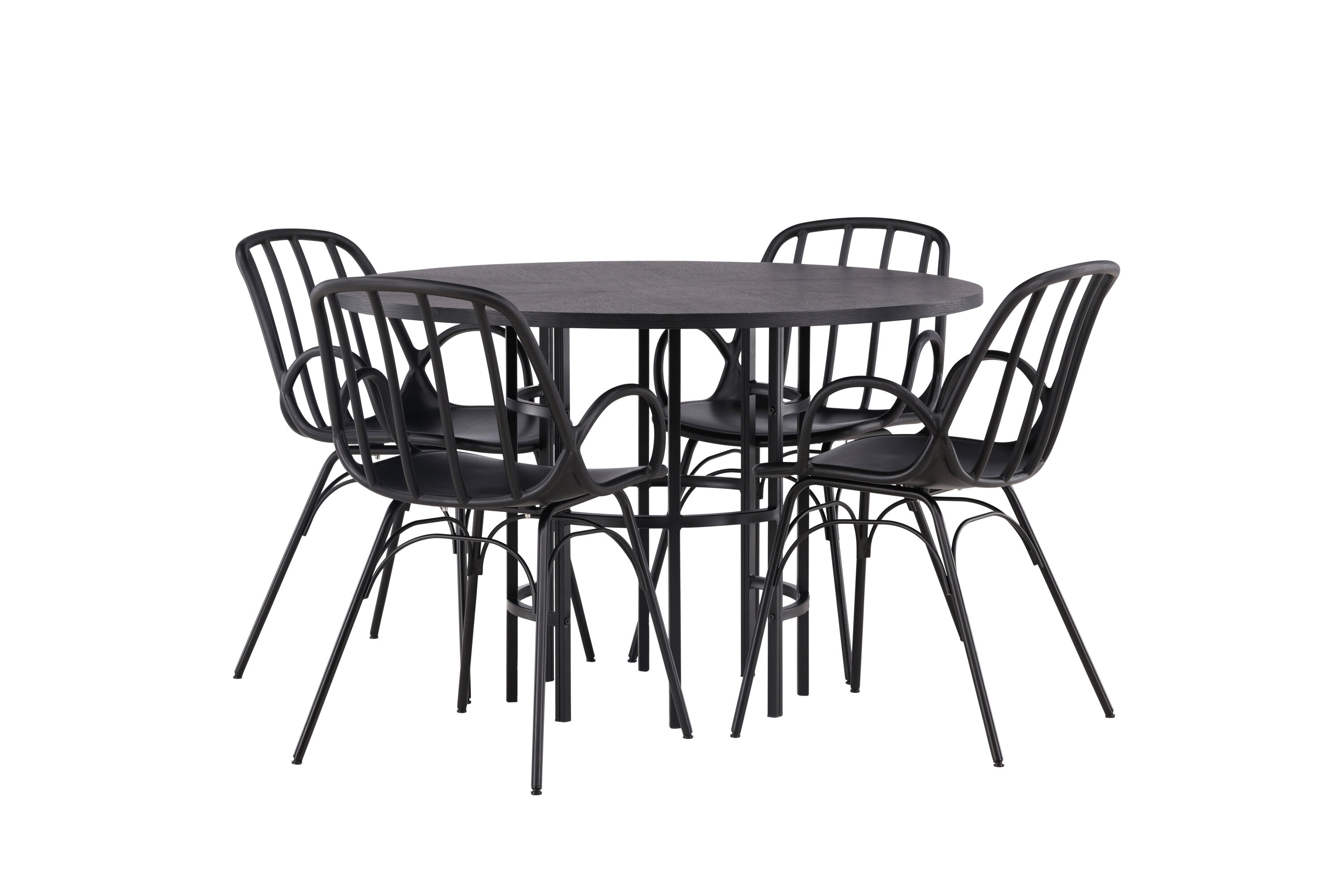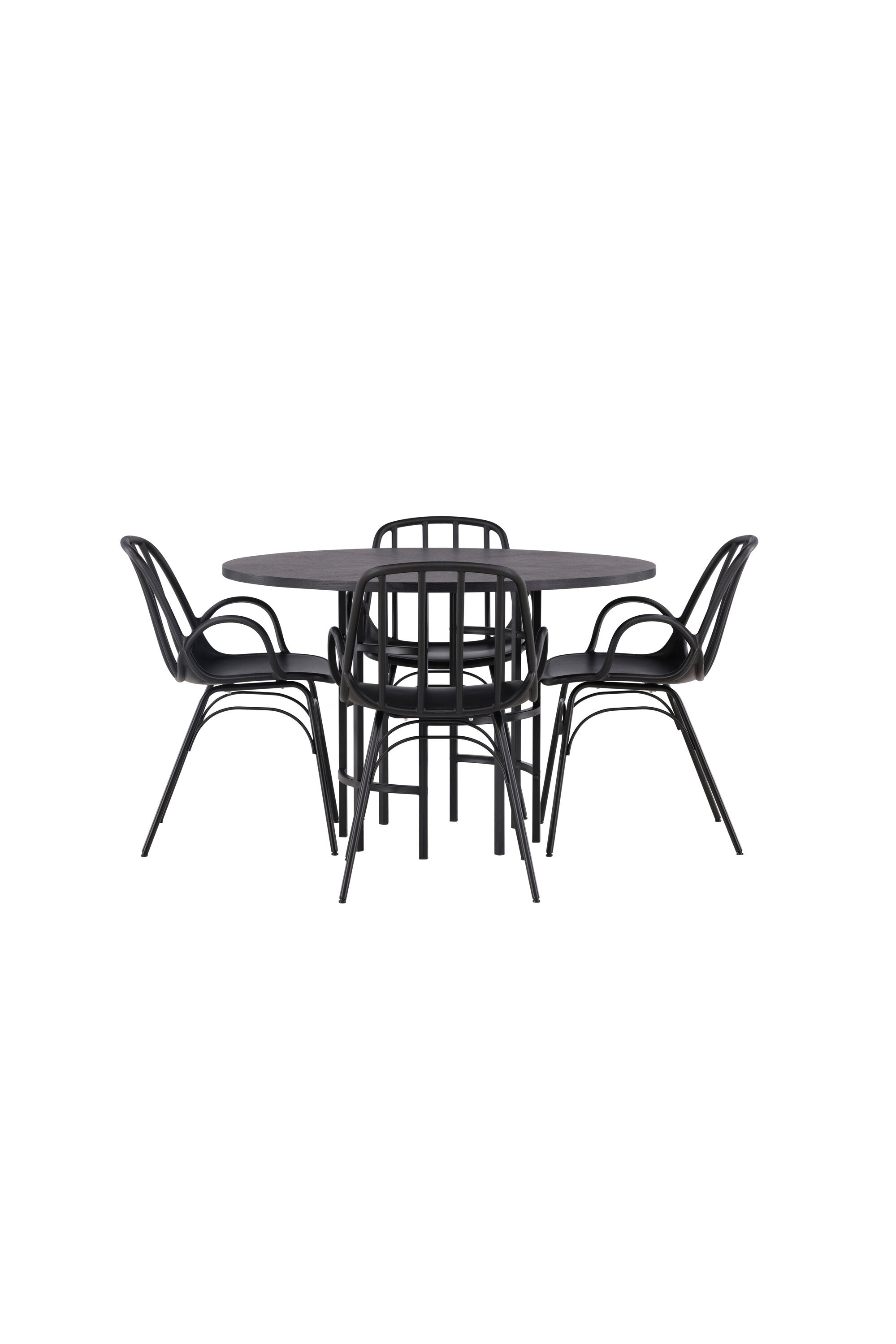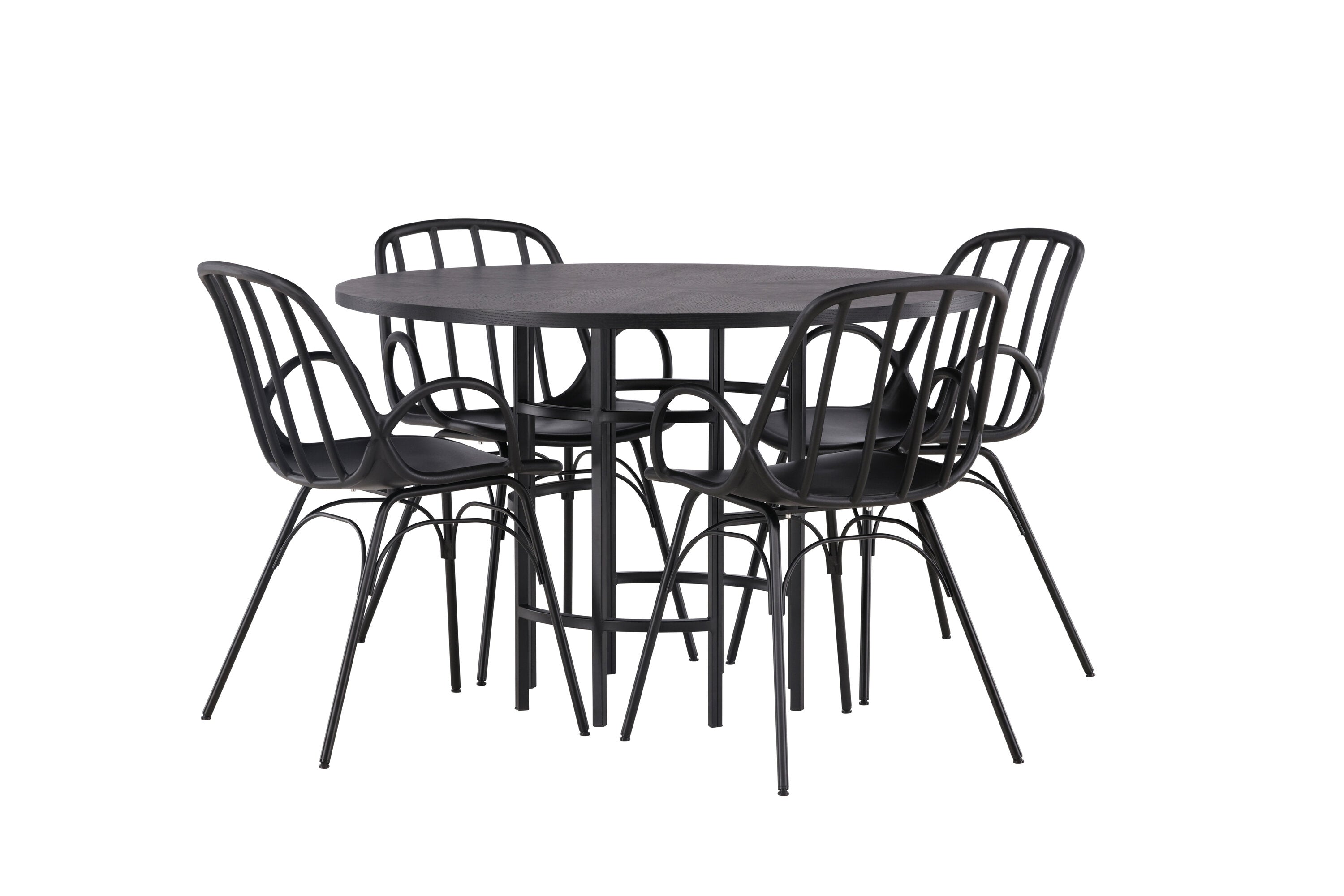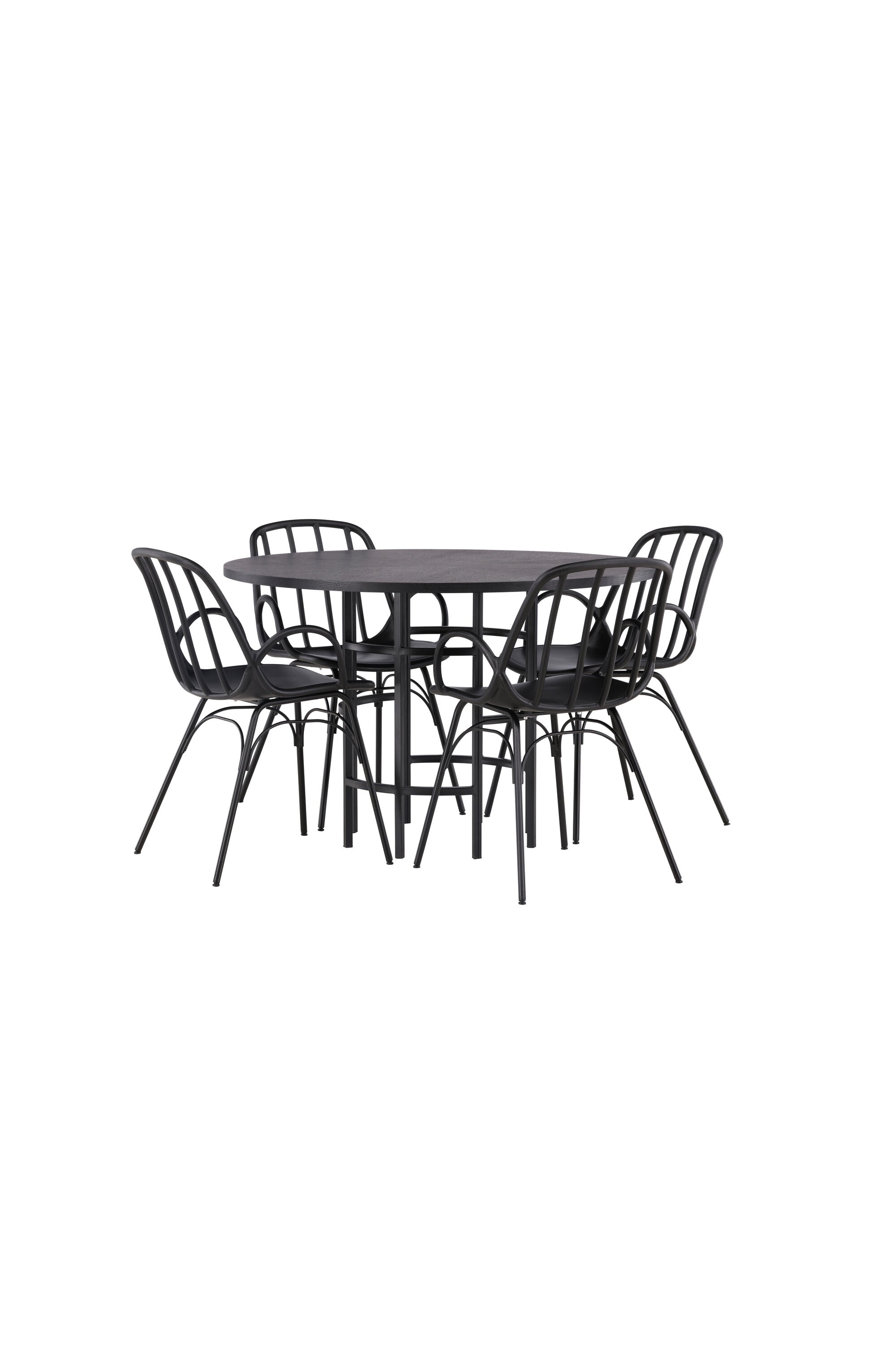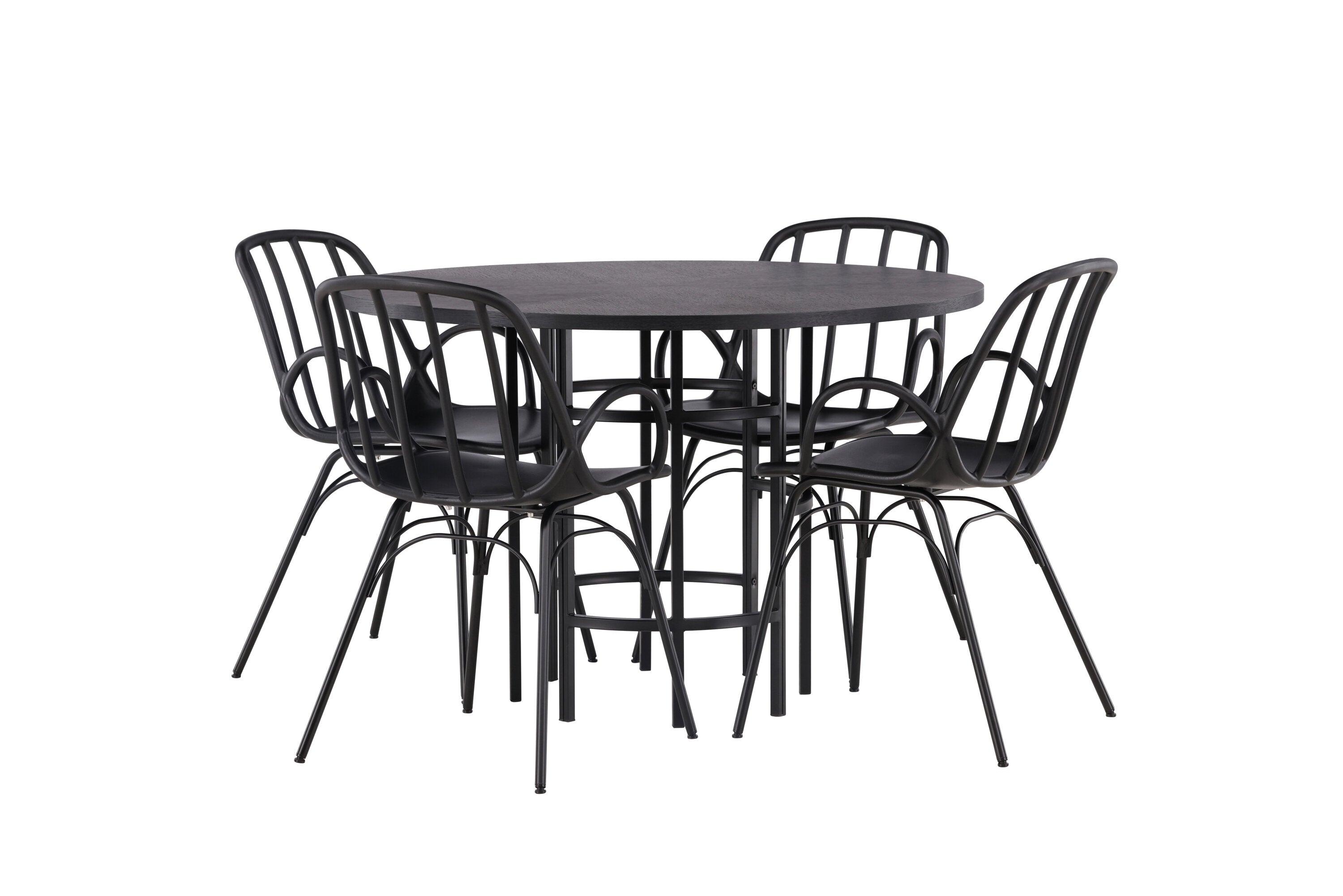 Tato jídelní sestava se hodí stejně dobře do kuchyně jako do slavnostního obývacího pokoje! Náš kulatý jídelní stůl Copenhagen má elegantní černou desku stolu z MDF a ozdobnou válcovou základnu z černého kovu. Zde v kombinaci s promyšlenou jídelní židlí ze série Dyrön. Židle je stylová i praktická, vyrobena z černého plastu a oceli. Sedák má integrované područky a žebrovaný design v mírně zaoblené zadní části. Nohy židle jsou stylově úzké a mírně rozšířené ve skandinávském designu. Posaďte se do budoucnosti! Rozměry stolu: 115 cm.