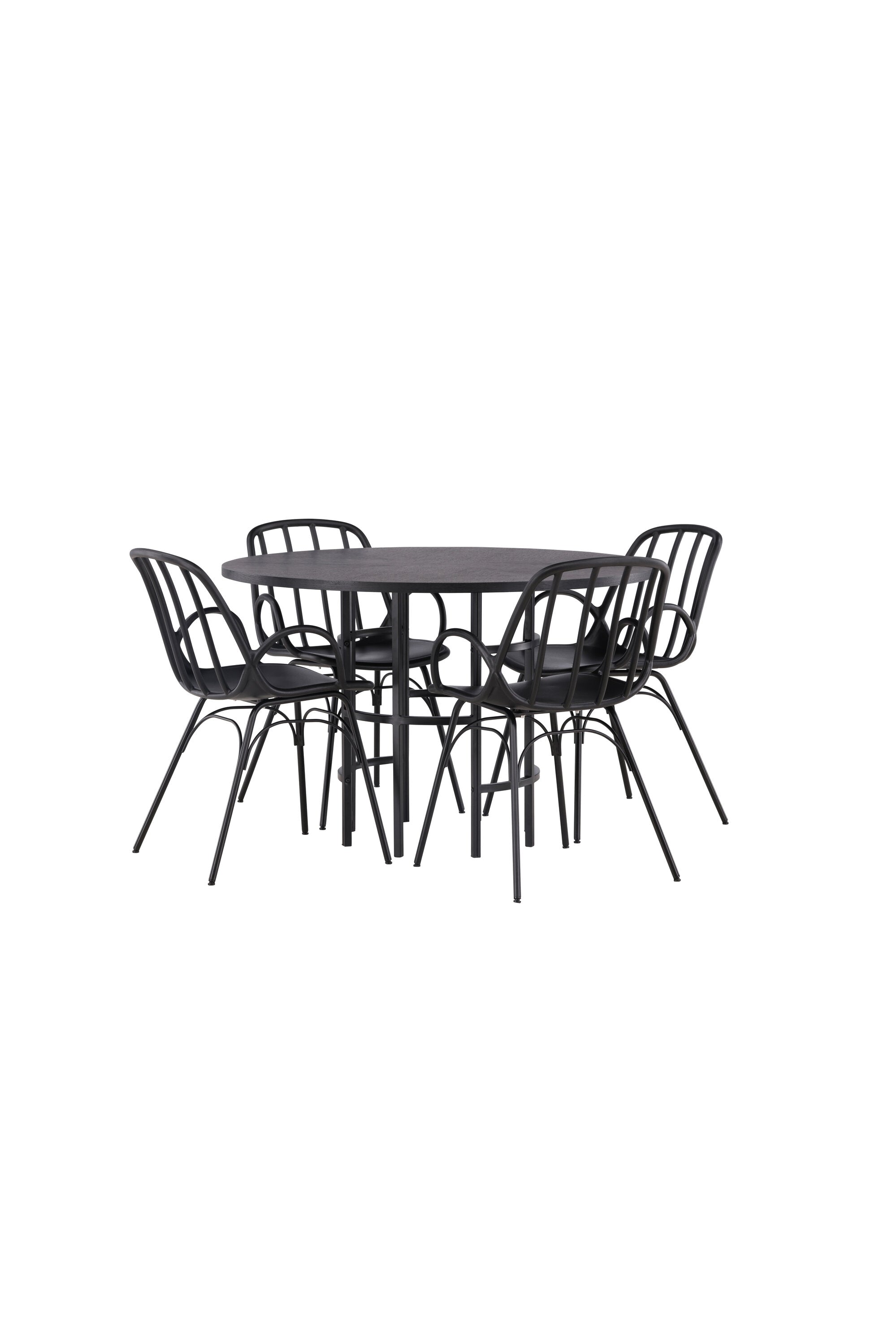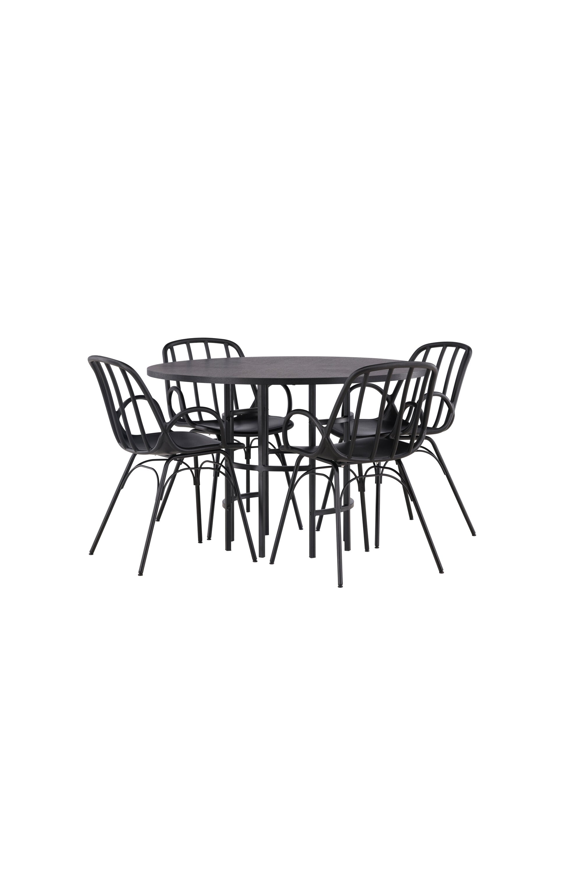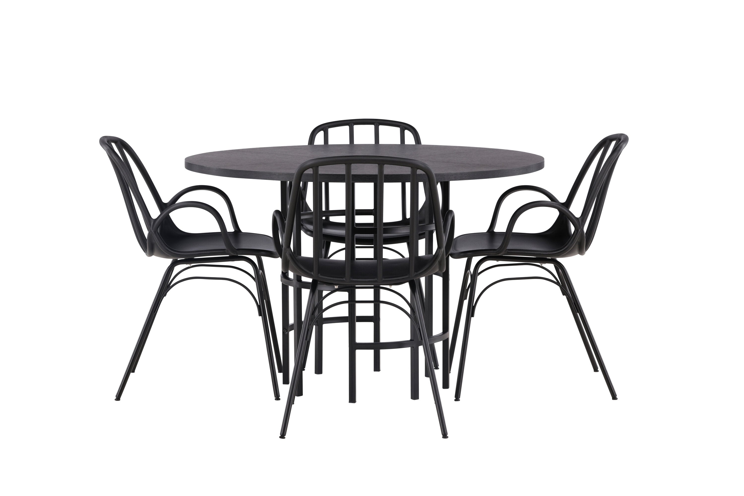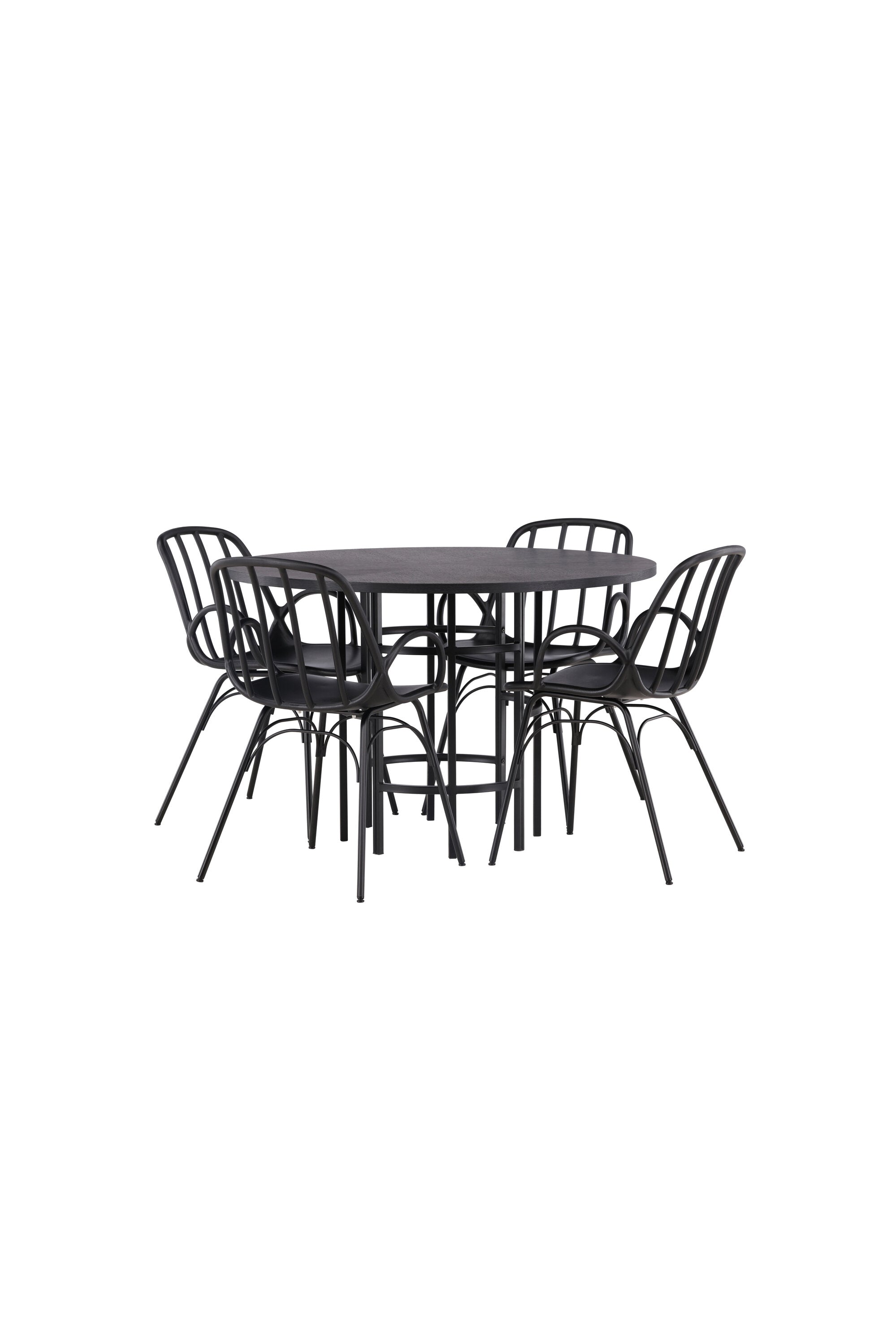 Tato jídelní sestava se hodí stejně dobře do kuchyně jako do slavnostního obývacího pokoje! Náš kulatý jídelní stůl Copenhagen má elegantní černou desku stolu z MDF a ozdobnou válcovou základnu z černého kovu. Zde v kombinaci s promyšlenou jídelní židlí ze série Dyrön. Židle je stylová i praktická, vyrobena z černého plastu a oceli. Sedák má integrované područky a žebrovaný design v mírně zaoblené zadní části. Nohy židle jsou stylově úzké a mírně rozšířené ve skandinávském designu. Posaďte se do budoucnosti! Rozměry stolu: 115 cm.