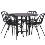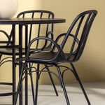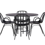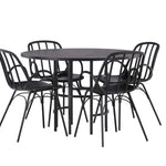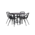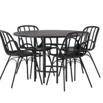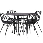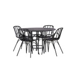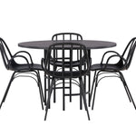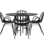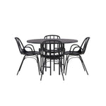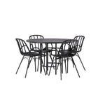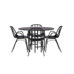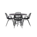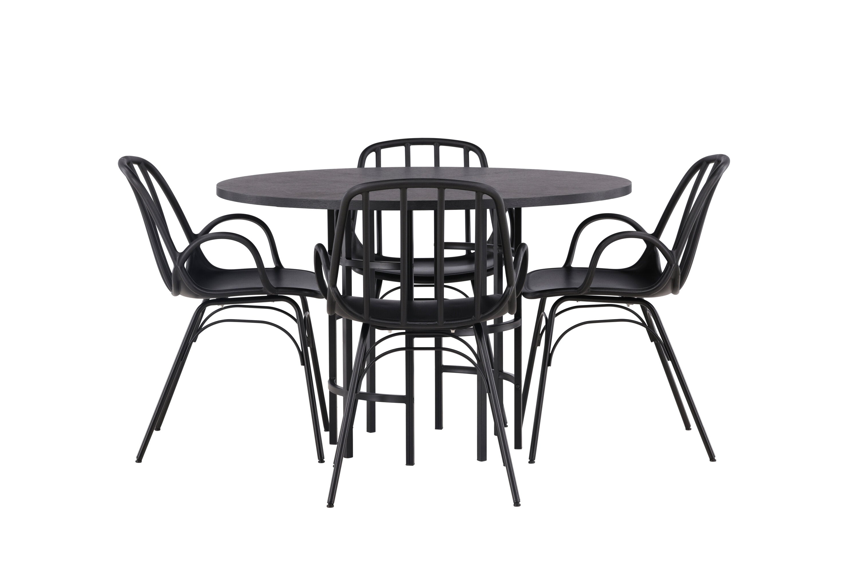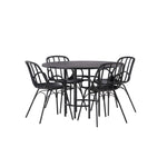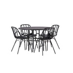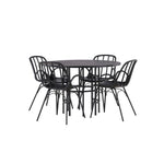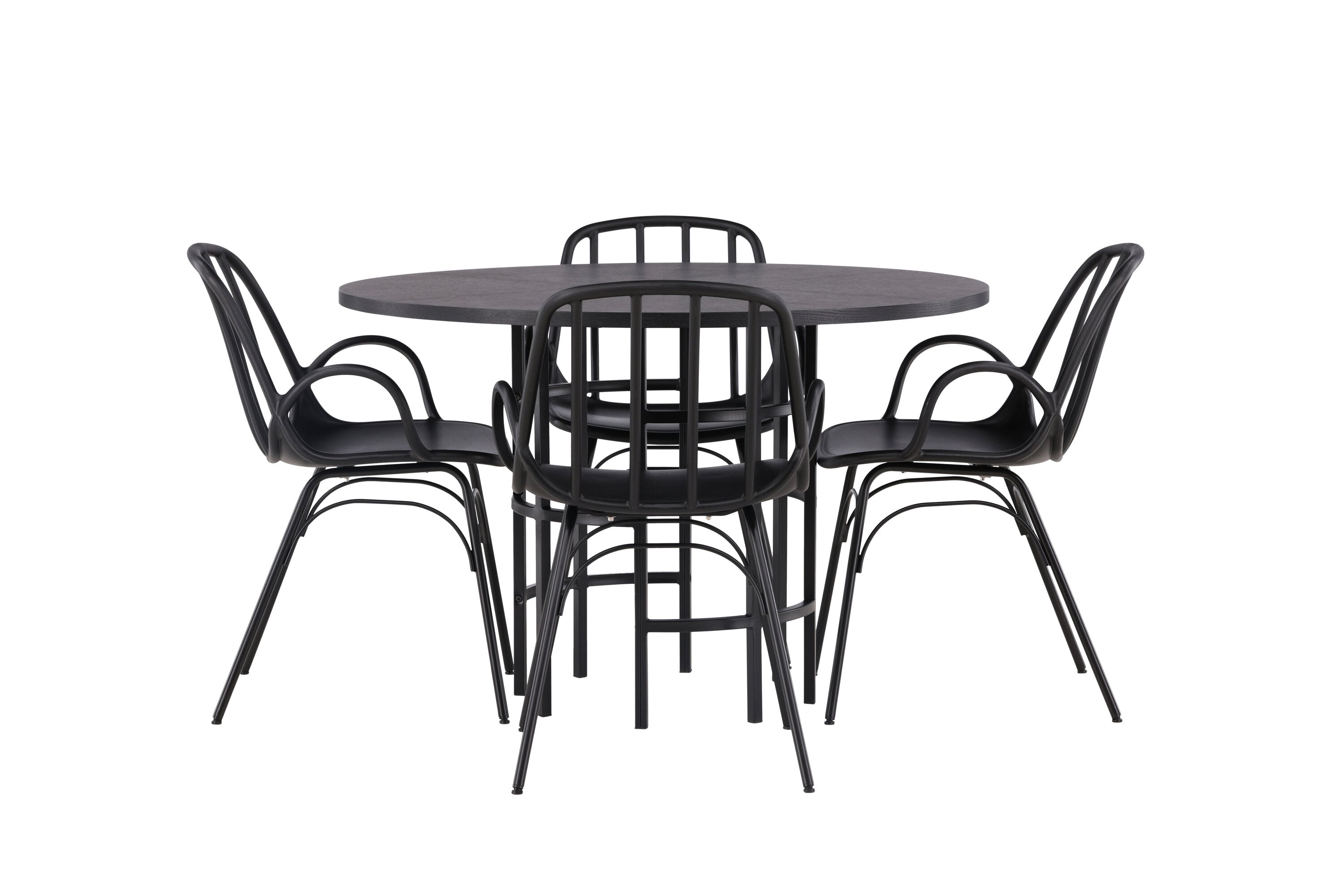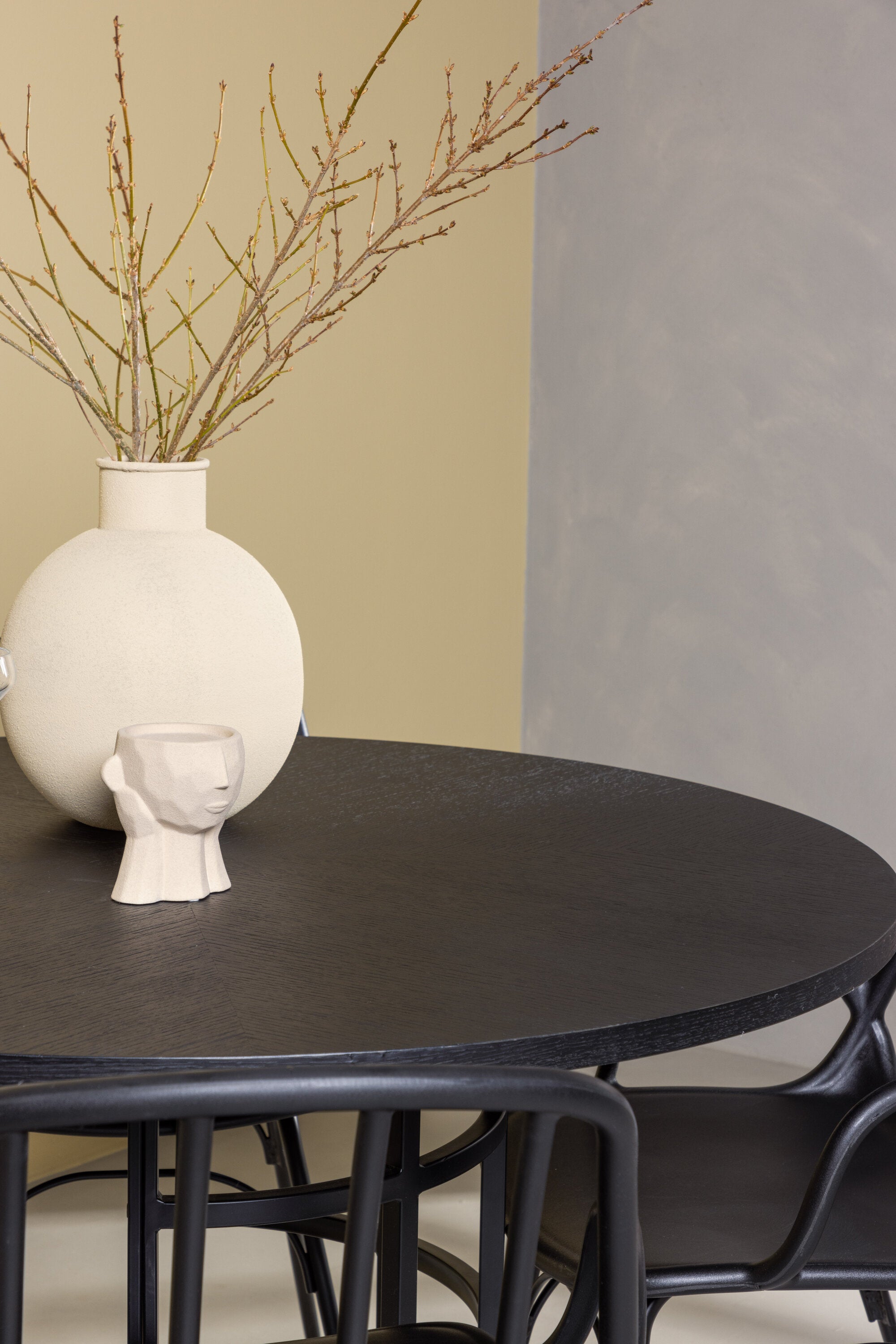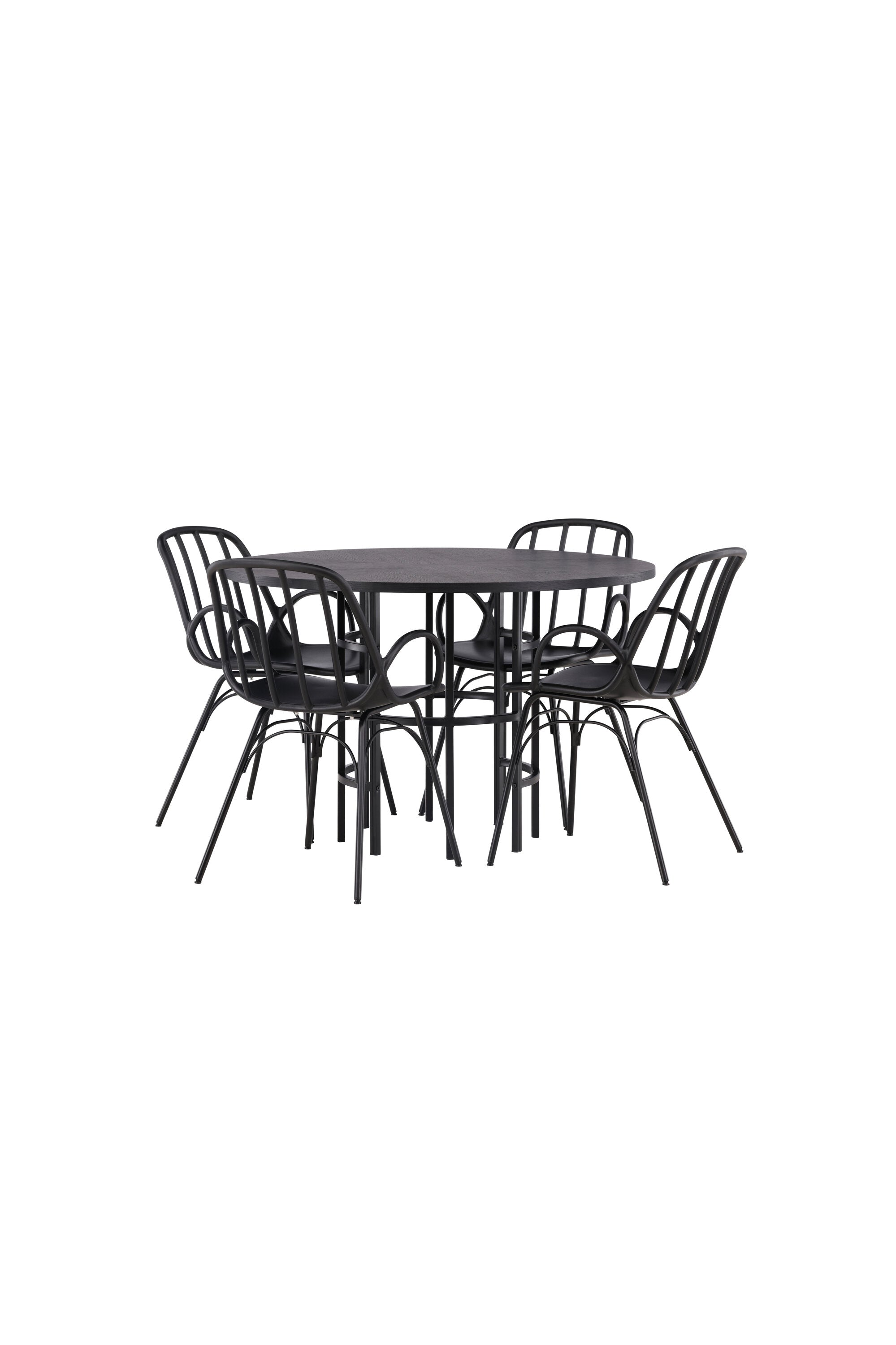 Tato jídelní sestava se hodí stejně dobře do kuchyně jako do slavnostního obývacího pokoje! Náš kulatý jídelní stůl Copenhagen má elegantní černou desku stolu z MDF a ozdobnou válcovou základnu z černého kovu. Zde v kombinaci s promyšlenou jídelní židlí ze série Dyrön. Židle je stylová i praktická, vyrobena z černého plastu a oceli. Sedák má integrované područky a žebrovaný design v mírně zaoblené zadní části. Nohy židle jsou stylově úzké a mírně rozšířené ve skandinávském designu. Posaďte se do budoucnosti! Rozměry stolu: 115 cm.