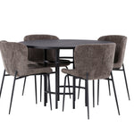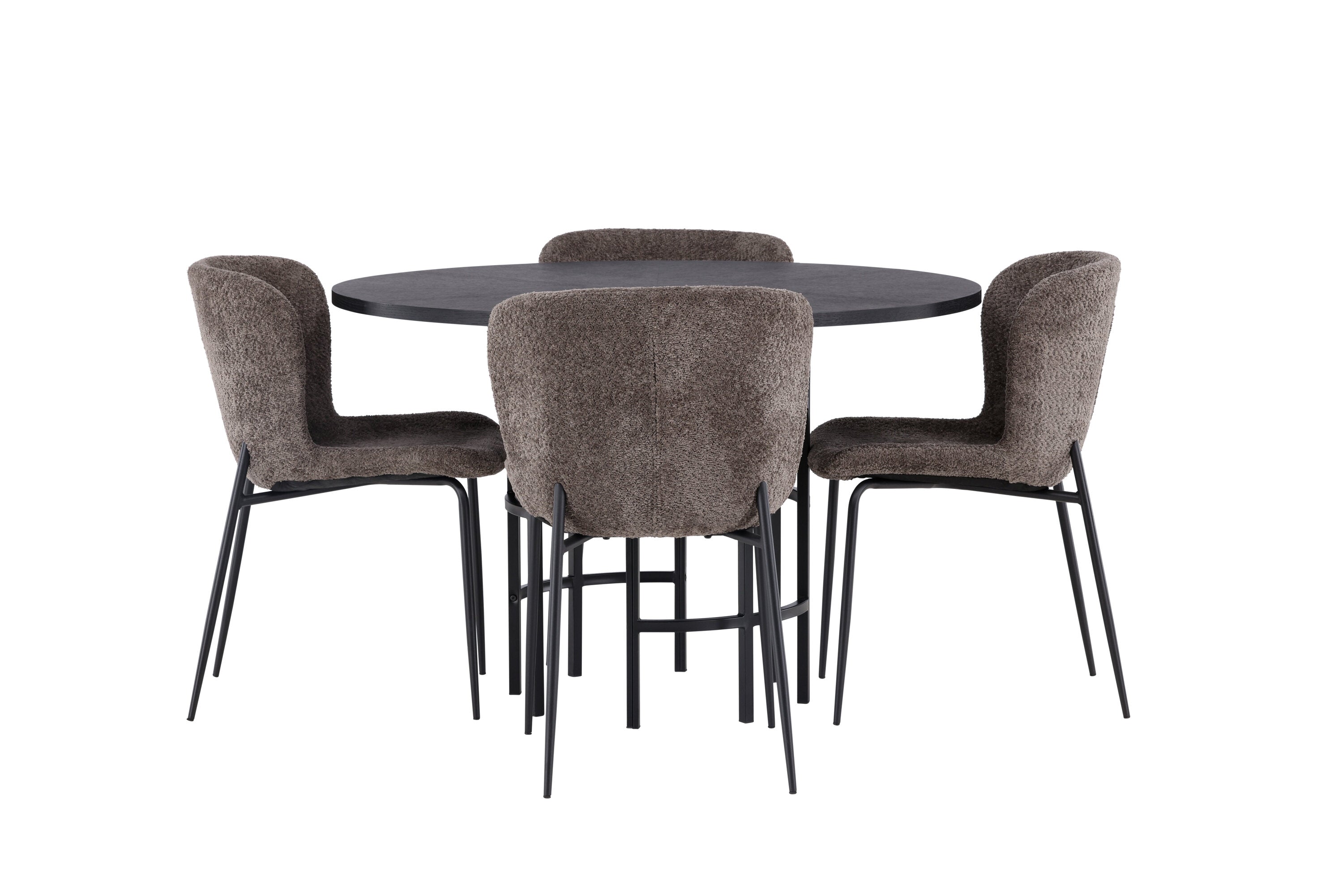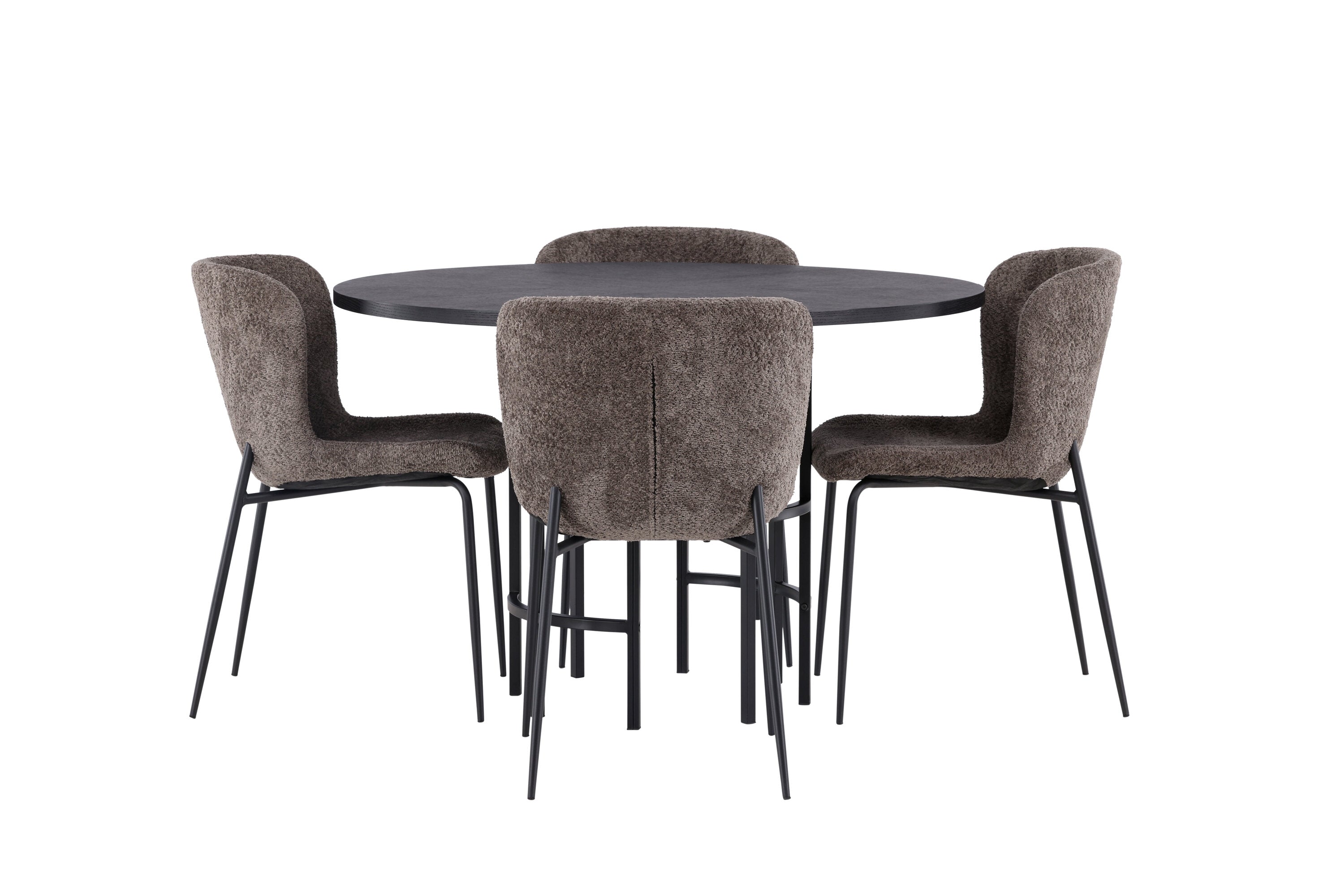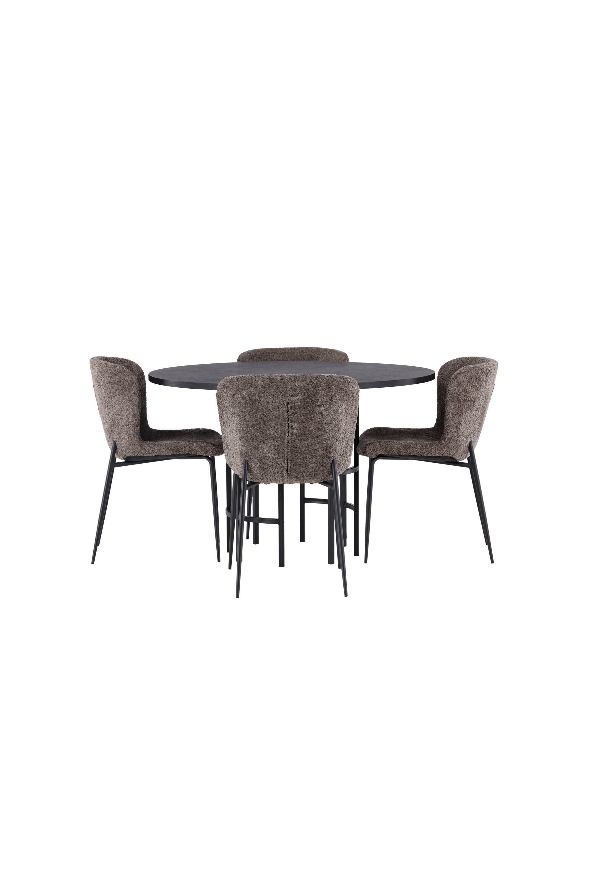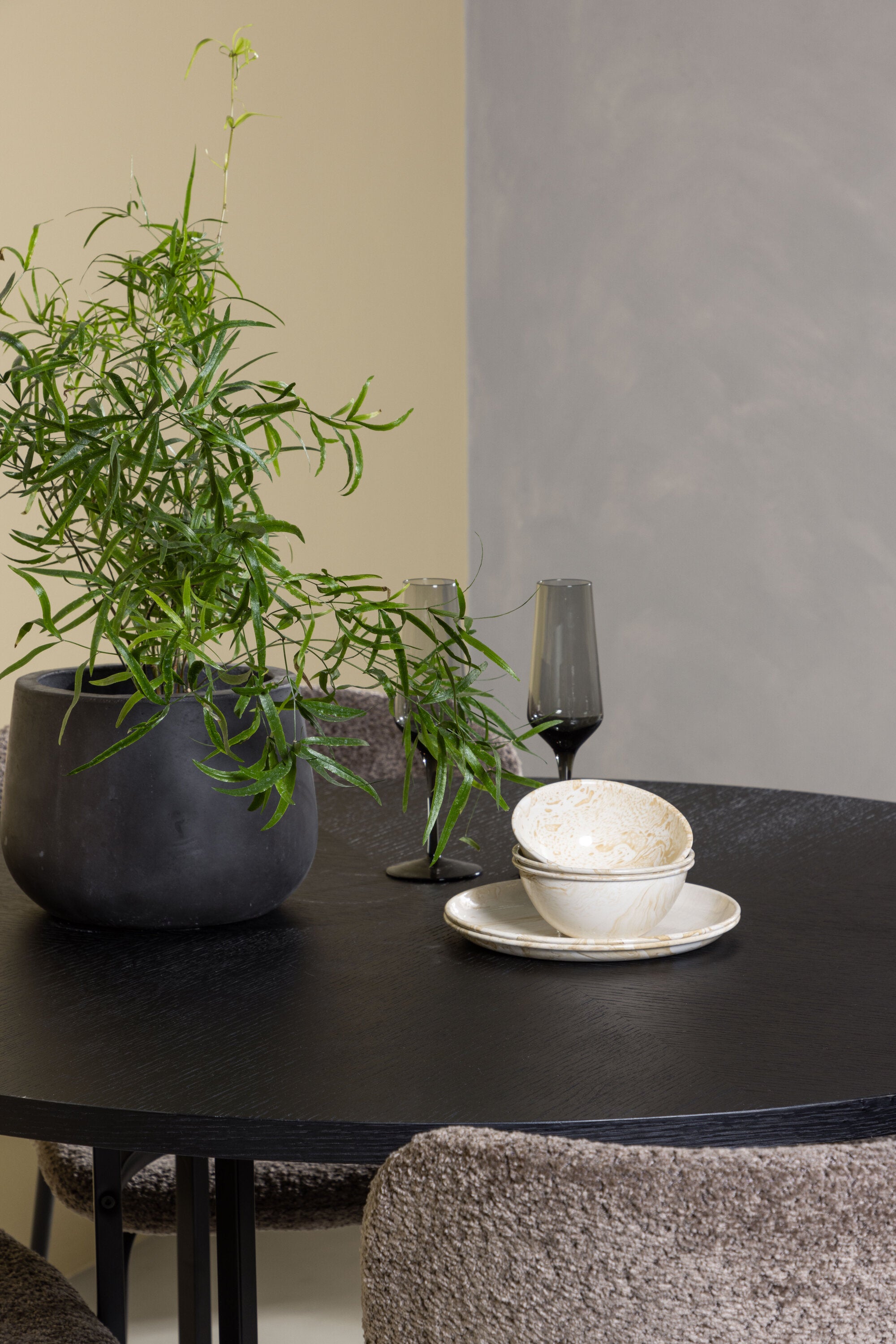 Zde se průmyslový design setkává s měkkými formami! Náš kulatý jídelní stůl Copenhagen má elegantní černou desku stolu z MDF a ozdobnou válcovou základnu z černého kovu. Zde ve stylové kombinaci s našimi trendy jídelními židlemi ze série Modesto. Židle je celočalouněná béžovou chlupatou látkou se stylovými úzkými nohami v černém kovu. Mírně zaoblená záda a čalouněný sedák poskytují extra pohodlí a rozšiřují příjemné jídlo kolem jídelního stolu. Sedněte si pohodlně a trendy vpřed! Rozměry stolu: 115 cm.
