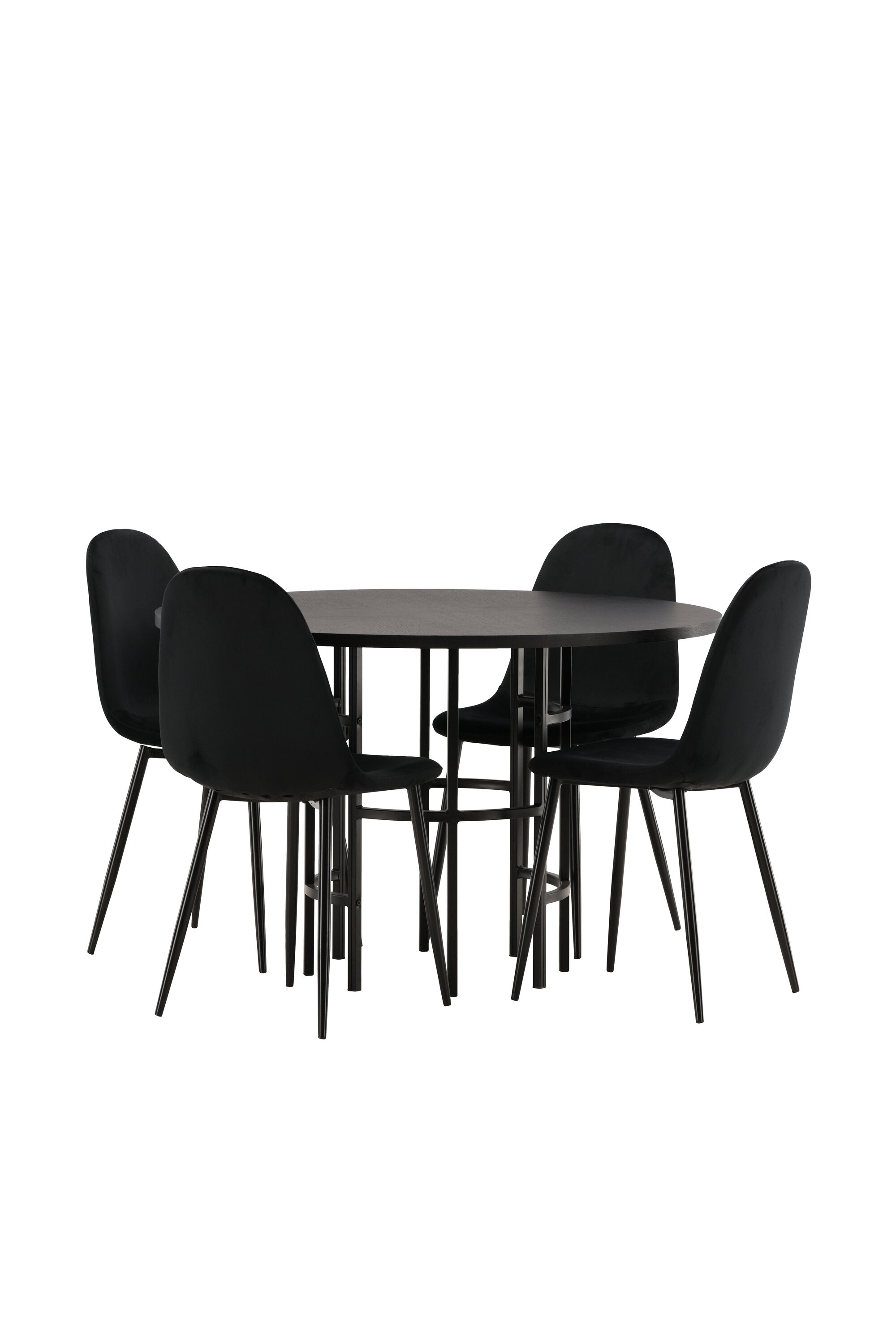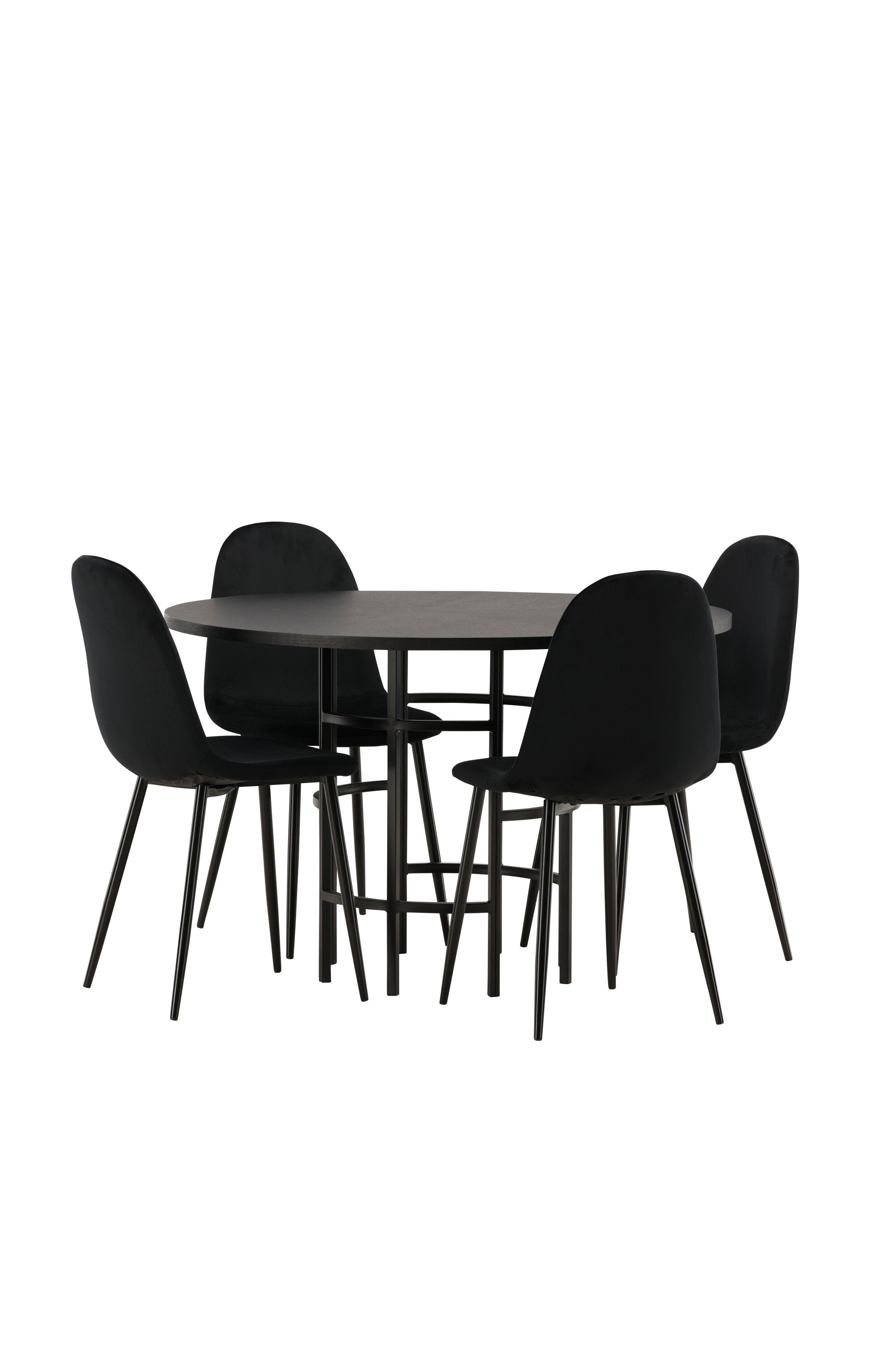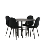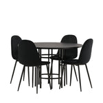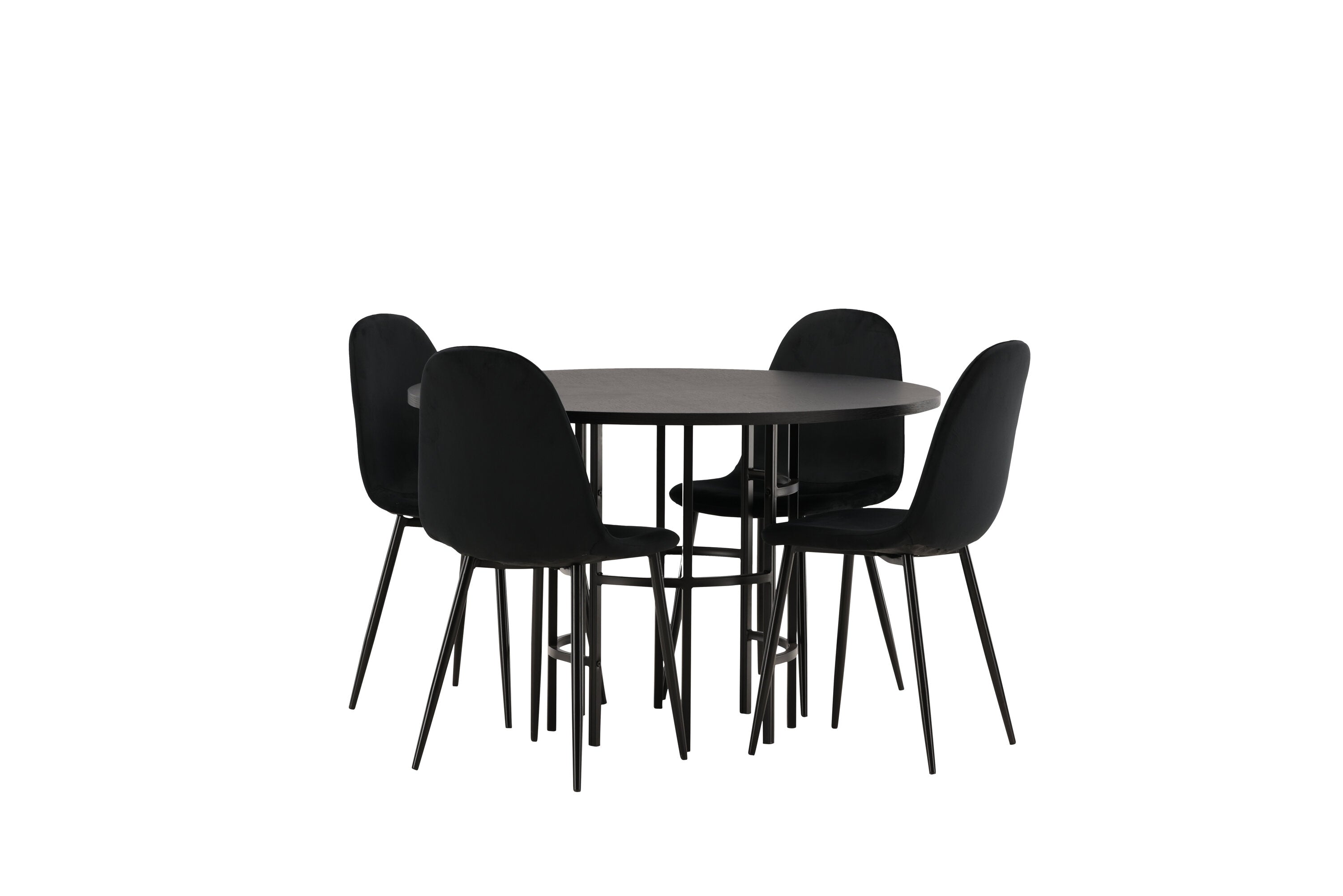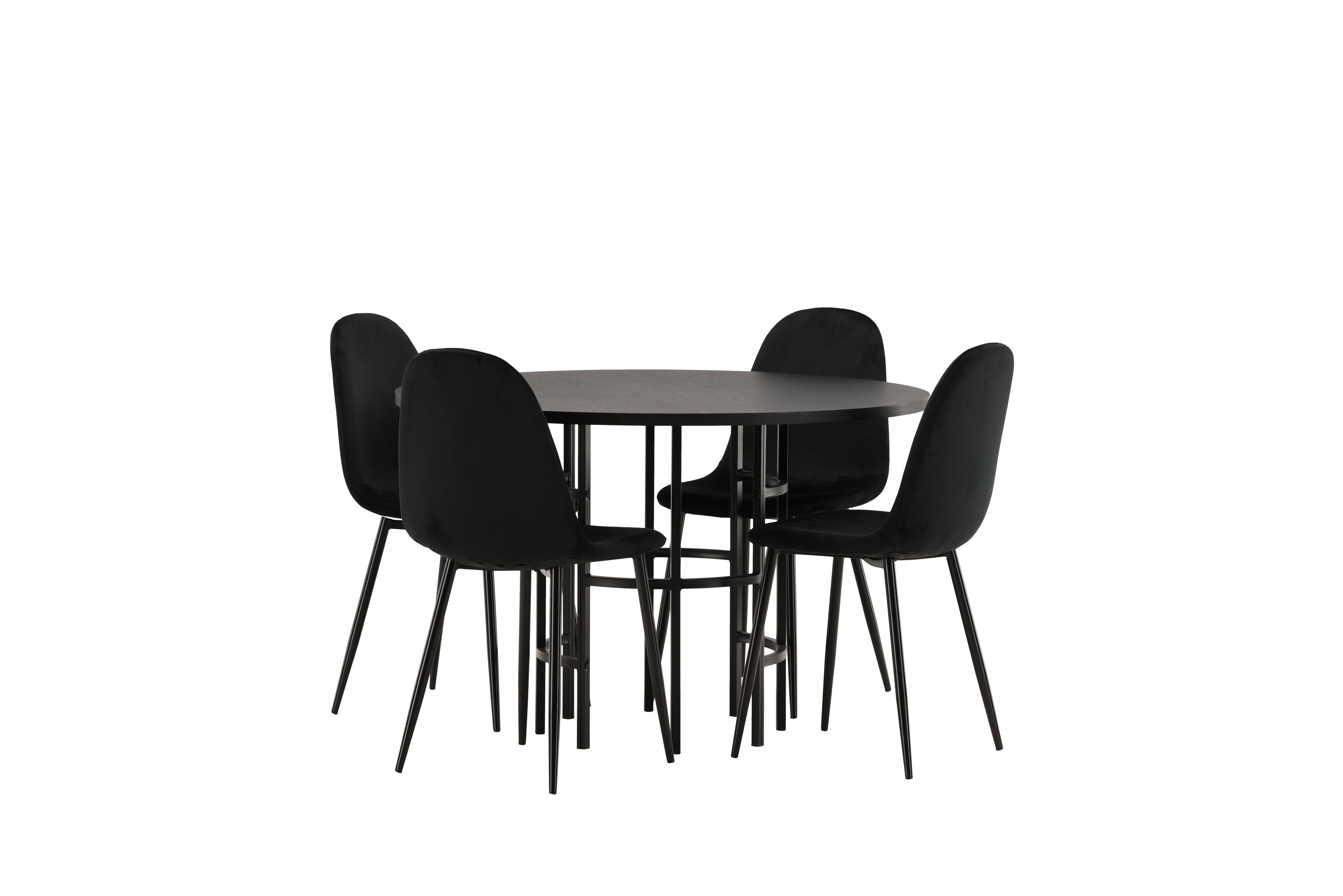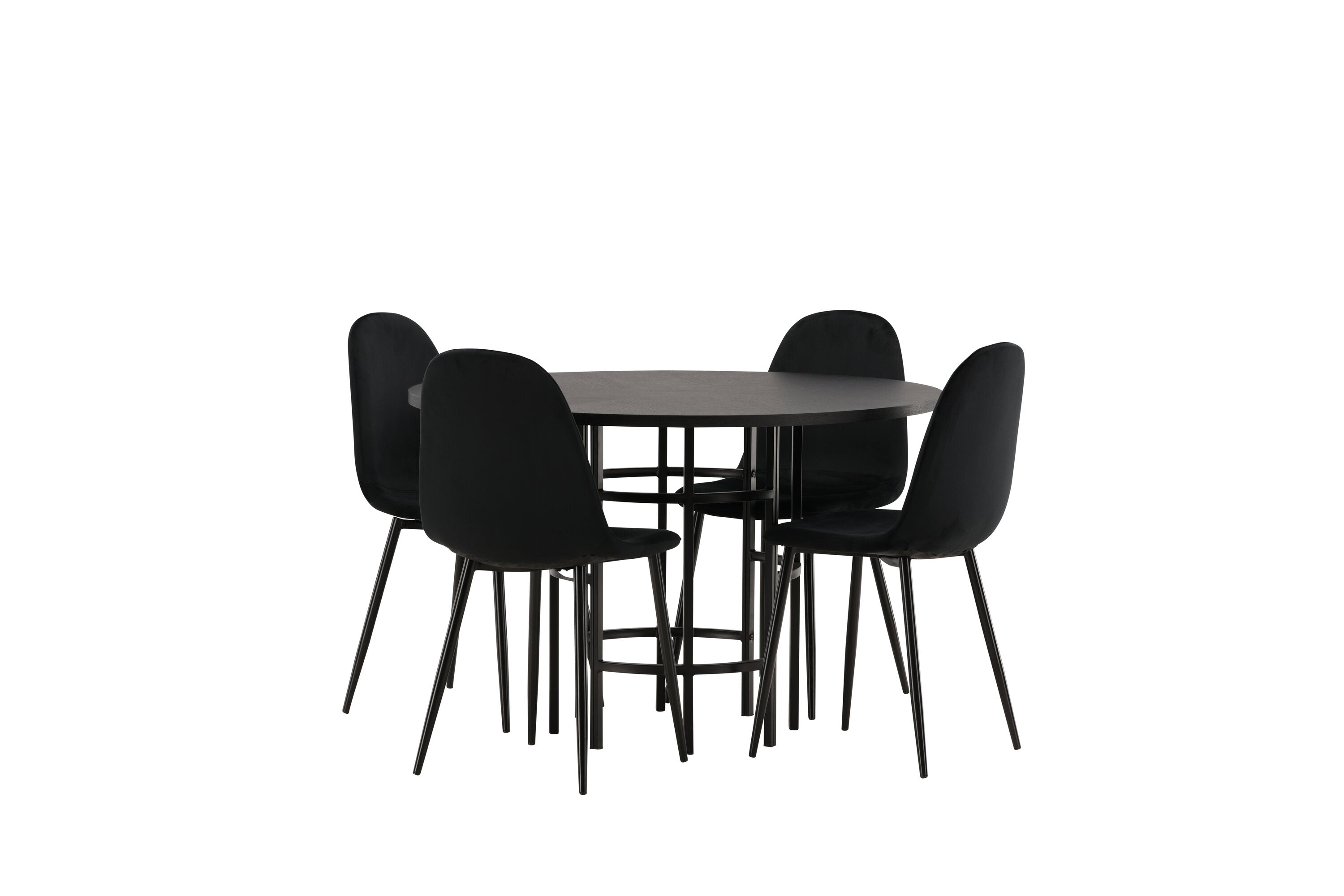 Stylový, moderní a nadčasový – jídelní skupina, která udělá dojem na vaše hosty! Tento trendový jídelní stůl ze série Copenhagen patří do kolekce Furniture Fashion a má ušpiněnou černou desku stolu z MDF s dýhou a dekorativní podnož ve tvaru válce z černého kovu. Zde společně s našimi pohodlnými jídelními židlemi ze série Polar. Židle má celočalouněný design se zaobleným opěradlem a sedákem z černé sametové látky s měkkým polstrováním a nohami z černého kovu s práškovým nástřikem. Nedělejte kompromisy mezi pohodlím a designem!