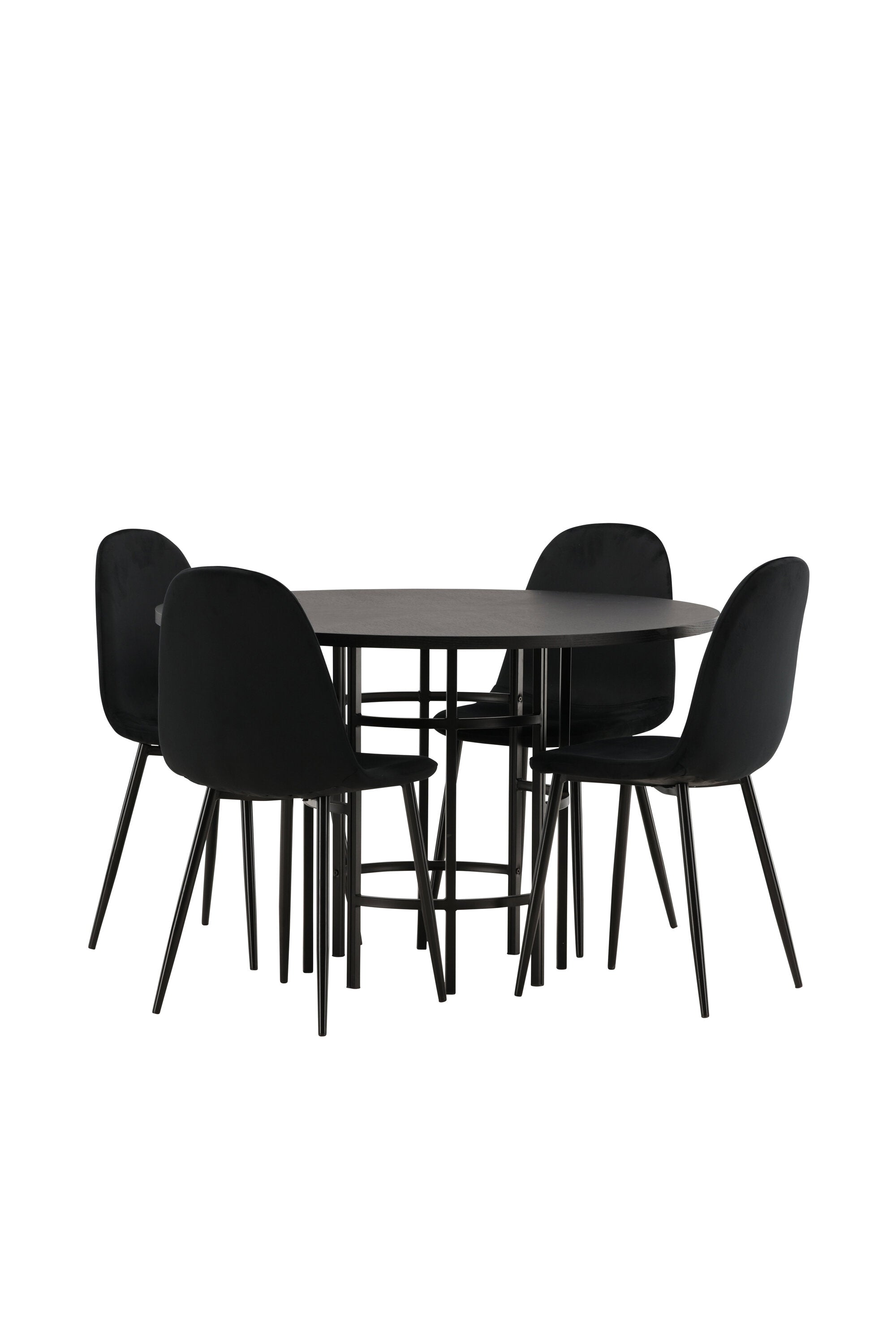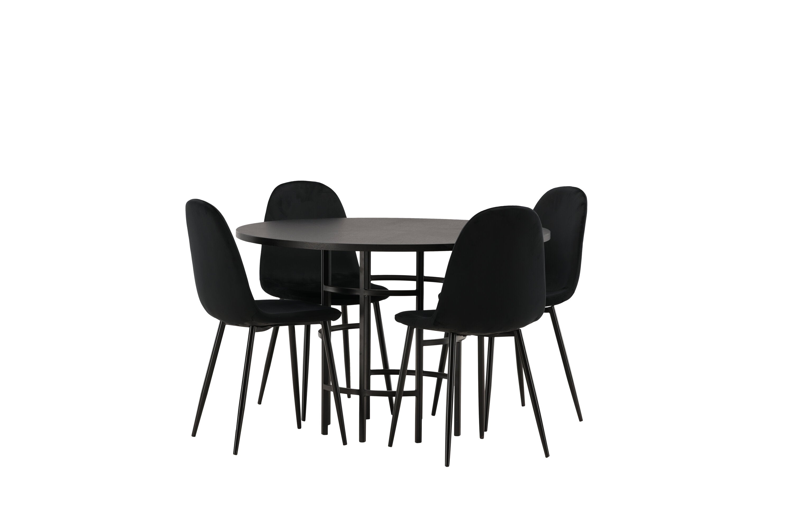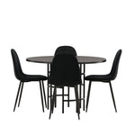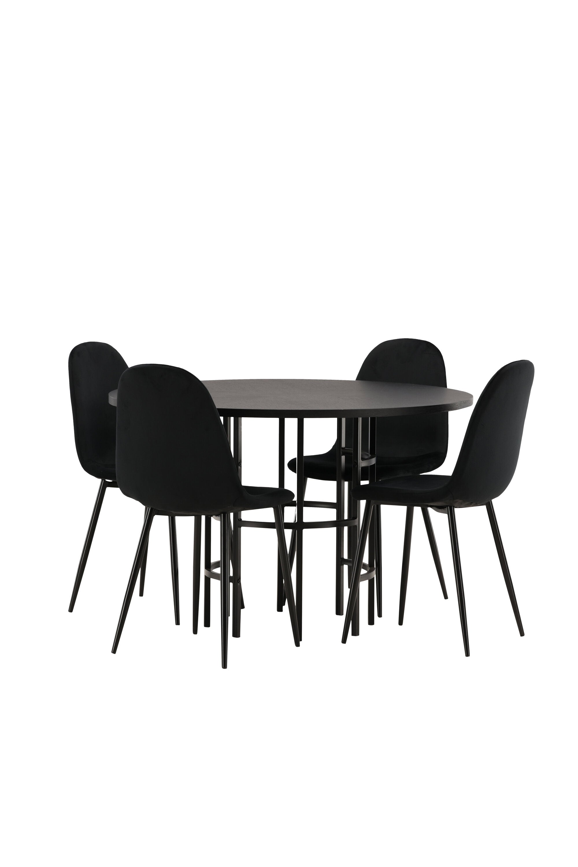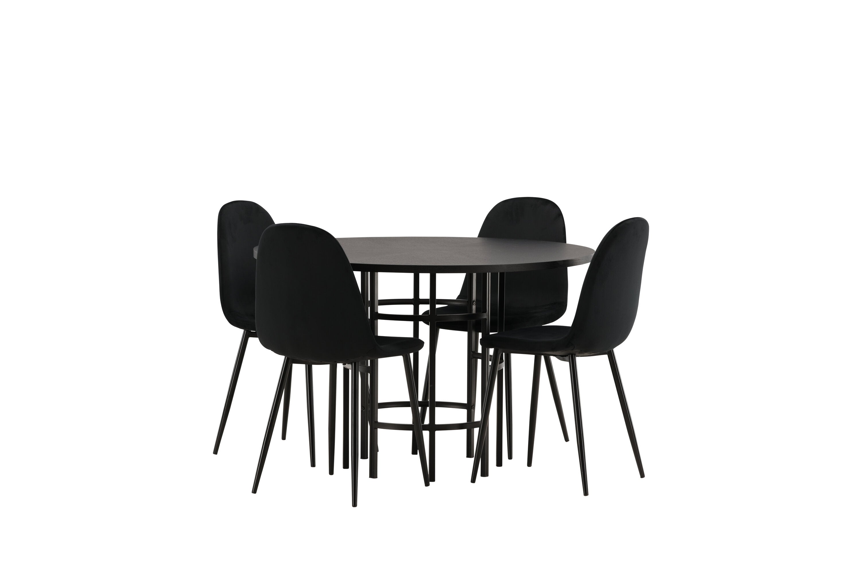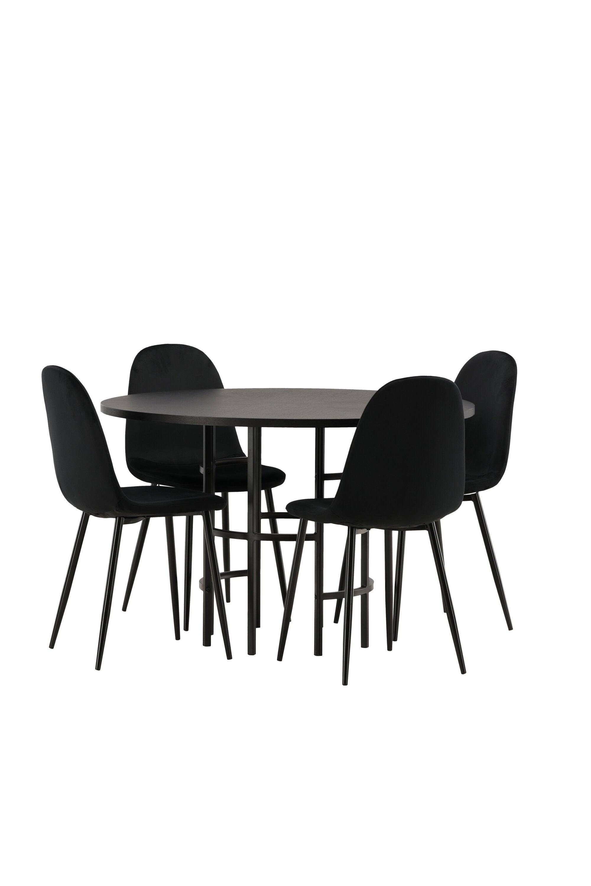 Stylový, moderní a nadčasový – jídelní skupina, která udělá dojem na vaše hosty! Tento trendový jídelní stůl ze série Copenhagen patří do kolekce Furniture Fashion a má ušpiněnou černou desku stolu z MDF s dýhou a dekorativní podnož ve tvaru válce z černého kovu. Zde společně s našimi pohodlnými jídelními židlemi ze série Polar. Židle má celočalouněný design se zaobleným opěradlem a sedákem z černé sametové látky s měkkým polstrováním a nohami z černého kovu s práškovým nástřikem. Nedělejte kompromisy mezi pohodlím a designem!