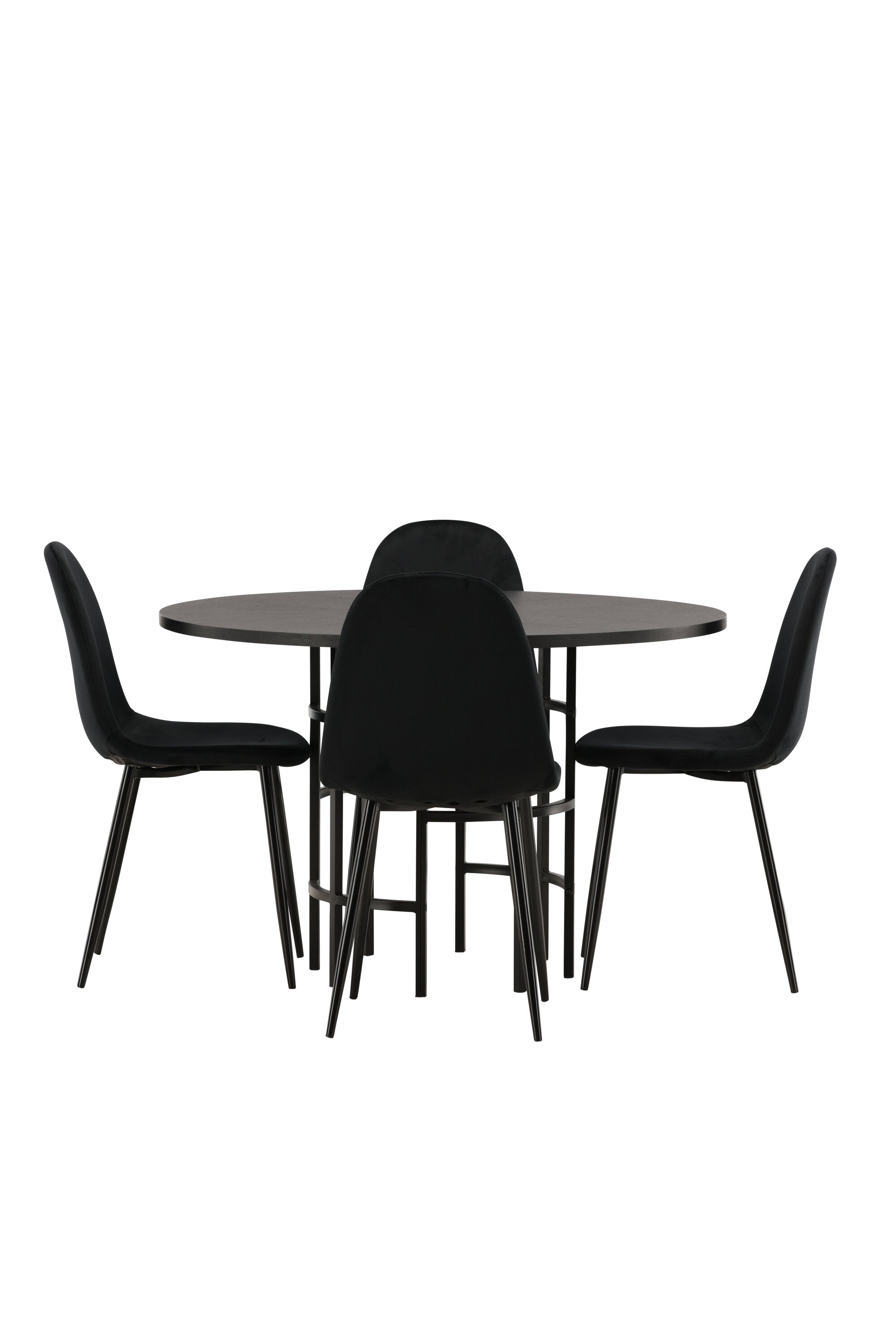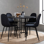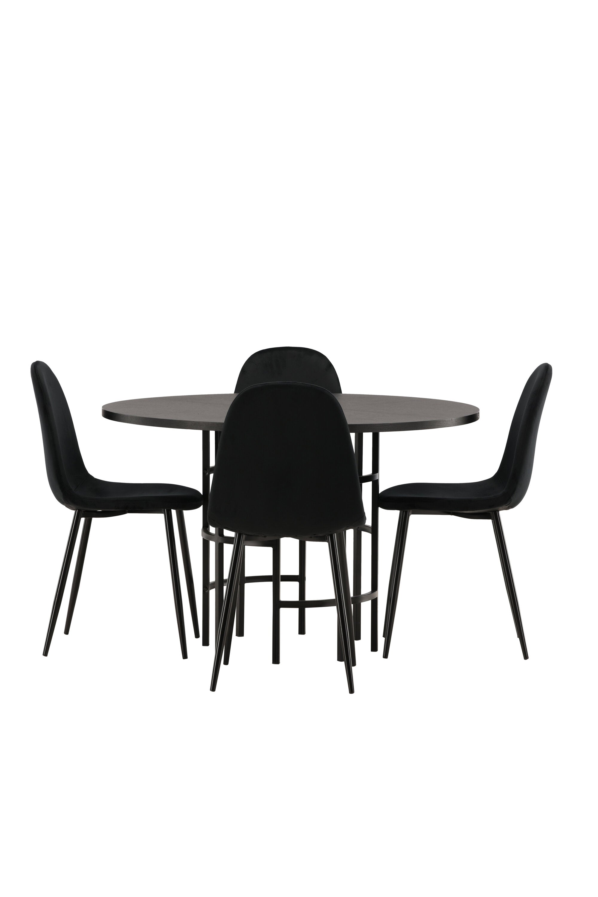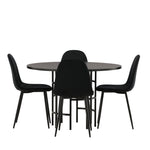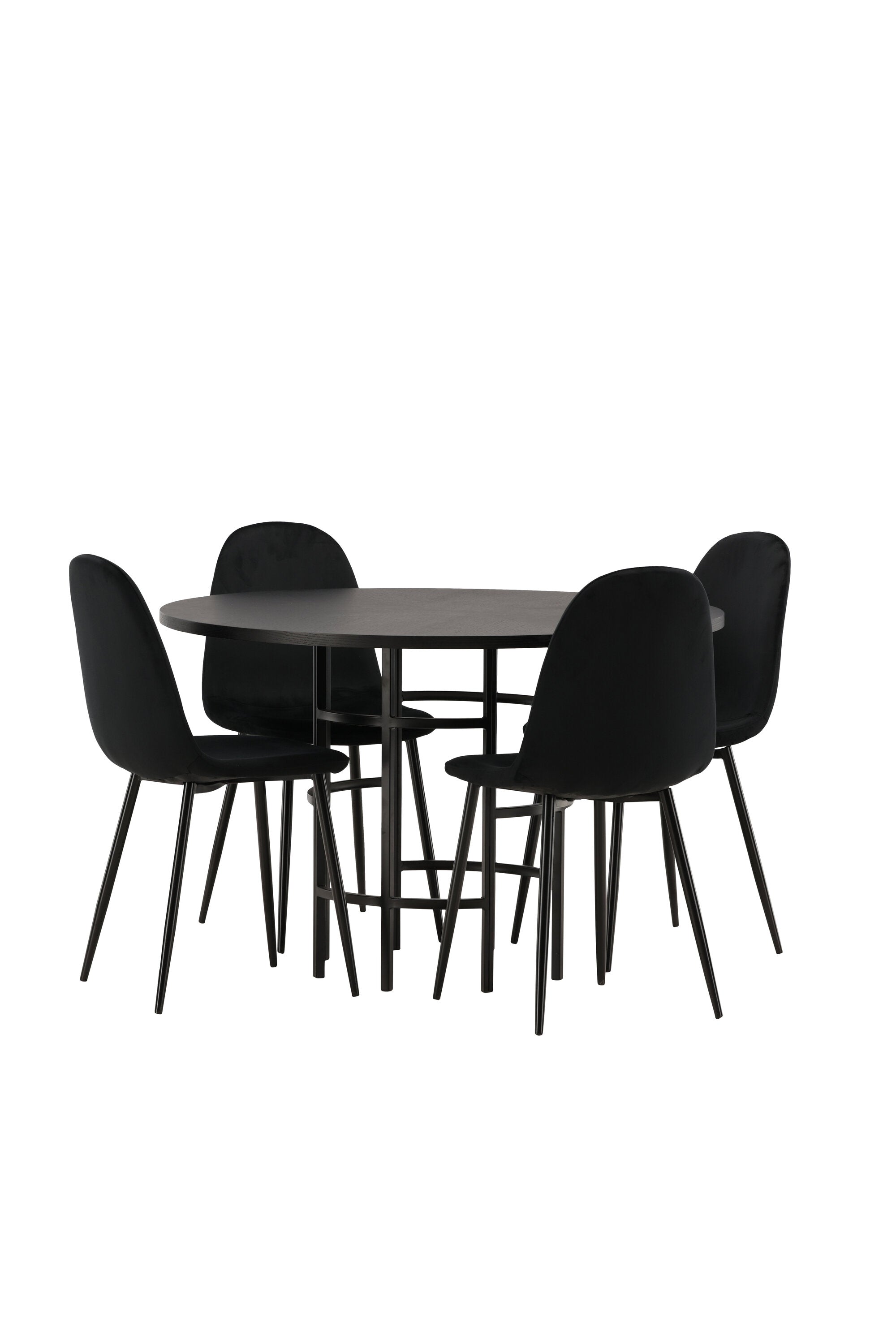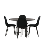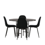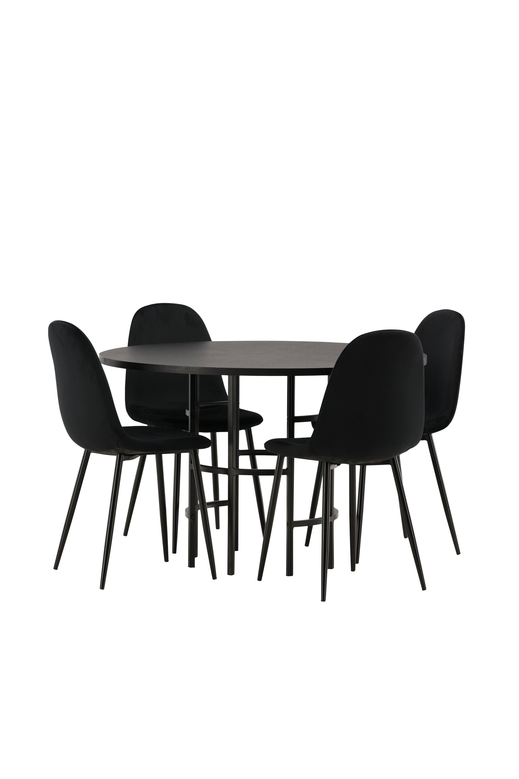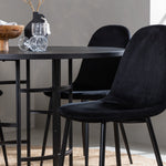 Stylový, moderní a nadčasový – jídelní skupina, která udělá dojem na vaše hosty! Tento trendový jídelní stůl ze série Copenhagen patří do kolekce Furniture Fashion a má ušpiněnou černou desku stolu z MDF s dýhou a dekorativní podnož ve tvaru válce z černého kovu. Zde společně s našimi pohodlnými jídelními židlemi ze série Polar. Židle má celočalouněný design se zaobleným opěradlem a sedákem z černé sametové látky s měkkým polstrováním a nohami z černého kovu s práškovým nástřikem. Nedělejte kompromisy mezi pohodlím a designem!