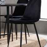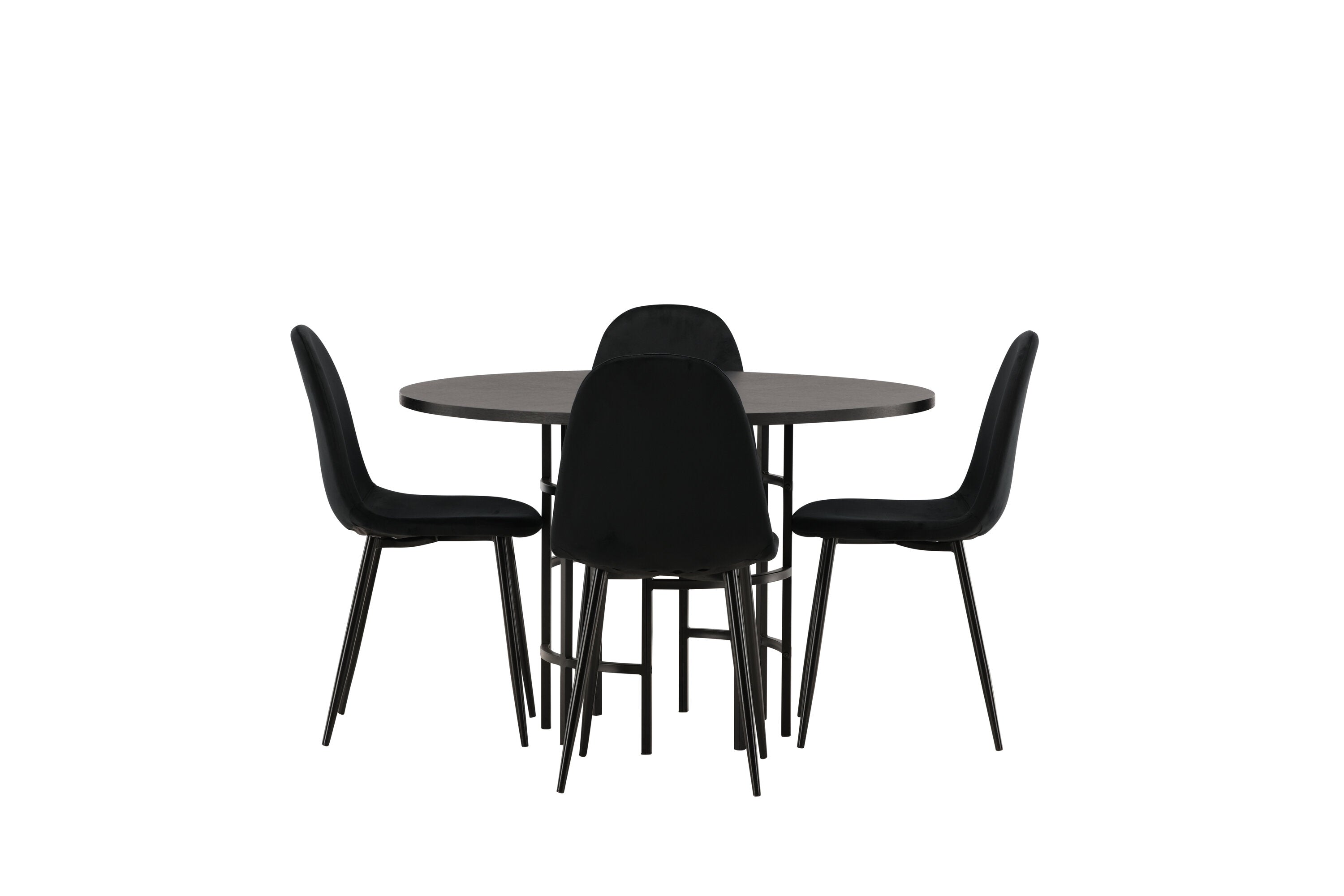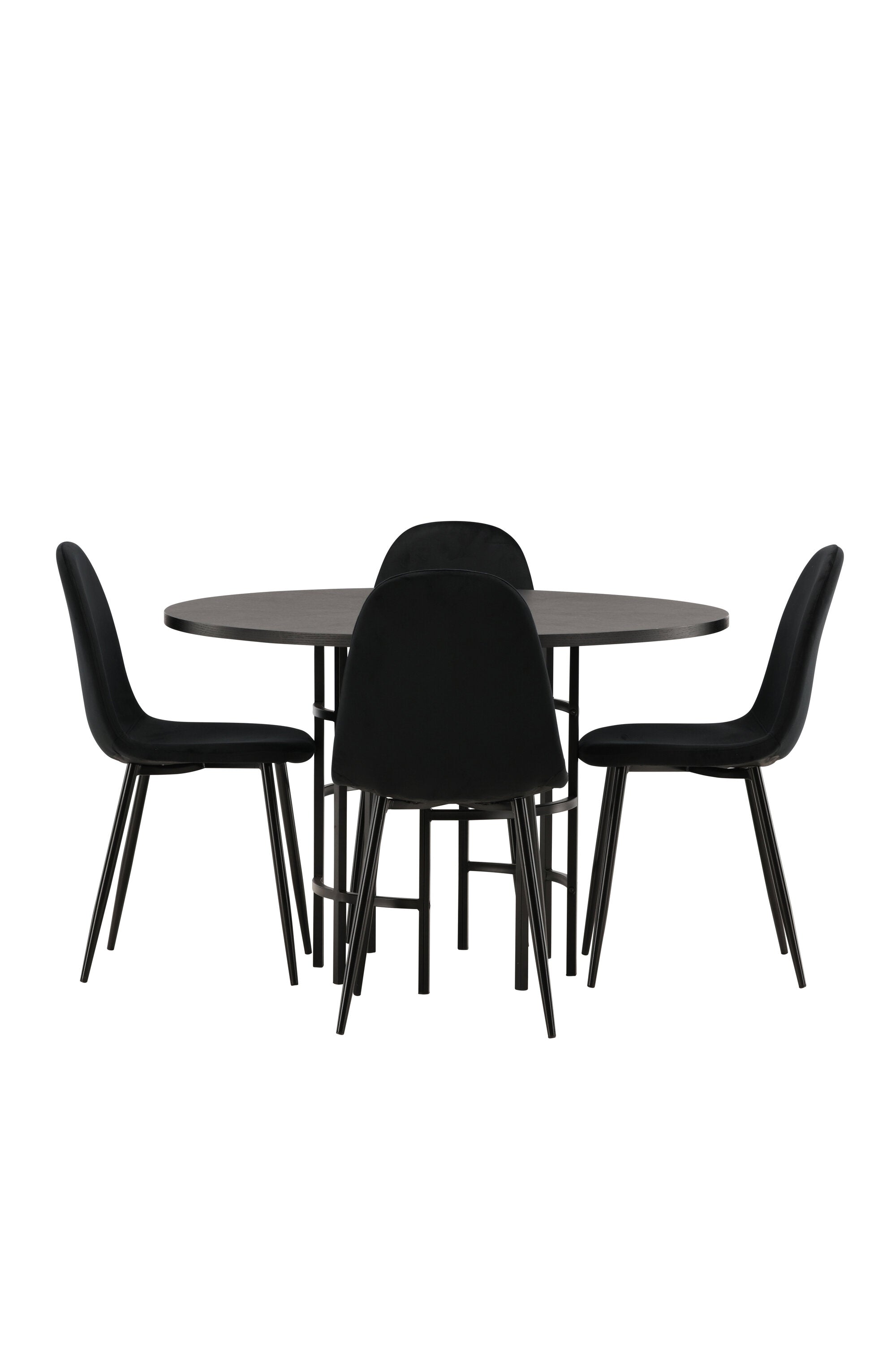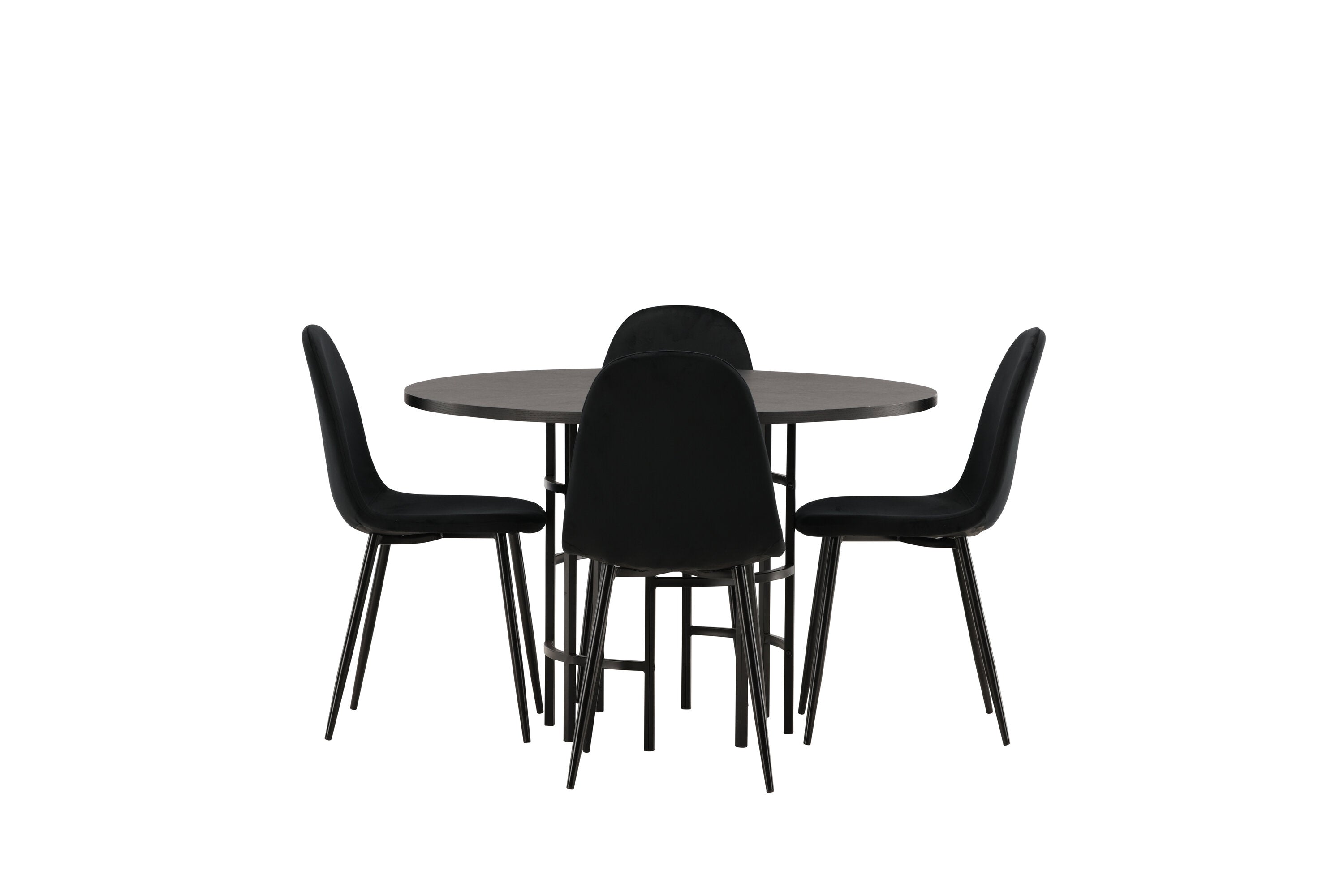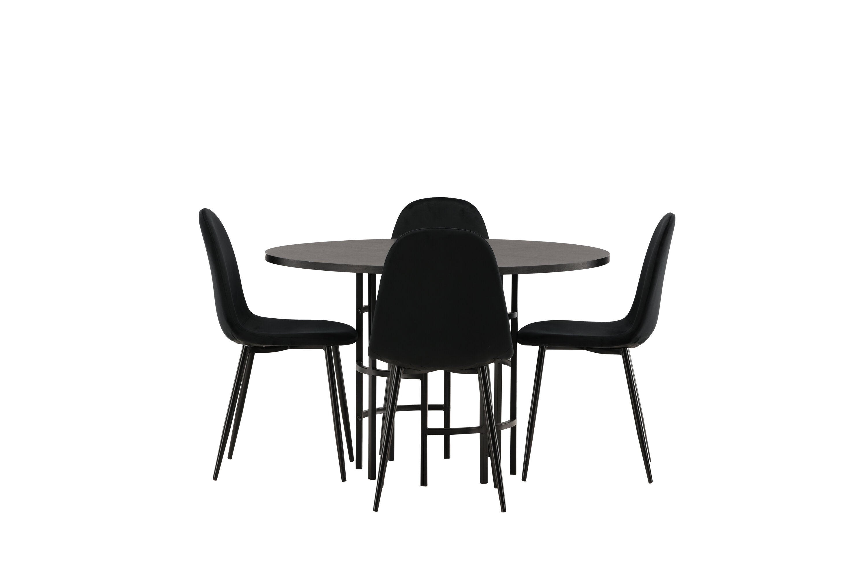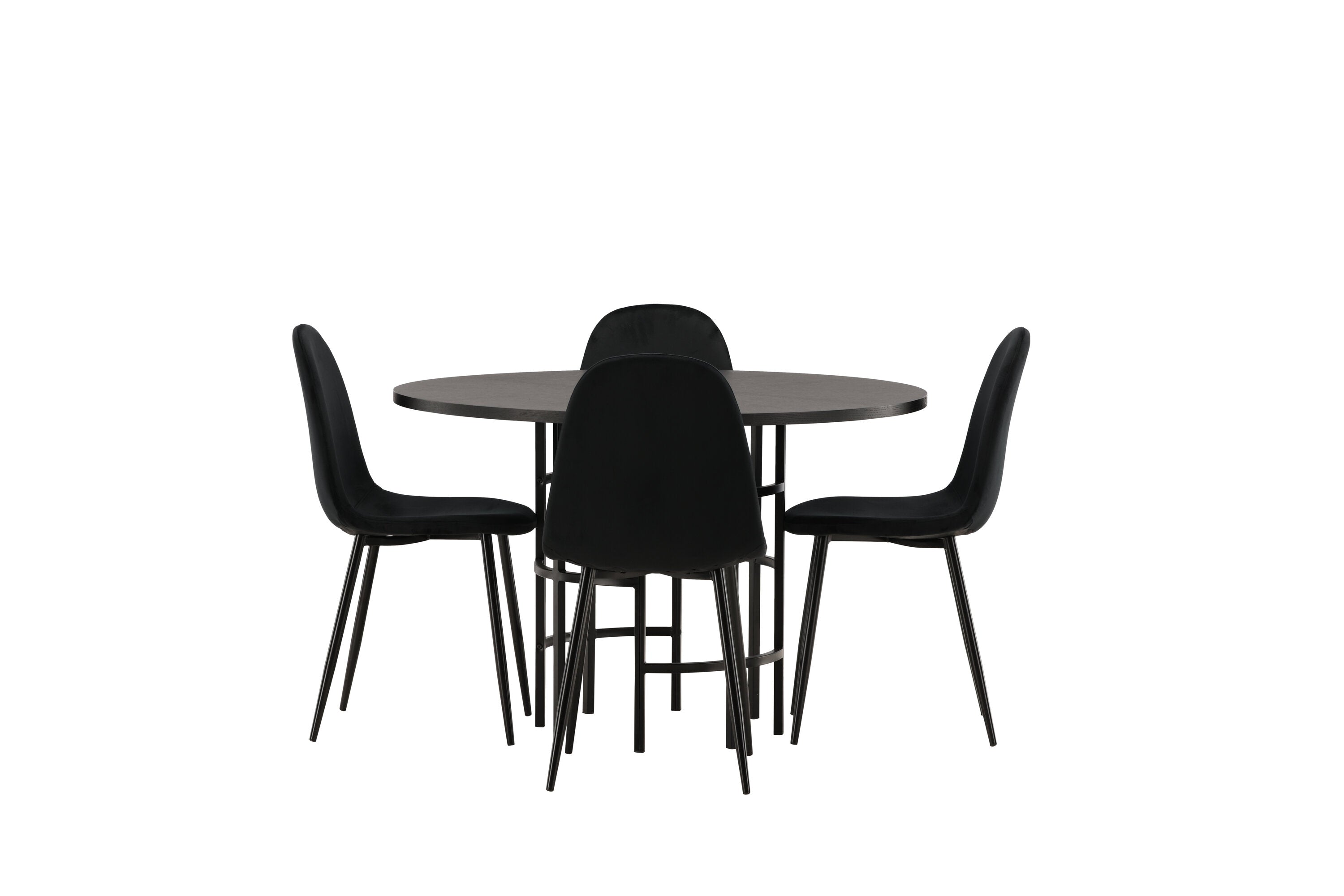 Stylový, moderní a nadčasový – jídelní skupina, která udělá dojem na vaše hosty! Tento trendový jídelní stůl ze série Copenhagen patří do kolekce Furniture Fashion a má ušpiněnou černou desku stolu z MDF s dýhou a dekorativní podnož ve tvaru válce z černého kovu. Zde společně s našimi pohodlnými jídelními židlemi ze série Polar. Židle má celočalouněný design se zaobleným opěradlem a sedákem z černé sametové látky s měkkým polstrováním a nohami z černého kovu s práškovým nástřikem. Nedělejte kompromisy mezi pohodlím a designem!