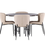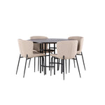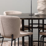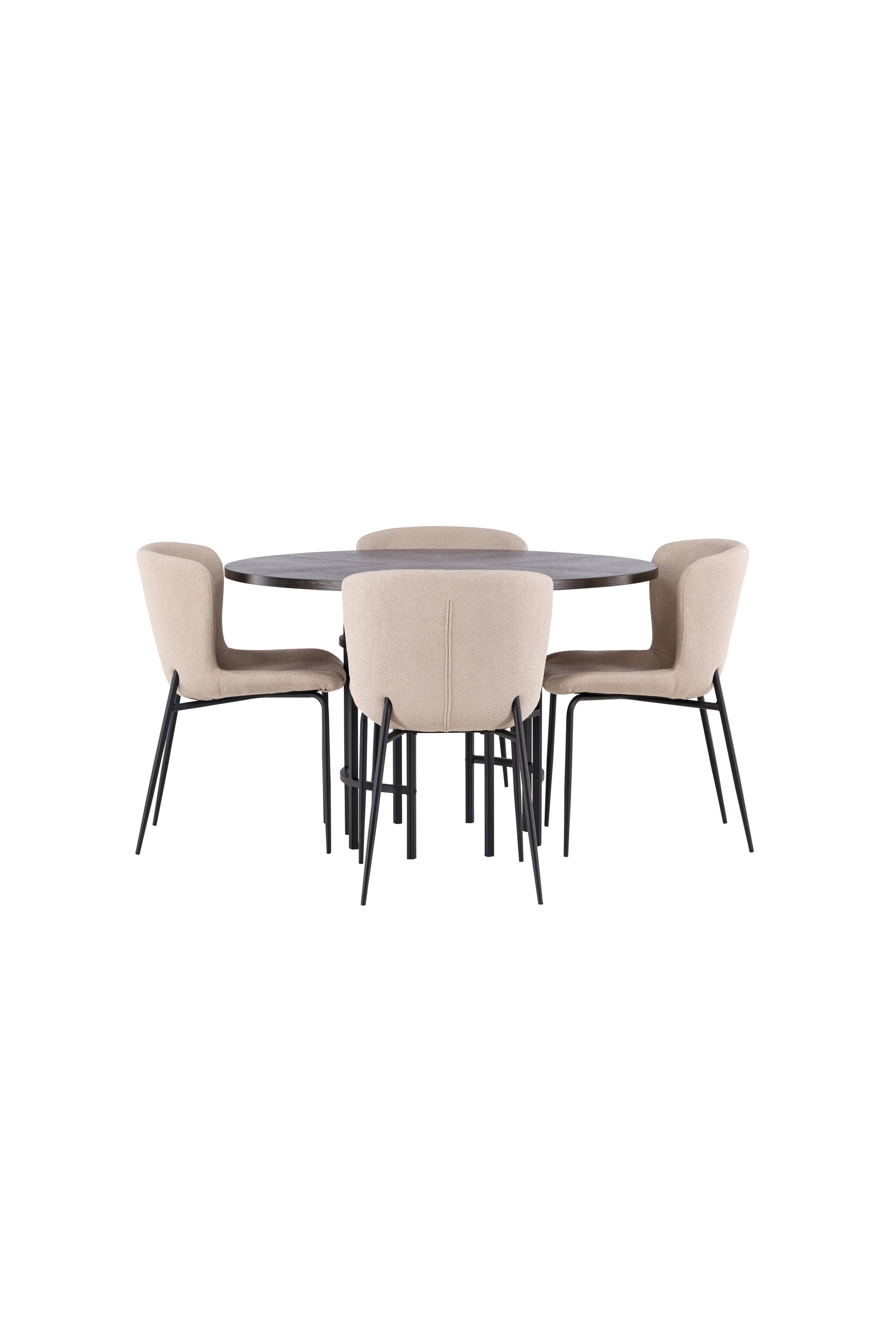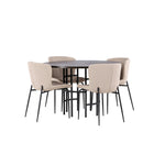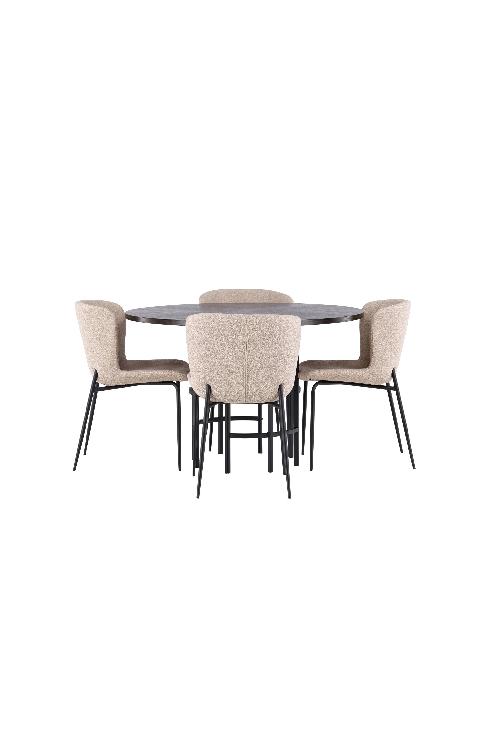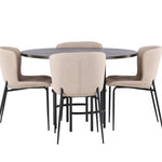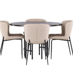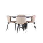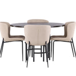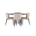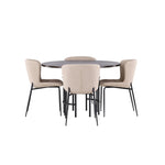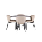 Jídelní skupina podle všech vašich přání! Náš kulatý jídelní stůl Copenhagen má krásnou hnědou desku z MDF s dýhou a ozdobnou válcovou základnu z černého kovu. Zde společně s módními jídelními židlemi ze série Modesto. Židle je celočalouněná béžovou chlupatou látkou se stylovými úzkými nohami v černém kovu. Mírně zaoblená záda a čalouněný sedák poskytují extra pohodlí a rozšiřují příjemné jídlo kolem jídelního stolu. Už to nebude lepší než tohle! Rozměry stolu: 115 cm.