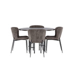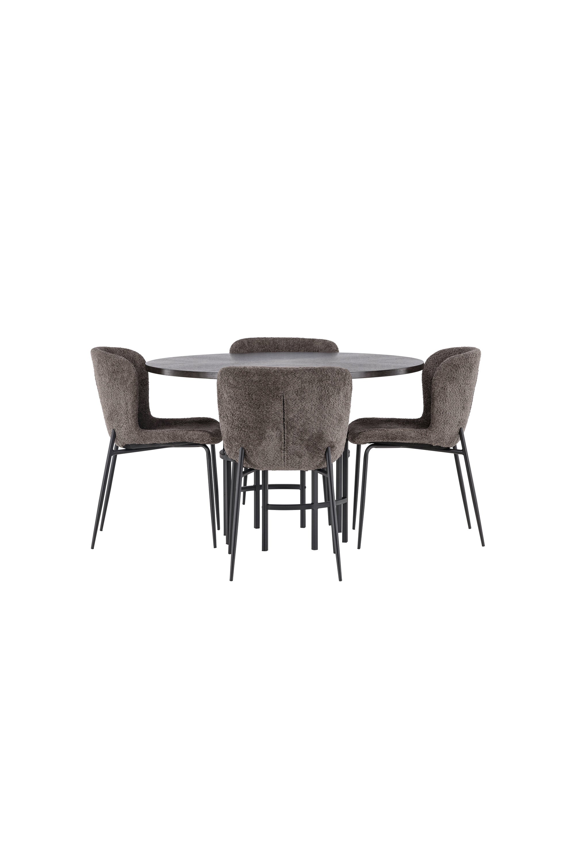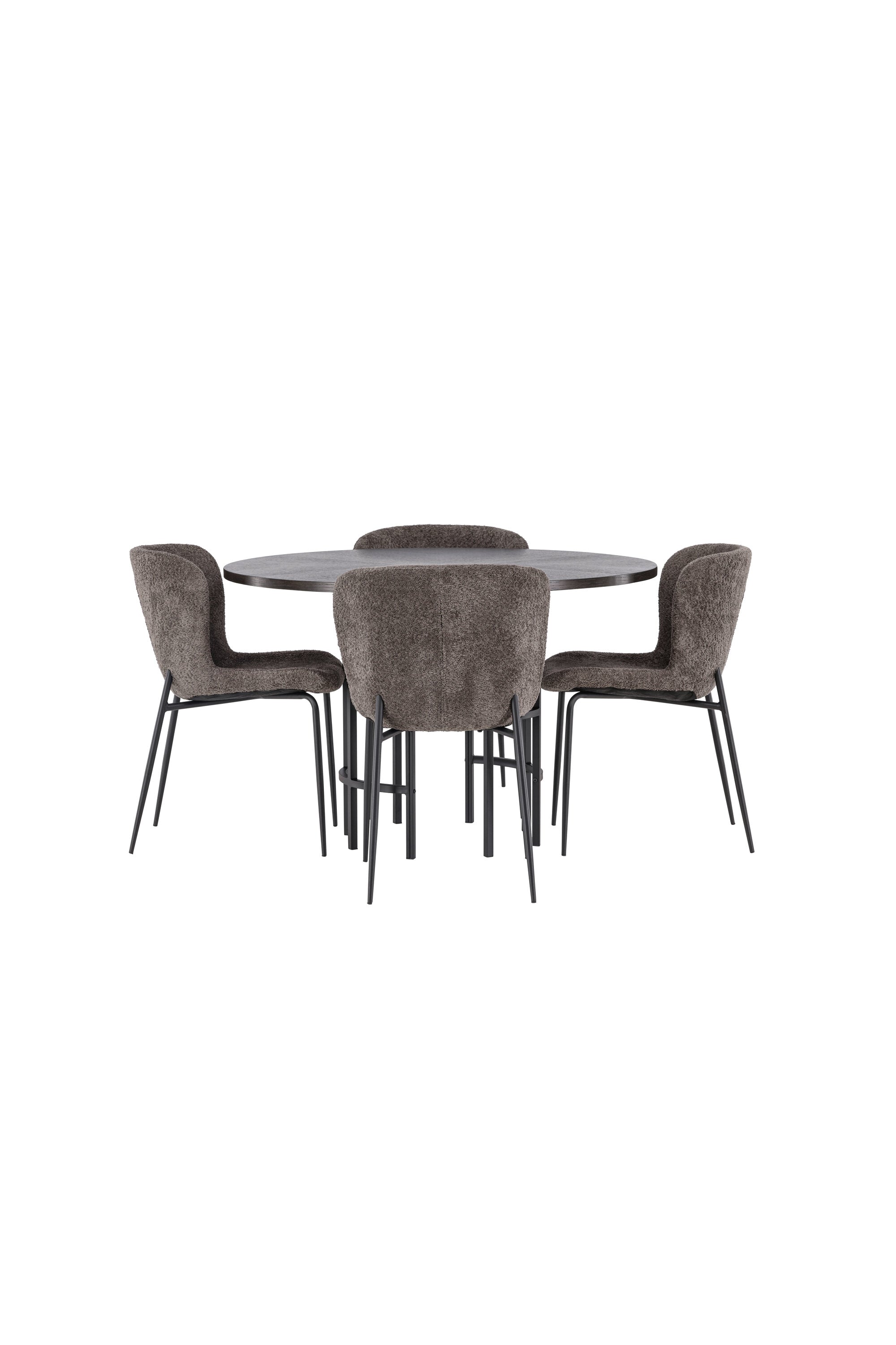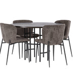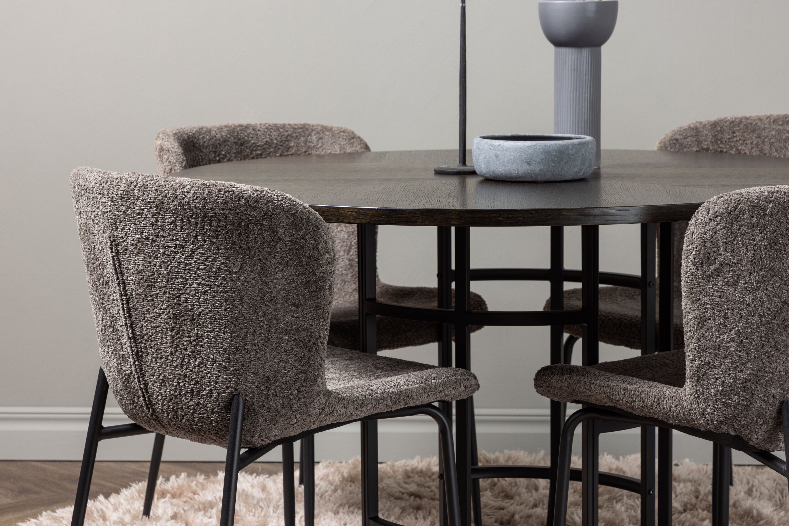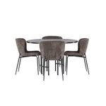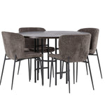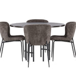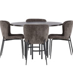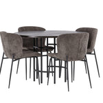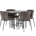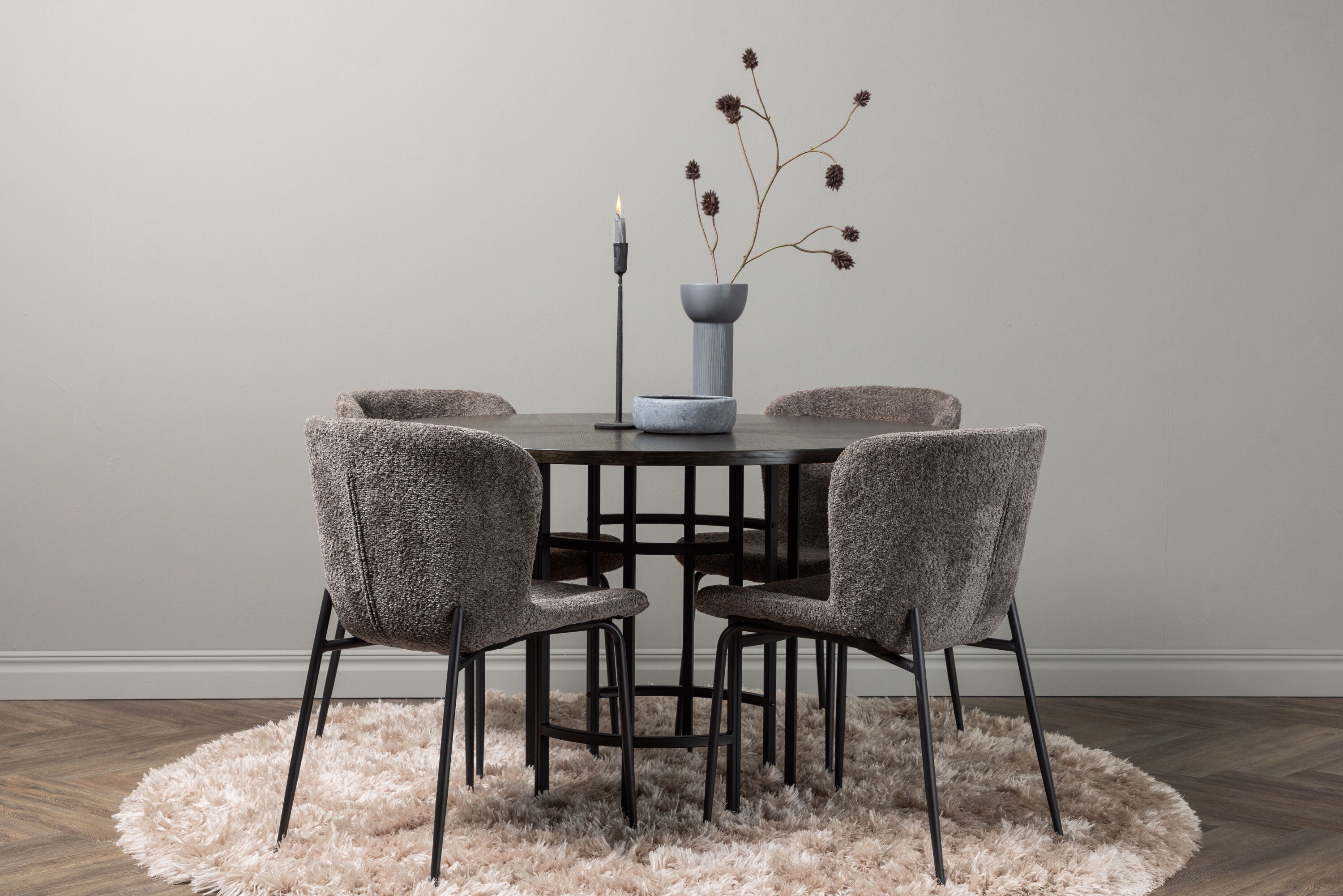 Jídelní skupina podle všech vašich přání! Náš kulatý jídelní stůl Copenhagen má krásnou hnědou desku z MDF s dýhou a ozdobnou válcovou základnu z černého kovu. Zde společně s módními jídelními židlemi ze série Modesto. Židle je celočalouněná šedou chlupatou látkou se stylovými úzkými nohami v černém kovu. Mírně zaoblená záda a čalouněný sedák poskytují extra pohodlí a rozšiřují příjemné jídlo kolem jídelního stolu. Už to nebude lepší než tohle! Rozměry stolu: 115 cm.