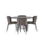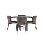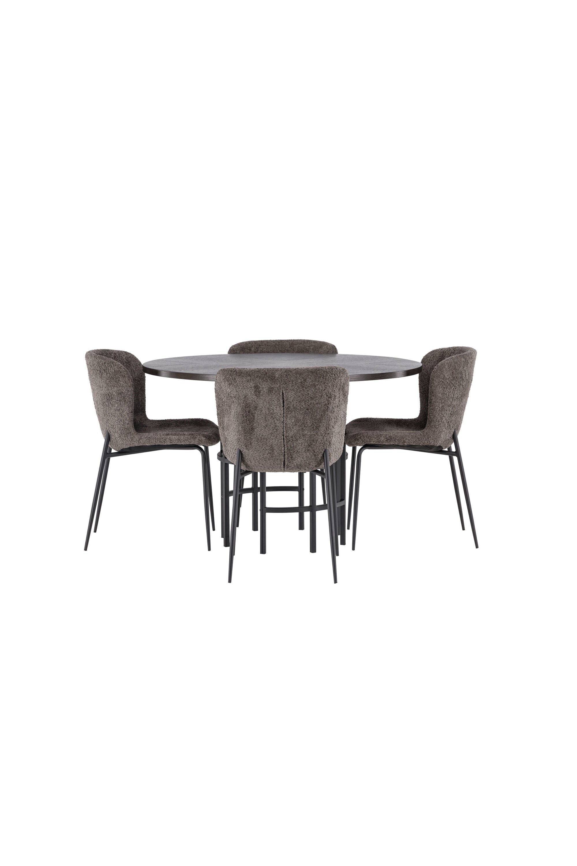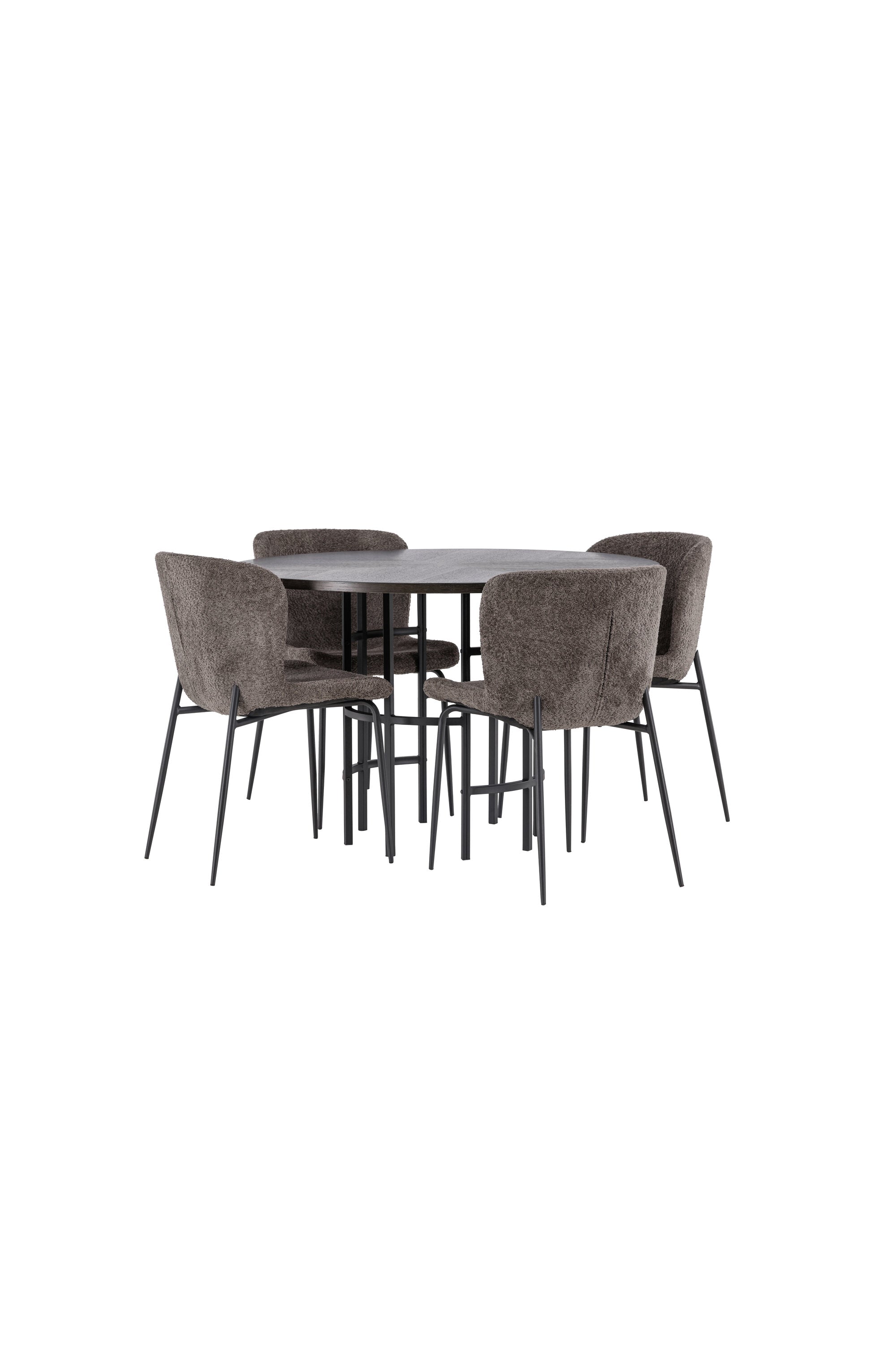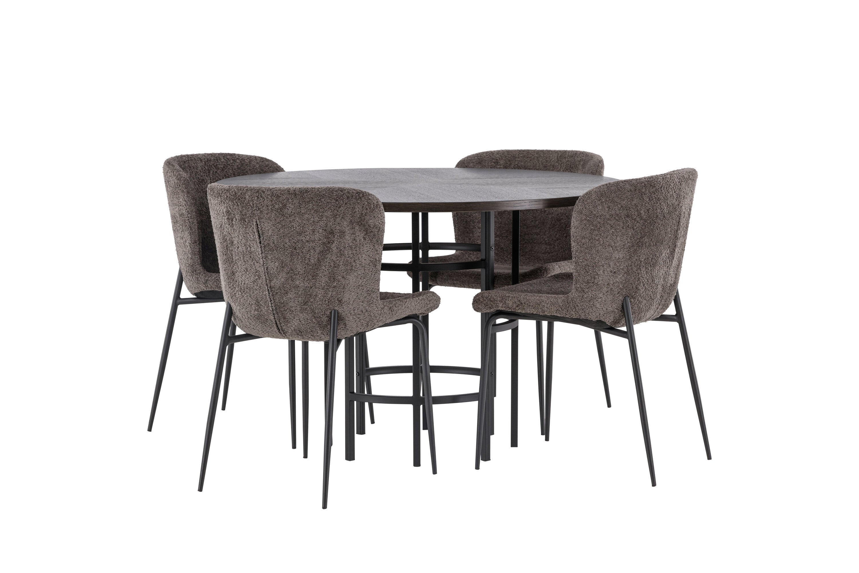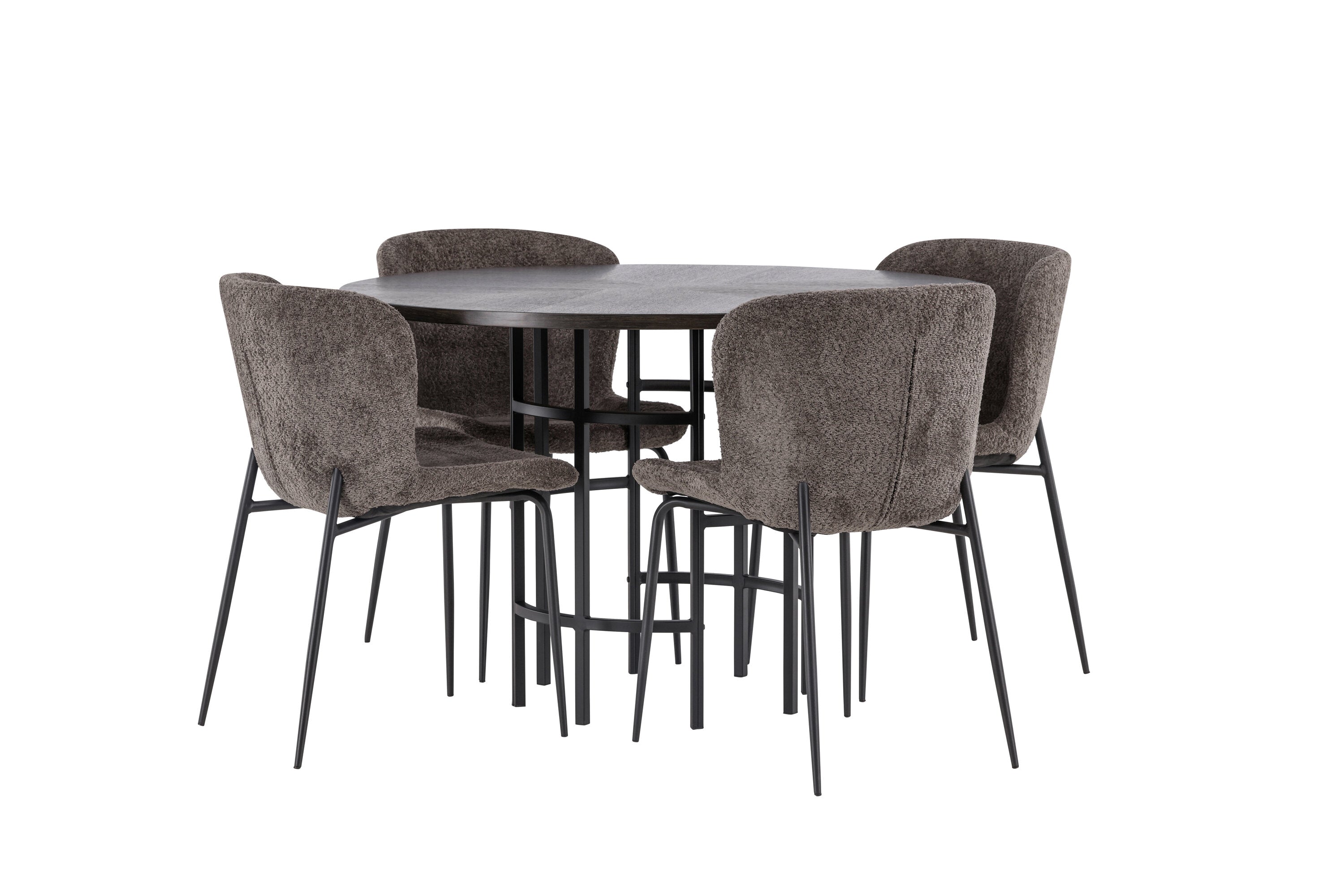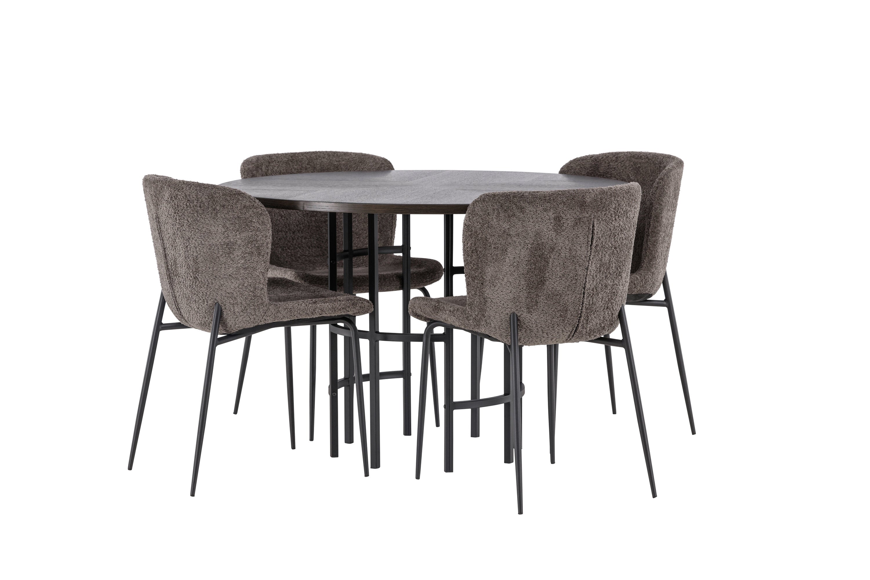 Jídelní skupina podle všech vašich přání! Náš kulatý jídelní stůl Copenhagen má krásnou hnědou desku z MDF s dýhou a ozdobnou válcovou základnu z černého kovu. Zde společně s módními jídelními židlemi ze série Modesto. Židle je celočalouněná šedou chlupatou látkou se stylovými úzkými nohami v černém kovu. Mírně zaoblená záda a čalouněný sedák poskytují extra pohodlí a rozšiřují příjemné jídlo kolem jídelního stolu. Už to nebude lepší než tohle! Rozměry stolu: 115 cm.