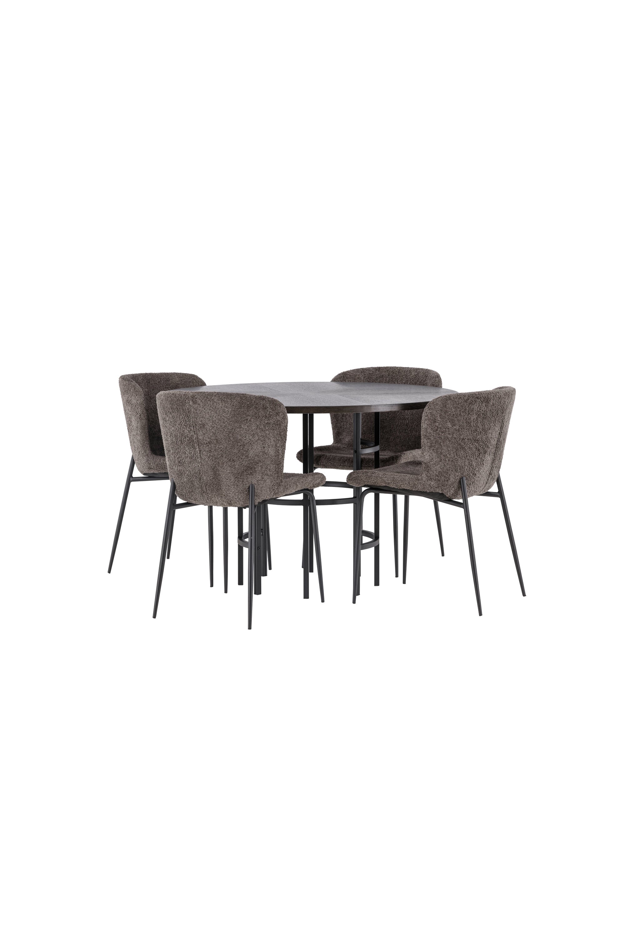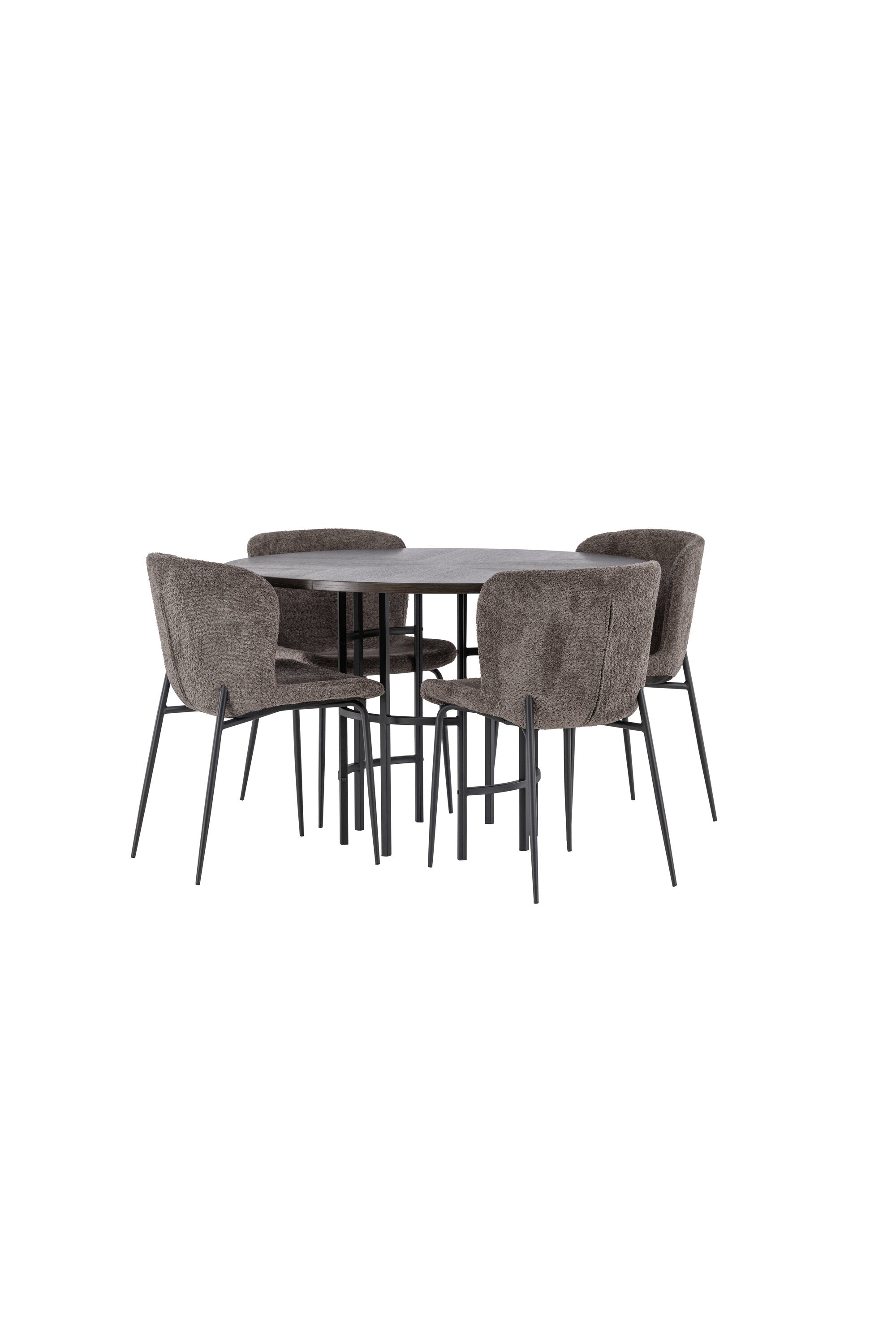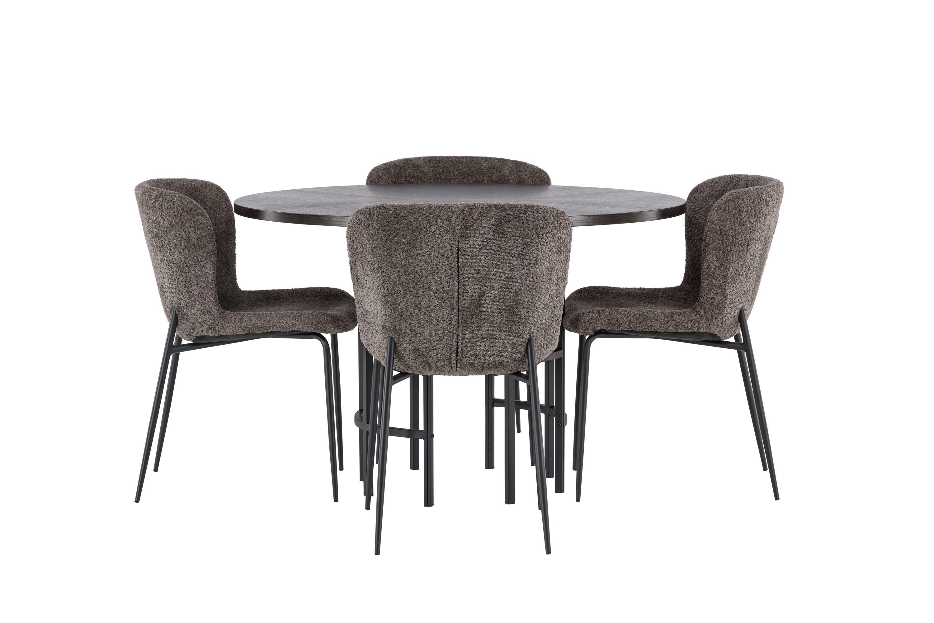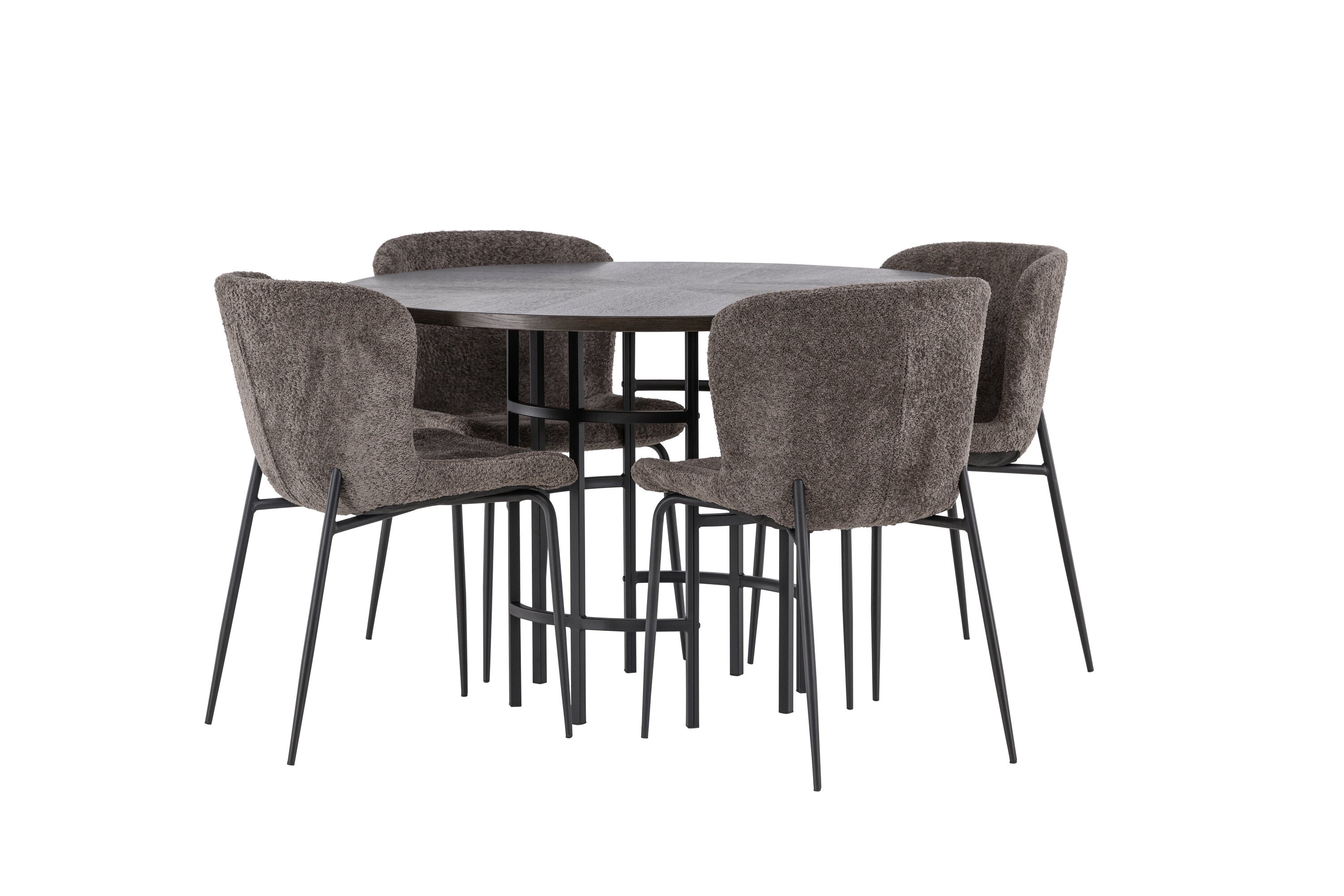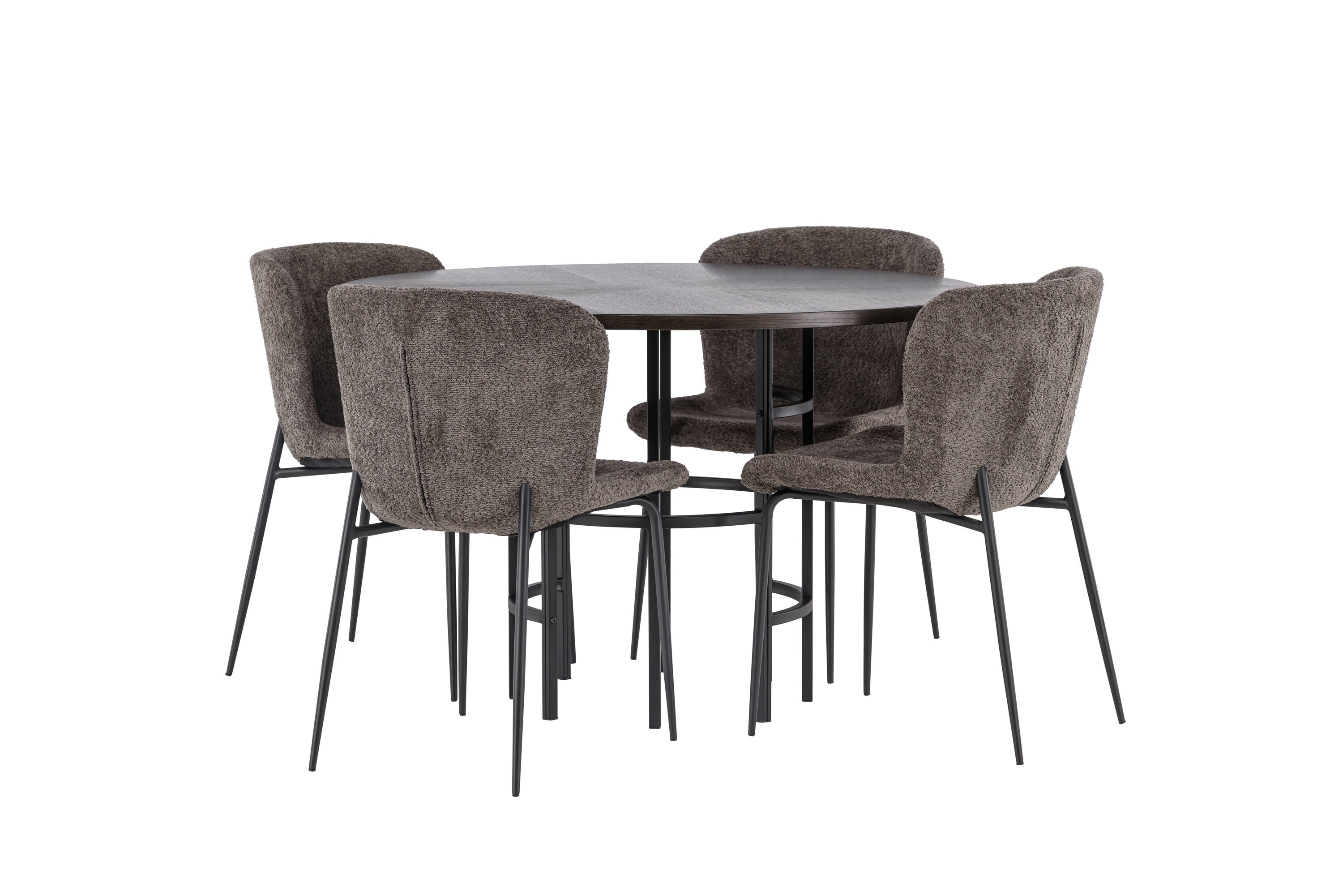 Jídelní skupina podle všech vašich přání! Náš kulatý jídelní stůl Copenhagen má krásnou hnědou desku z MDF s dýhou a ozdobnou válcovou základnu z černého kovu. Zde společně s módními jídelními židlemi ze série Modesto. Židle je celočalouněná šedou chlupatou látkou se stylovými úzkými nohami v černém kovu. Mírně zaoblená záda a čalouněný sedák poskytují extra pohodlí a rozšiřují příjemné jídlo kolem jídelního stolu. Už to nebude lepší než tohle! Rozměry stolu: 115 cm.