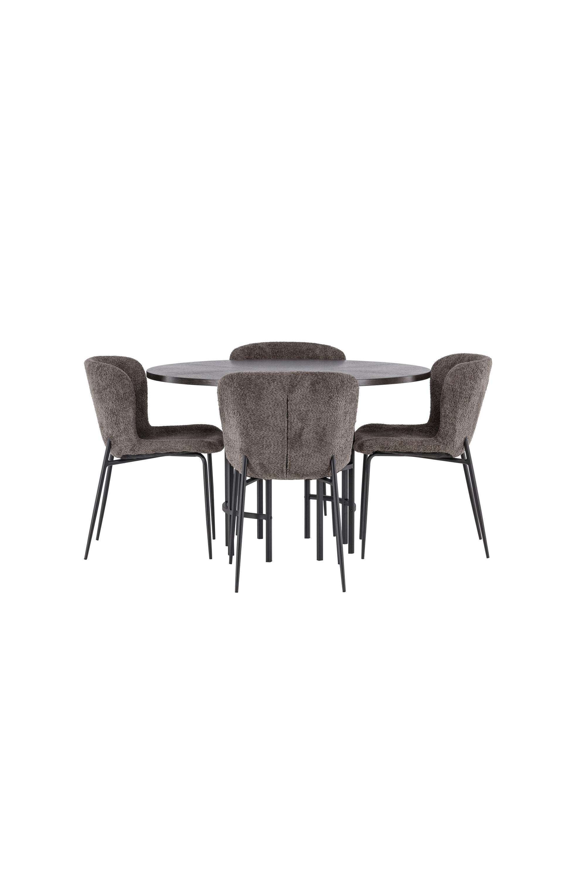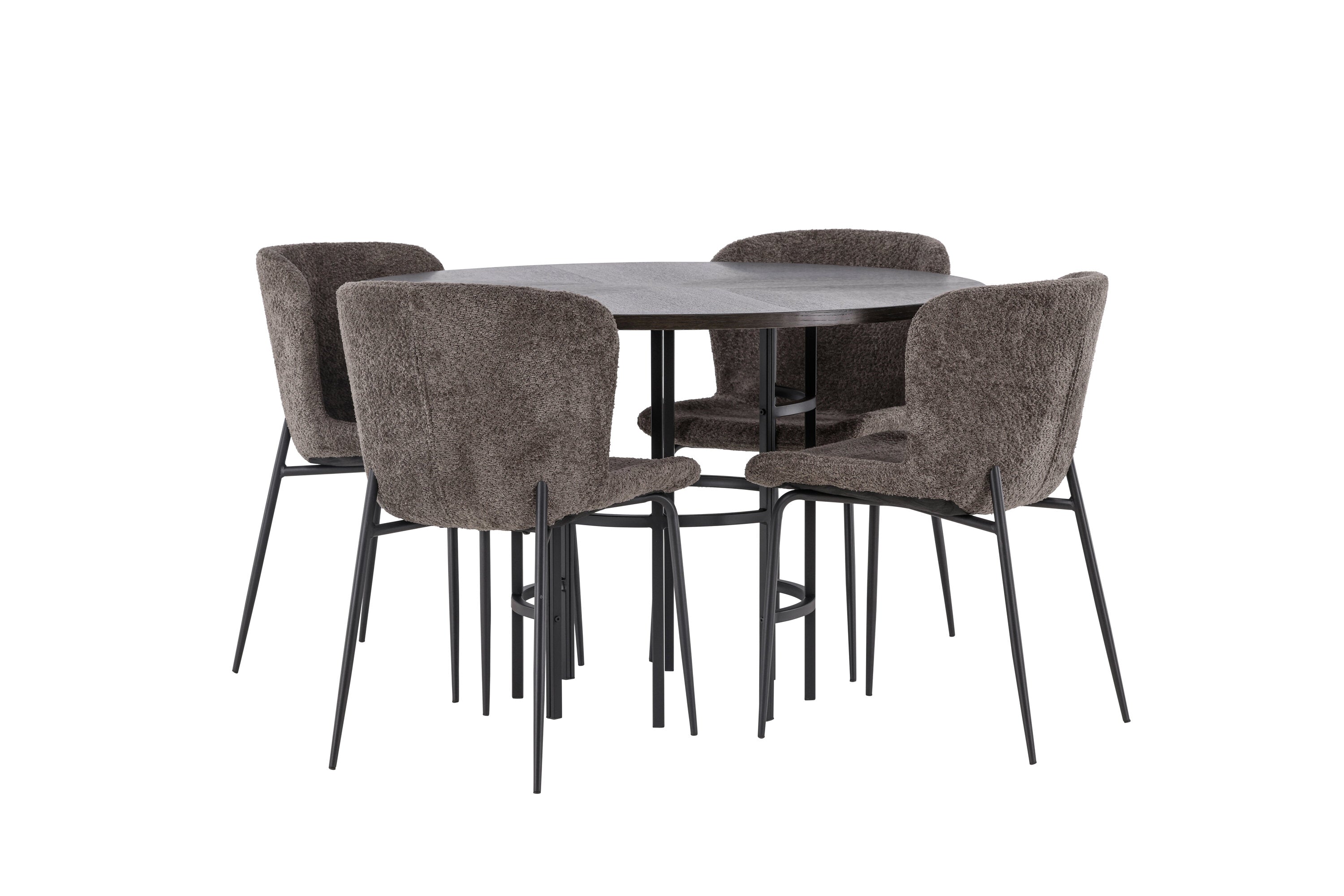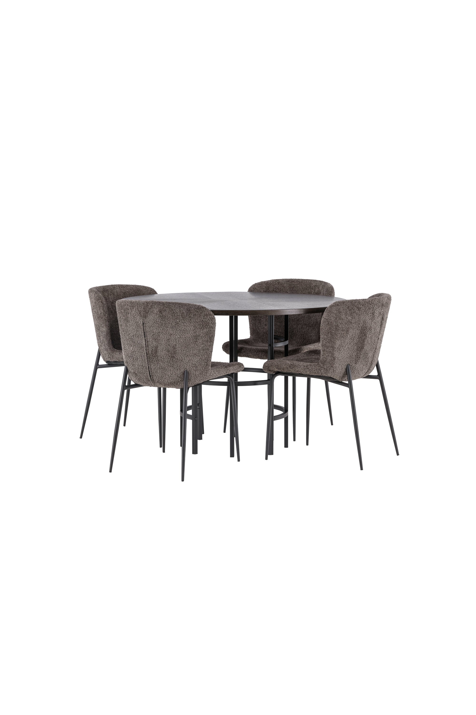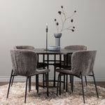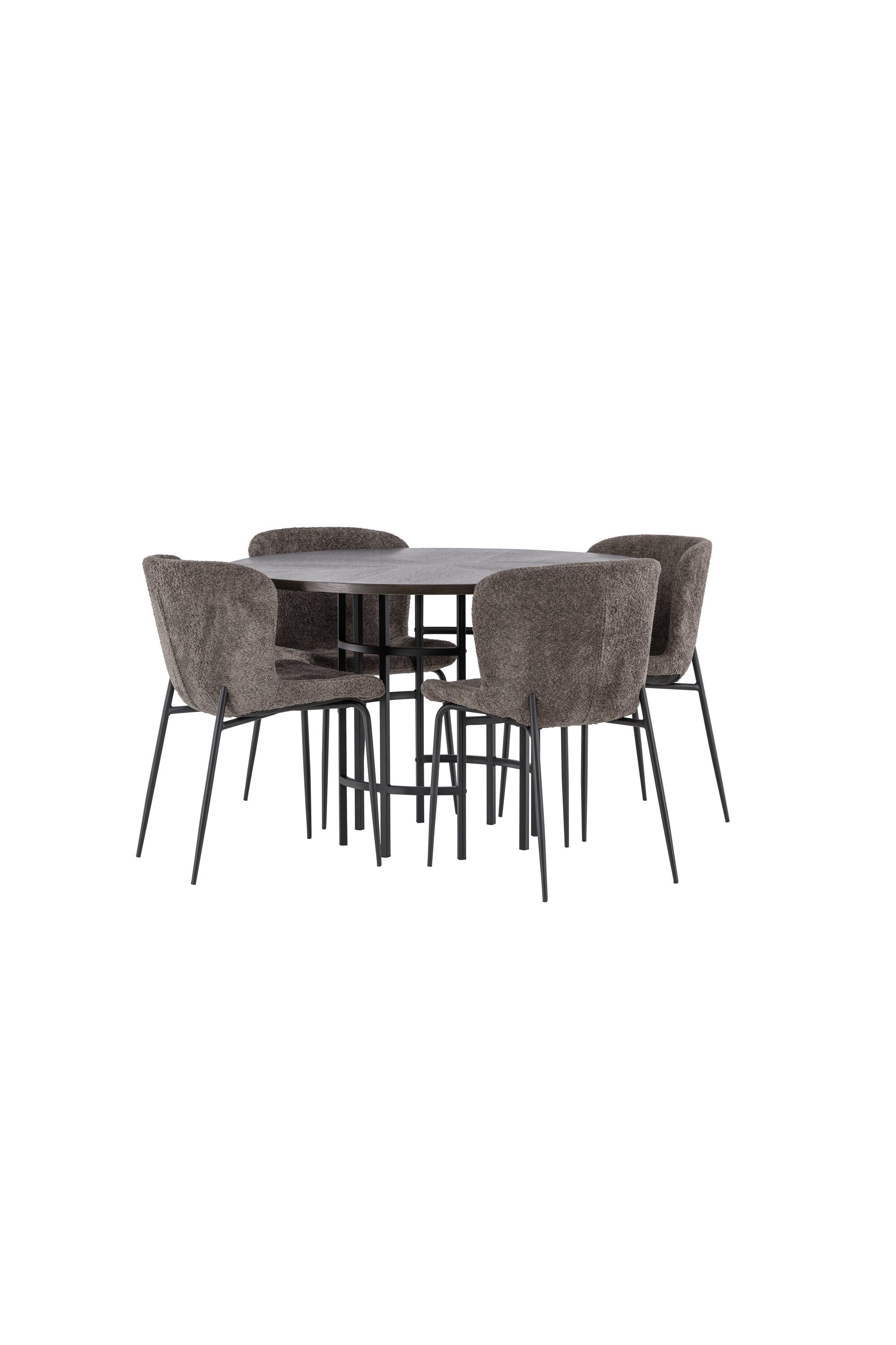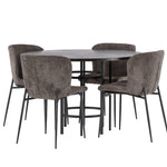 Jídelní skupina podle všech vašich přání! Náš kulatý jídelní stůl Copenhagen má krásnou hnědou desku z MDF s dýhou a ozdobnou válcovou základnu z černého kovu. Zde společně s módními jídelními židlemi ze série Modesto. Židle je celočalouněná šedou chlupatou látkou se stylovými úzkými nohami v černém kovu. Mírně zaoblená záda a čalouněný sedák poskytují extra pohodlí a rozšiřují příjemné jídlo kolem jídelního stolu. Už to nebude lepší než tohle! Rozměry stolu: 115 cm.