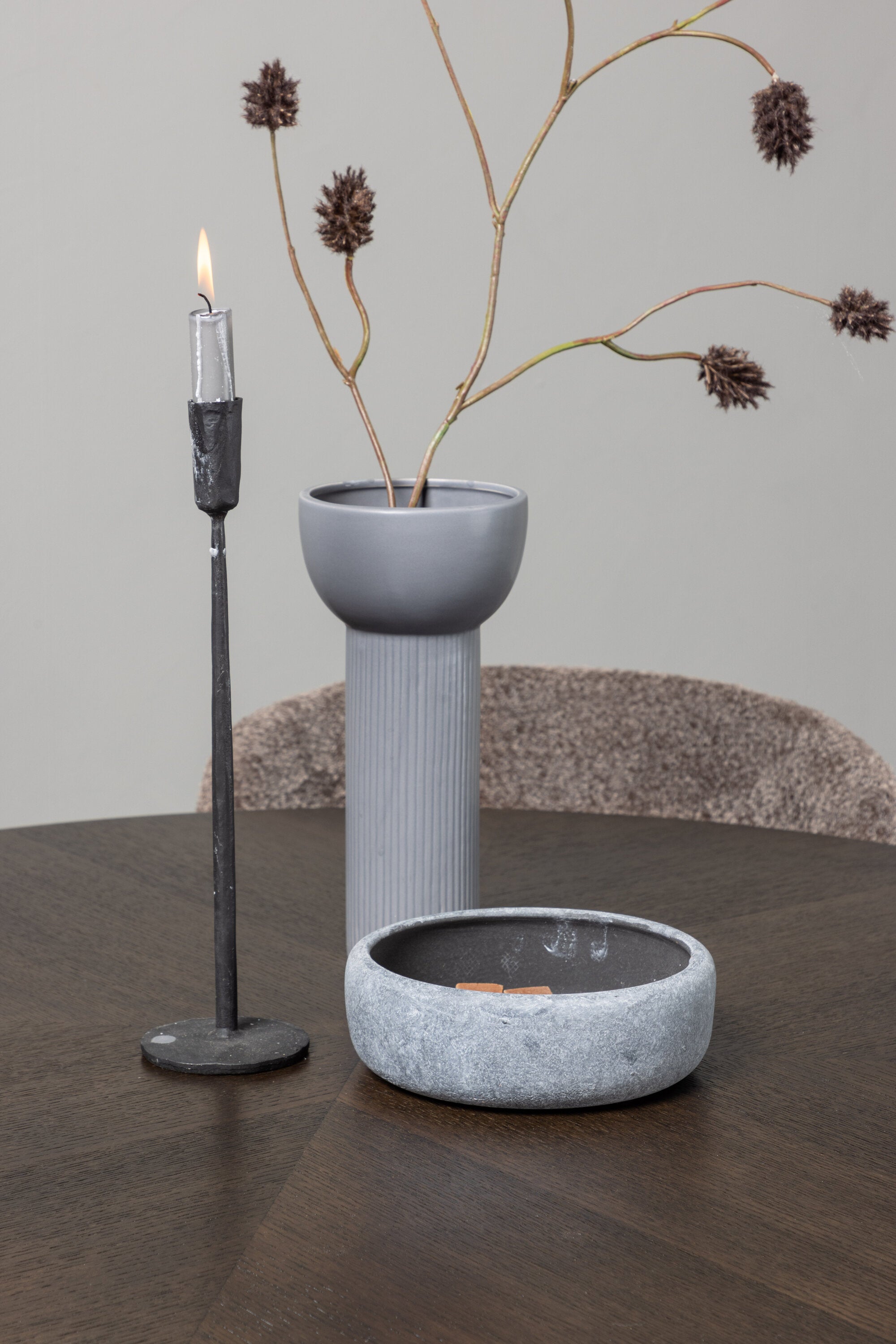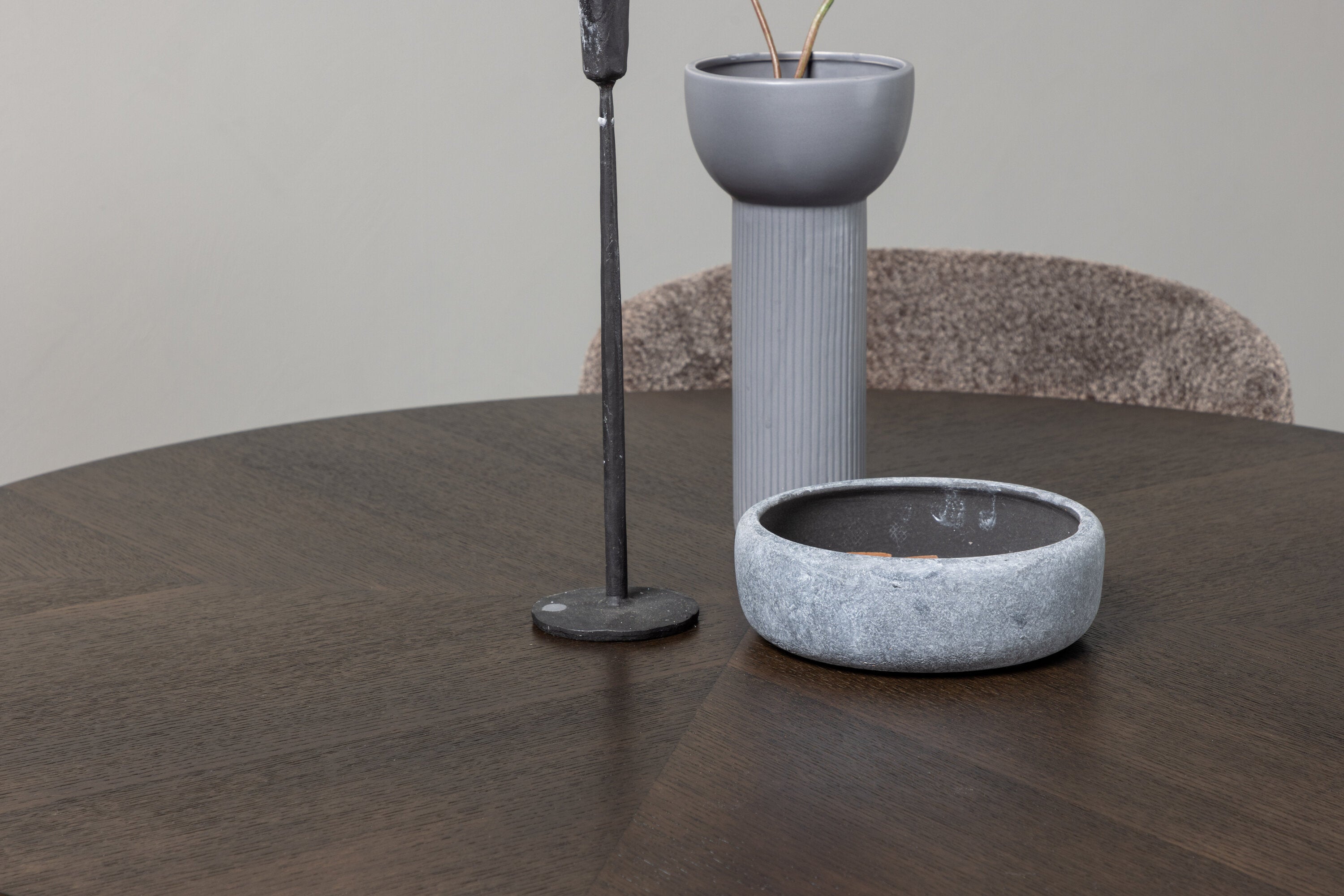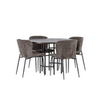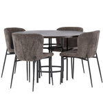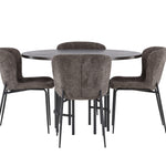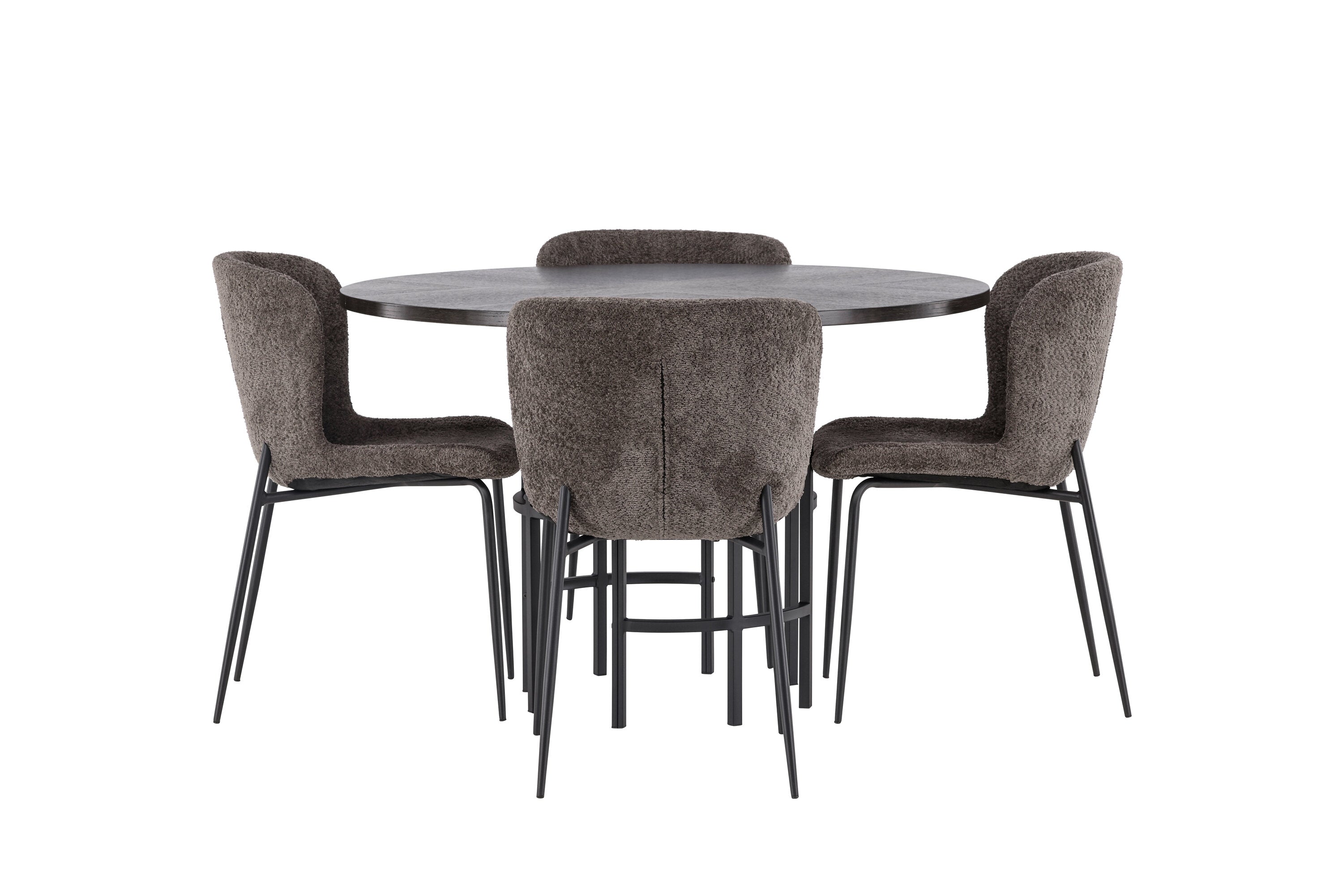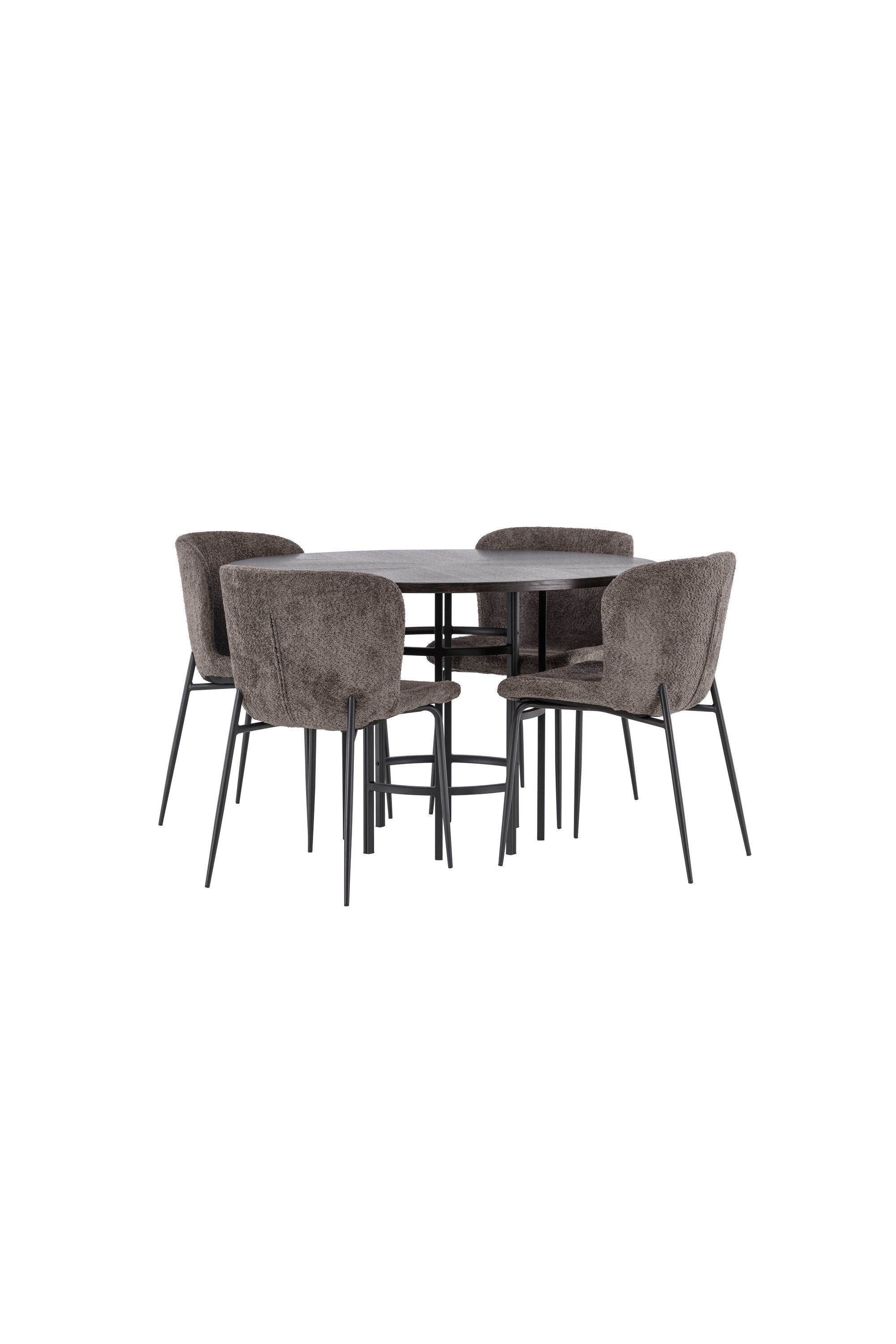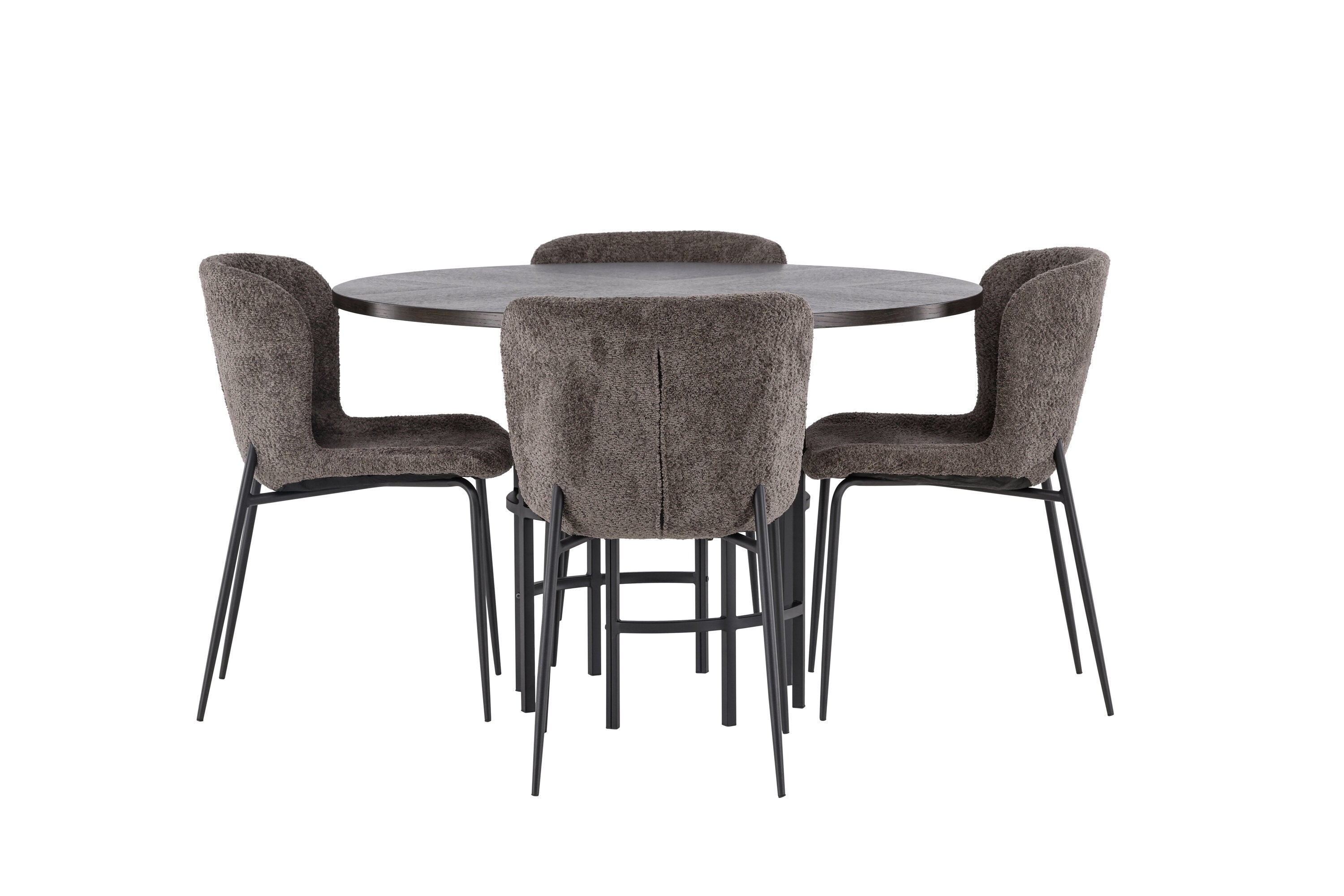 Jídelní skupina podle všech vašich přání! Náš kulatý jídelní stůl Copenhagen má krásnou hnědou desku z MDF s dýhou a ozdobnou válcovou základnu z černého kovu. Zde společně s módními jídelními židlemi ze série Modesto. Židle je celočalouněná šedou chlupatou látkou se stylovými úzkými nohami v černém kovu. Mírně zaoblená záda a čalouněný sedák poskytují extra pohodlí a rozšiřují příjemné jídlo kolem jídelního stolu. Už to nebude lepší než tohle! Rozměry stolu: 115 cm.