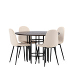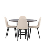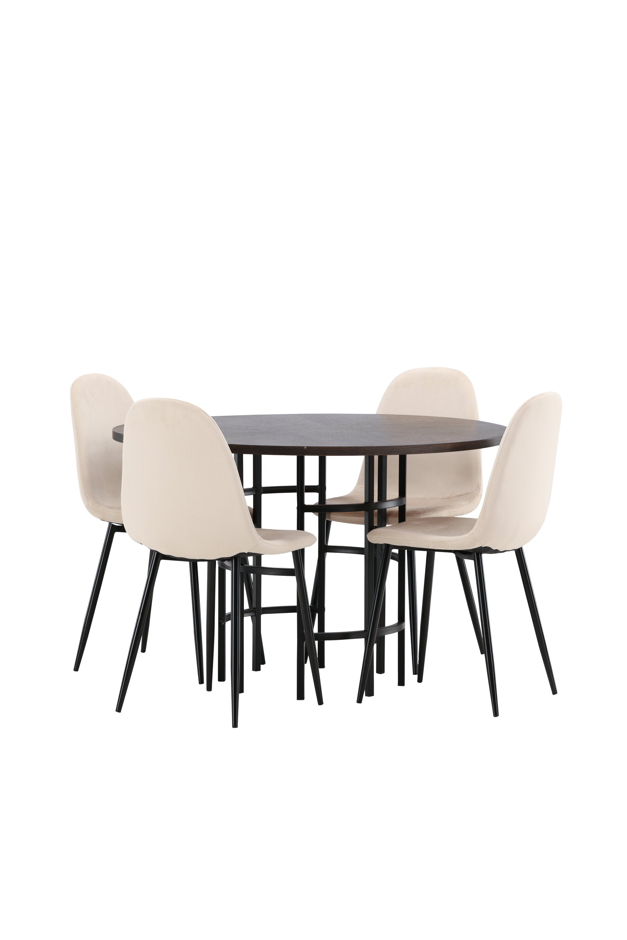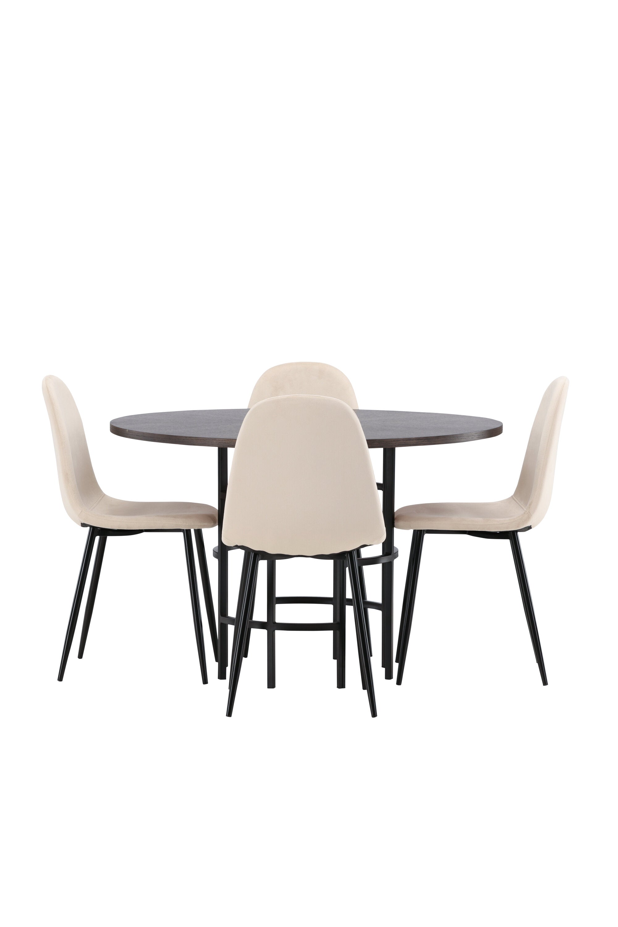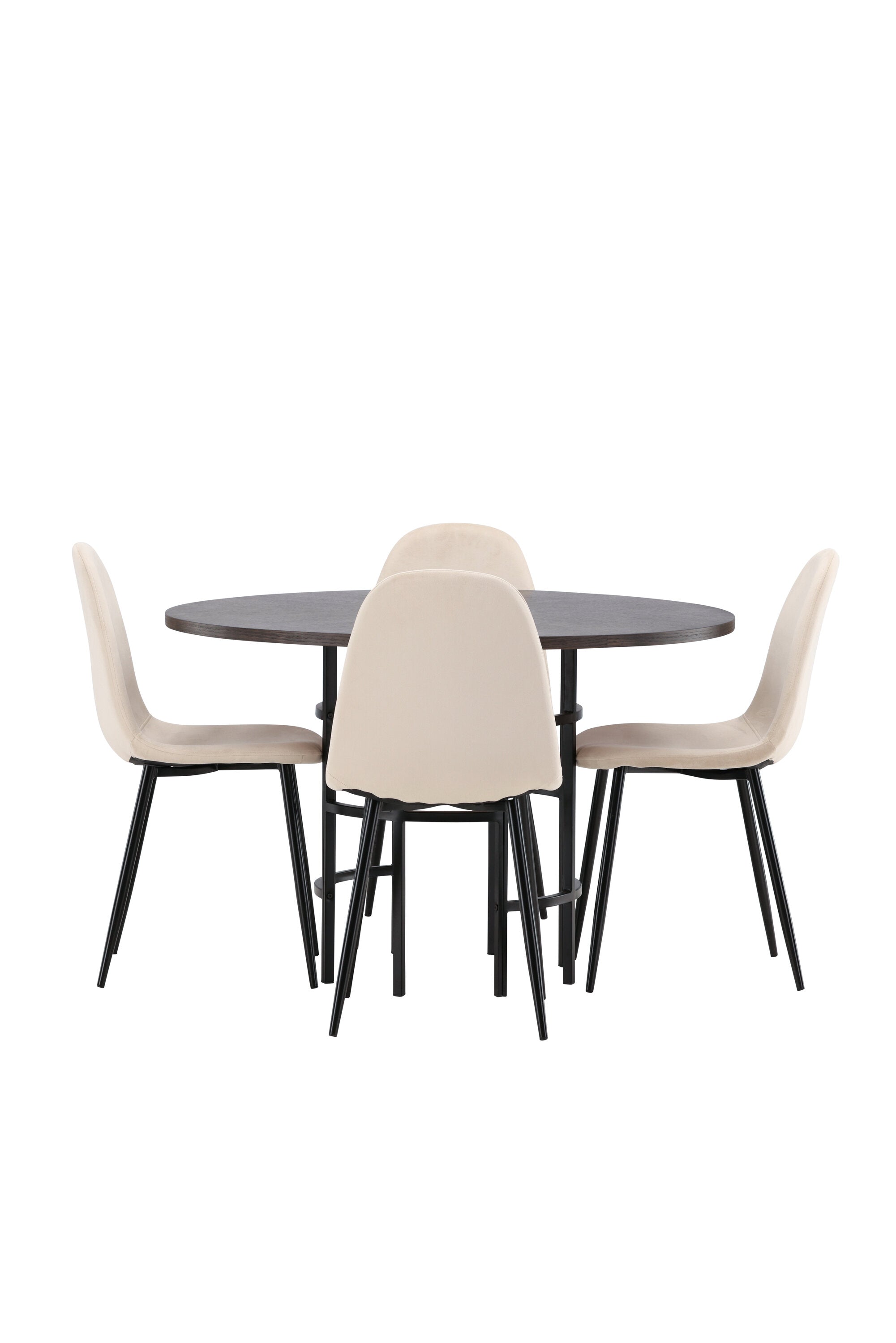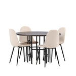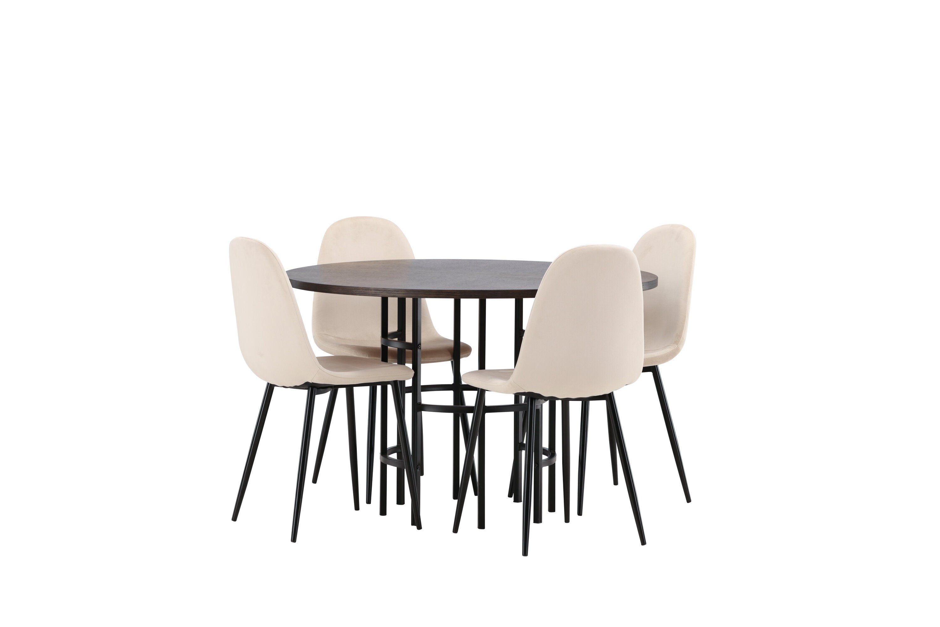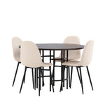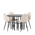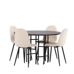 Stylový, moderní a nadčasový – jídelní skupina, která zaujme! Tento trendový jídelní stůl ze série Copenhagen patří do kolekce Furniture Fashion a má krásnou hnědou desku z MDF s dýhou a ozdobnou válcovou základnu z černého kovu. Zde společně s našimi pohodlnými jídelními židlemi ze série Polar. Židle má celočalouněný design se zaobleným opěradlem a sedákem z béžové sametové látky s měkkým polstrováním a nohami z černého kovu s práškovým nástřikem. Nedělejte kompromisy mezi pohodlím a designem!