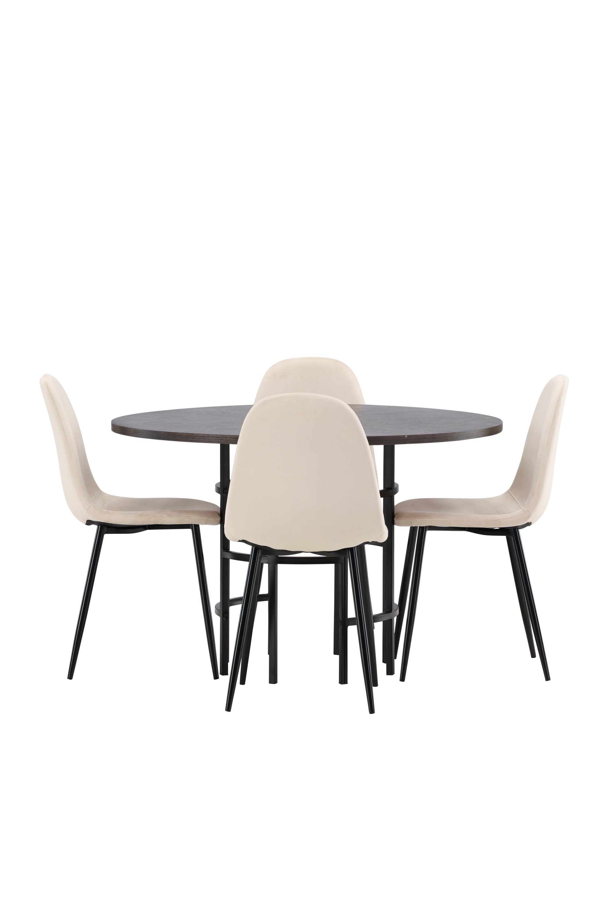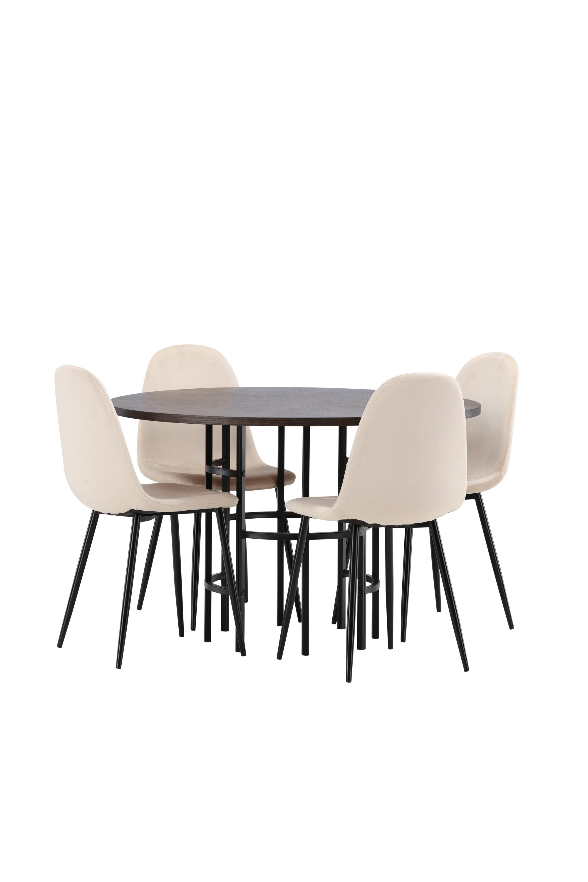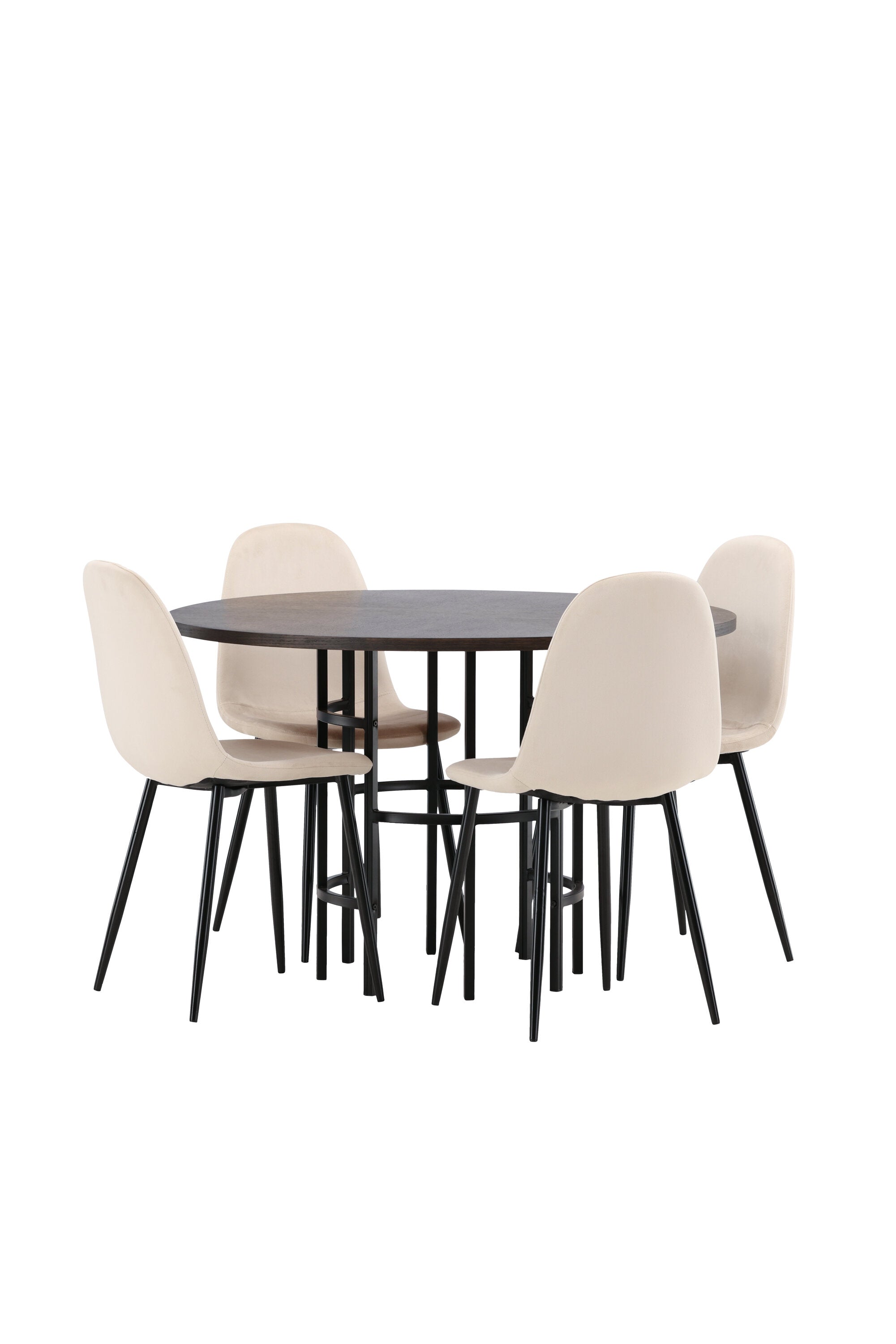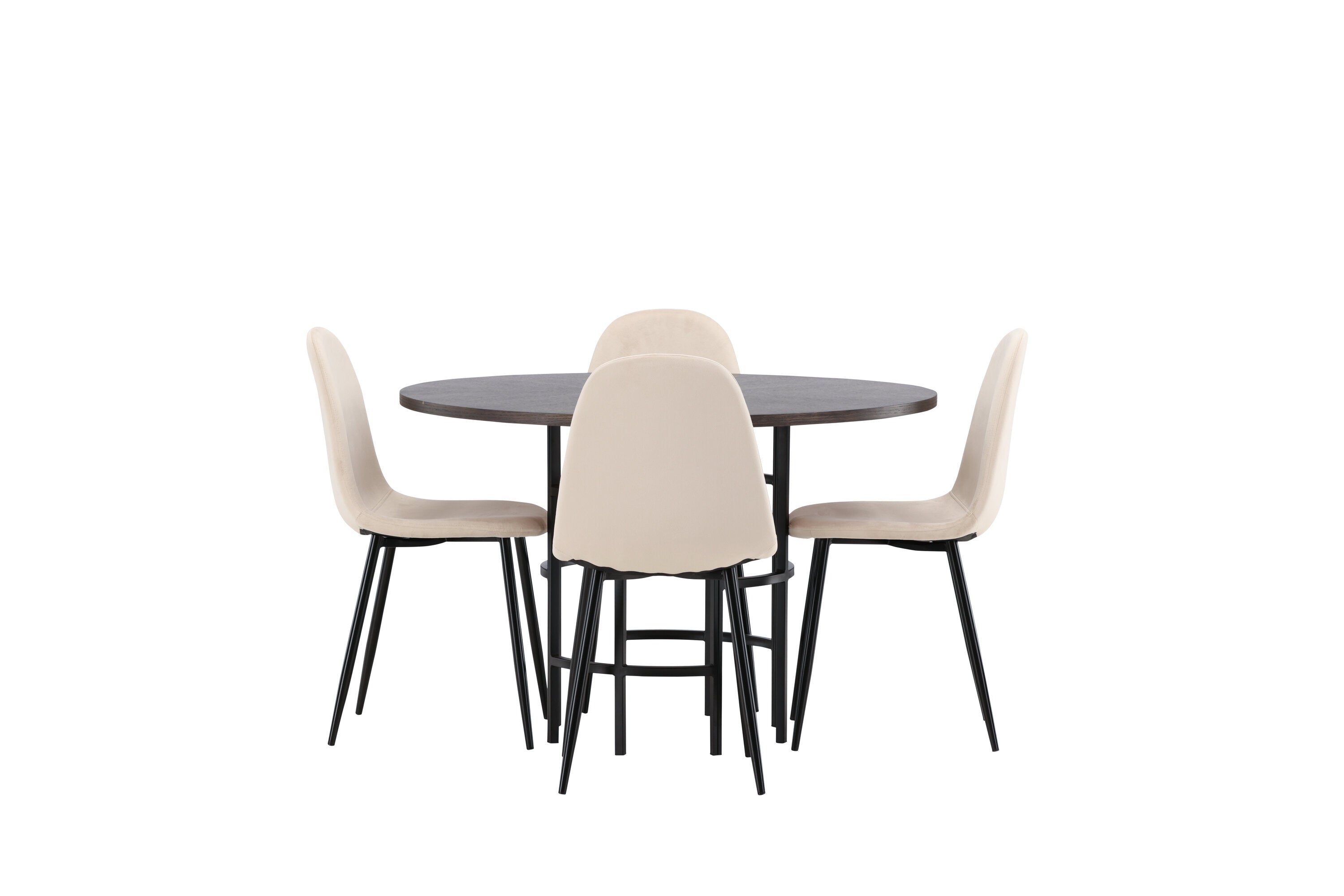 Stylový, moderní a nadčasový – jídelní skupina, která zaujme! Tento trendový jídelní stůl ze série Copenhagen patří do kolekce Furniture Fashion a má krásnou hnědou desku z MDF s dýhou a ozdobnou válcovou základnu z černého kovu. Zde společně s našimi pohodlnými jídelními židlemi ze série Polar. Židle má celočalouněný design se zaobleným opěradlem a sedákem z béžové sametové látky s měkkým polstrováním a nohami z černého kovu s práškovým nástřikem. Nedělejte kompromisy mezi pohodlím a designem!