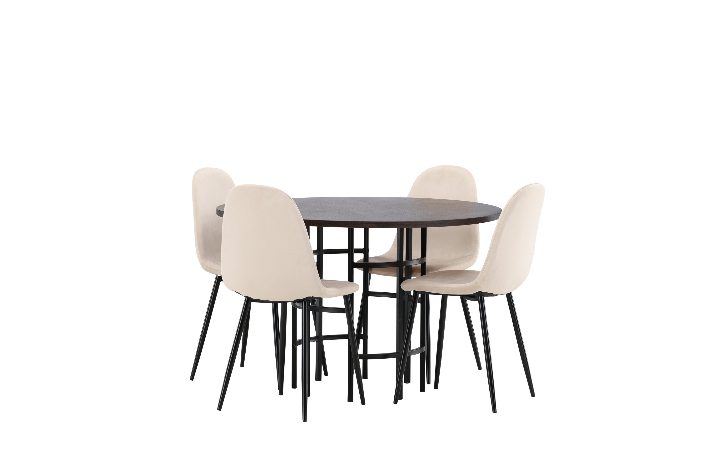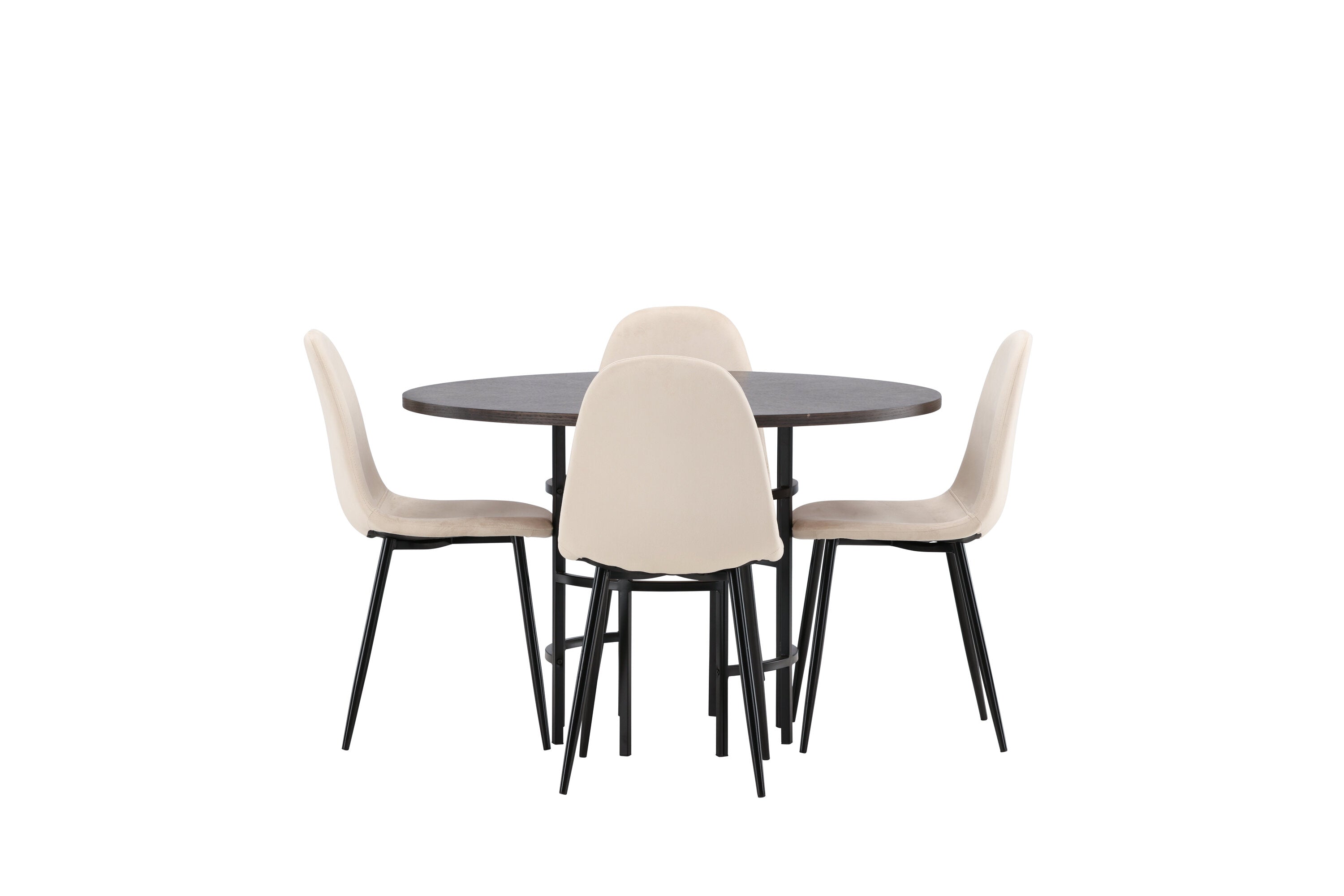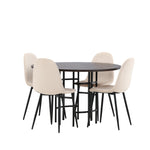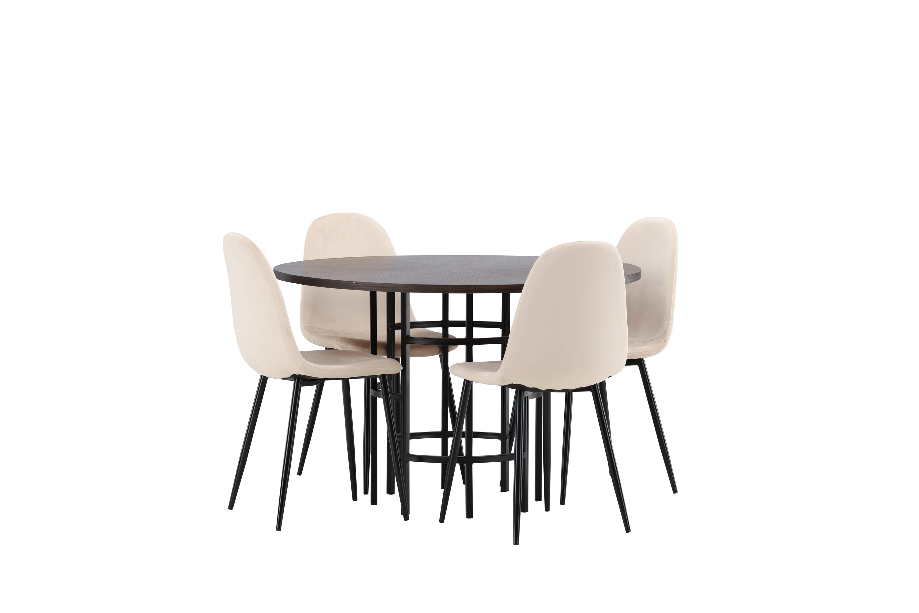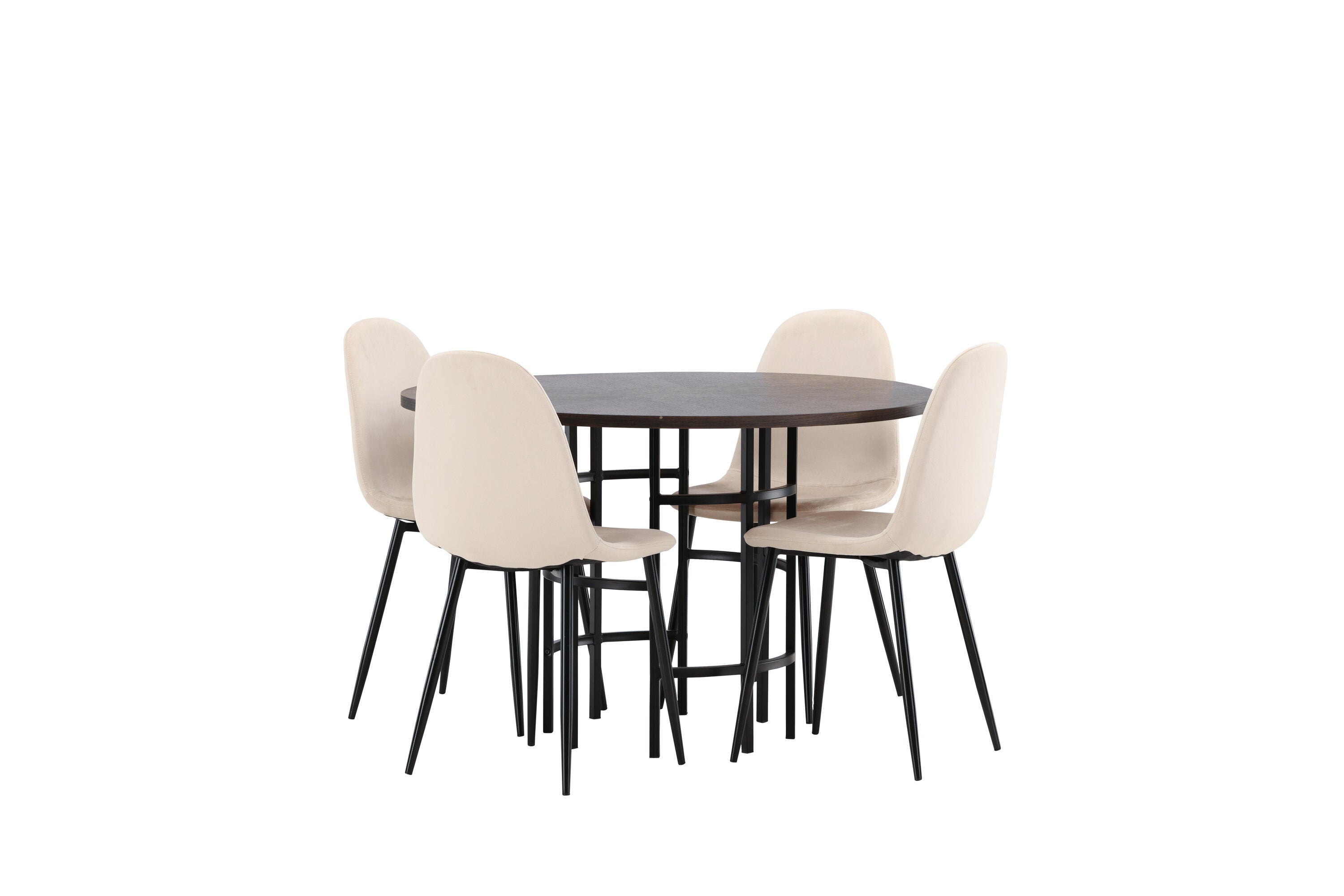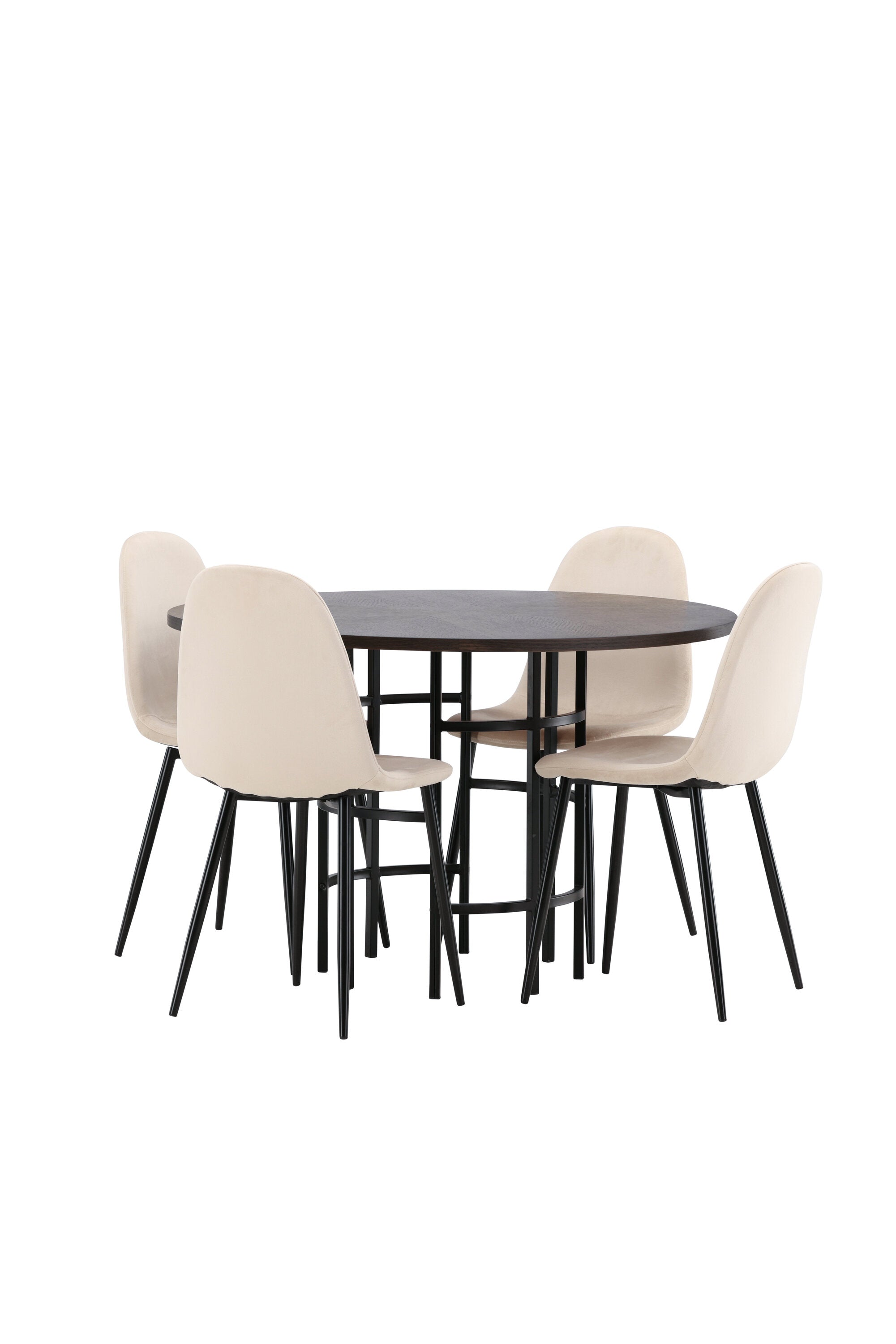 Stylový, moderní a nadčasový – jídelní skupina, která zaujme! Tento trendový jídelní stůl ze série Copenhagen patří do kolekce Furniture Fashion a má krásnou hnědou desku z MDF s dýhou a ozdobnou válcovou základnu z černého kovu. Zde společně s našimi pohodlnými jídelními židlemi ze série Polar. Židle má celočalouněný design se zaobleným opěradlem a sedákem z béžové sametové látky s měkkým polstrováním a nohami z černého kovu s práškovým nástřikem. Nedělejte kompromisy mezi pohodlím a designem!