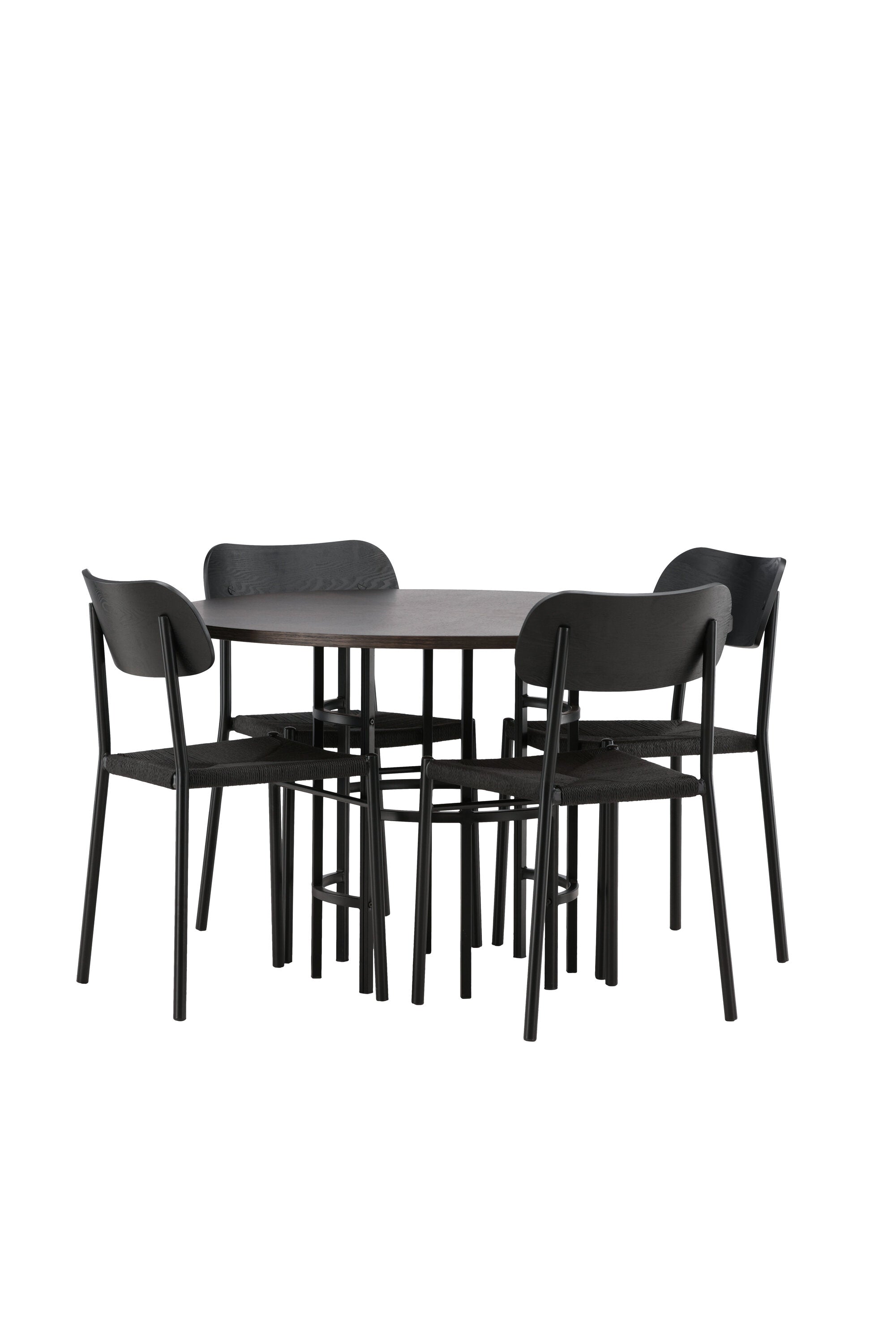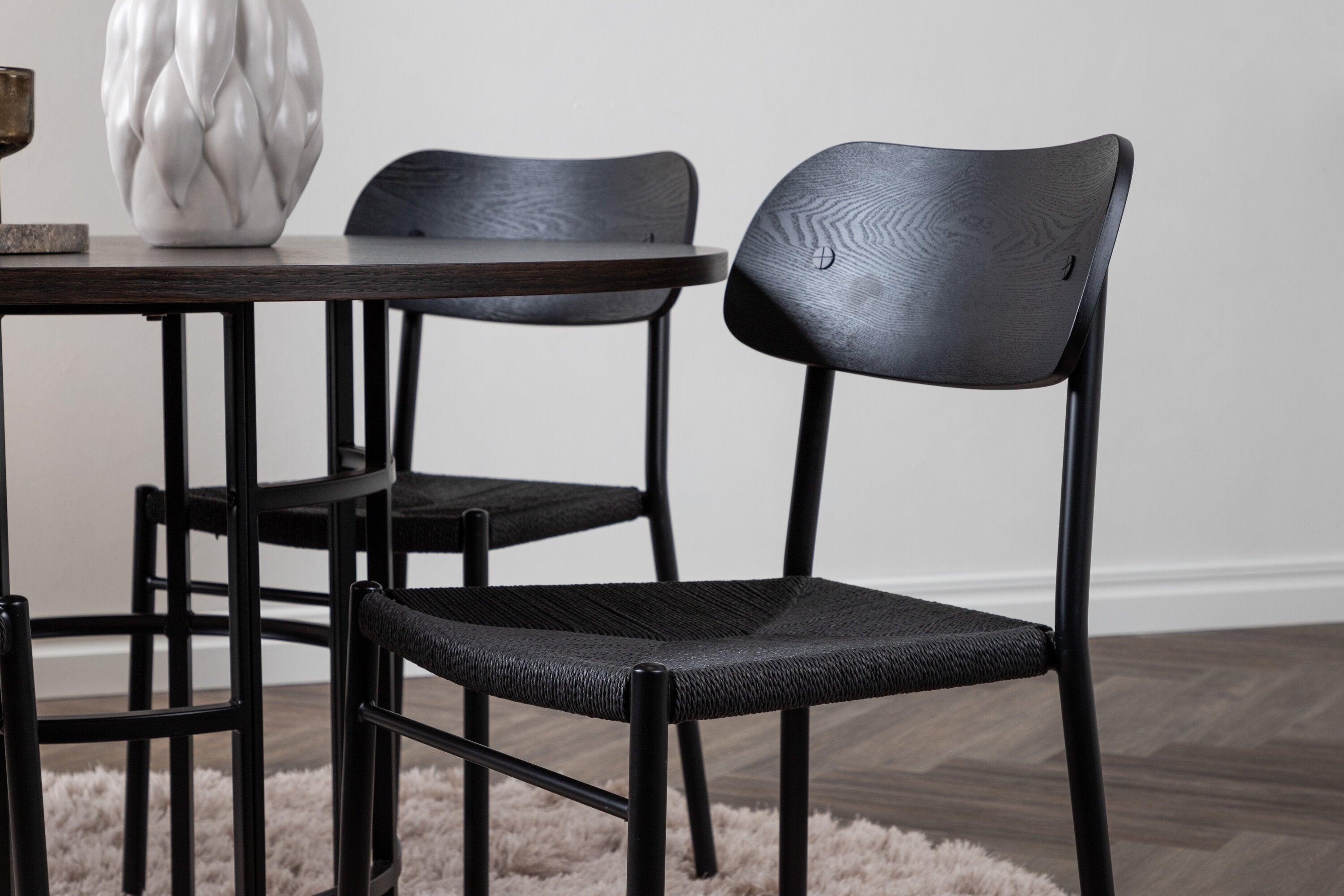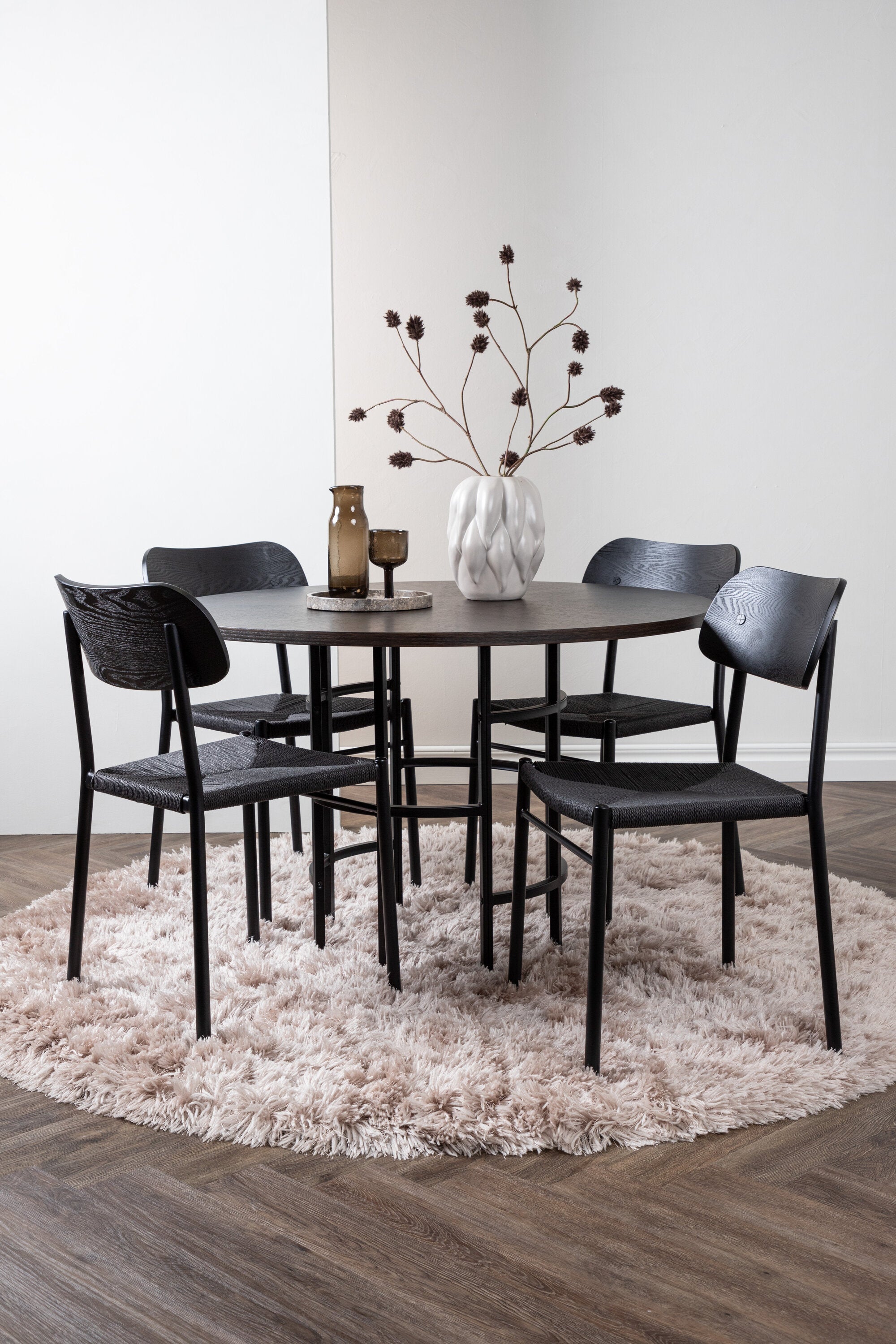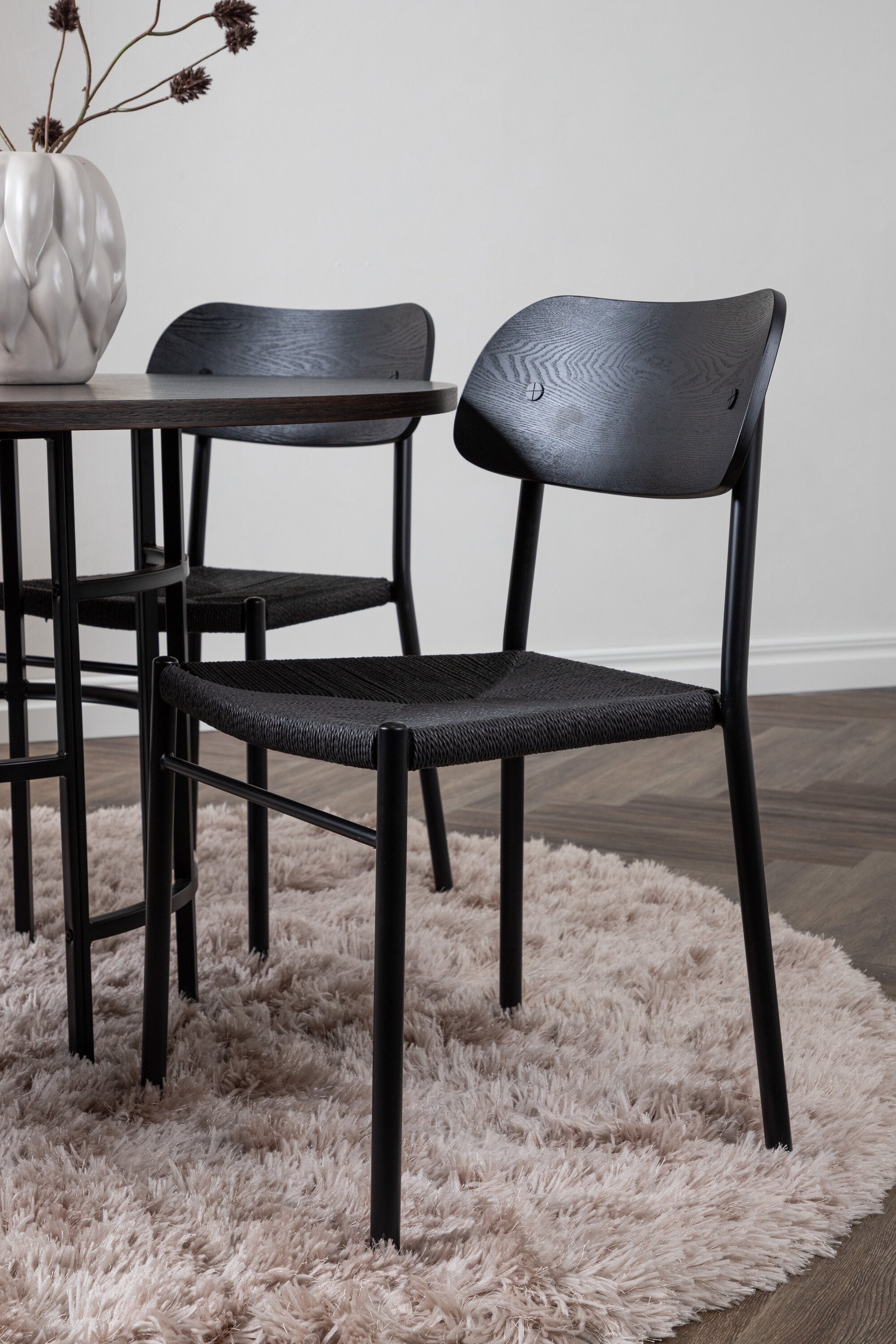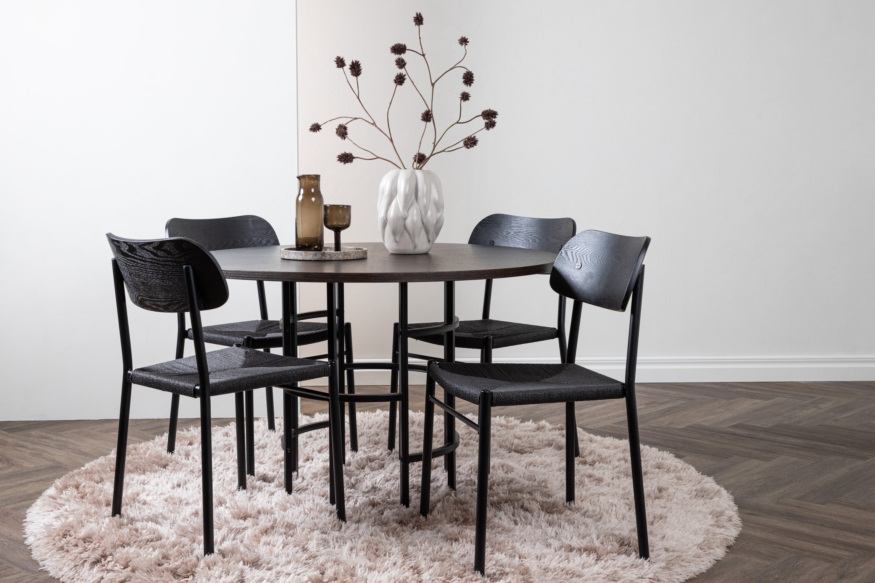 Vytvořte si okouzlující středobod v srdci vašeho domova! Máme zde naše stylové jídelní židle ze série Polly, navržené zcela podle trendů minimalistických tvarů. Zadní část je z černé MDF s dýhou, sedák z módní černé tkaniny z přírodních vláken a nohy jsou z kovu s černým práškovým nástřikem. Zde společně s naším oblíbeným jídelním stolem Copenhagen. Stůl z kolekce Furniture Fashion má krásnou hnědou desku z MDF s dýhou a ozdobnou, válcovou podnož v černém kovu. Stejně známé jako odolné vůči trendům!