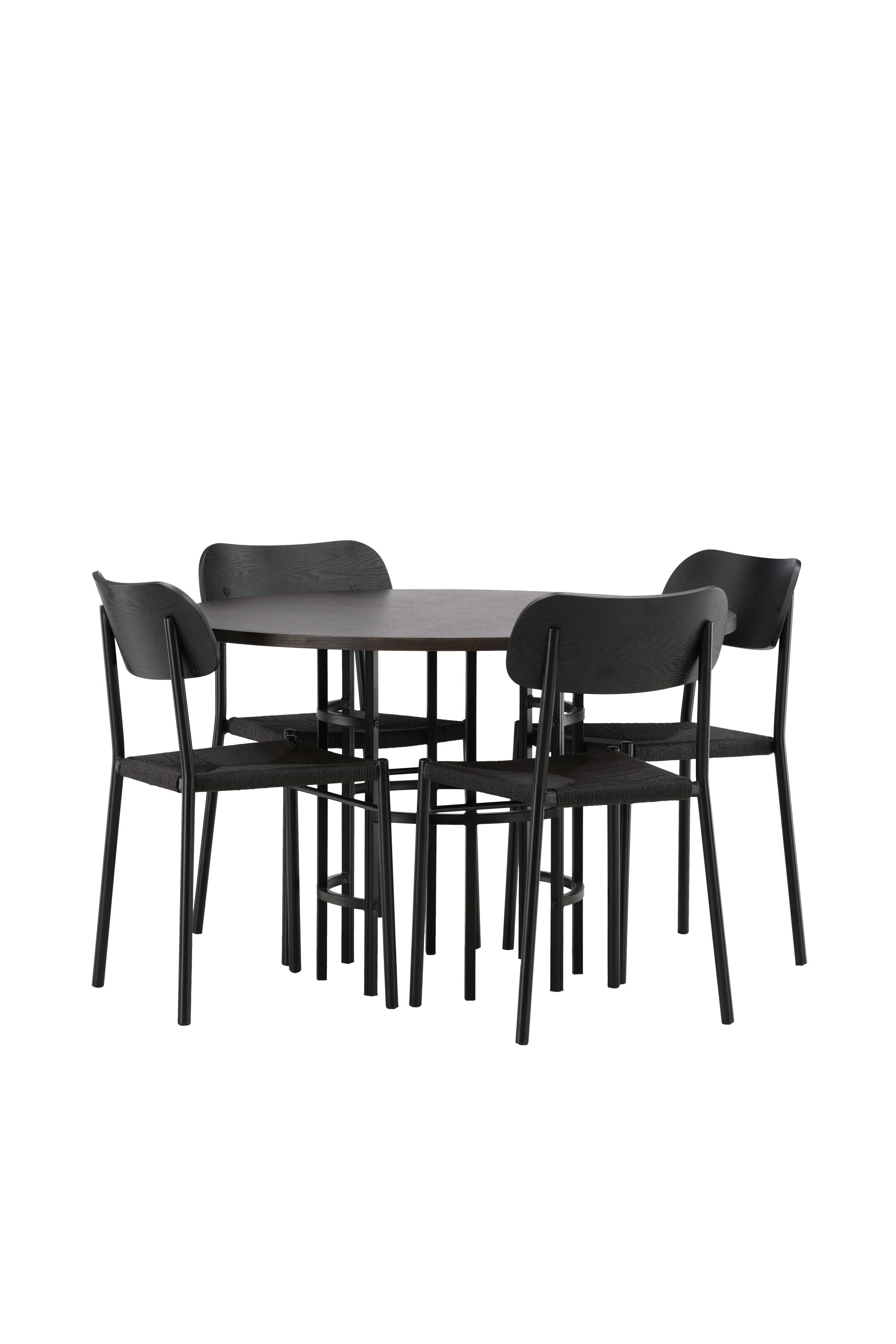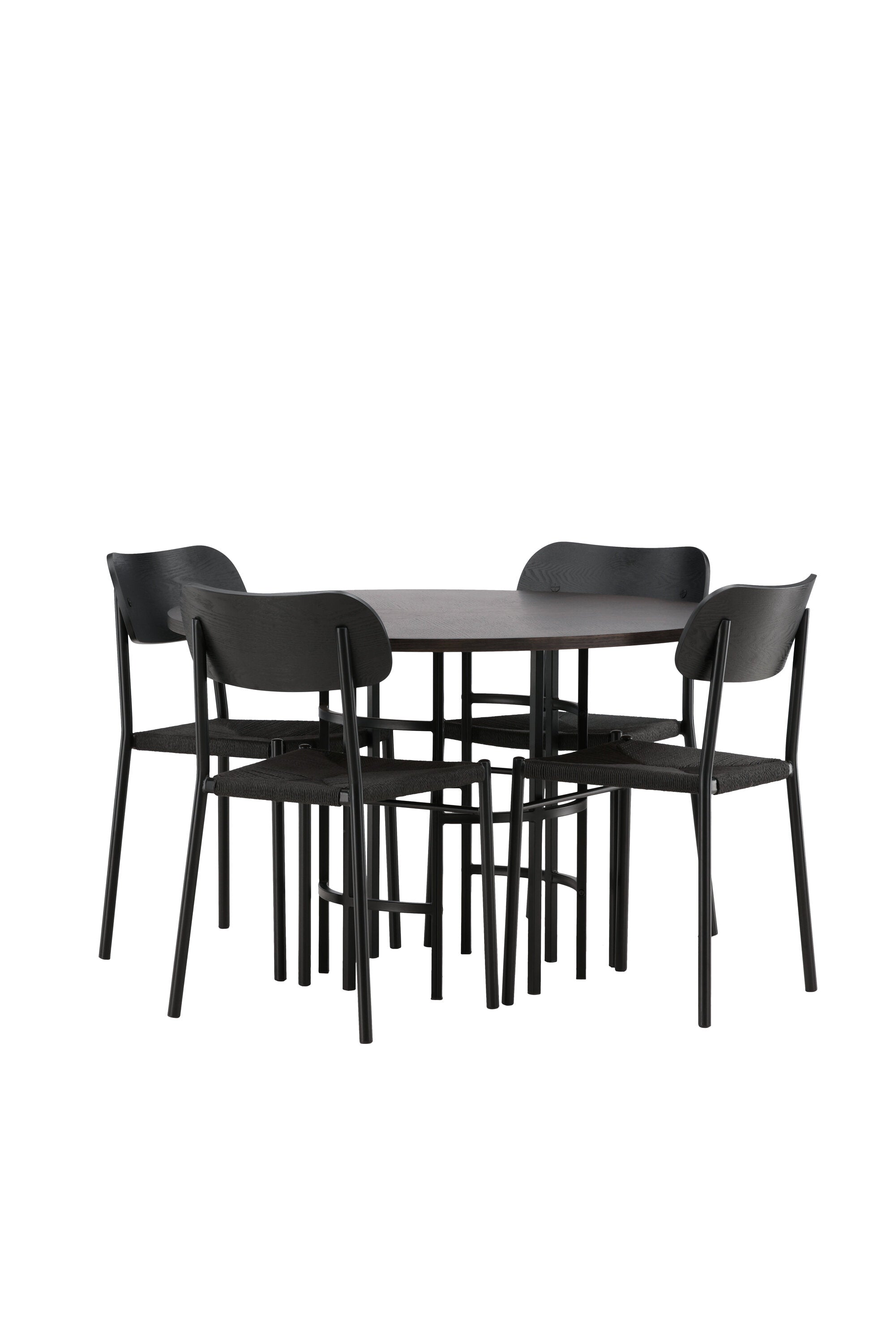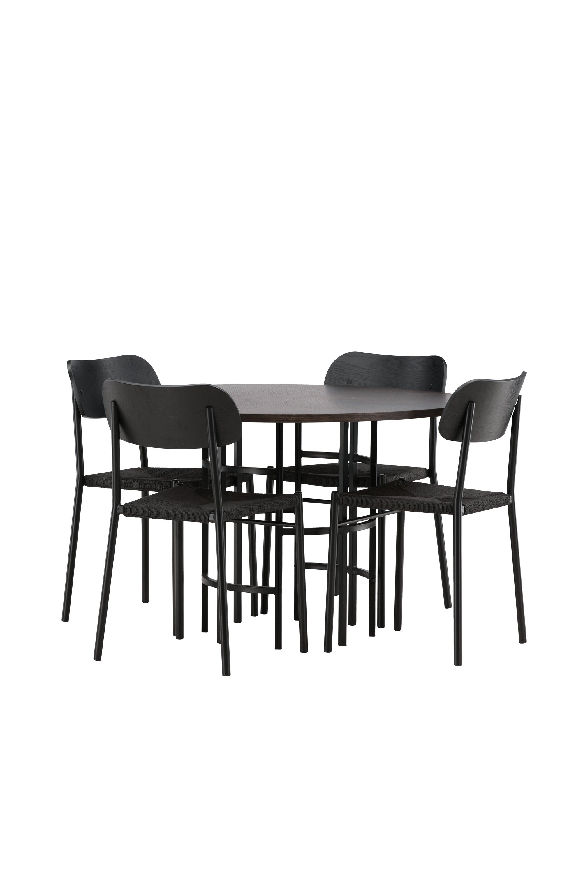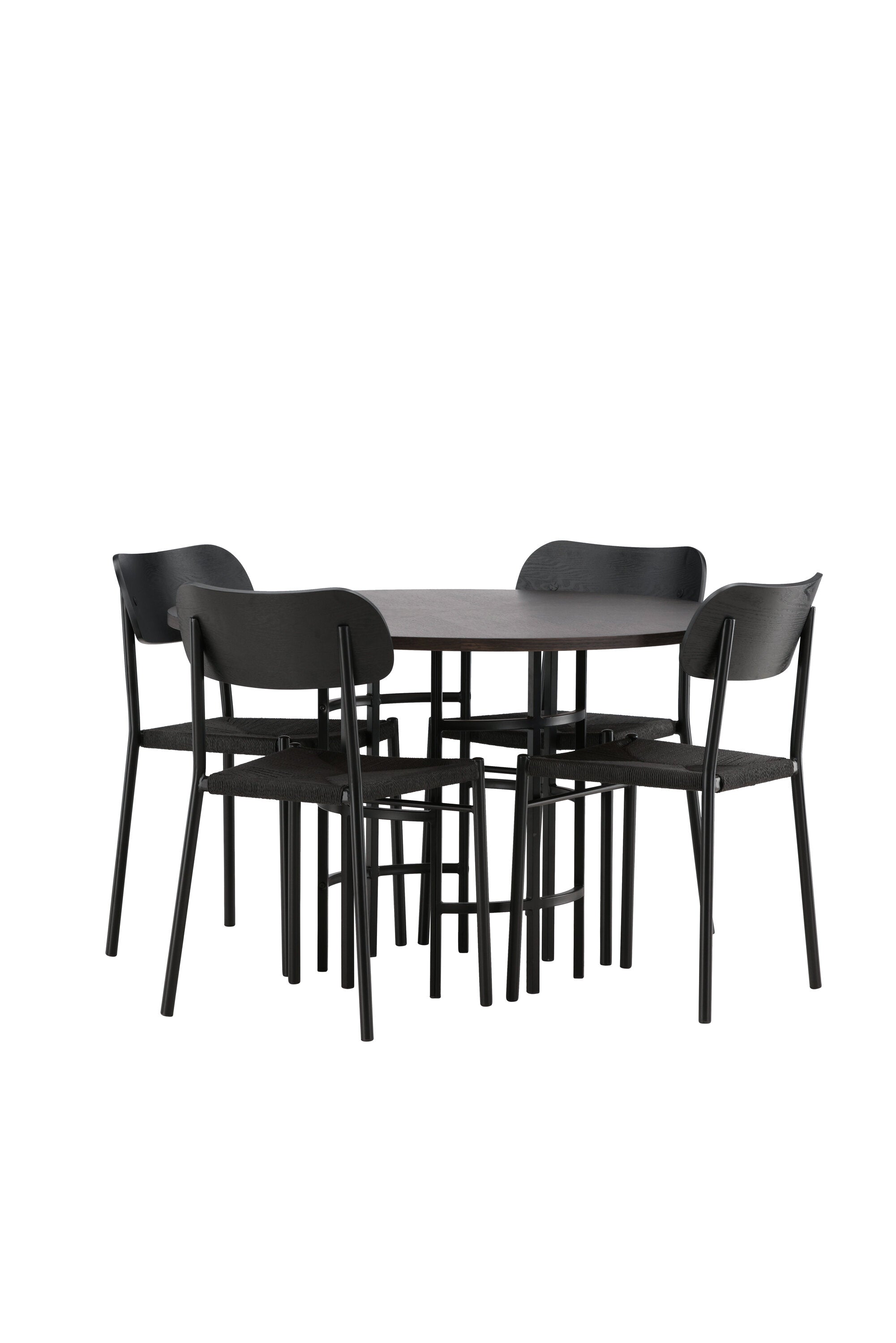 Vytvořte si okouzlující středobod v srdci vašeho domova! Máme zde naše stylové jídelní židle ze série Polly, navržené zcela podle trendů minimalistických tvarů. Zadní část je z černé MDF s dýhou, sedák z módní černé tkaniny z přírodních vláken a nohy jsou z kovu s černým práškovým nástřikem. Zde společně s naším oblíbeným jídelním stolem Copenhagen. Stůl z kolekce Furniture Fashion má krásnou hnědou desku z MDF s dýhou a ozdobnou, válcovou podnož v černém kovu. Stejně známé jako odolné vůči trendům!