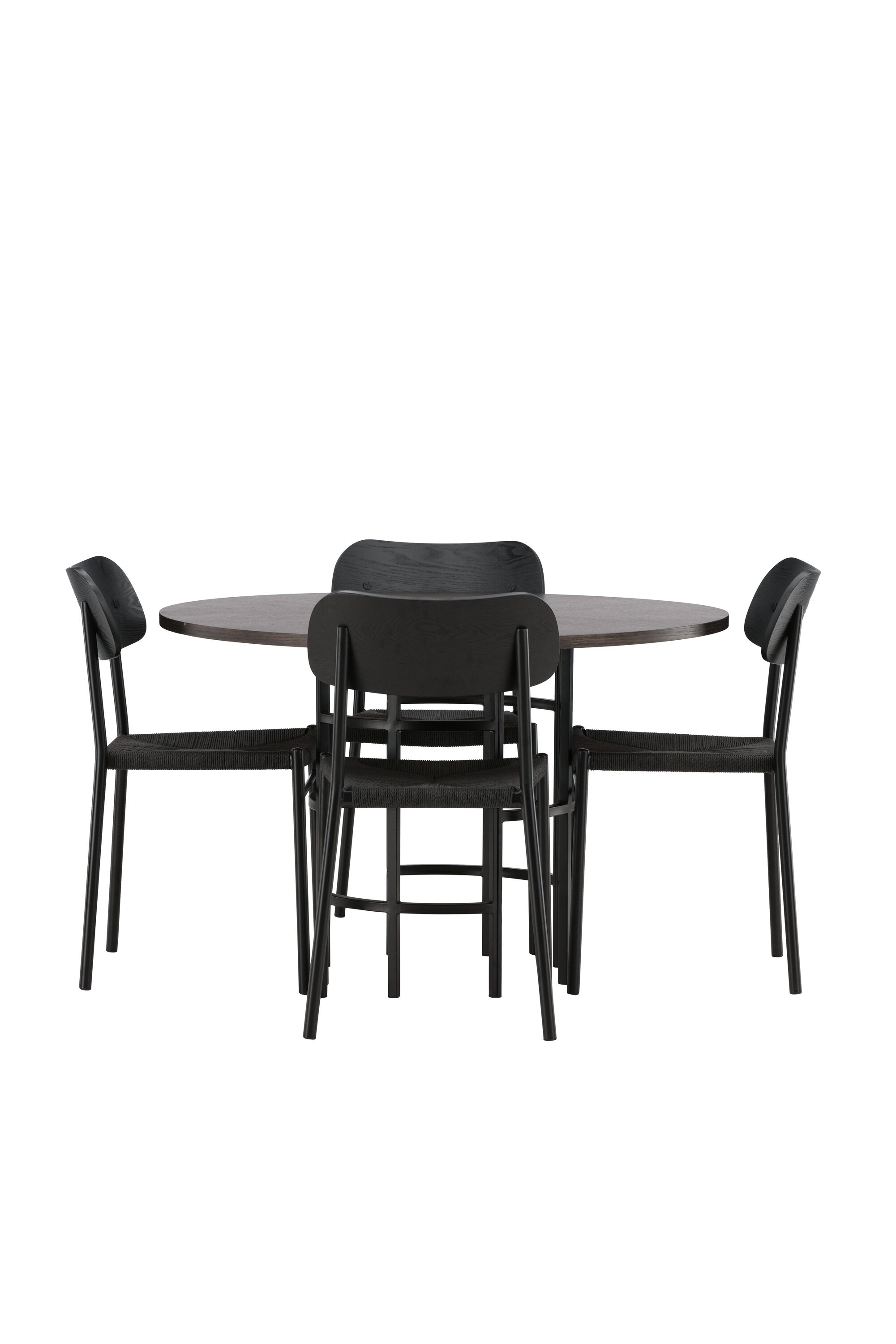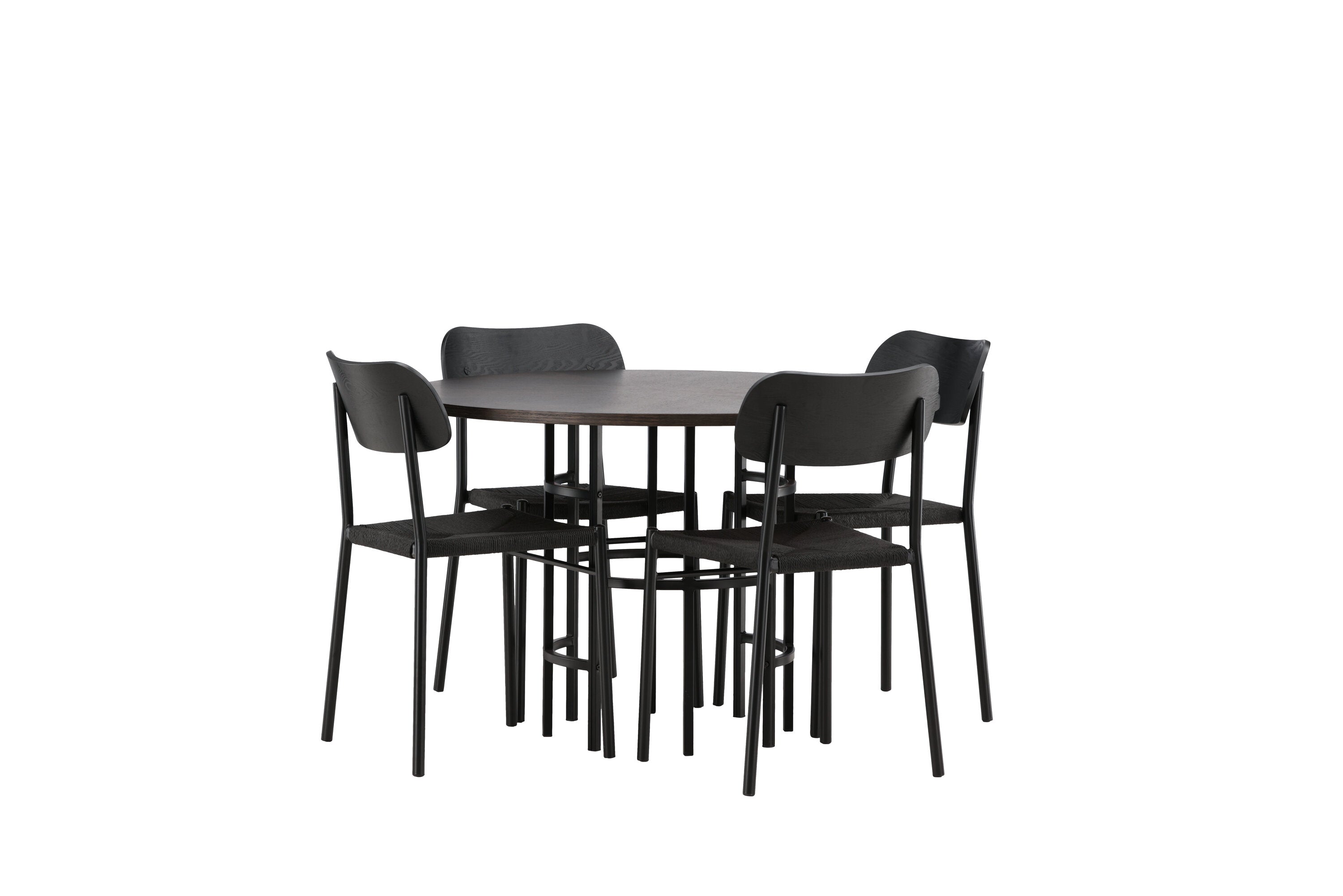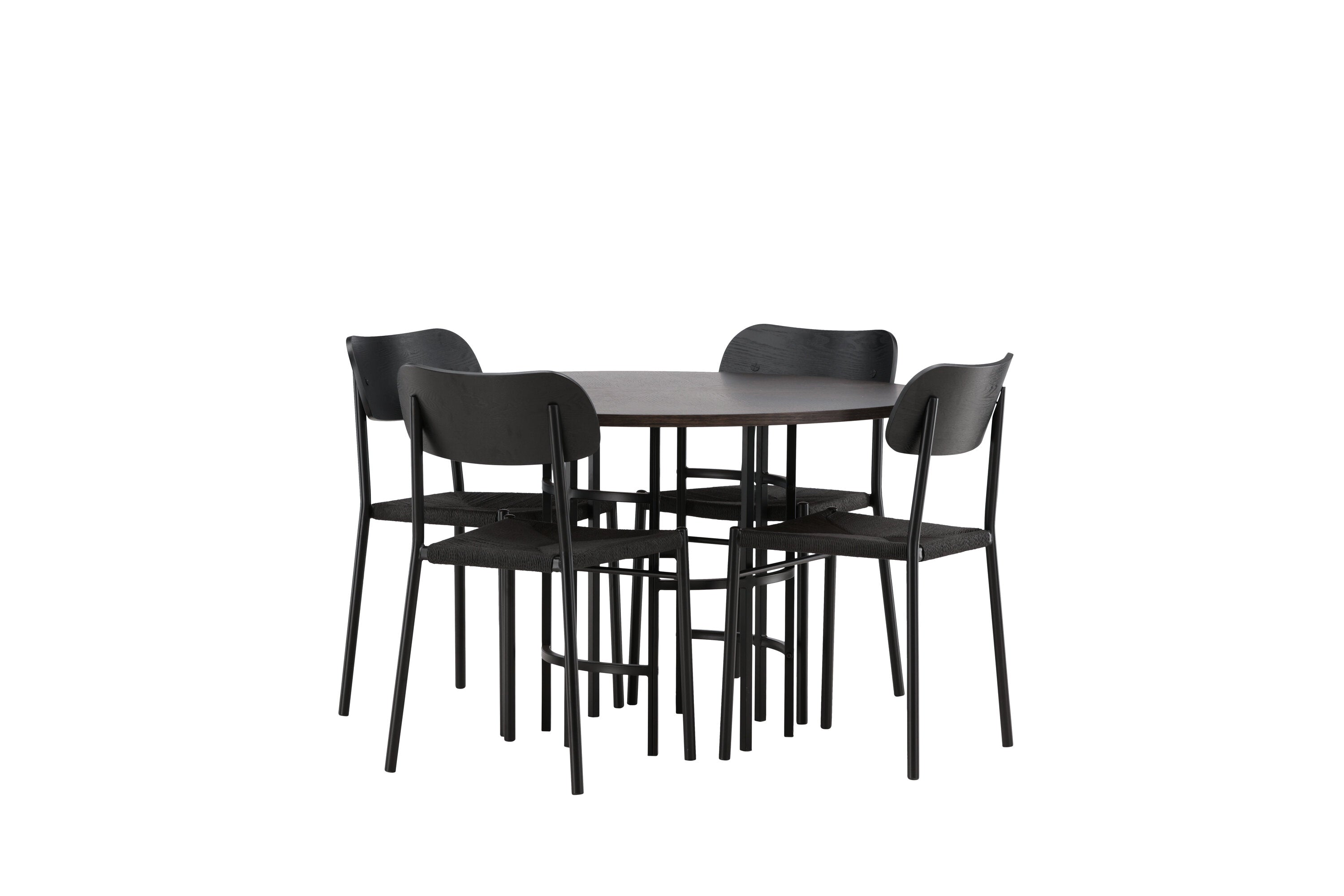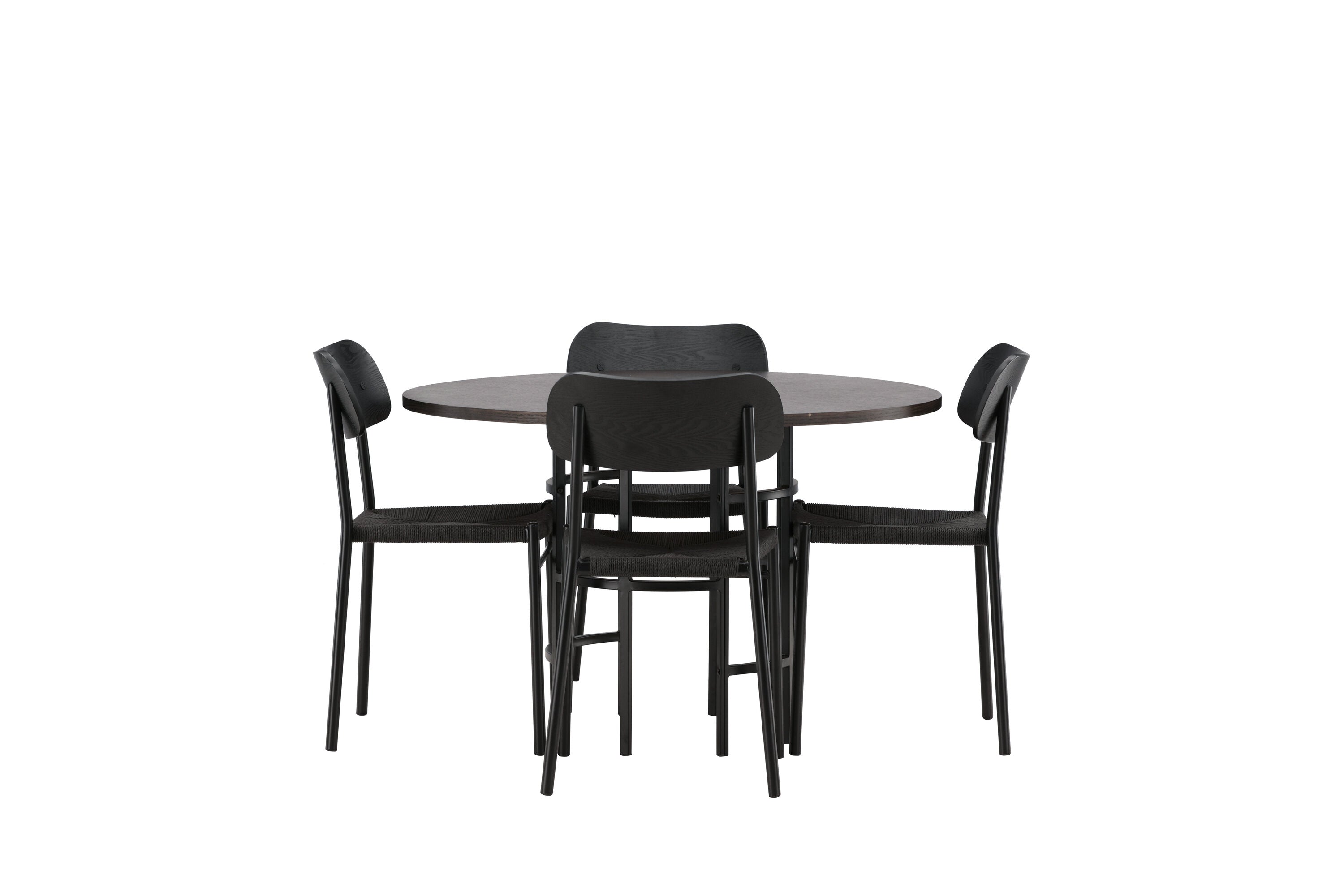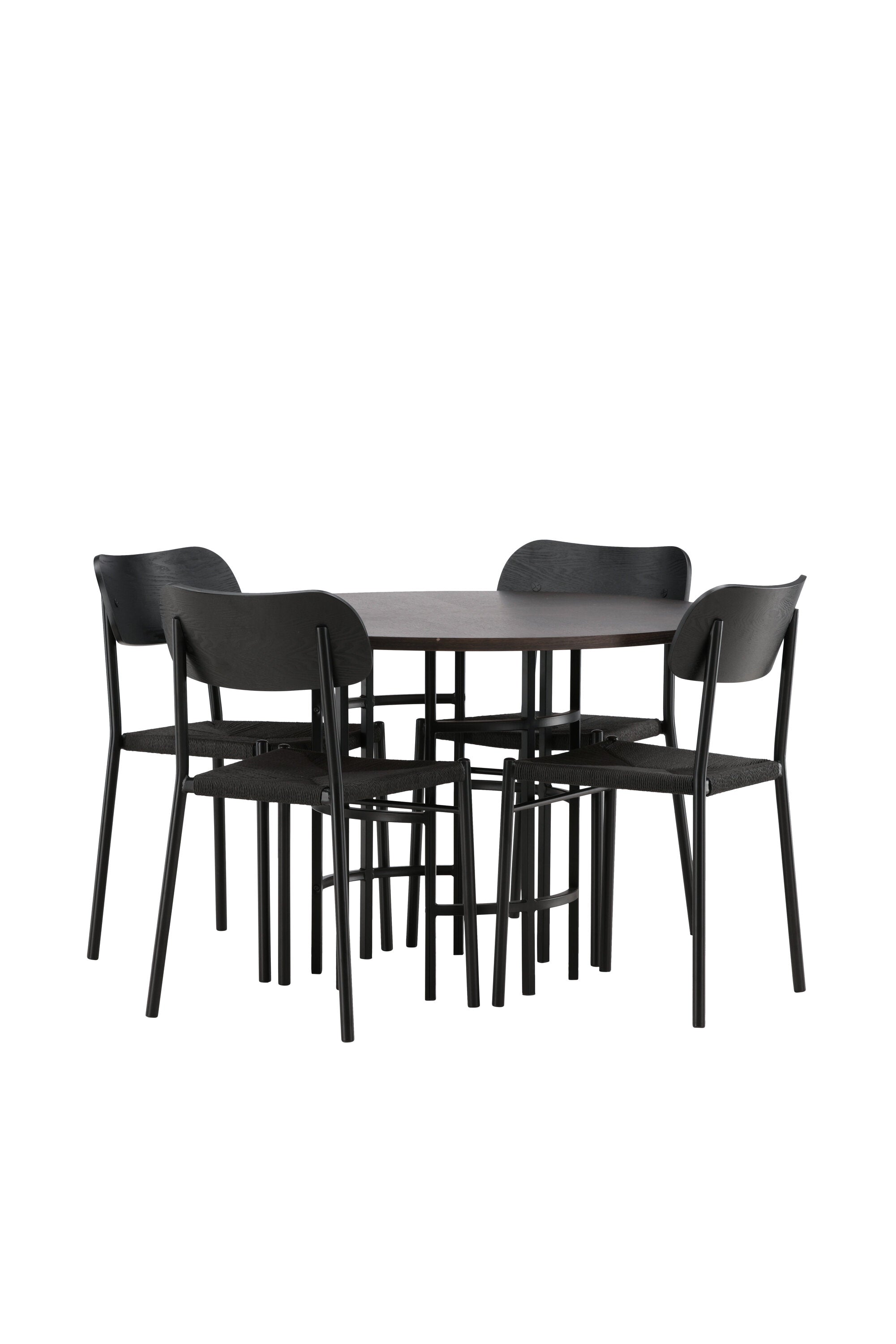 Vytvořte si okouzlující středobod v srdci vašeho domova! Máme zde naše stylové jídelní židle ze série Polly, navržené zcela podle trendů minimalistických tvarů. Zadní část je z černé MDF s dýhou, sedák z módní černé tkaniny z přírodních vláken a nohy jsou z kovu s černým práškovým nástřikem. Zde společně s naším oblíbeným jídelním stolem Copenhagen. Stůl z kolekce Furniture Fashion má krásnou hnědou desku z MDF s dýhou a ozdobnou, válcovou podnož v černém kovu. Stejně známé jako odolné vůči trendům!