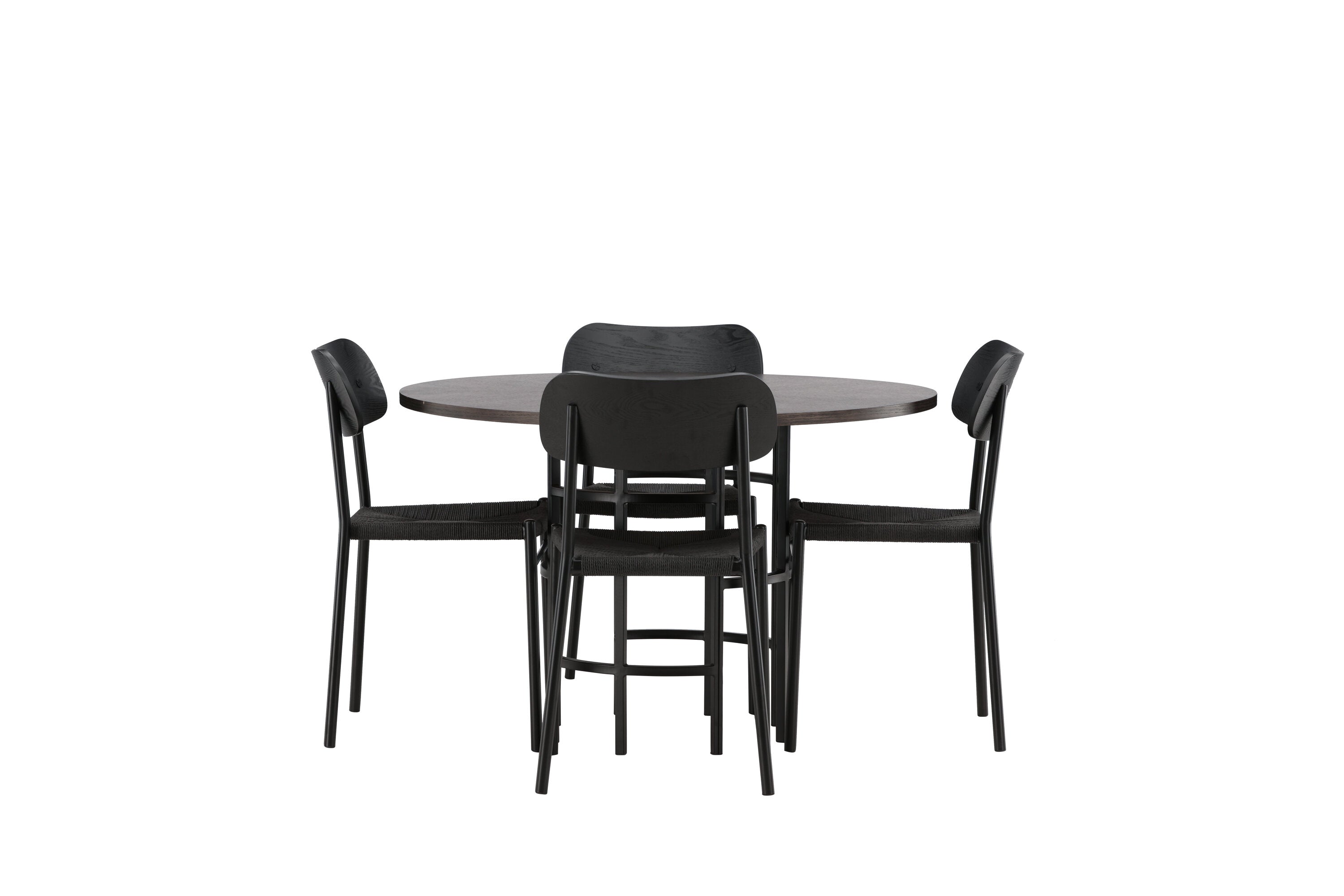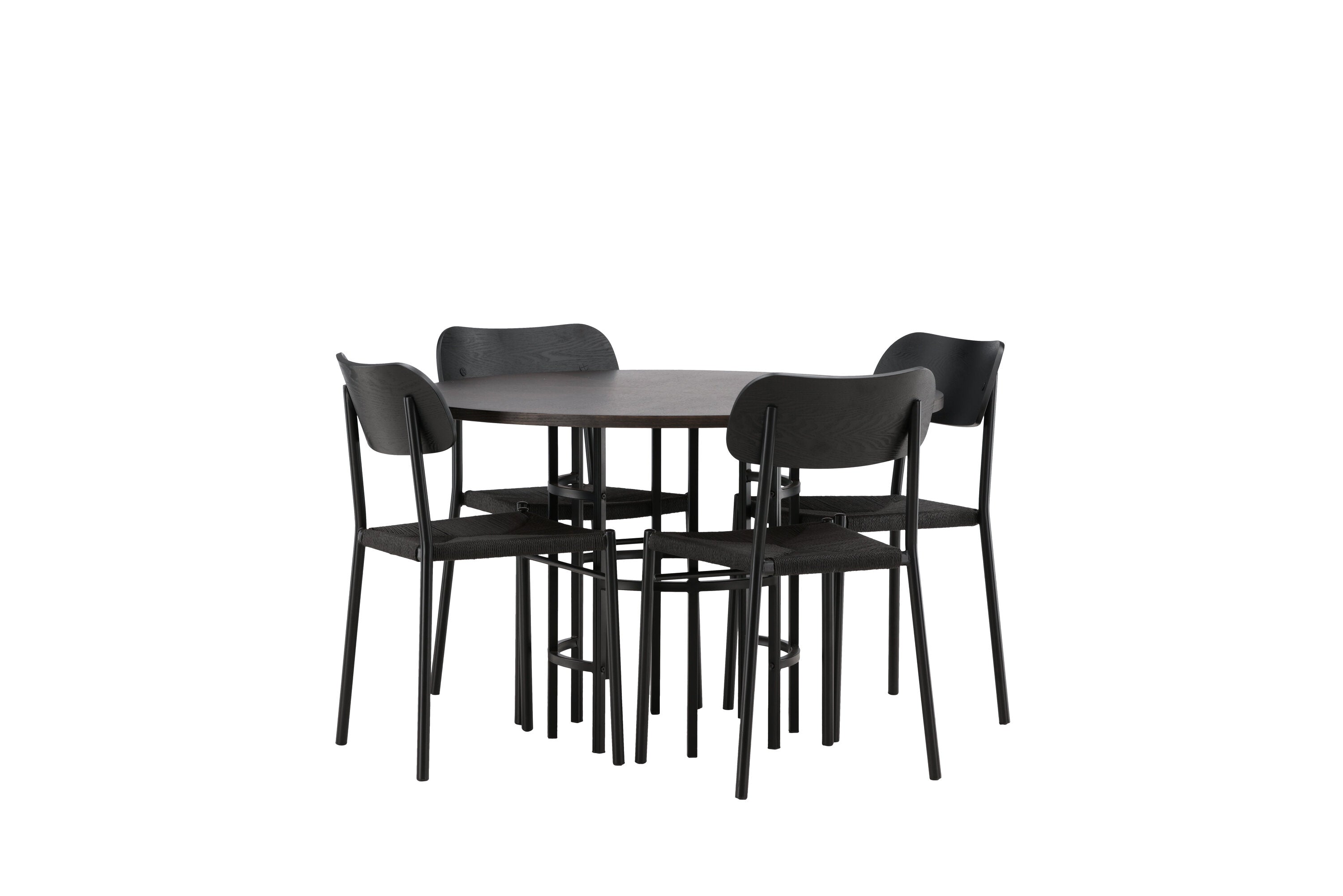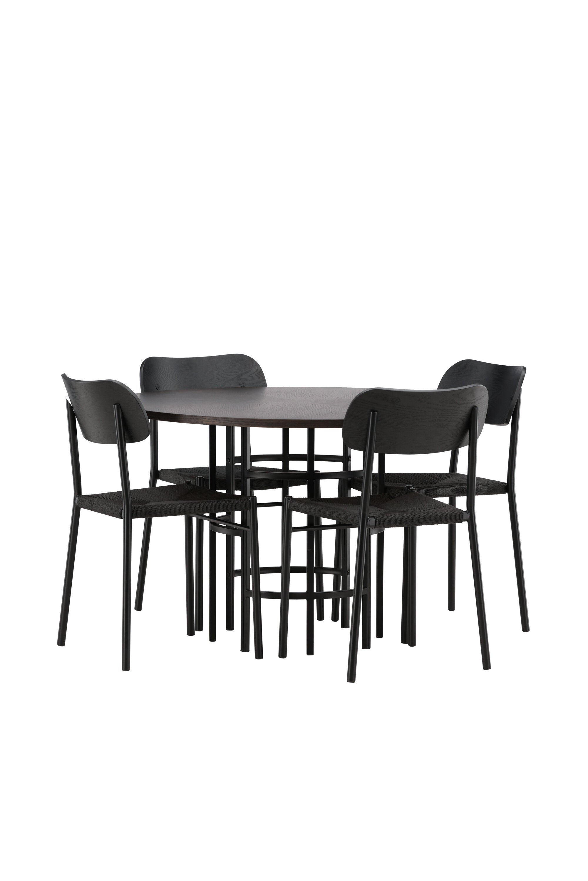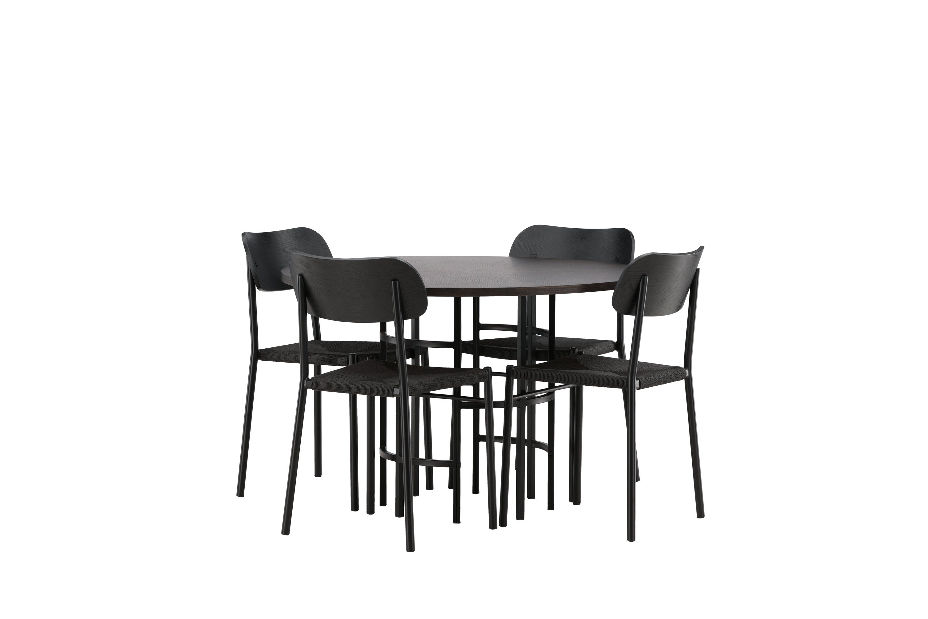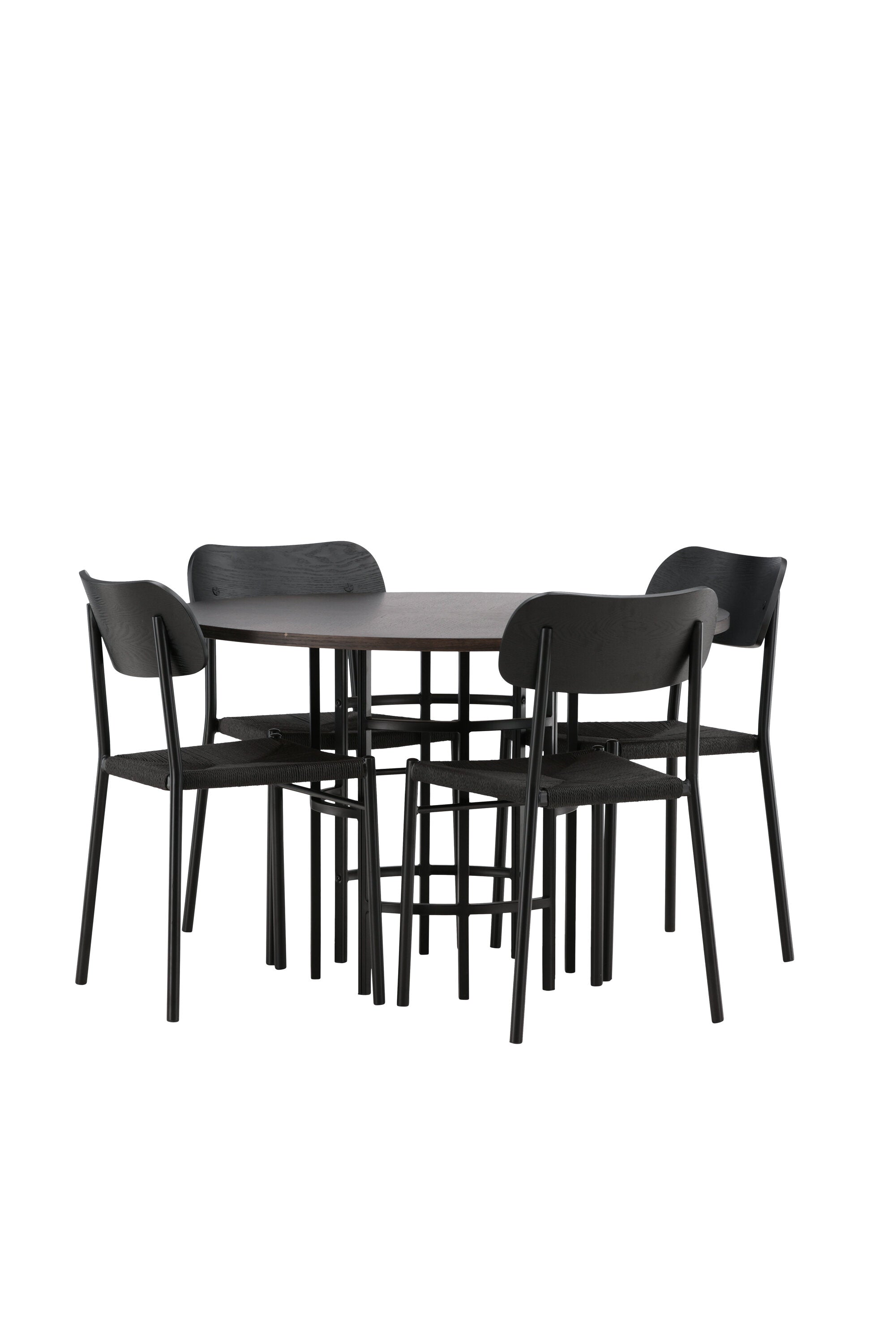 Vytvořte si okouzlující středobod v srdci vašeho domova! Máme zde naše stylové jídelní židle ze série Polly, navržené zcela podle trendů minimalistických tvarů. Zadní část je z černé MDF s dýhou, sedák z módní černé tkaniny z přírodních vláken a nohy jsou z kovu s černým práškovým nástřikem. Zde společně s naším oblíbeným jídelním stolem Copenhagen. Stůl z kolekce Furniture Fashion má krásnou hnědou desku z MDF s dýhou a ozdobnou, válcovou podnož v černém kovu. Stejně známé jako odolné vůči trendům!