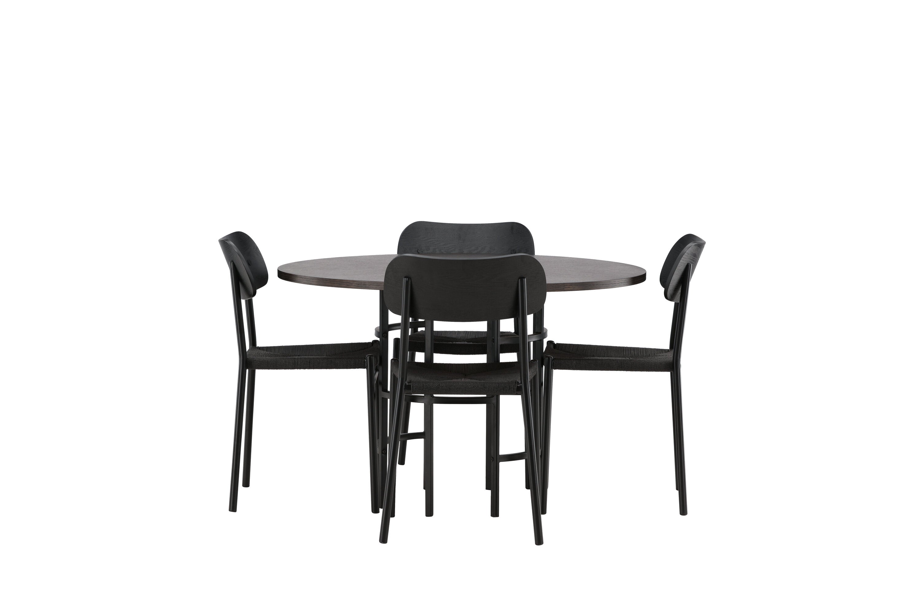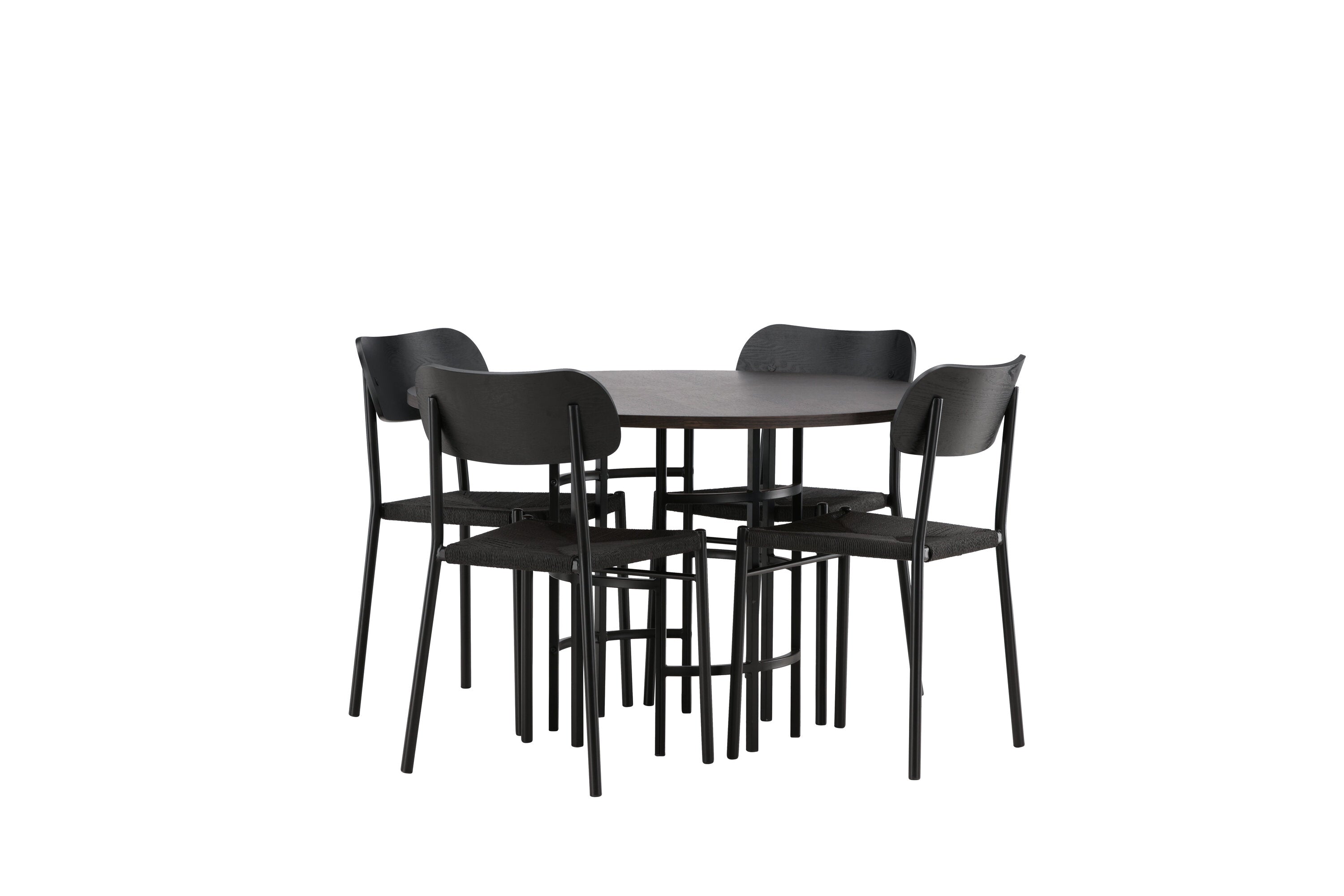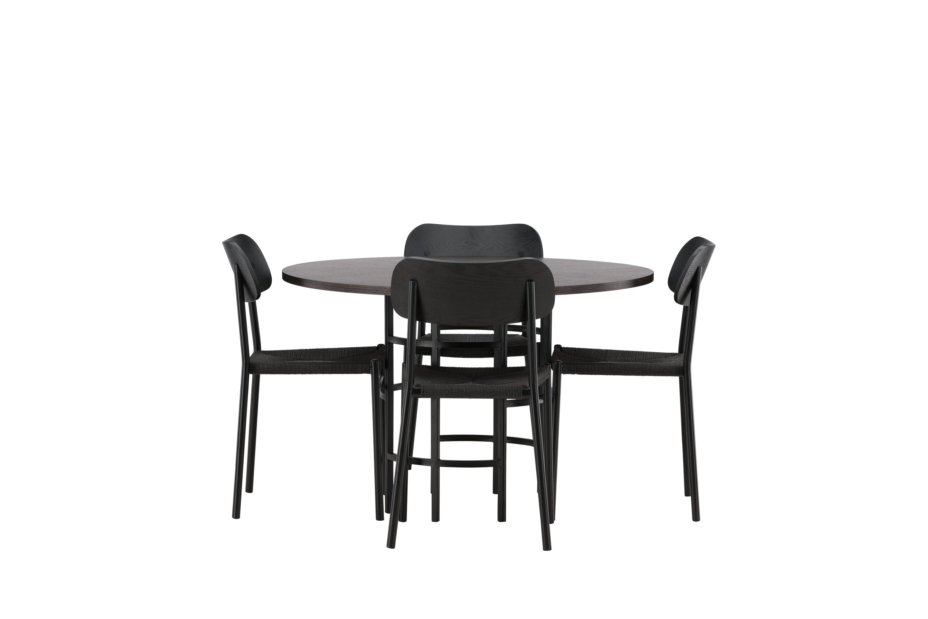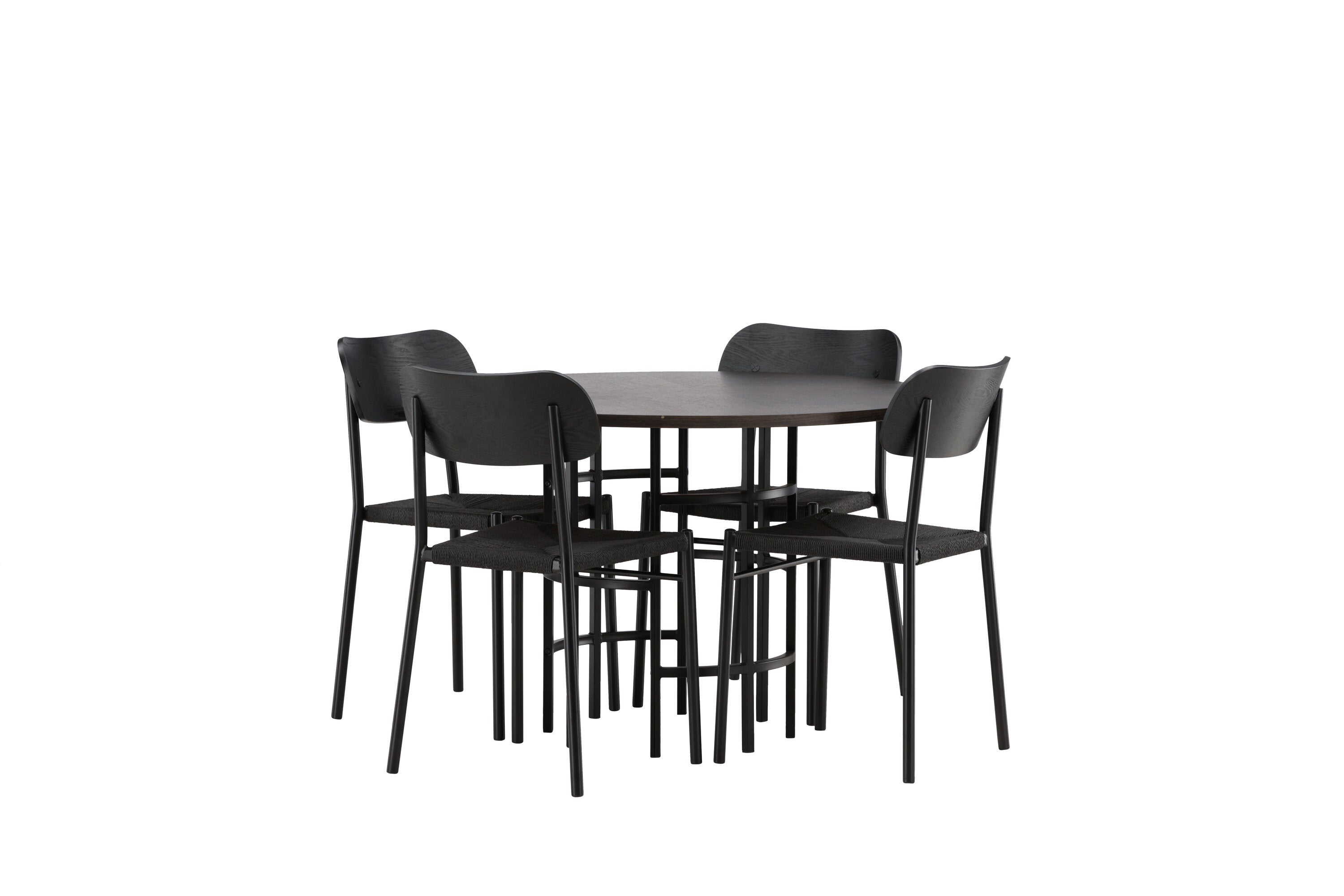 Vytvořte si okouzlující středobod v srdci vašeho domova! Máme zde naše stylové jídelní židle ze série Polly, navržené zcela podle trendů minimalistických tvarů. Zadní část je z černé MDF s dýhou, sedák z módní černé tkaniny z přírodních vláken a nohy jsou z kovu s černým práškovým nástřikem. Zde společně s naším oblíbeným jídelním stolem Copenhagen. Stůl z kolekce Furniture Fashion má krásnou hnědou desku z MDF s dýhou a ozdobnou, válcovou podnož v černém kovu. Stejně známé jako odolné vůči trendům!