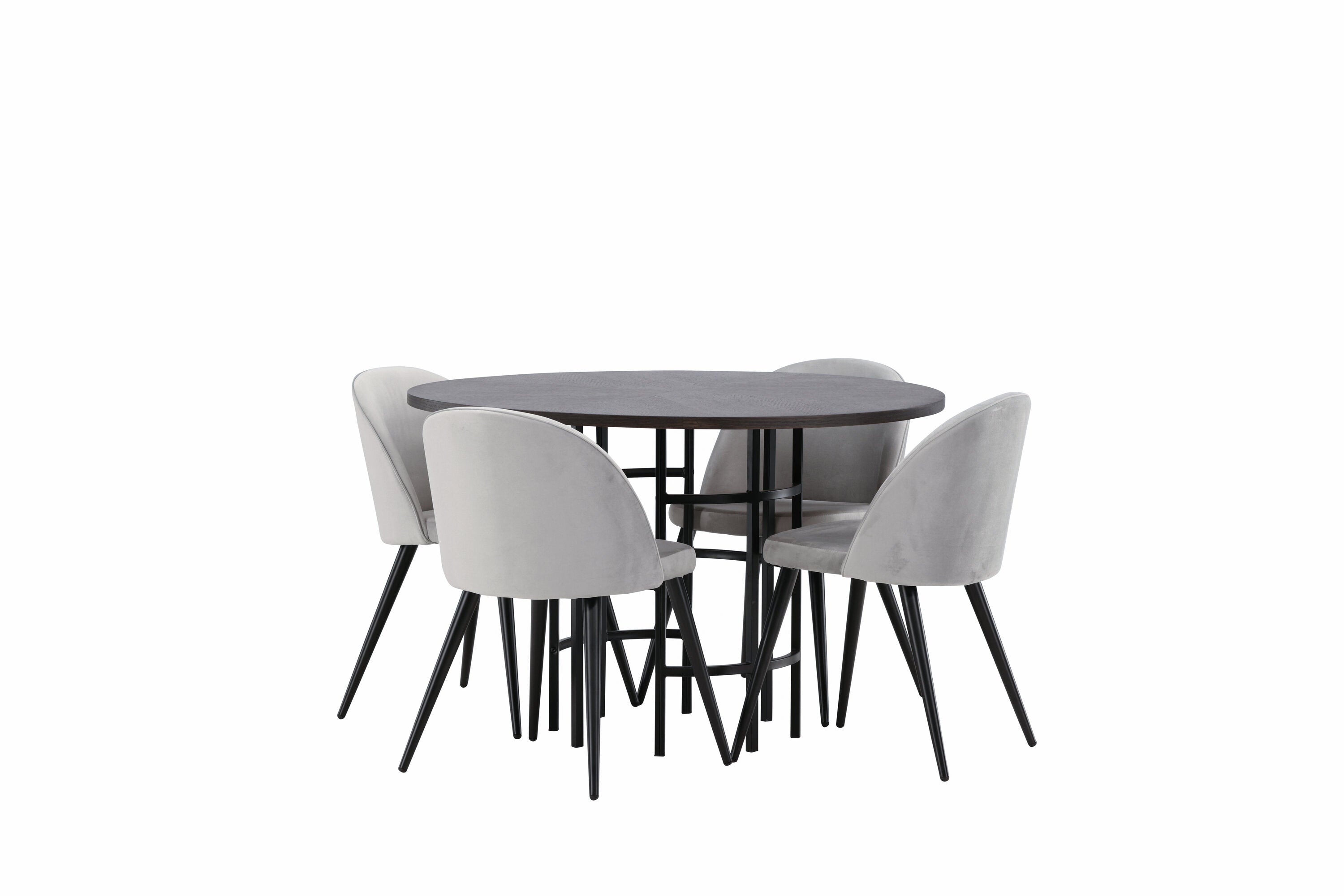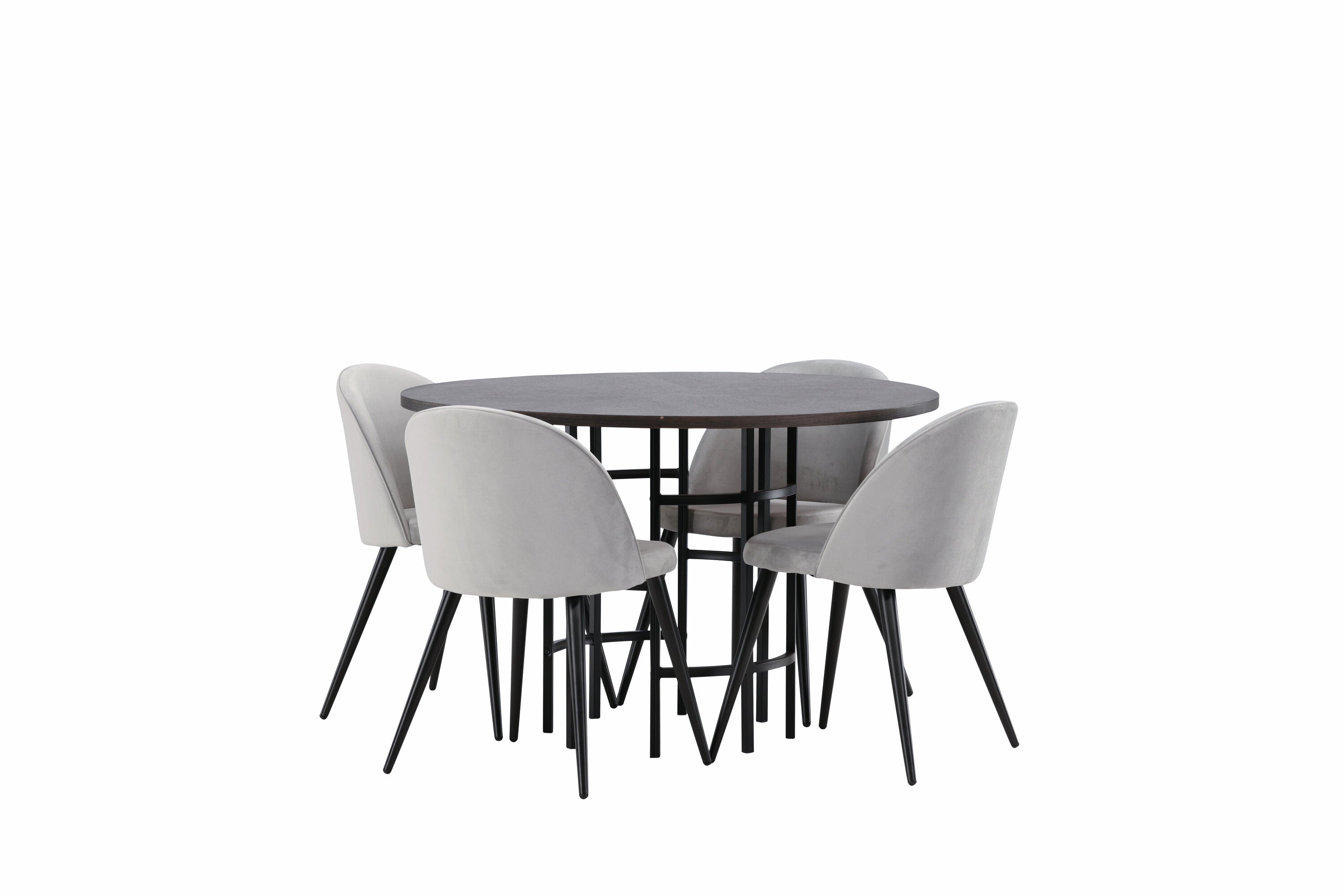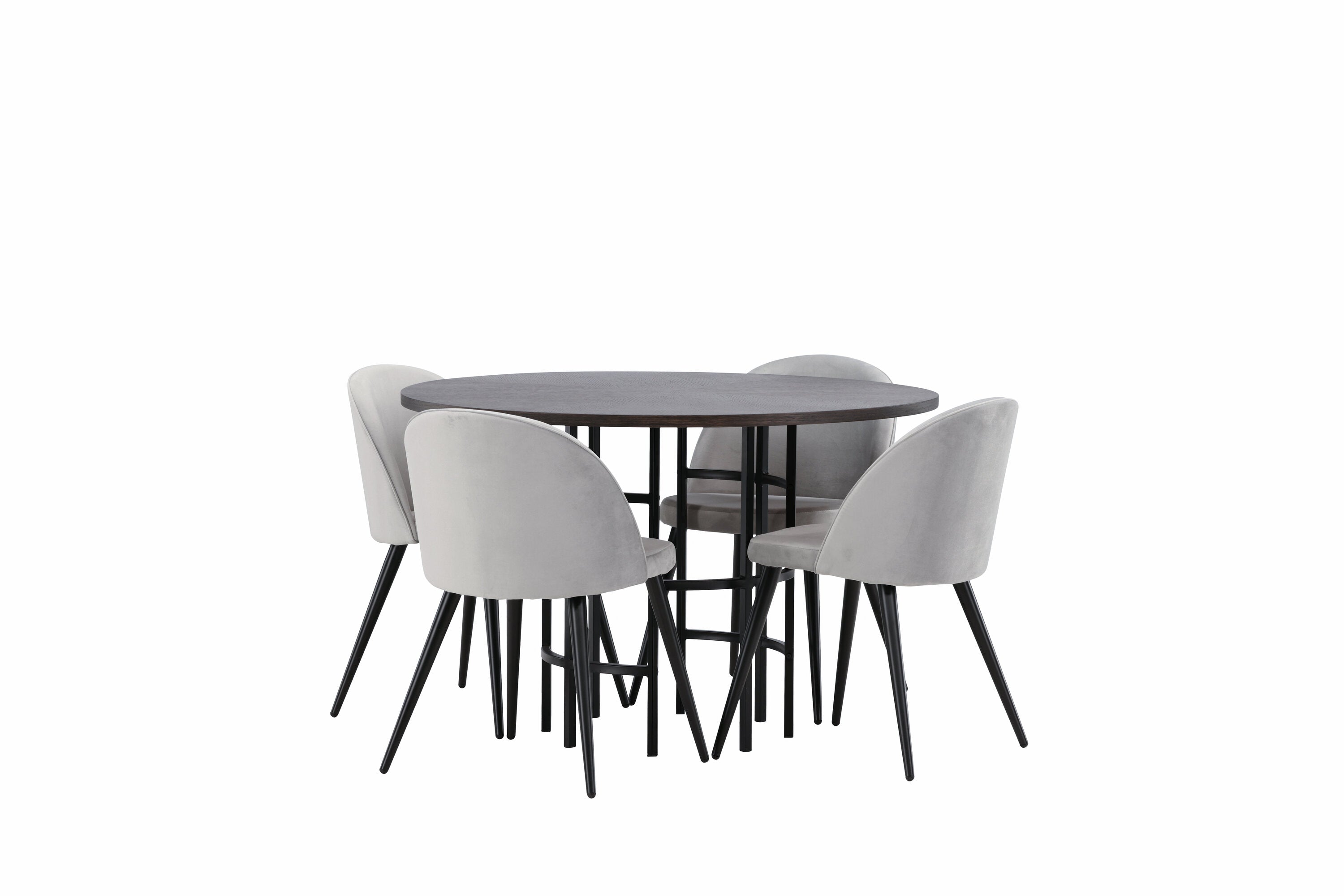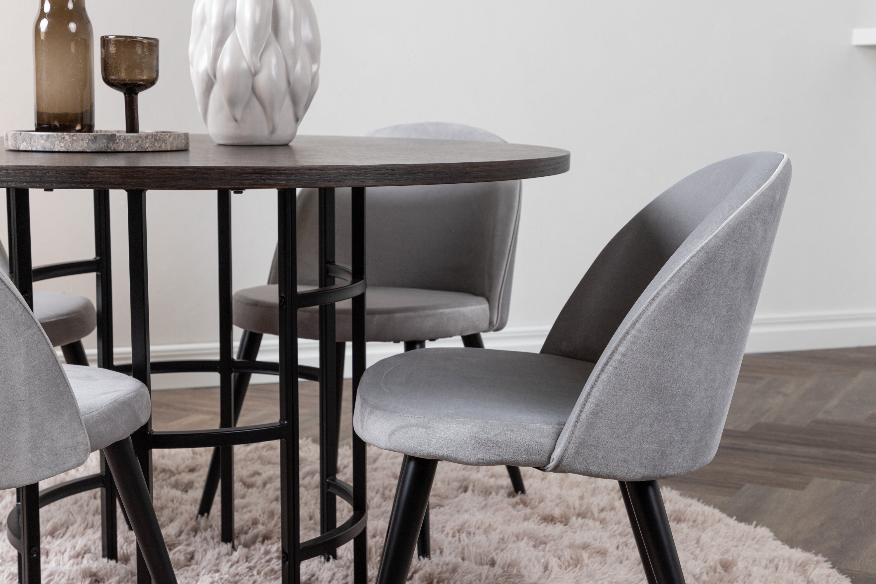 Jídelní skupina se všemi správnými funkcemi! Tento trendový jídelní stůl ze série Copenhagen patří do kolekce Furniture Fashion a má krásnou hnědou desku z MDF s dýhou a ozdobnou válcovou základnu z černého kovu. Zde společně s moderním křeslem dream ze série Velvet ve stylové šedé barvě. Tato jídelní židle má celočalouněný design s mírně zaobleným opěradlem a sedákem z měkké sametové látky a nohami z černého kovu s práškovým nástřikem. Vytvořte okouzlující středobod, kterým shromáždíte celou rodinu!