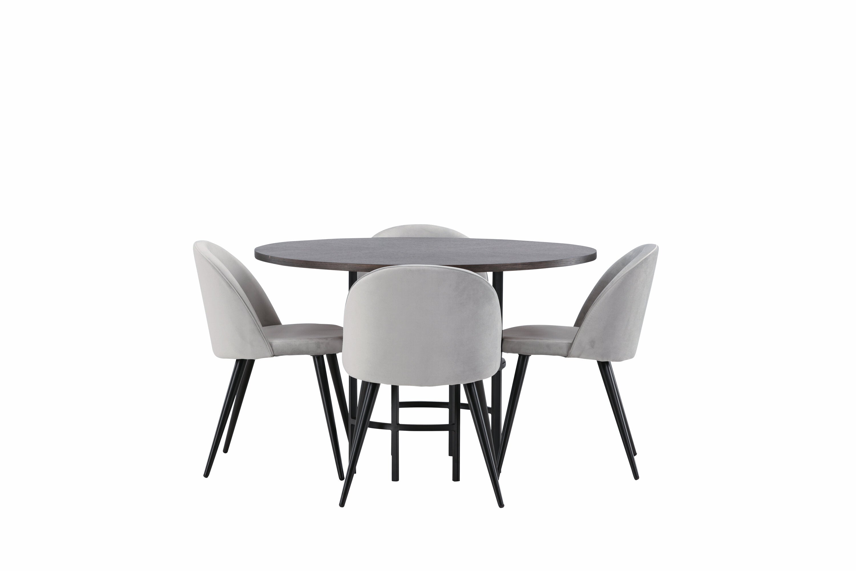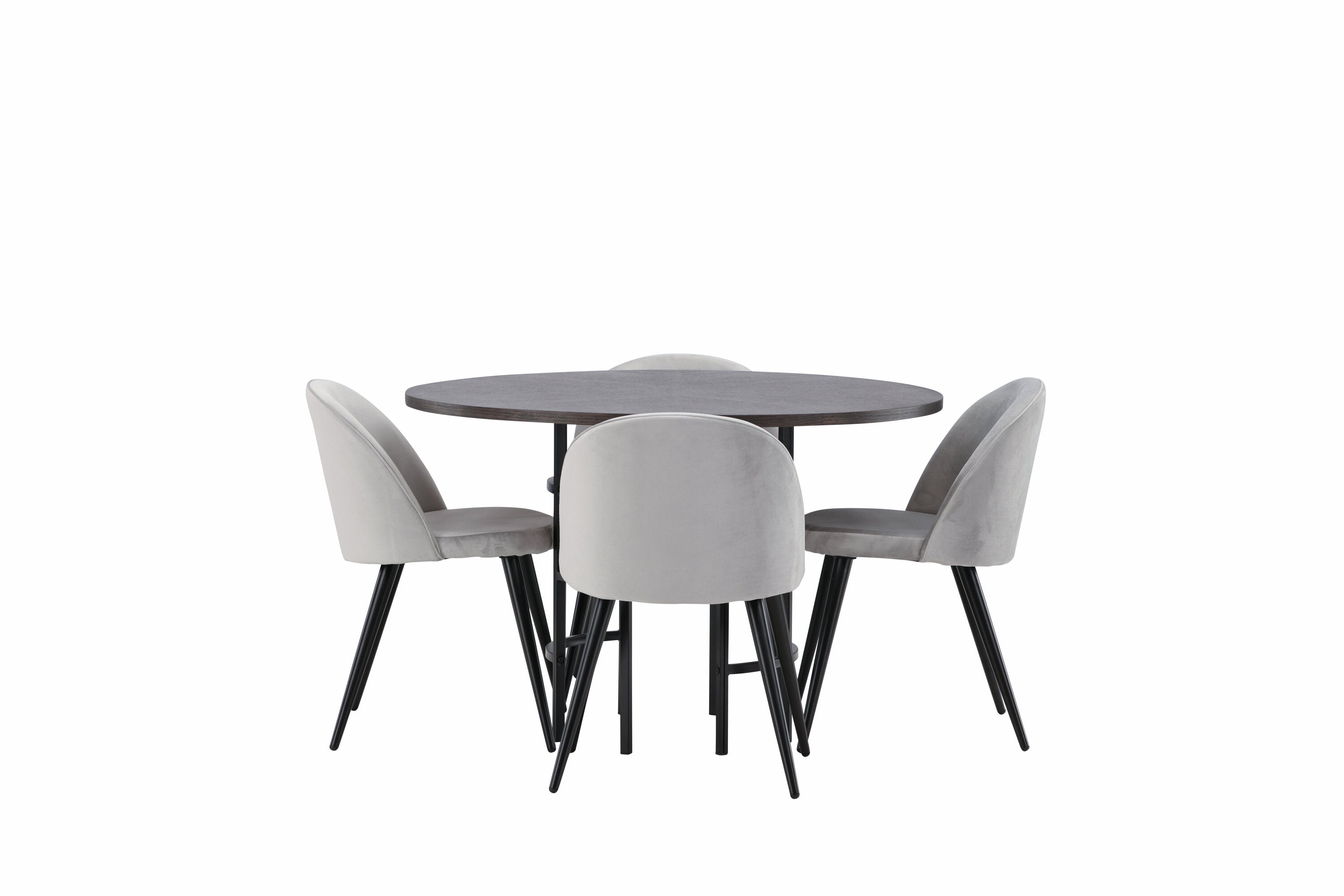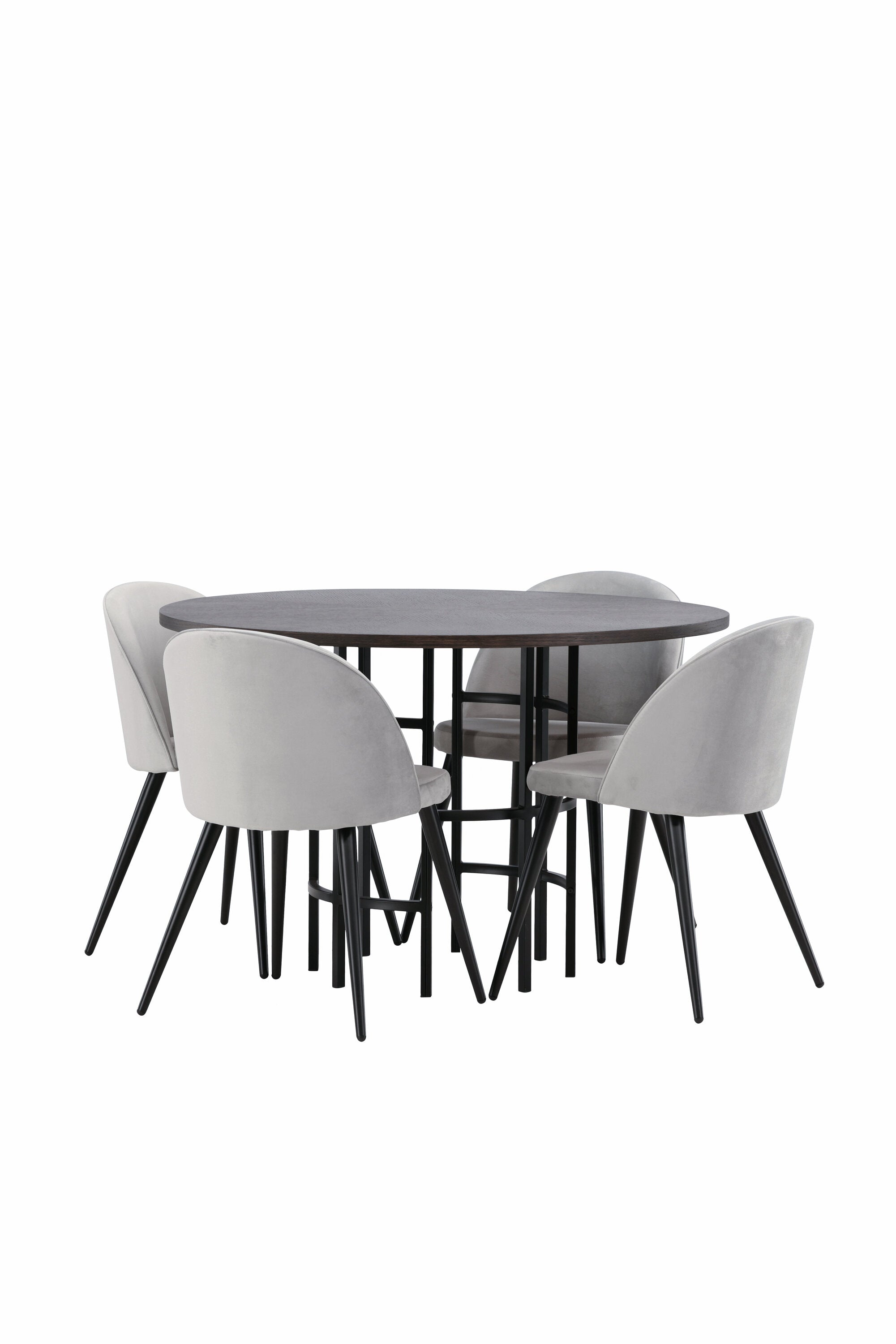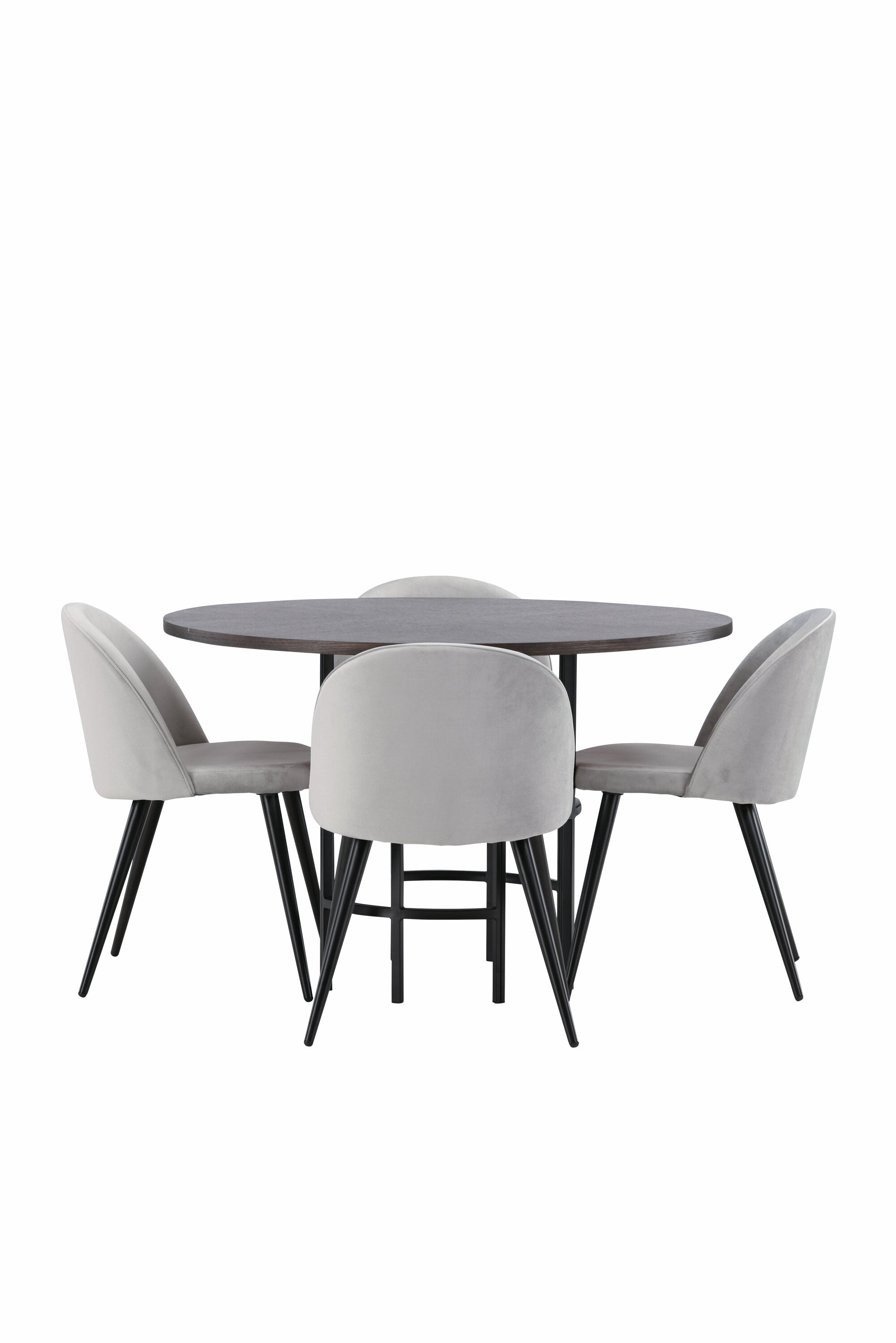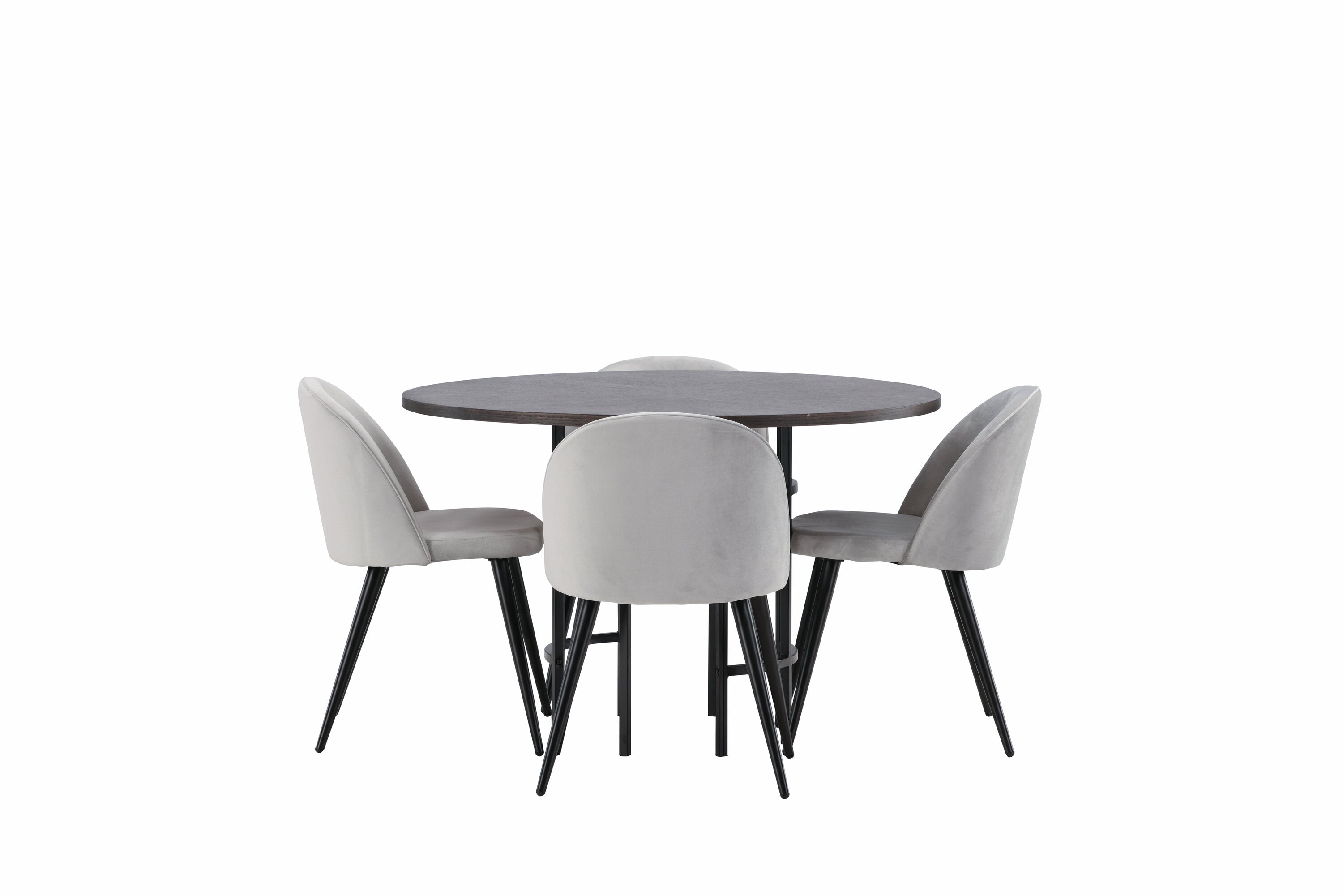 Jídelní skupina se všemi správnými funkcemi! Tento trendový jídelní stůl ze série Copenhagen patří do kolekce Furniture Fashion a má krásnou hnědou desku z MDF s dýhou a ozdobnou válcovou základnu z černého kovu. Zde společně s moderním křeslem dream ze série Velvet ve stylové šedé barvě. Tato jídelní židle má celočalouněný design s mírně zaobleným opěradlem a sedákem z měkké sametové látky a nohami z černého kovu s práškovým nástřikem. Vytvořte okouzlující středobod, kterým shromáždíte celou rodinu!