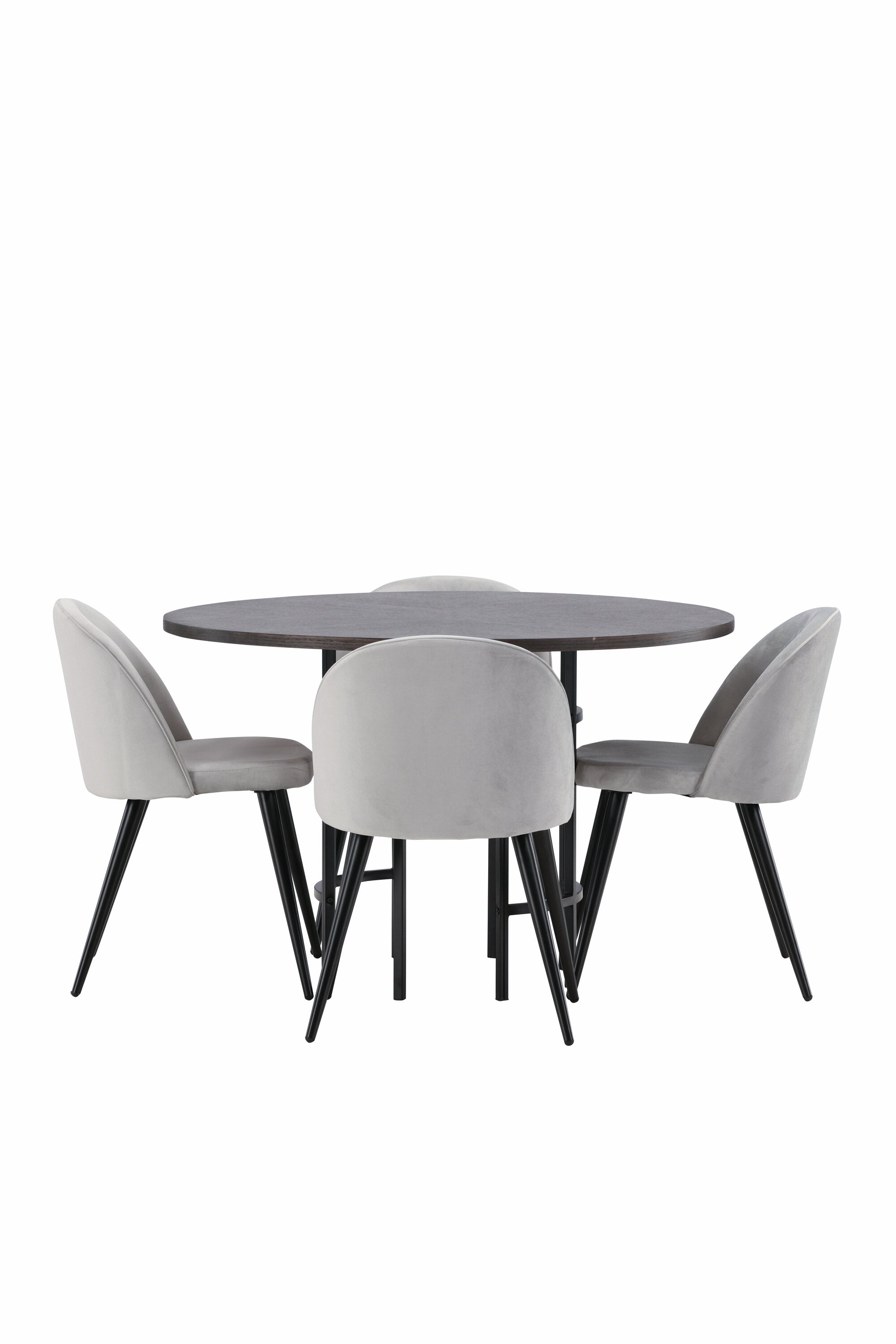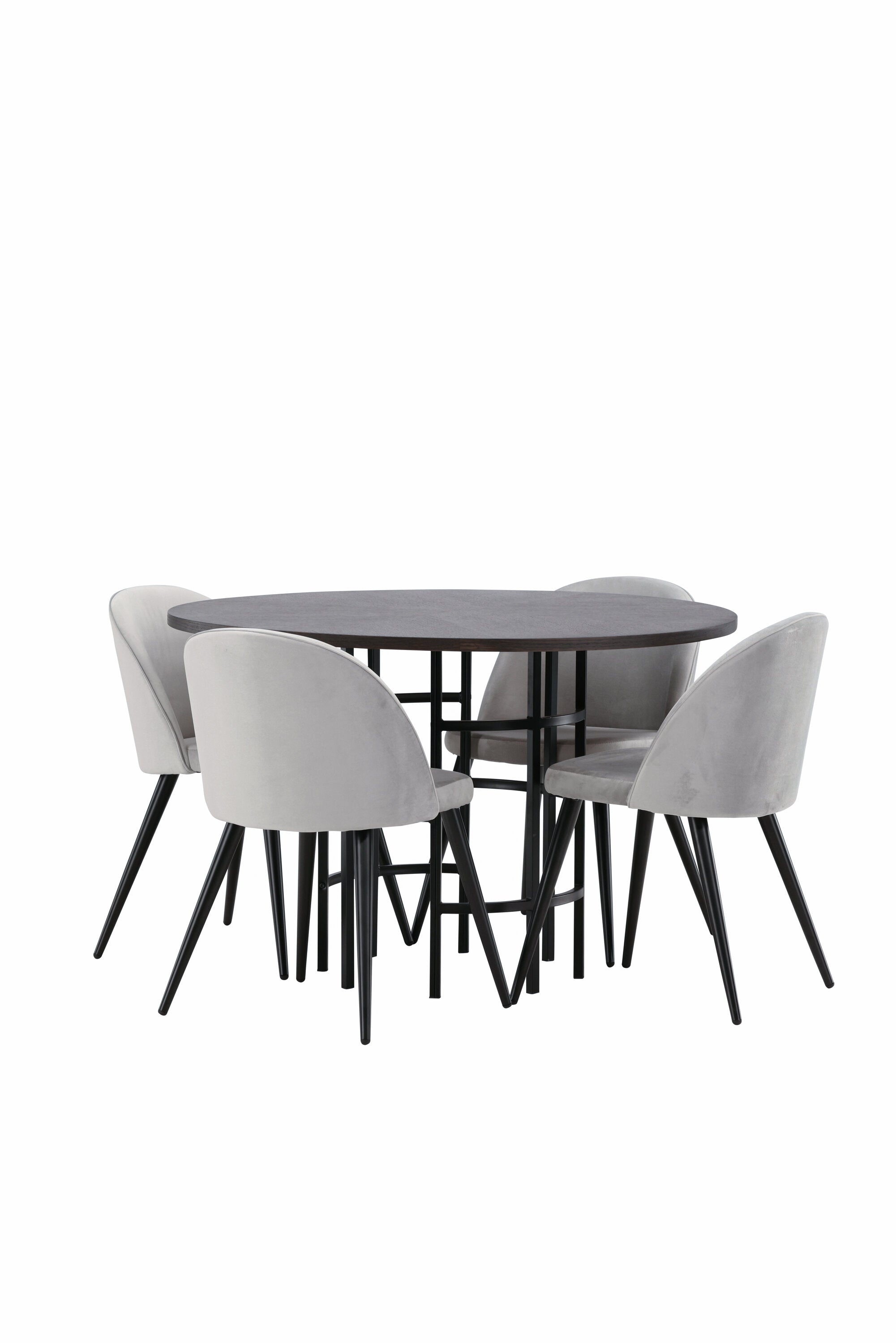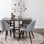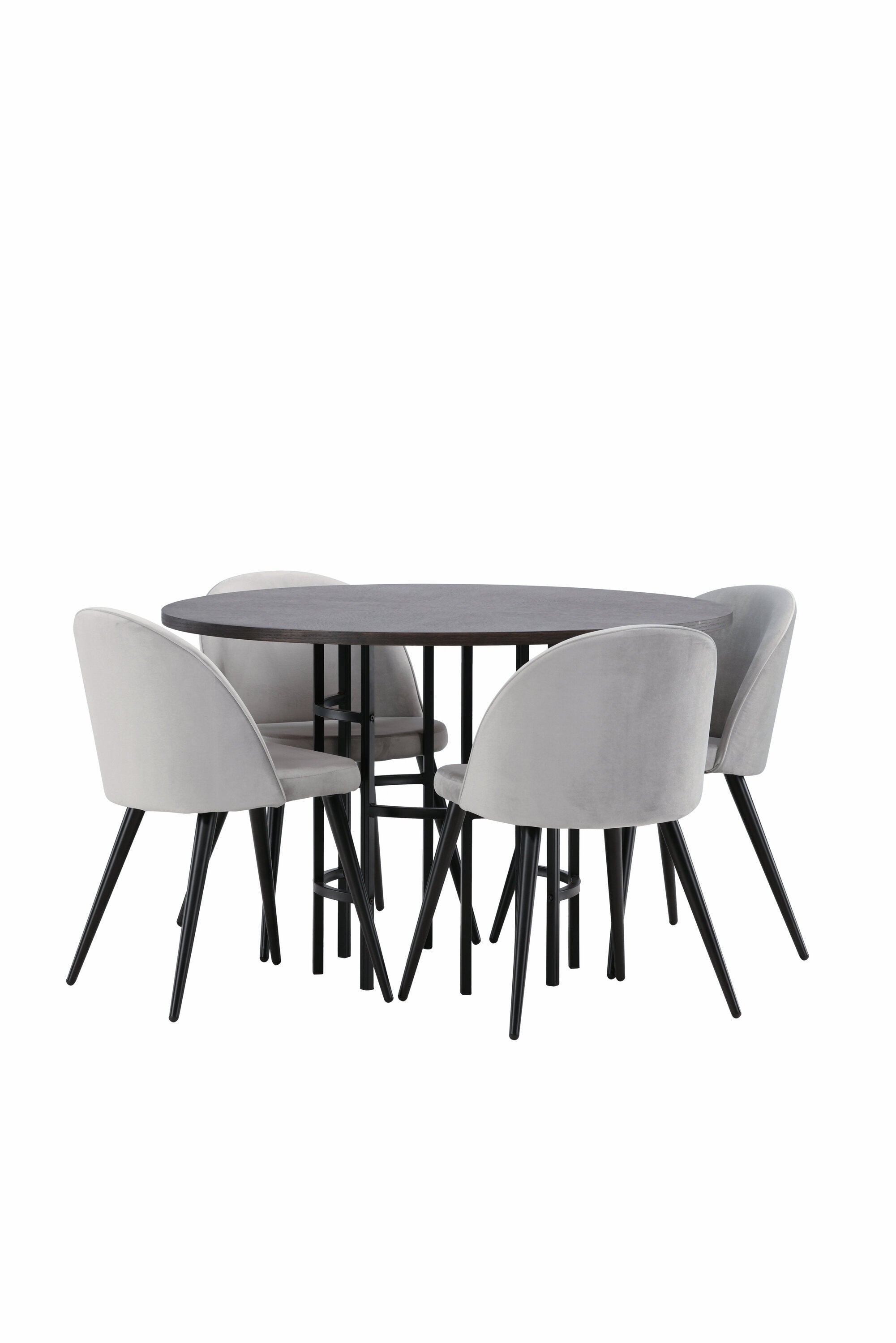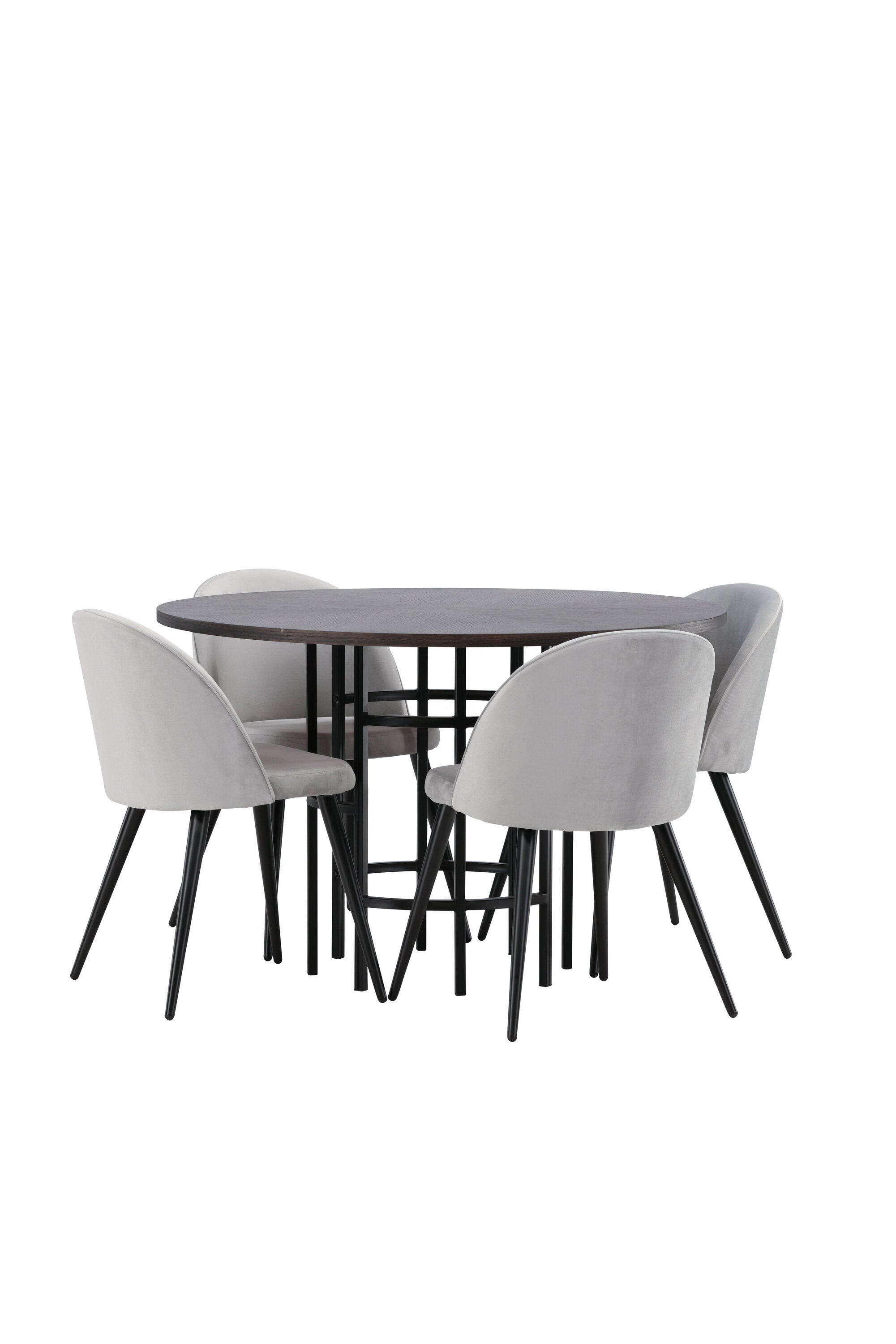 Jídelní skupina se všemi správnými funkcemi! Tento trendový jídelní stůl ze série Copenhagen patří do kolekce Furniture Fashion a má krásnou hnědou desku z MDF s dýhou a ozdobnou válcovou základnu z černého kovu. Zde společně s moderním křeslem dream ze série Velvet ve stylové šedé barvě. Tato jídelní židle má celočalouněný design s mírně zaobleným opěradlem a sedákem z měkké sametové látky a nohami z černého kovu s práškovým nástřikem. Vytvořte okouzlující středobod, kterým shromáždíte celou rodinu!