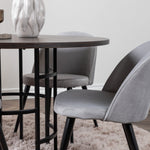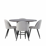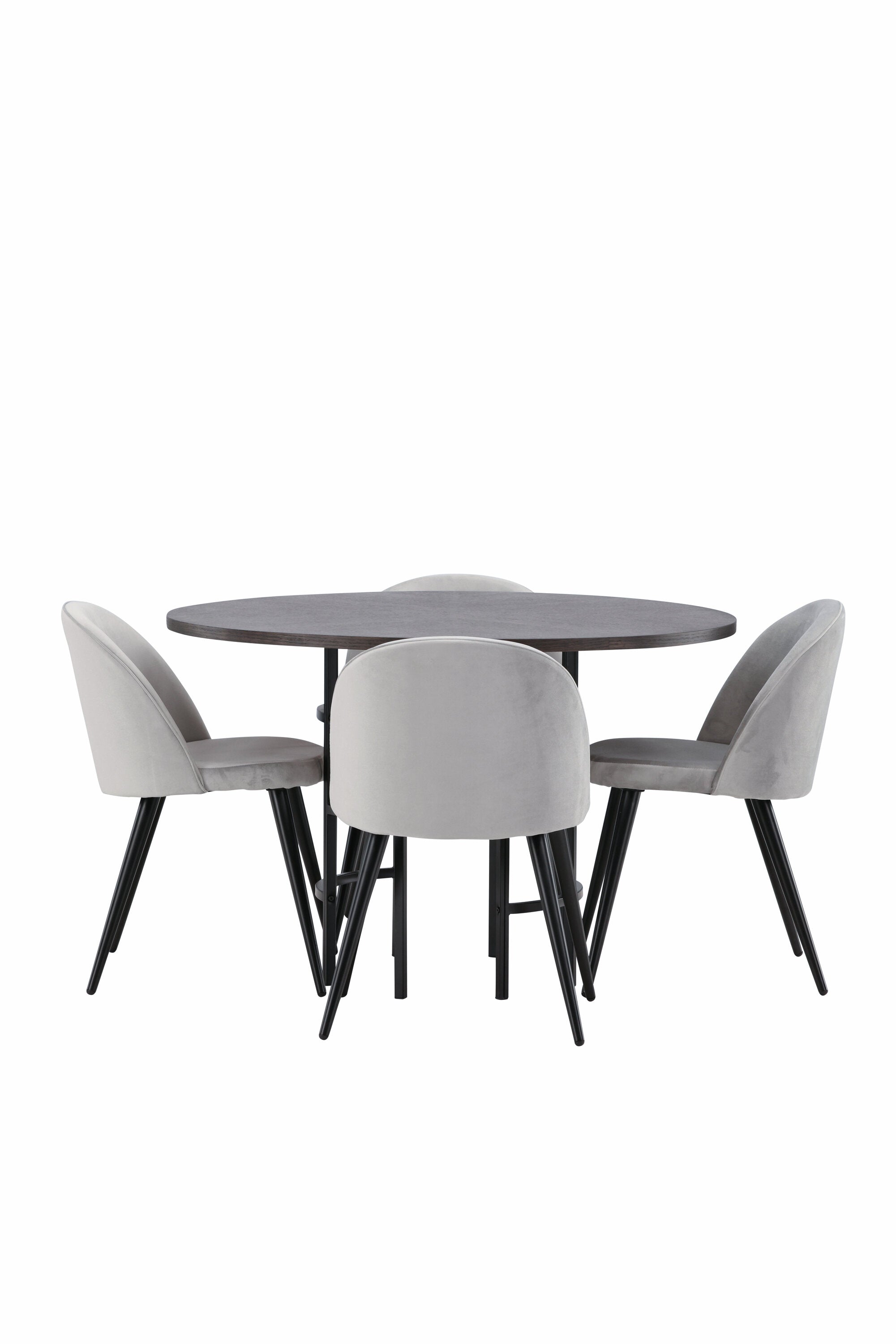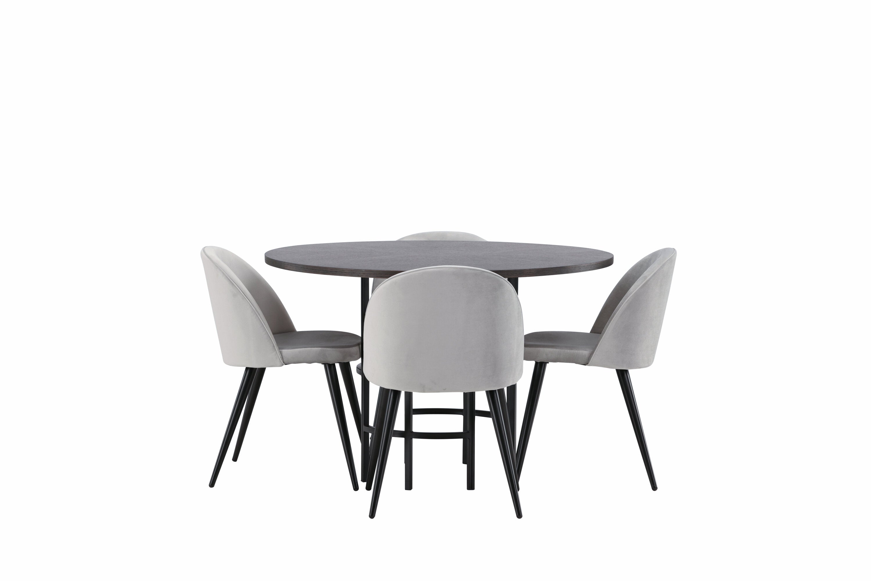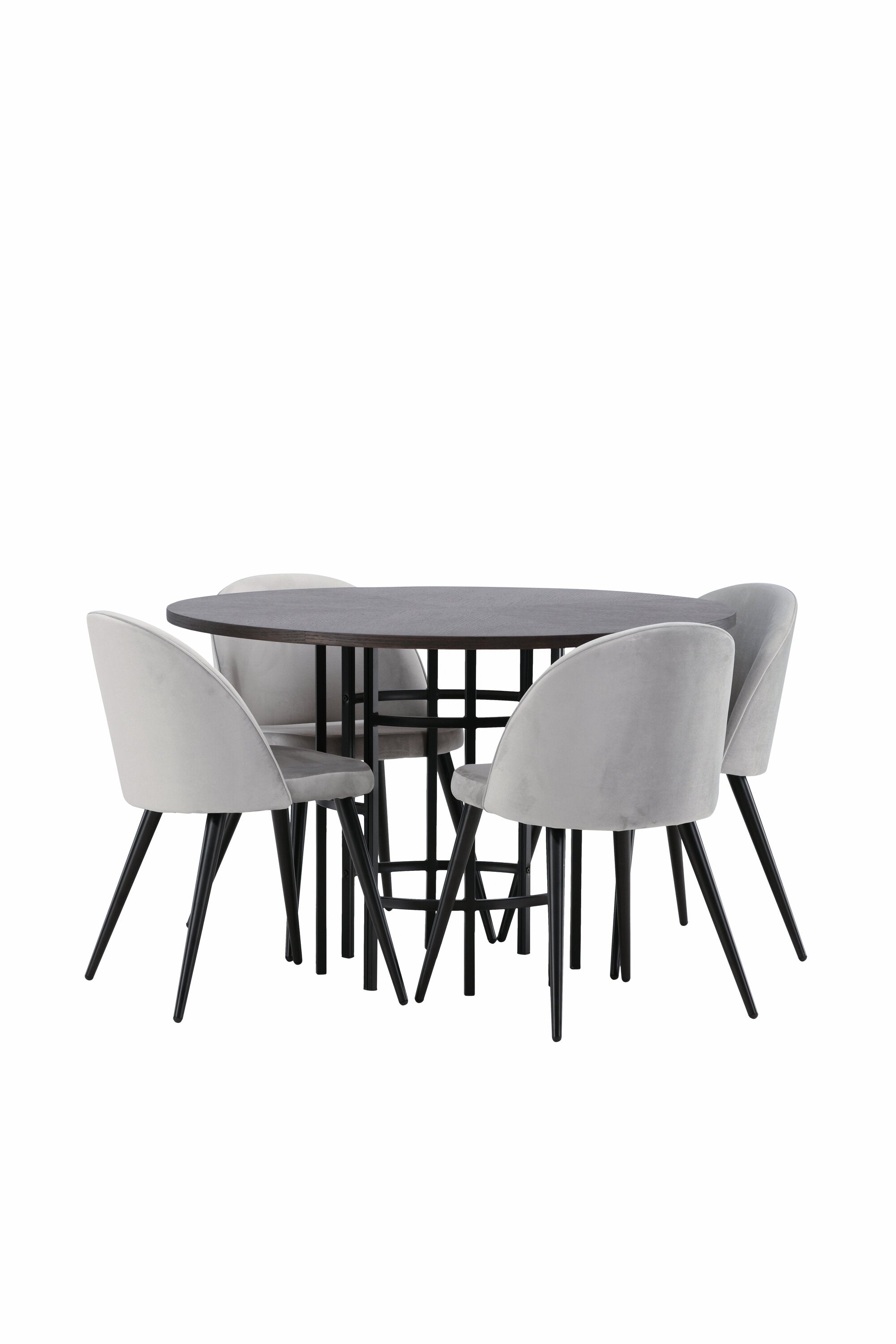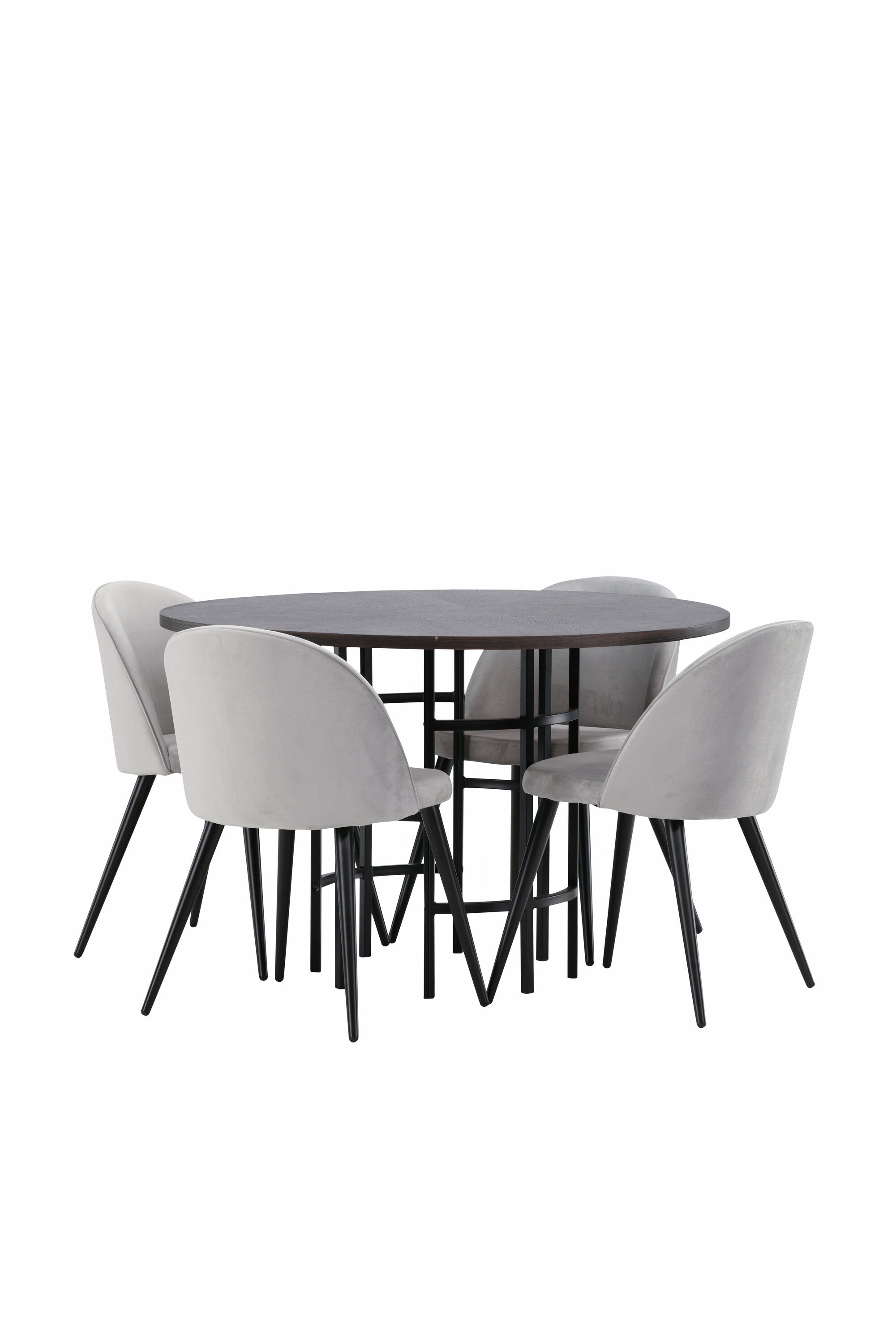 Jídelní skupina se všemi správnými funkcemi! Tento trendový jídelní stůl ze série Copenhagen patří do kolekce Furniture Fashion a má krásnou hnědou desku z MDF s dýhou a ozdobnou válcovou základnu z černého kovu. Zde společně s moderním křeslem dream ze série Velvet ve stylové šedé barvě. Tato jídelní židle má celočalouněný design s mírně zaobleným opěradlem a sedákem z měkké sametové látky a nohami z černého kovu s práškovým nástřikem. Vytvořte okouzlující středobod, kterým shromáždíte celou rodinu!