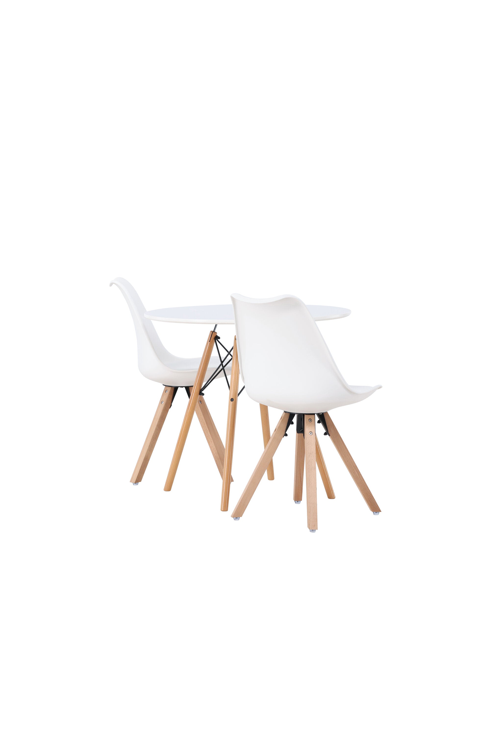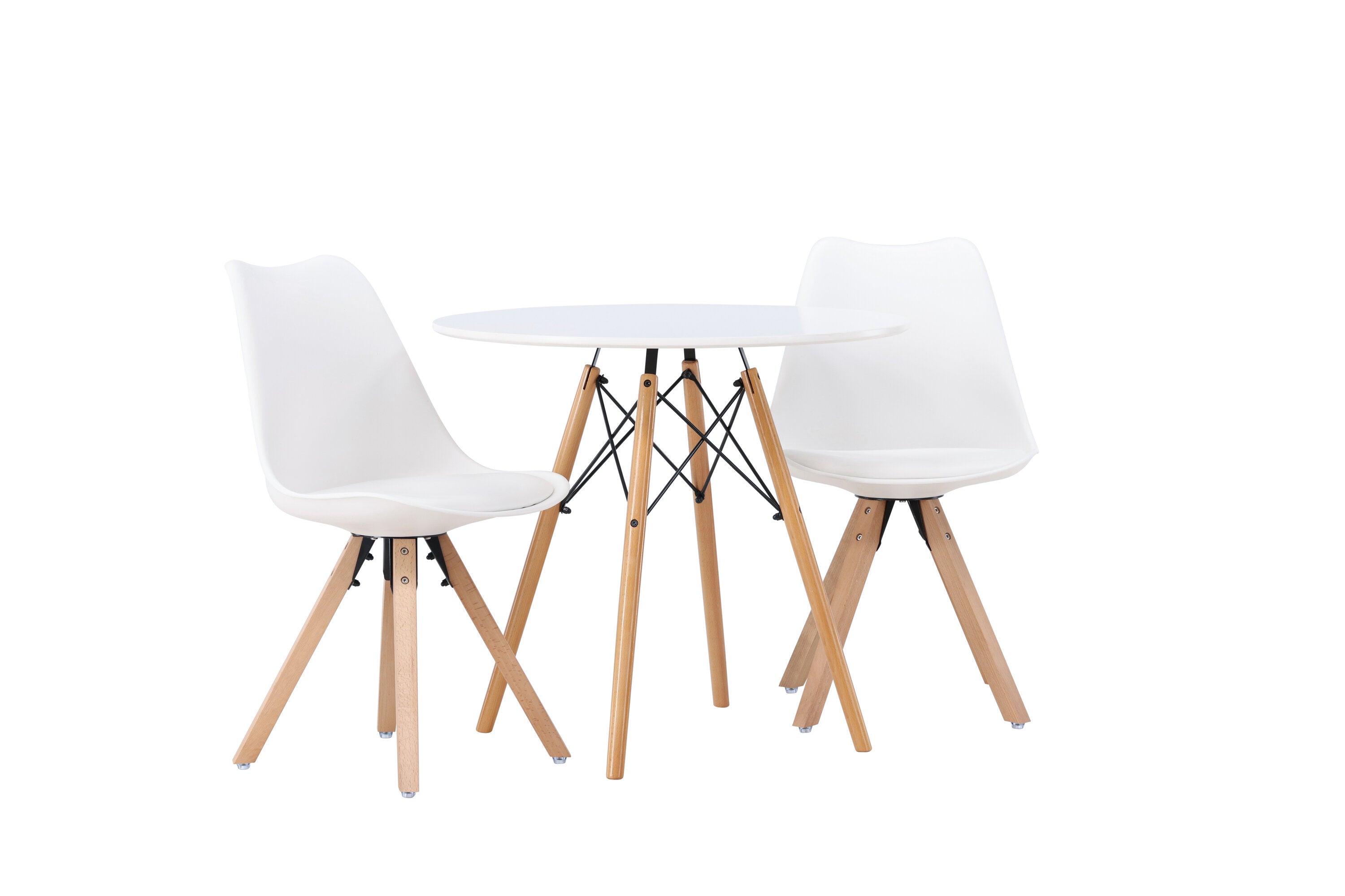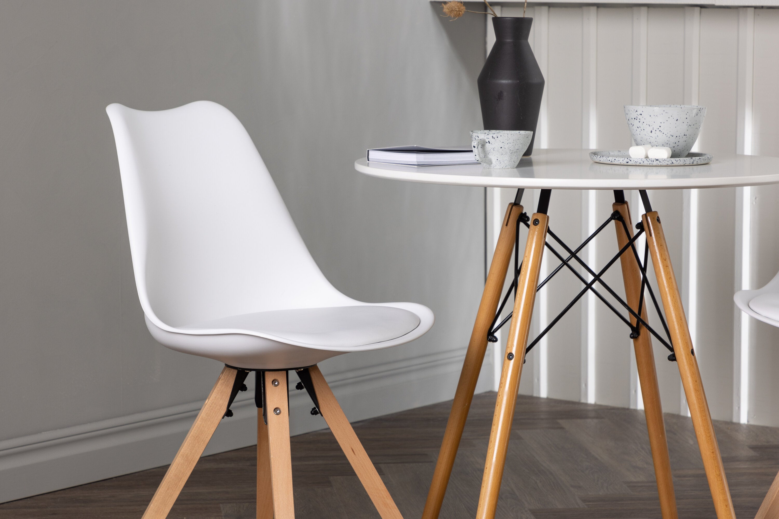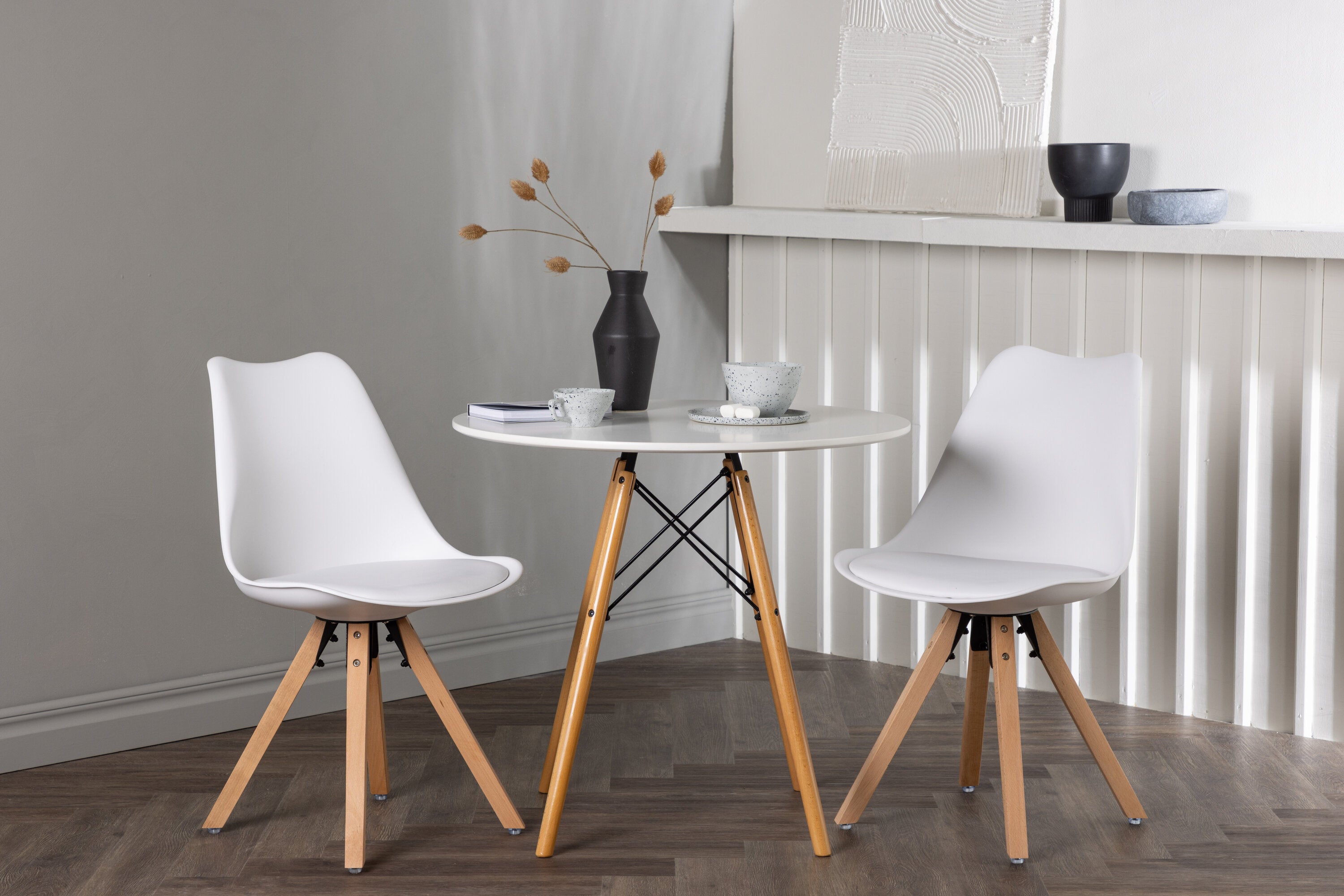 Skvělá jídelní skupina v malé velikosti! Kulatý jídelní stůl Danburi má klasický design s kulatou stolní deskou z bílé MDF a mírně rozšířenými nohami z bukového dřeva s ozdobnými detaily v černé oceli. Zde spolu s našimi fantastickými, bílými jídelními židlemi ze série Zeno. Židle má příjemný design s opěradlem a sedákem z bílého plastu, vestavěným sedákem s vysokým komfortem a čtyřmi rozšířenými nohami ze dřeva. Už to nebude lepší než tohle! Průměr stolu: 60 cm.