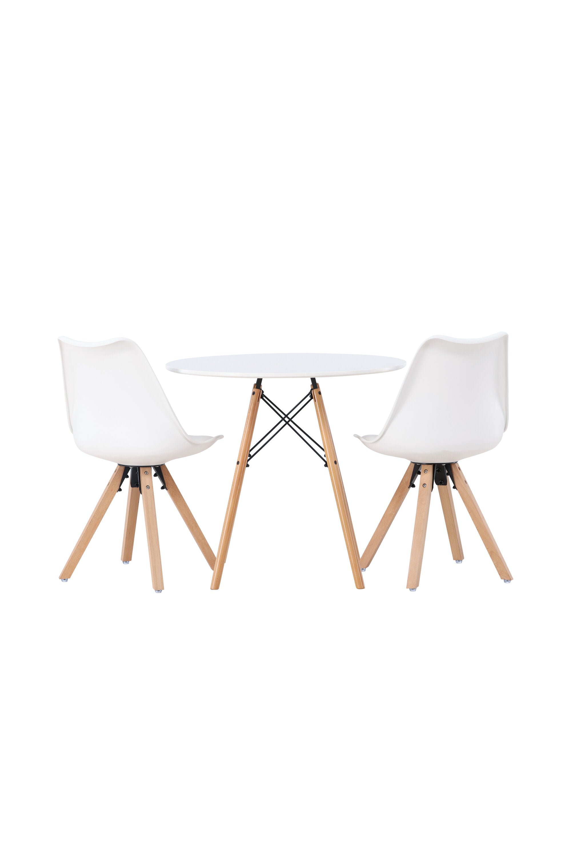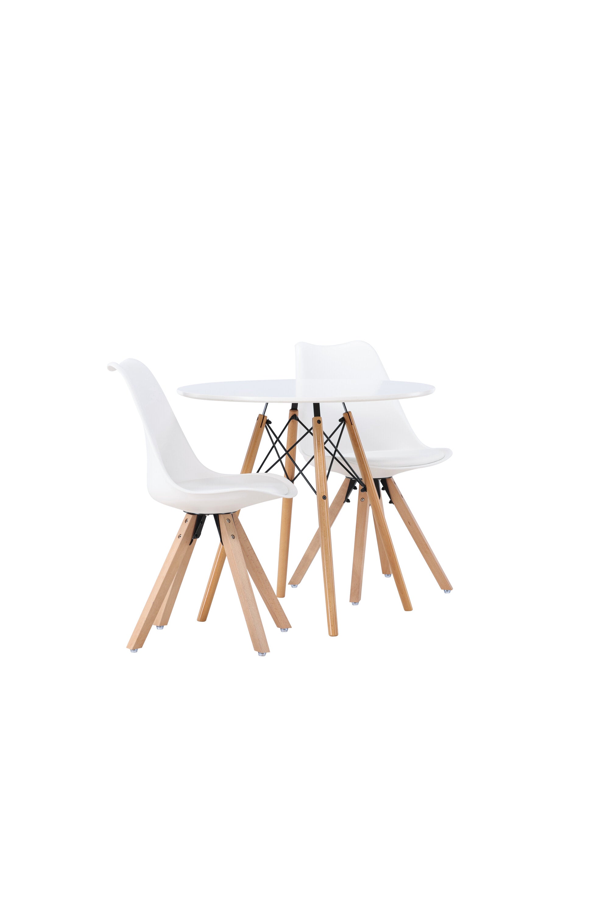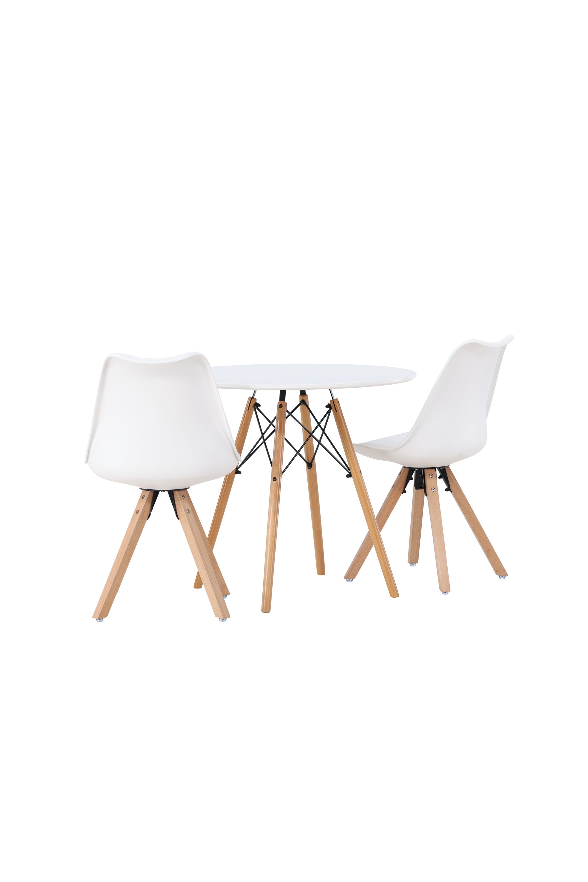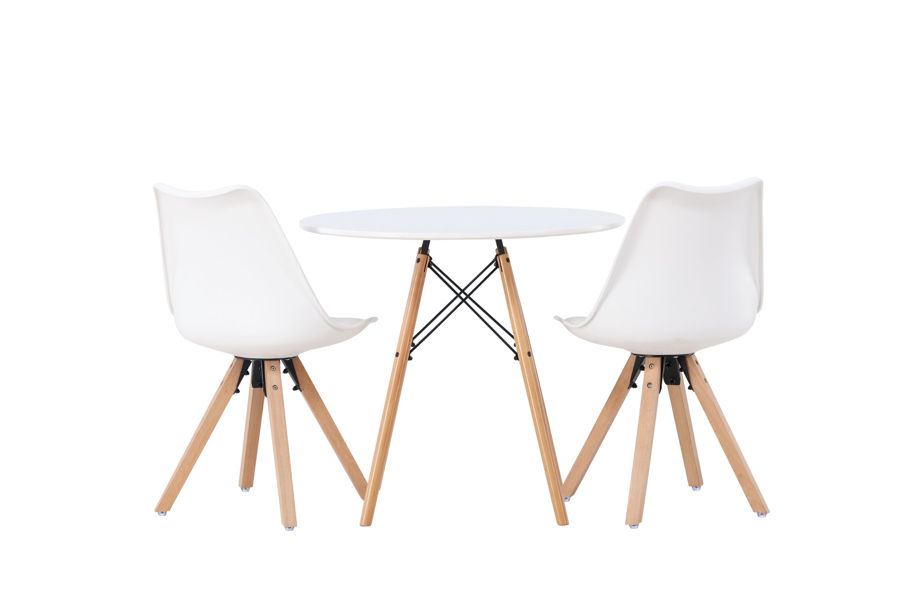 Skvělá jídelní skupina v malé velikosti! Kulatý jídelní stůl Danburi má klasický design s kulatou stolní deskou z bílé MDF a mírně rozšířenými nohami z bukového dřeva s ozdobnými detaily v černé oceli. Zde spolu s našimi fantastickými, bílými jídelními židlemi ze série Zeno. Židle má příjemný design s opěradlem a sedákem z bílého plastu, vestavěným sedákem s vysokým komfortem a čtyřmi rozšířenými nohami ze dřeva. Už to nebude lepší než tohle! Průměr stolu: 60 cm.