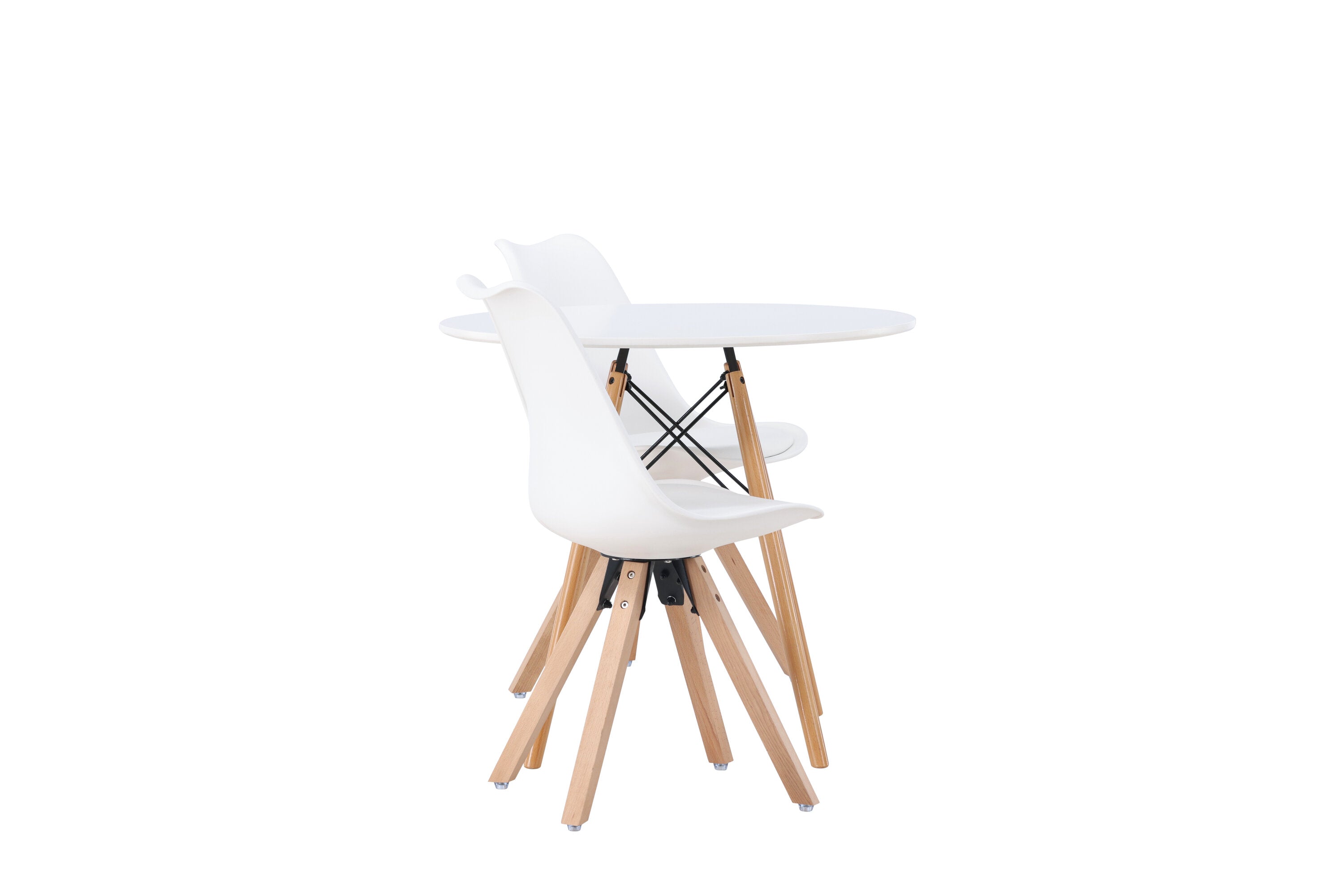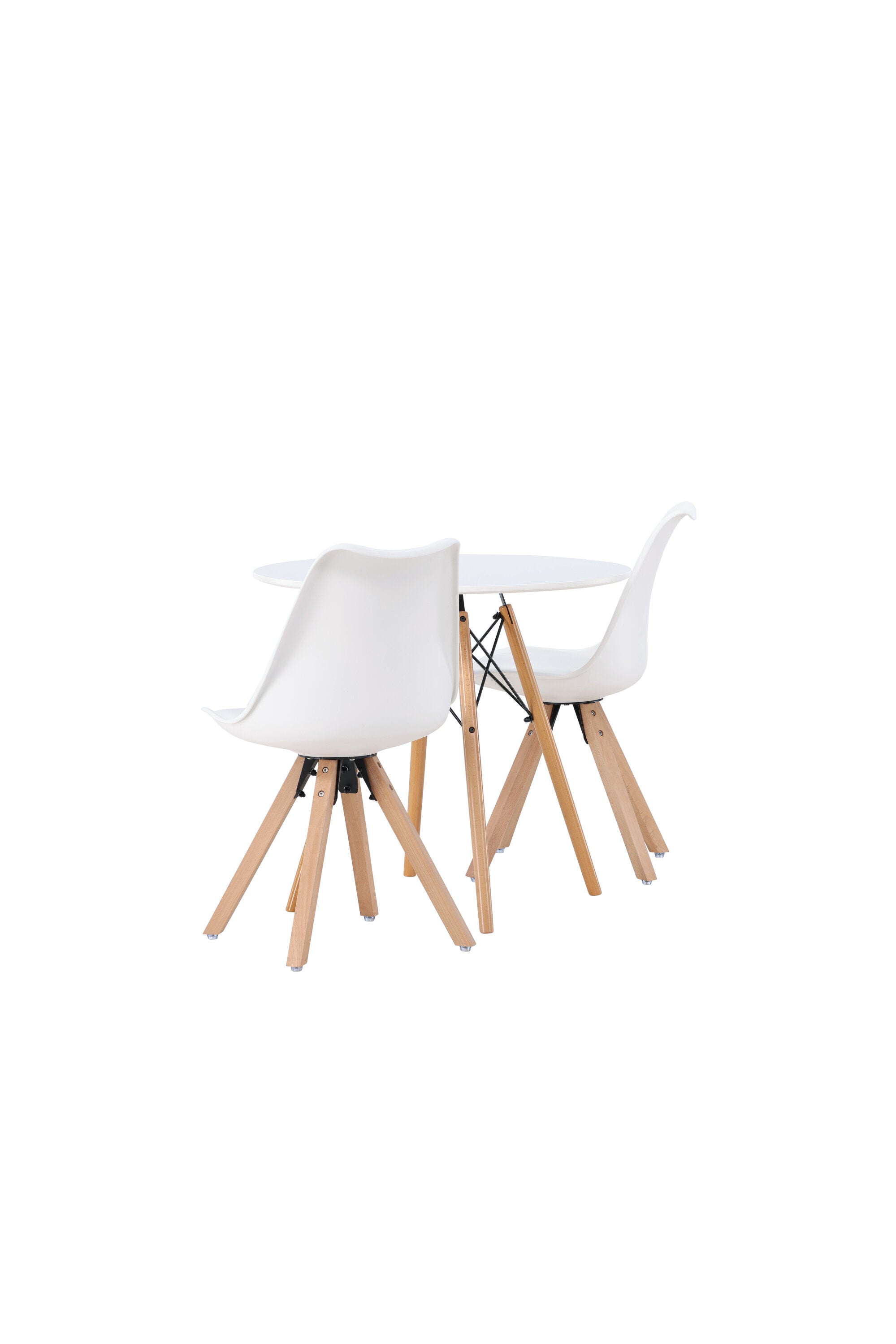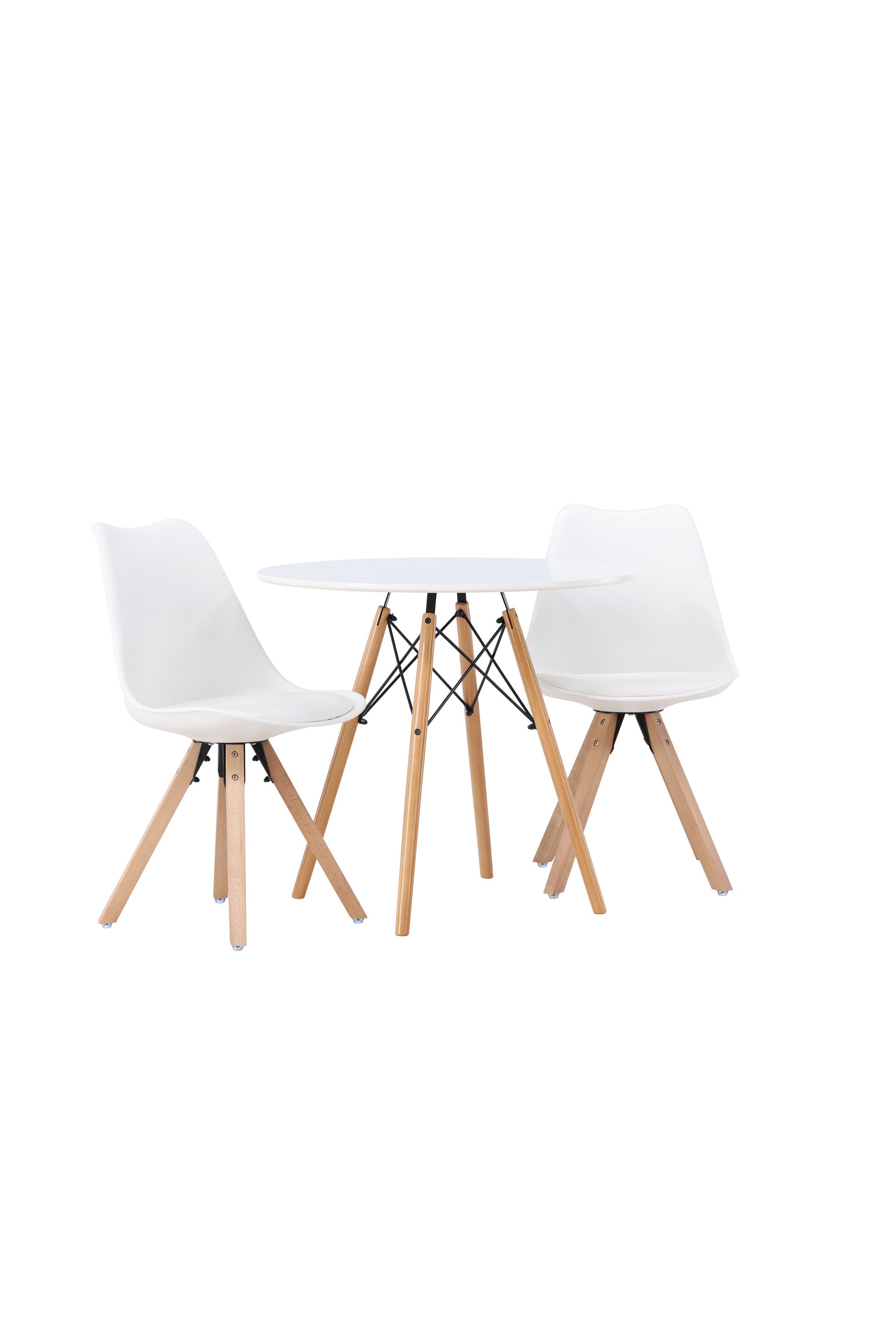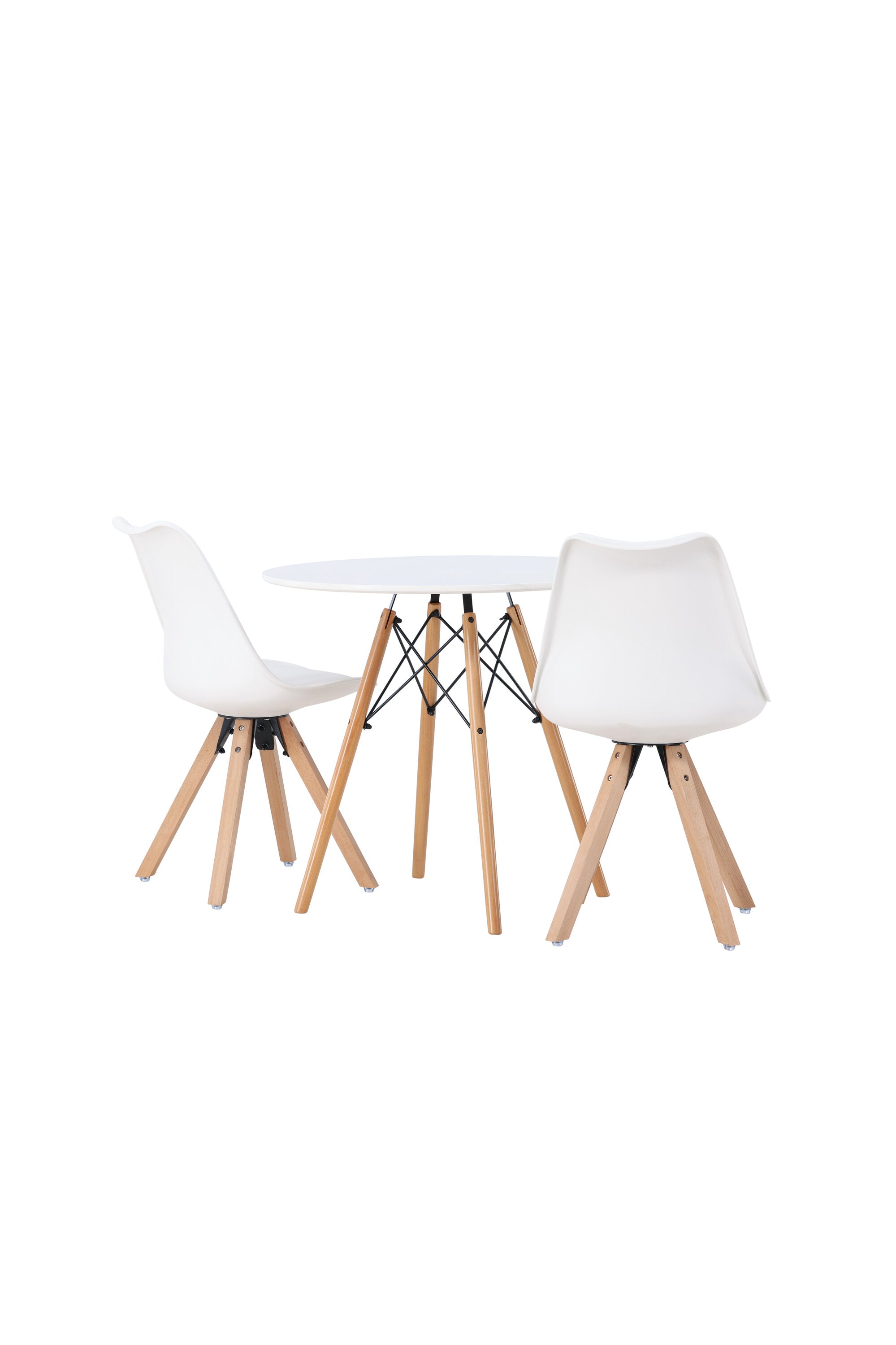 Skvělá jídelní skupina v malé velikosti! Kulatý jídelní stůl Danburi má klasický design s kulatou stolní deskou z bílé MDF a mírně rozšířenými nohami z bukového dřeva s ozdobnými detaily v černé oceli. Zde spolu s našimi fantastickými, bílými jídelními židlemi ze série Zeno. Židle má příjemný design s opěradlem a sedákem z bílého plastu, vestavěným sedákem s vysokým komfortem a čtyřmi rozšířenými nohami ze dřeva. Už to nebude lepší než tohle! Průměr stolu: 60 cm.