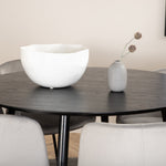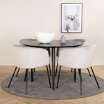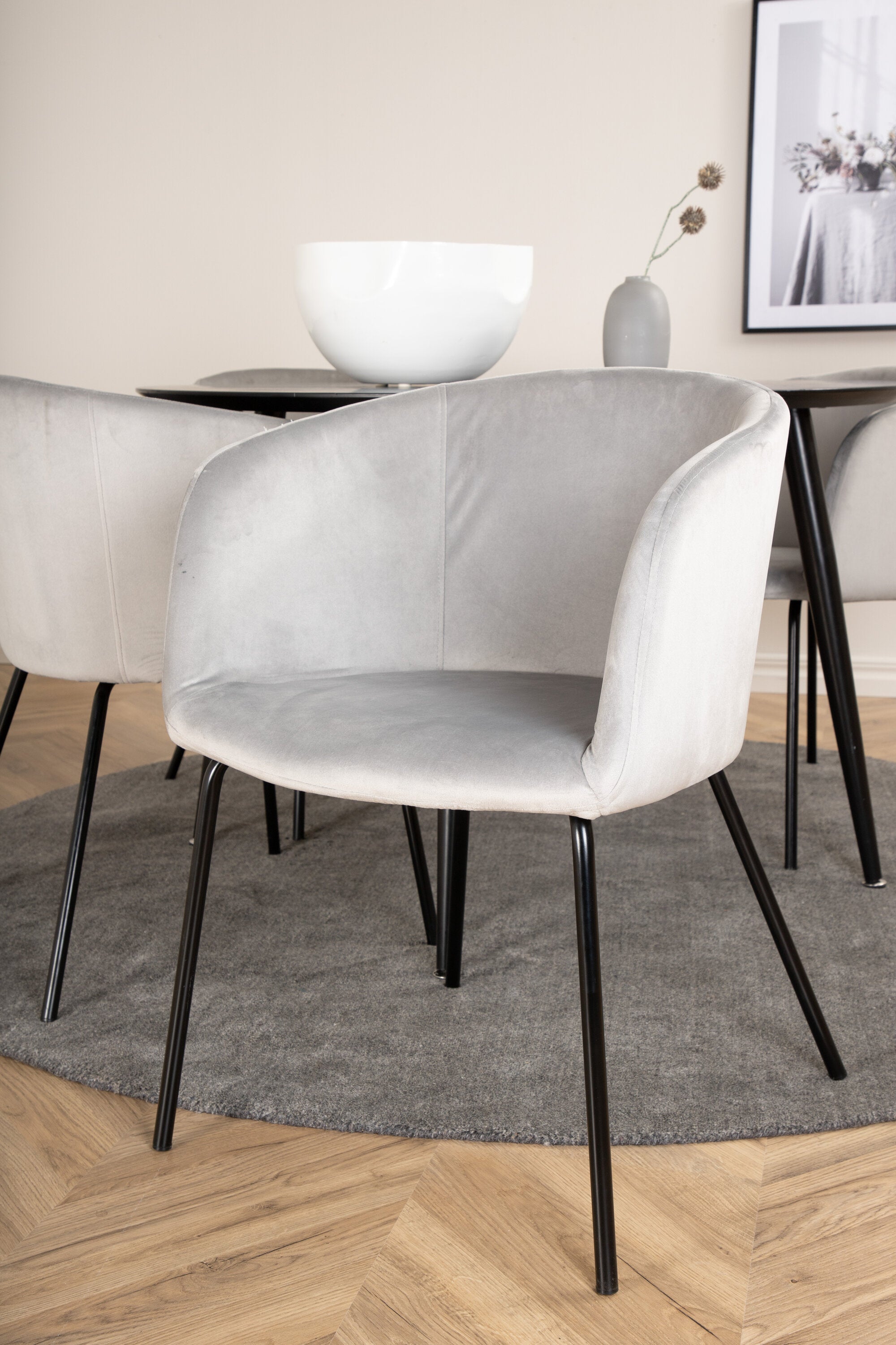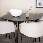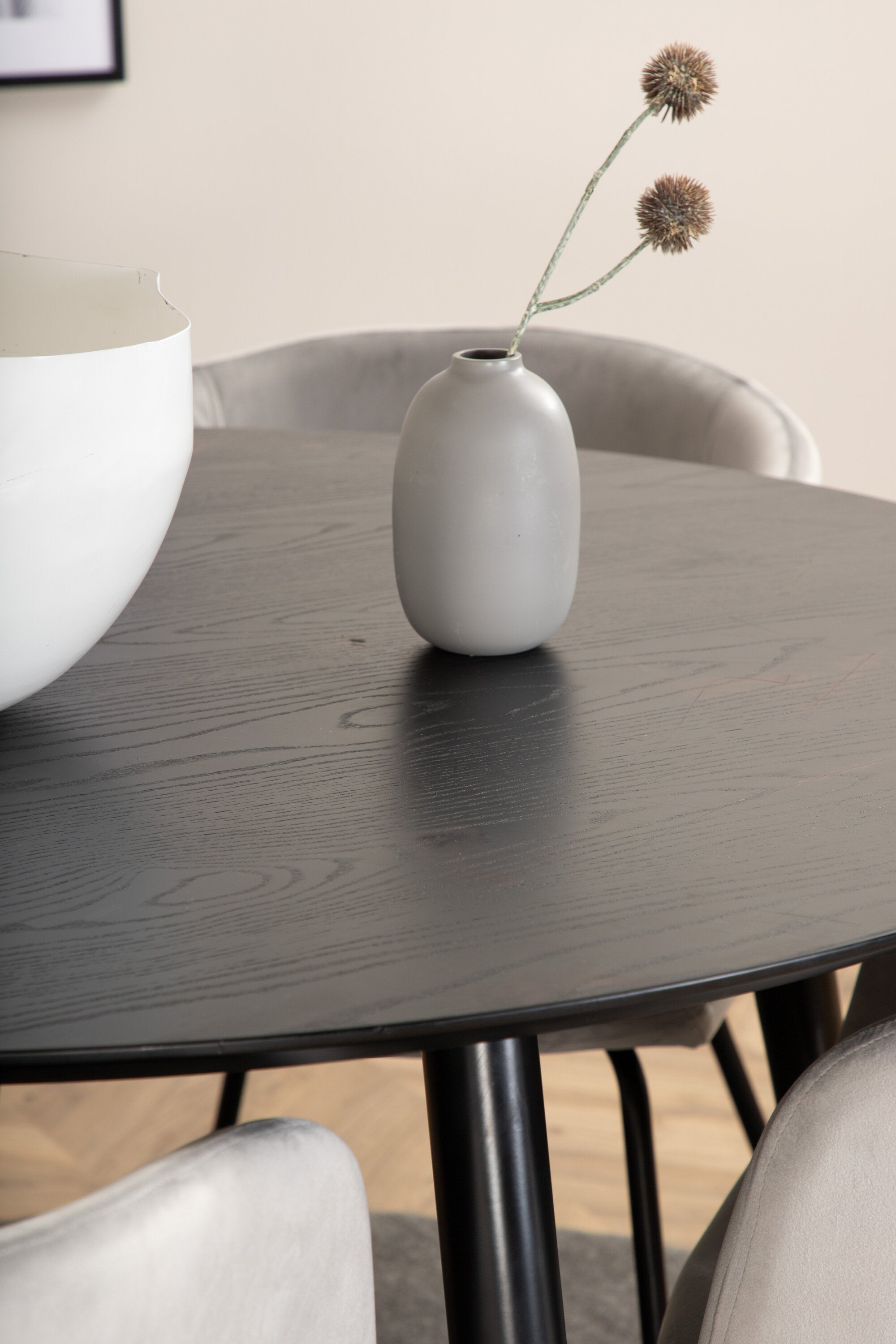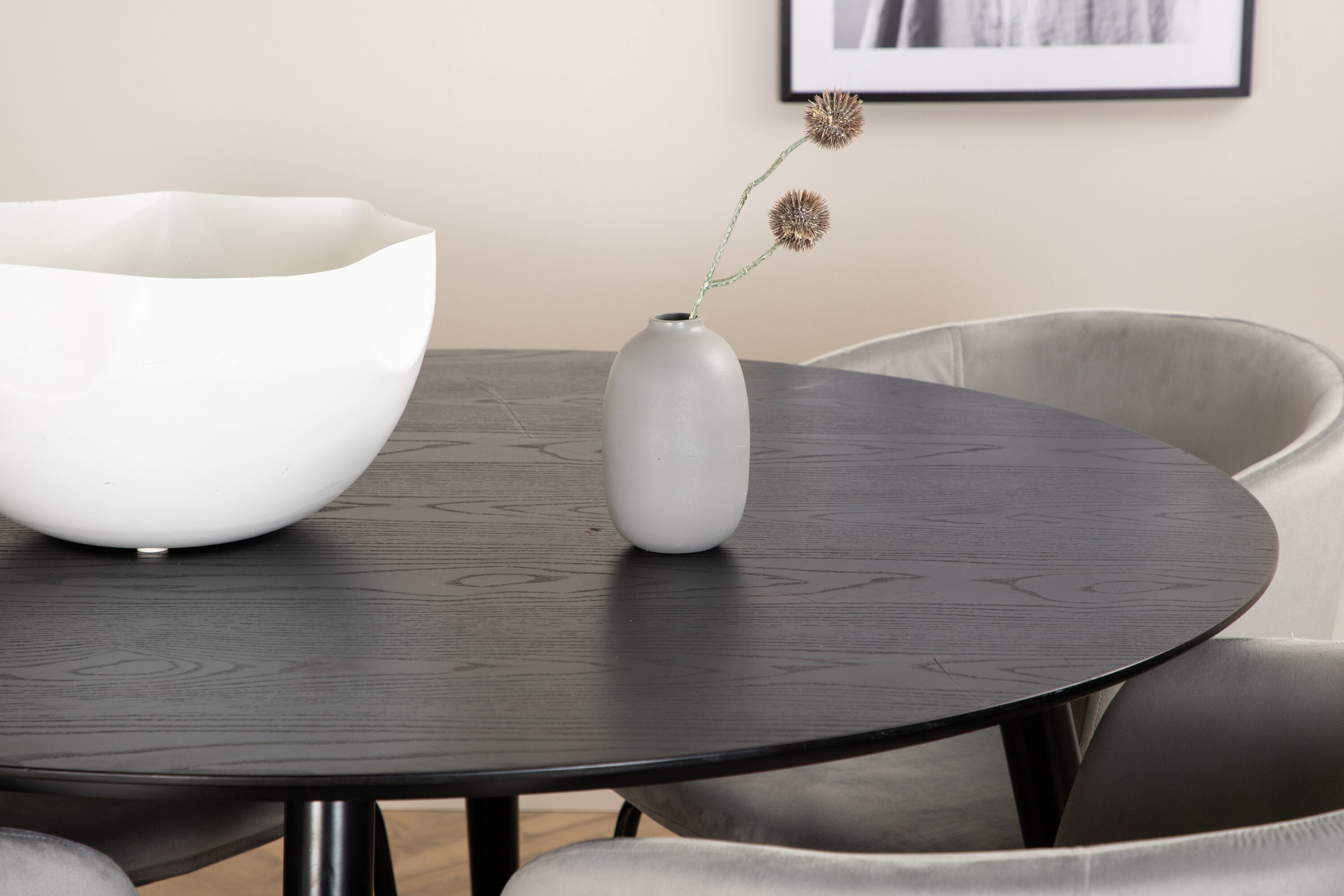 Vytvořte okouzlující středobod, kde se můžete sejít vy a vaši rodinu! Náš kulatý jídelní stůl ze série Dip má stylovou desku z MDF a lehce rozevlátou kovovou nohu stolu. Stůl je konzistentně v černé barvě, která dodává místnosti moderní a luxusní atmosféru. Zde v dokonalé kombinaci se 4 jídelními židlemi Berit v luxusním designu. Sedák je pompézní v šedém sametu a nohy židle stylově úzké z černého železa. Pohodlně se usaďte a vychutnejte si příjemné jídlo.