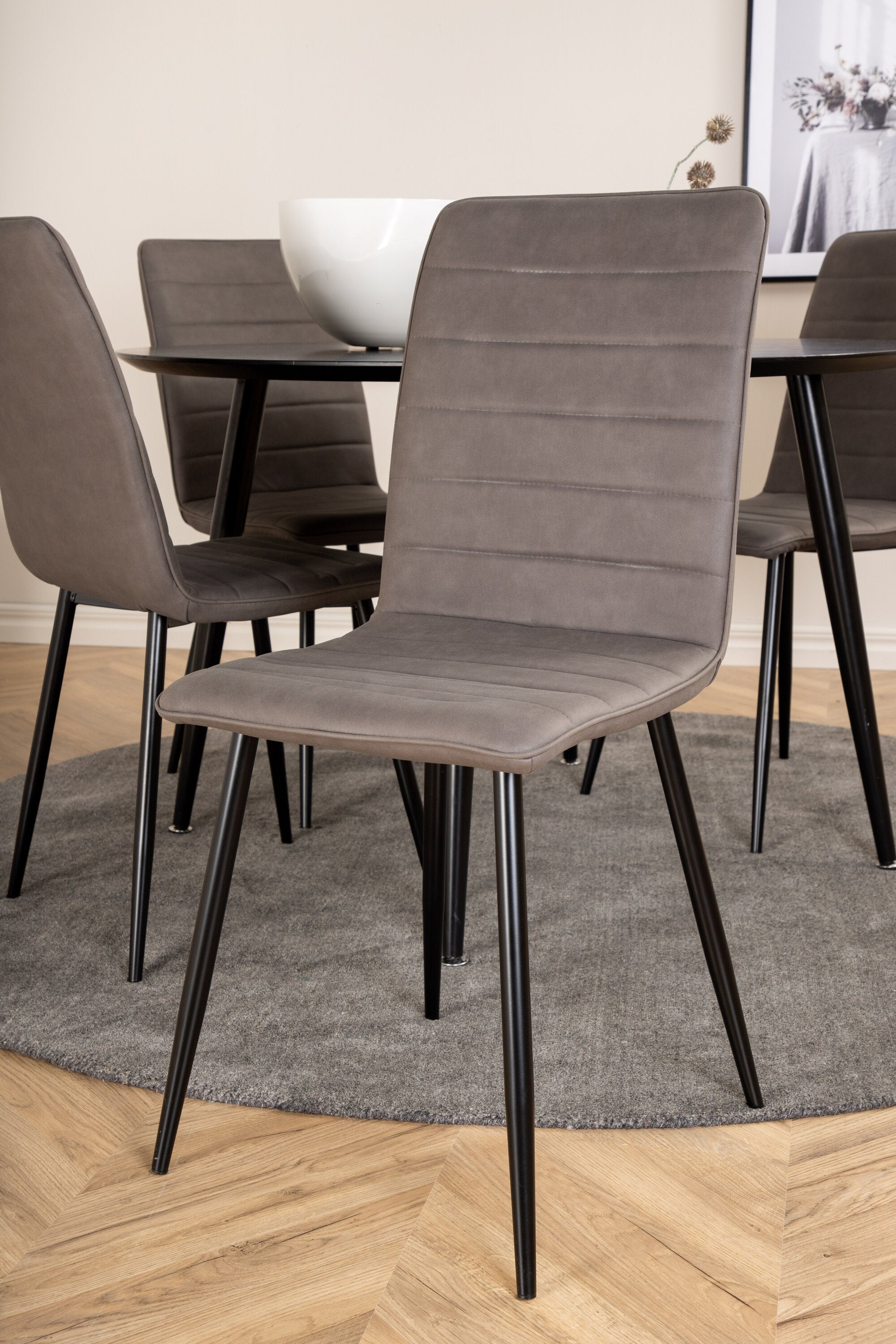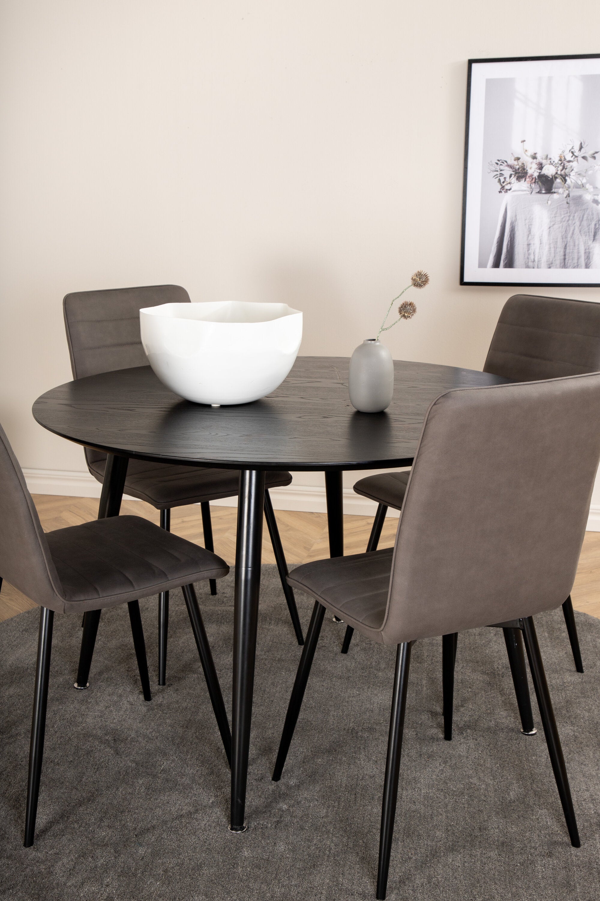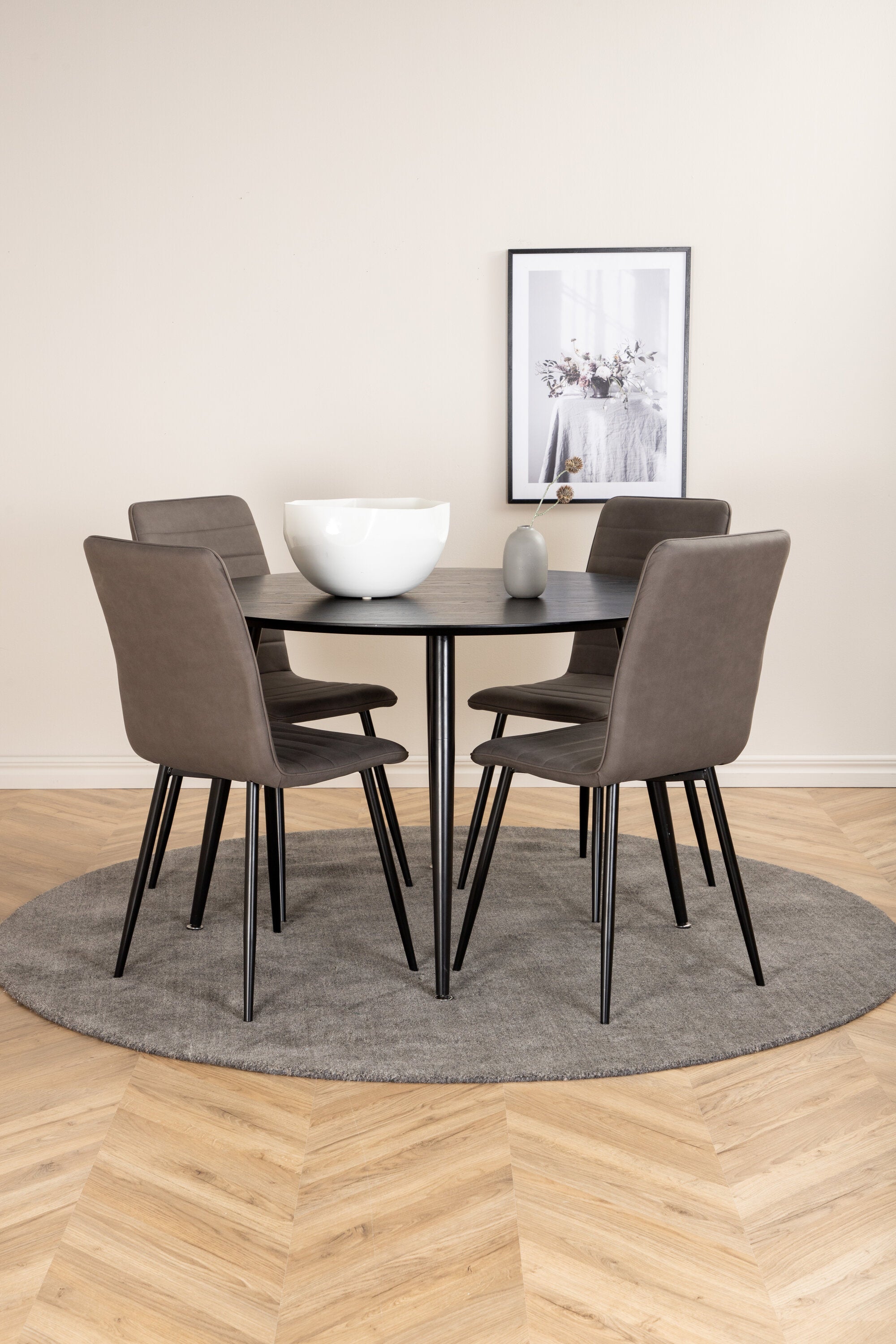 Vybavte obývací pokoj moderně a útulně pomocí okouzlující kulaté skupiny jídel! Náš kulatý jídelní stůl ze série Dip má stylovou desku z MDF a lehce rozevlátou kovovou nohu stolu. Stůl je konzistentně v černé barvě, která dodává místnosti moderní a luxusní atmosféru. Zde v lahodné kombinaci 4 jídelních židlí ze série Windu Luxury. Sedák je z šedého mikrovlákna a nohy židle z černého železa. Vytvořte si lákavý poutač v srdci domova!
