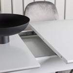 Náš bílý jídelní stůl Disa má obdélníkovou desku z bílé MDF, středově umístěnou základnu ze stejného materiálu a dva šedé MDF rámy. Jednou z fantastických výhod tohoto jídelního stolu je jeho rozkládací funkce, která mu umožňuje bezproblémově pojmout malé i velké setkání. Rozměry stolu: 120/160x80cm.
